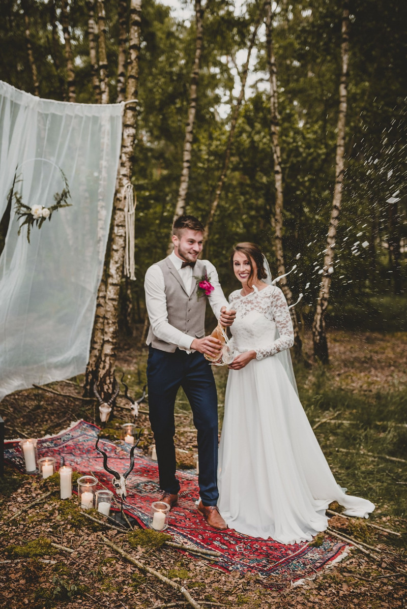 Heute nehme ich euch mit zu einem romantischen und sommerlichenElopement, mitten im kühlen und duftenden Wald. Völlig frei und ganz natürlich, geben sich Nadine & Luca hier das schönste Versprechen. Eine wundervolle Sommerinspiration, die auch mit einer freien Trauungund Gästen umsetzbar ist. Wild, rustikal und der Natur zu tiefst verbunden. Born in the woods! Fotografisch hat diese Hochzeitsinspiration, dessen Konzept, Umsetzung und modische Accessoires (Fliege, Hosenträger, ein grandioses Strumpfband und zwei besondere Taschentücher) die Mädels von der Nadelspitze lieferten, der liebe Sven von Sven Huesemann Photography. Videografisch wurde der Tag begleitet von Fullfimed. Ihr könnt sowohl das Video zum ganzen Tag als auch ein Behind the scenes Video im Artikel entdecken! Die Dekoration wurde von Drinunddrumherum & YAYDAY erarbeitet. Die passende Papeterie kreierte Lena-Marieke design & papeterie. Die hübsche Braut Nadine strahlt in einem Kleid von BrautSchön, mit einem Hair & Makeup von abg visagistik und den Accessoires von Jen’s Wedding Stuff. Die tolle Floristik kreierte Blumenhaus Schoo Brüna. Und natürlich darf eine Hochzeitstorte nicht fehlen! Niemals! Diese kreierte Gitta Beernink. Die kleinen Stargäste heißen Ernie & Berd! Ich finde sie zuckersüß und sie sind eine mehr als coole Idee für einen Brauteinzug! Und jetzt wünsche ich euch ganz viel Freude mit dieser wundervollen Hochzeitsinspiration!