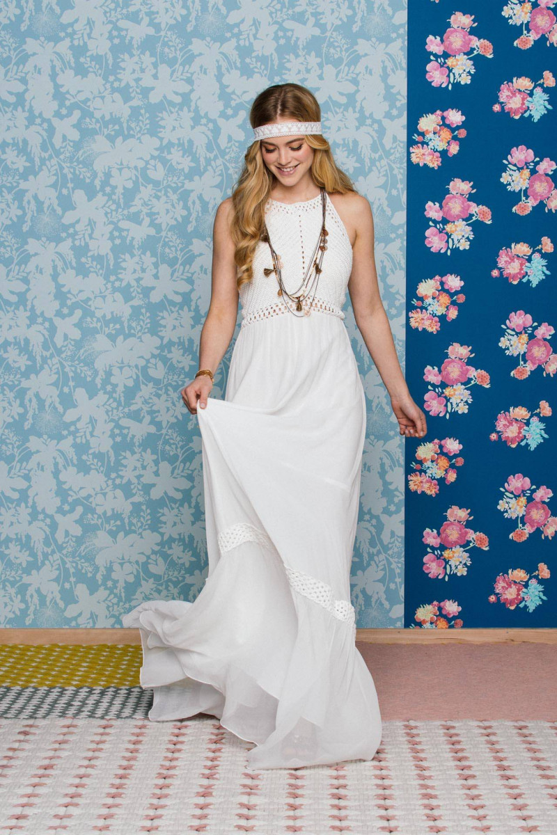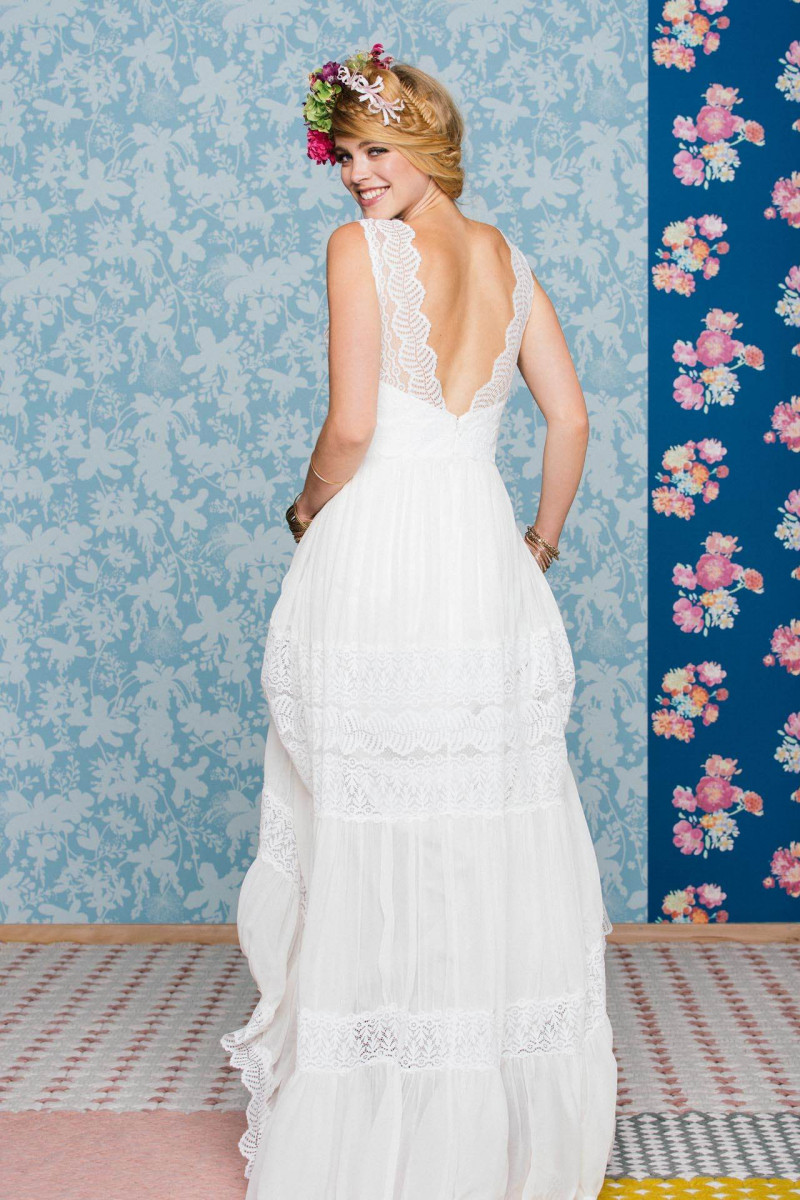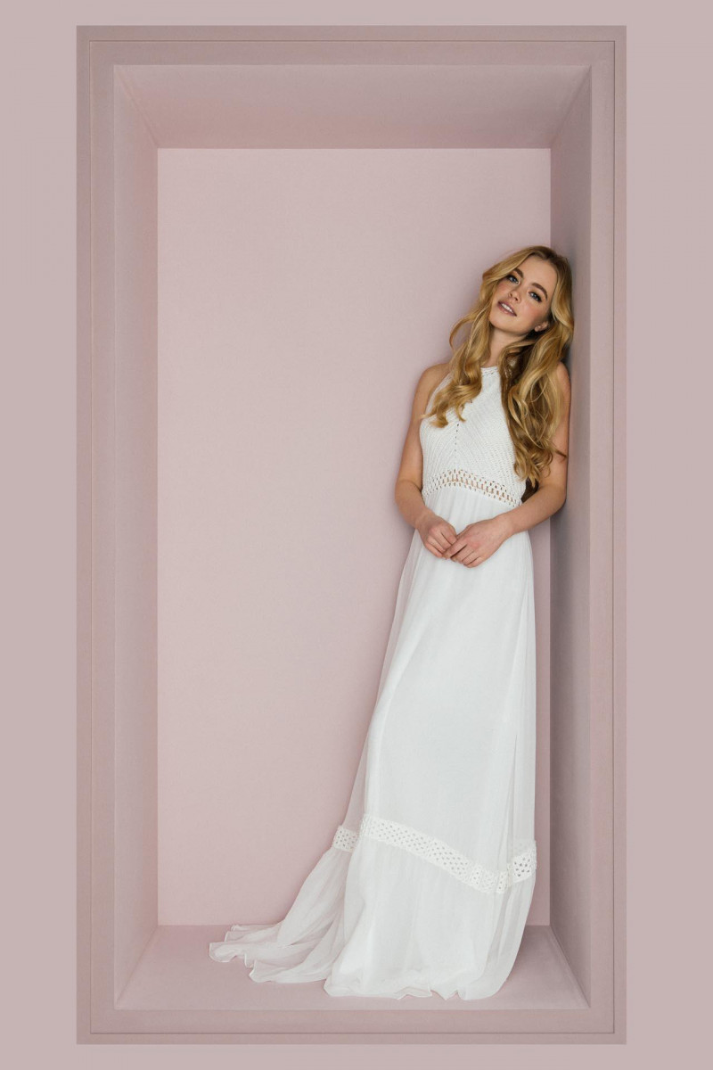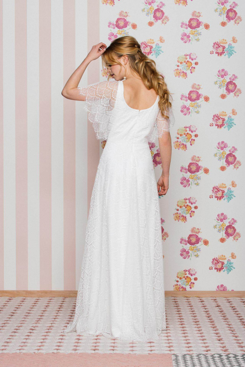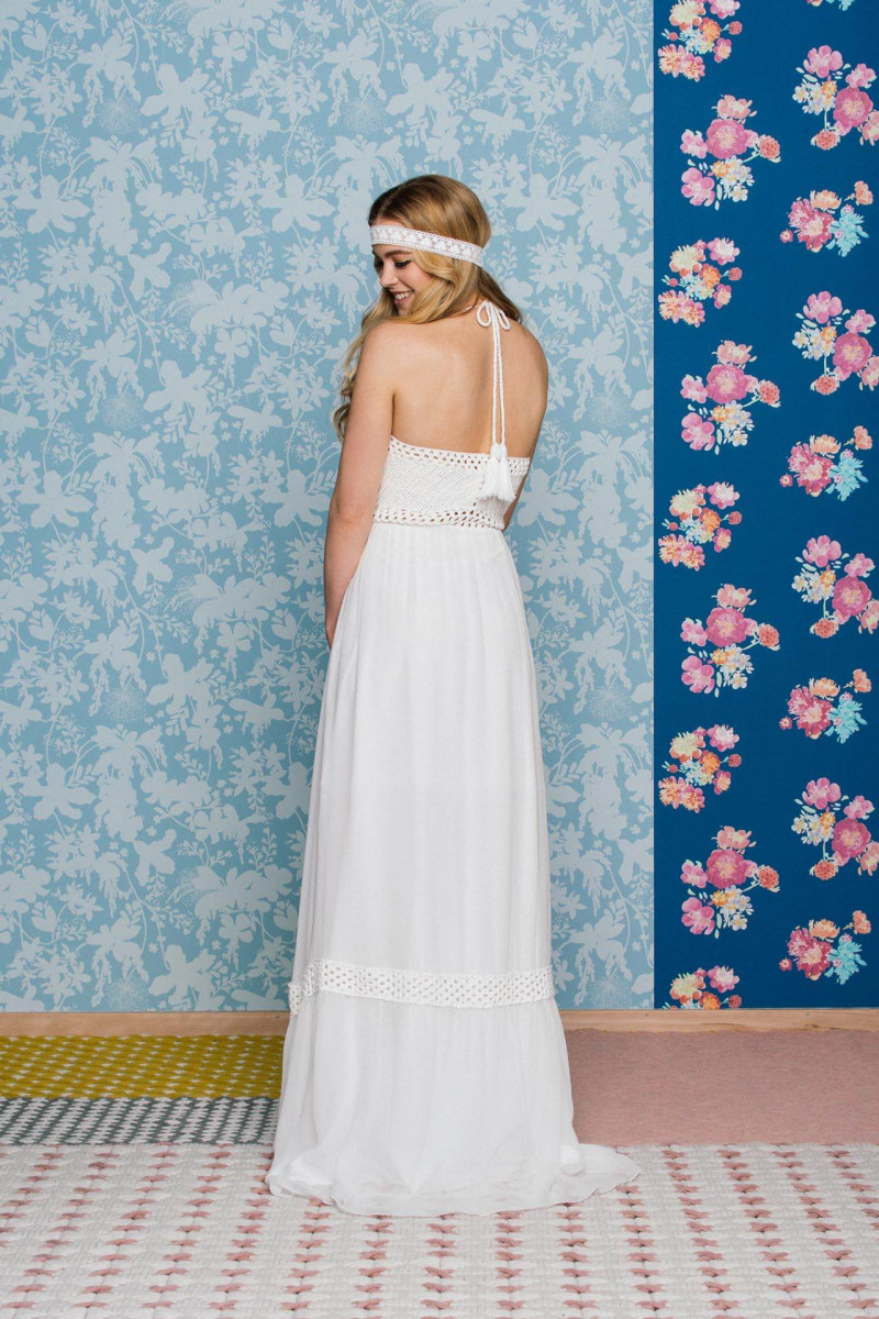 Die neue küssdiebraut Kollektion spricht selbstbewusste, moderne Bräute an, die in einem Brautlook fernab des Mainstreams heiraten möchten. Ob als Hippie, Boho, Vintage, freche oder urbane Braut, 2019 wird sich individuell und authentisch getraut! Designerin Kerstin Mechler liebt zarte Spitzenstoffe in den unterschiedlichsten Designs – mit Blüten, Tupfen, Ranken, Wellen oder Schmetterlingen. Gepaart mit fließenden Seidenröcken versprühen sie 20er Jahre Flair und allover in federleichten, lockeren Silhouetten zaubern sie lässige 70ies Hippie Brautkleider. Ein Highlight der neuen Kollektion sind die luftigen Ibiza Brautkleider mit zarten Spaghettiträgern oder handgehäkeltem Neckholder, die nicht nur bei einer Strandhochzeit Urlaubsfeeling verbreiten. Passend dazu werden goldene Body Chains und große baumwollige Boho Tücher statt Boleros kombiniert. Auch die 50er Jahre stehen bei küssdiebraut hoch im Kurs, weit schwingende Tellerröcke und farbige Petticoats verbreiten gute Laune und Tanzstimmung und witzige 60ies Minikleider sind perfekt für unkonventionelle Standesamt Bräute. Abgerundet wird die Kollektion durch schlichte, lässig urbane Brautkleider in Chiffon und einem coolen Jumpsuit für entspannte Bräute. Ob kurzes oder langes Brautkleid – der Blickfang liegt in dieser Saison am Oberkörper: die Designerin spielt mit den unterschiedlichsten Armlösungen von amerikanischem Armausschnitt über Trägervarianten, Flügelbis Langarm mit Fledermaus- und Trompetenärmeln und betont den Rücken durch raffinierte Schlitze, tief geschnittene Ausschnitte oder transparente Spitzeneinsätze.