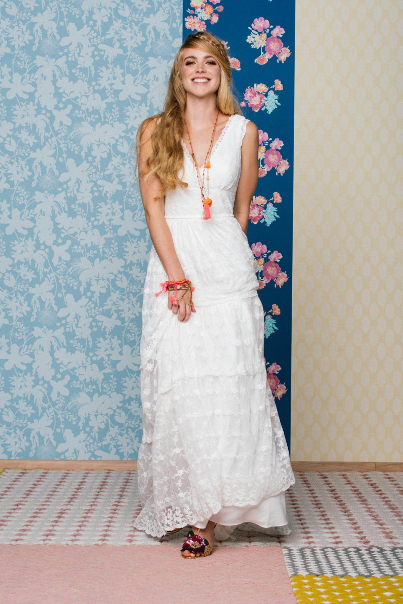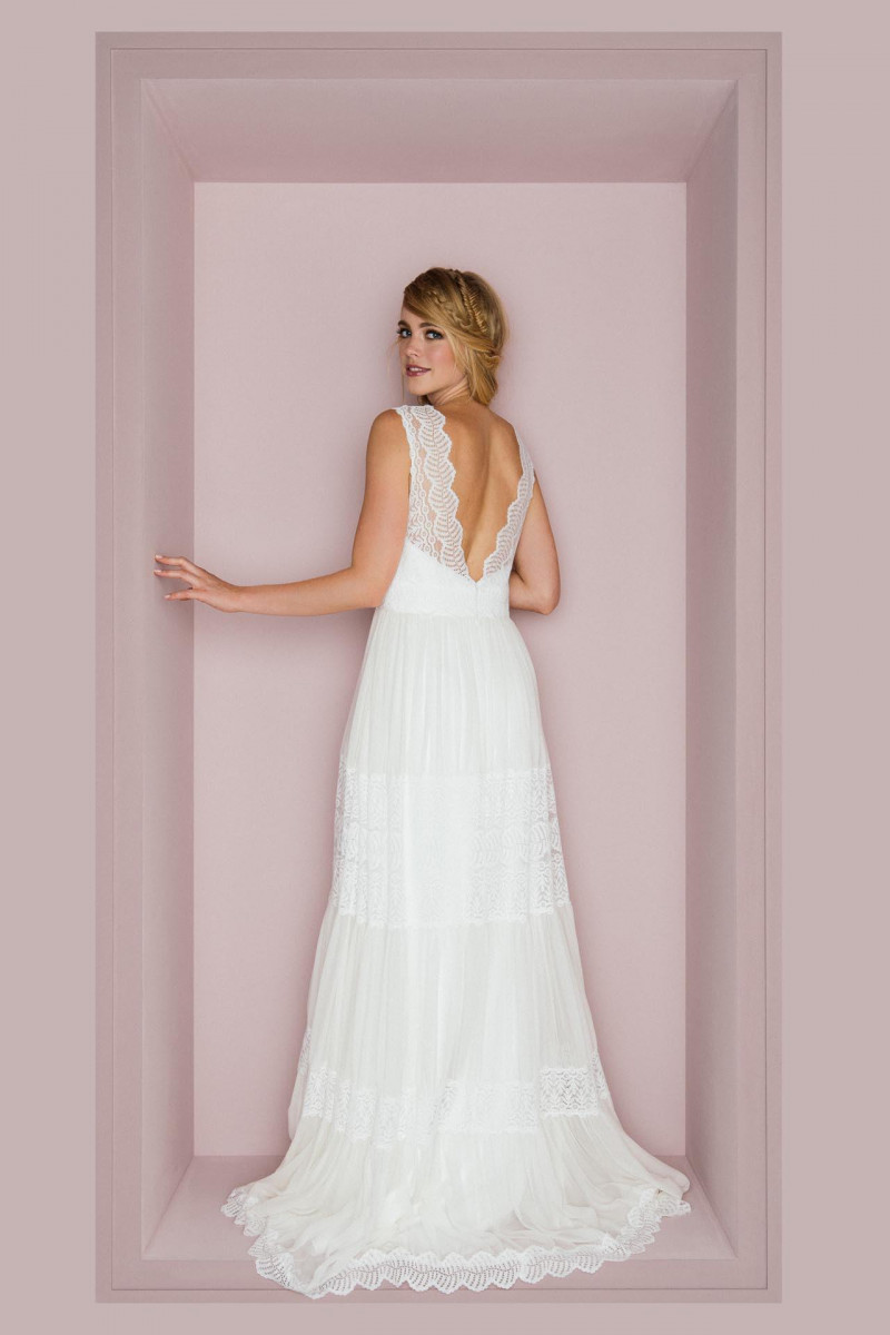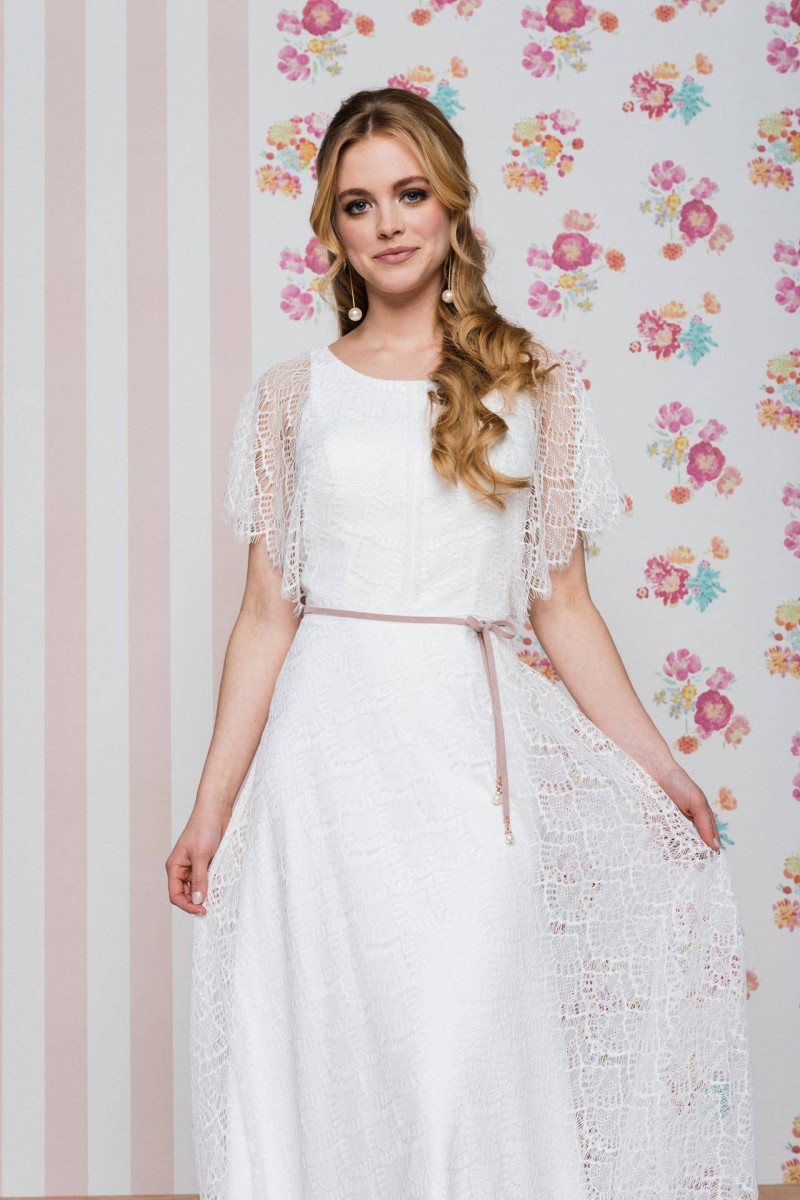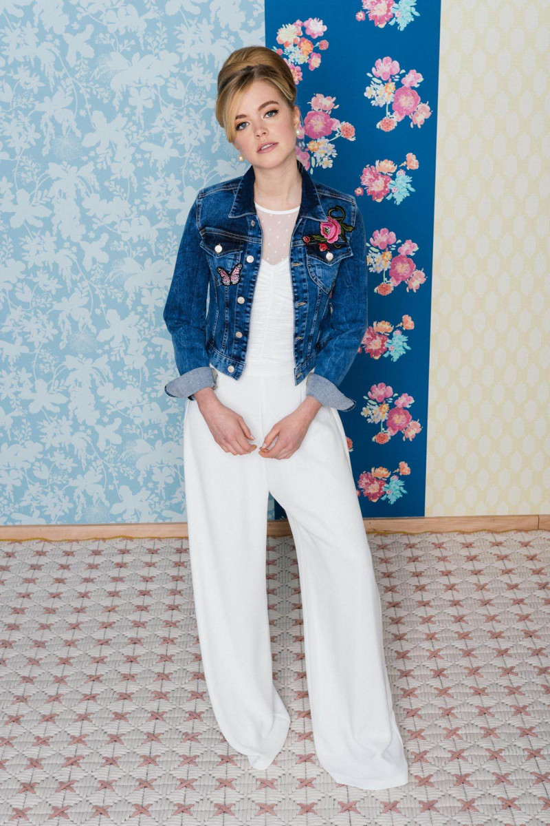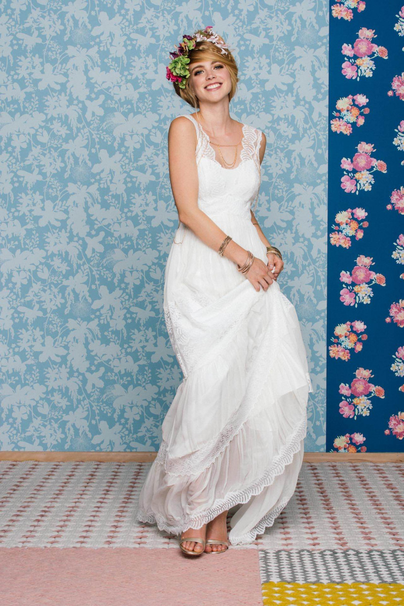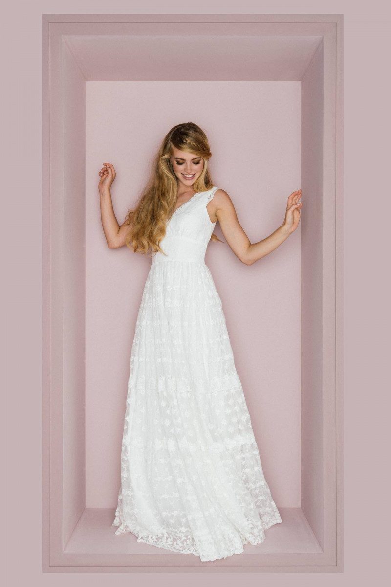 Die neue küssdiebraut Kollektion spricht selbstbewusste, moderne Bräute an, die in einem Brautlook fernab des Mainstreams heiraten möchten. Ob als Hippie, Boho, Vintage, freche oder urbane Braut, 2019 wird sich individuell und authentisch getraut! Designerin Kerstin Mechler liebt zarte Spitzenstoffe in den unterschiedlichsten Designs – mit Blüten, Tupfen, Ranken, Wellen oder Schmetterlingen. Gepaart mit fließenden Seidenröcken versprühen sie 20er Jahre Flair und allover in federleichten, lockeren Silhouetten zaubern sie lässige 70ies Hippie Brautkleider. Ein Highlight der neuen Kollektion sind die luftigen Ibiza Brautkleider mit zarten Spaghettiträgern oder handgehäkeltem Neckholder, die nicht nur bei einer Strandhochzeit Urlaubsfeeling verbreiten. Passend dazu werden goldene Body Chains und große baumwollige Boho Tücher statt Boleros kombiniert. Auch die 50er Jahre stehen bei küssdiebraut hoch im Kurs, weit schwingende Tellerröcke und farbige Petticoats verbreiten gute Laune und Tanzstimmung und witzige 60ies Minikleider sind perfekt für unkonventionelle Standesamt Bräute. Abgerundet wird die Kollektion durch schlichte, lässig urbane Brautkleider in Chiffon und einem coolen Jumpsuit für entspannte Bräute. Ob kurzes oder langes Brautkleid – der Blickfang liegt in dieser Saison am Oberkörper: die Designerin spielt mit den unterschiedlichsten Armlösungen von amerikanischem Armausschnitt über Trägervarianten, Flügelbis Langarm mit Fledermaus- und Trompetenärmeln und betont den Rücken durch raffinierte Schlitze, tief geschnittene Ausschnitte oder transparente Spitzeneinsätze.