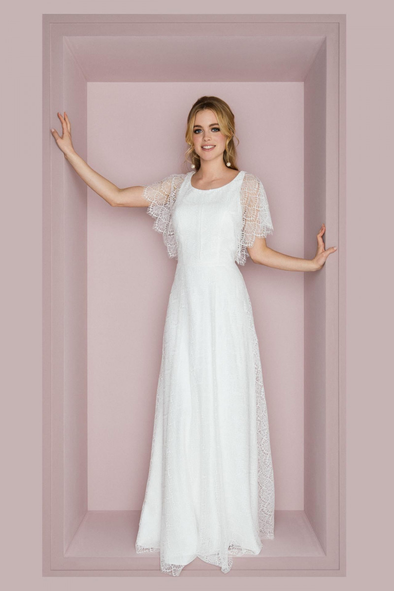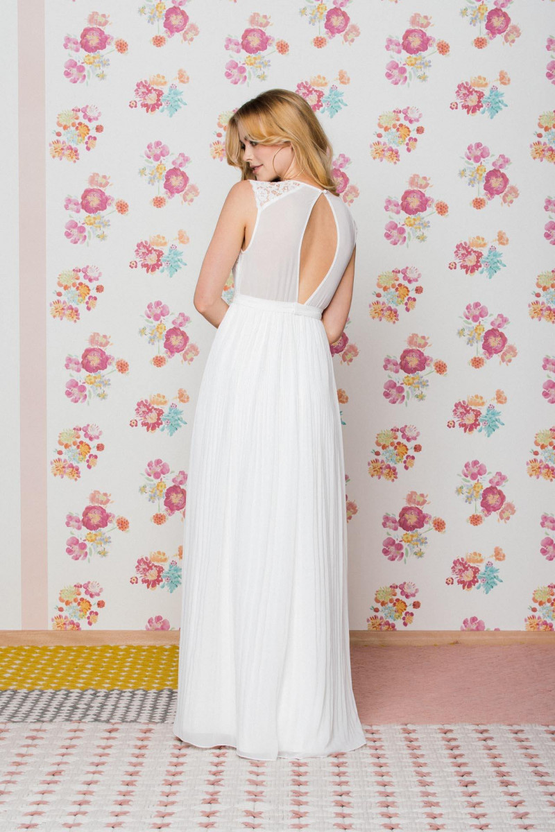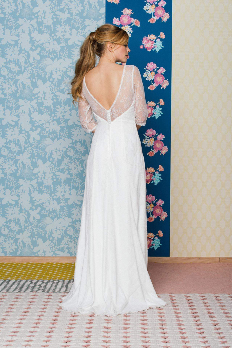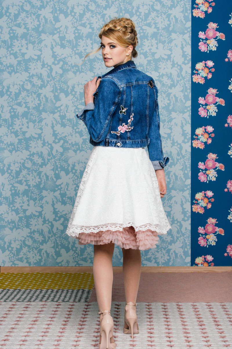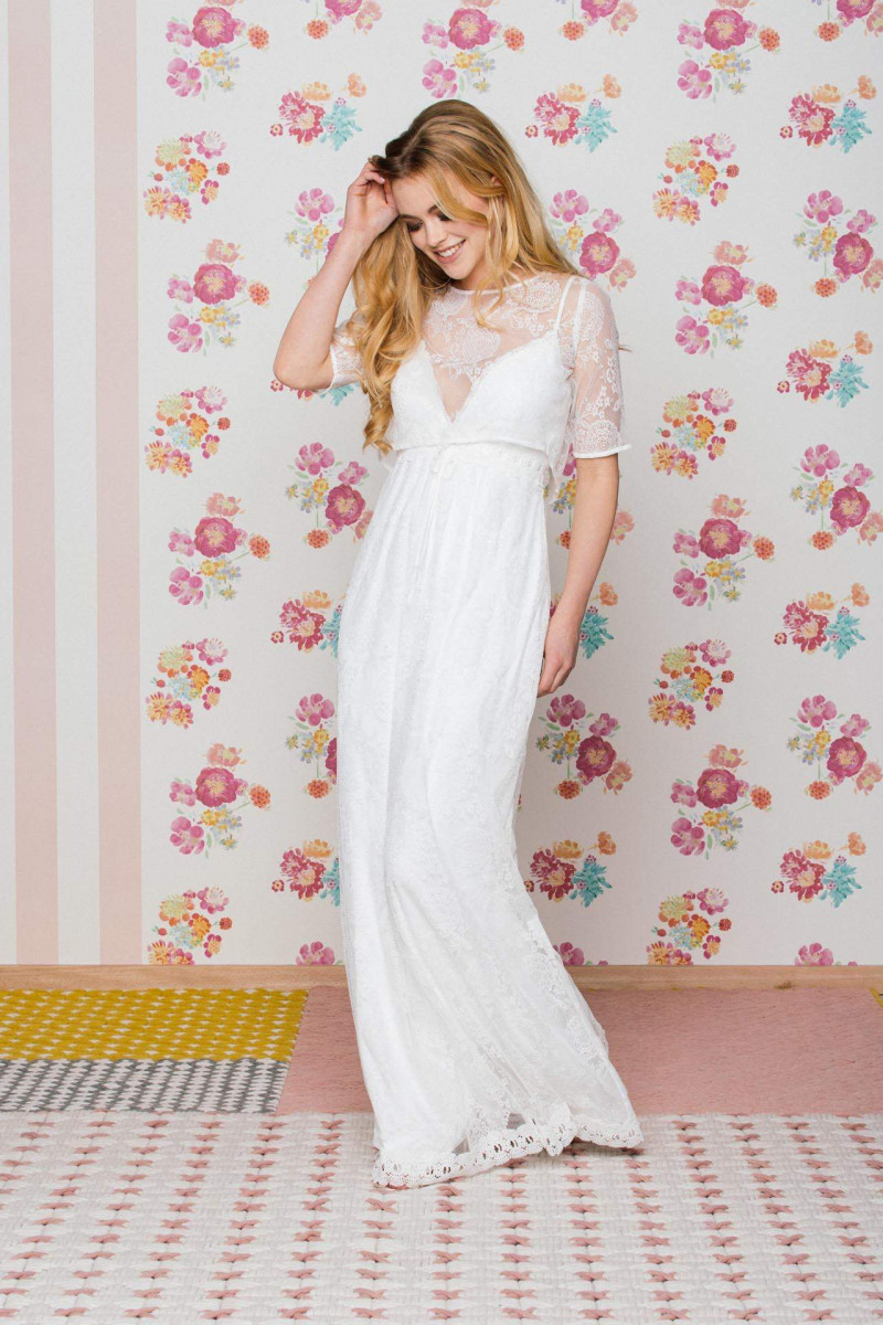 Die neue küssdiebraut Kollektion spricht selbstbewusste, moderne Bräute an, die in einem Brautlook fernab des Mainstreams heiraten möchten. Ob als Hippie, Boho, Vintage, freche oder urbane Braut, 2019 wird sich individuell und authentisch getraut! Designerin Kerstin Mechler liebt zarte Spitzenstoffe in den unterschiedlichsten Designs – mit Blüten, Tupfen, Ranken, Wellen oder Schmetterlingen. Gepaart mit fließenden Seidenröcken versprühen sie 20er Jahre Flair und allover in federleichten, lockeren Silhouetten zaubern sie lässige 70ies Hippie Brautkleider. Ein Highlight der neuen Kollektion sind die luftigen Ibiza Brautkleider mit zarten Spaghettiträgern oder handgehäkeltem Neckholder, die nicht nur bei einer Strandhochzeit Urlaubsfeeling verbreiten. Passend dazu werden goldene Body Chains und große baumwollige Boho Tücher statt Boleros kombiniert. Auch die 50er Jahre stehen bei küssdiebraut hoch im Kurs, weit schwingende Tellerröcke und farbige Petticoats verbreiten gute Laune und Tanzstimmung und witzige 60ies Minikleider sind perfekt für unkonventionelle Standesamt Bräute. Abgerundet wird die Kollektion durch schlichte, lässig urbane Brautkleider in Chiffon und einem coolen Jumpsuit für entspannte Bräute. Ob kurzes oder langes Brautkleid – der Blickfang liegt in dieser Saison am Oberkörper: die Designerin spielt mit den unterschiedlichsten Armlösungen von amerikanischem Armausschnitt über Trägervarianten, Flügelbis Langarm mit Fledermaus- und Trompetenärmeln und betont den Rücken durch raffinierte Schlitze, tief geschnittene Ausschnitte oder transparente Spitzeneinsätze.