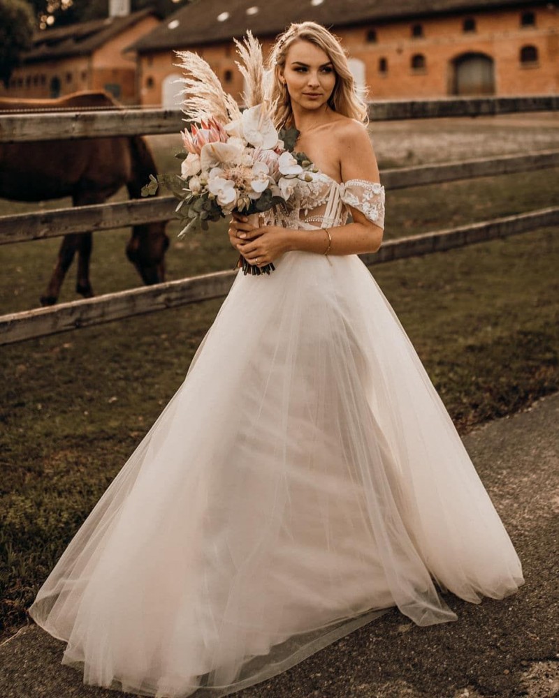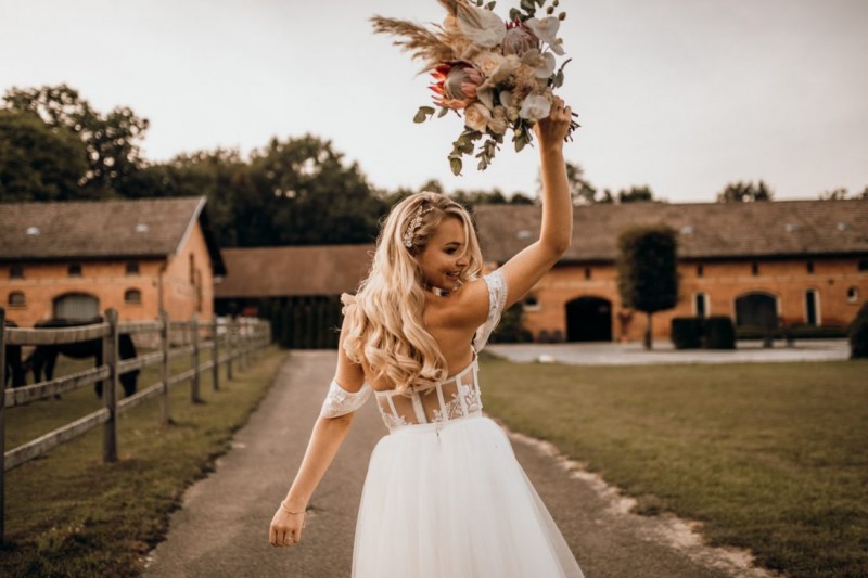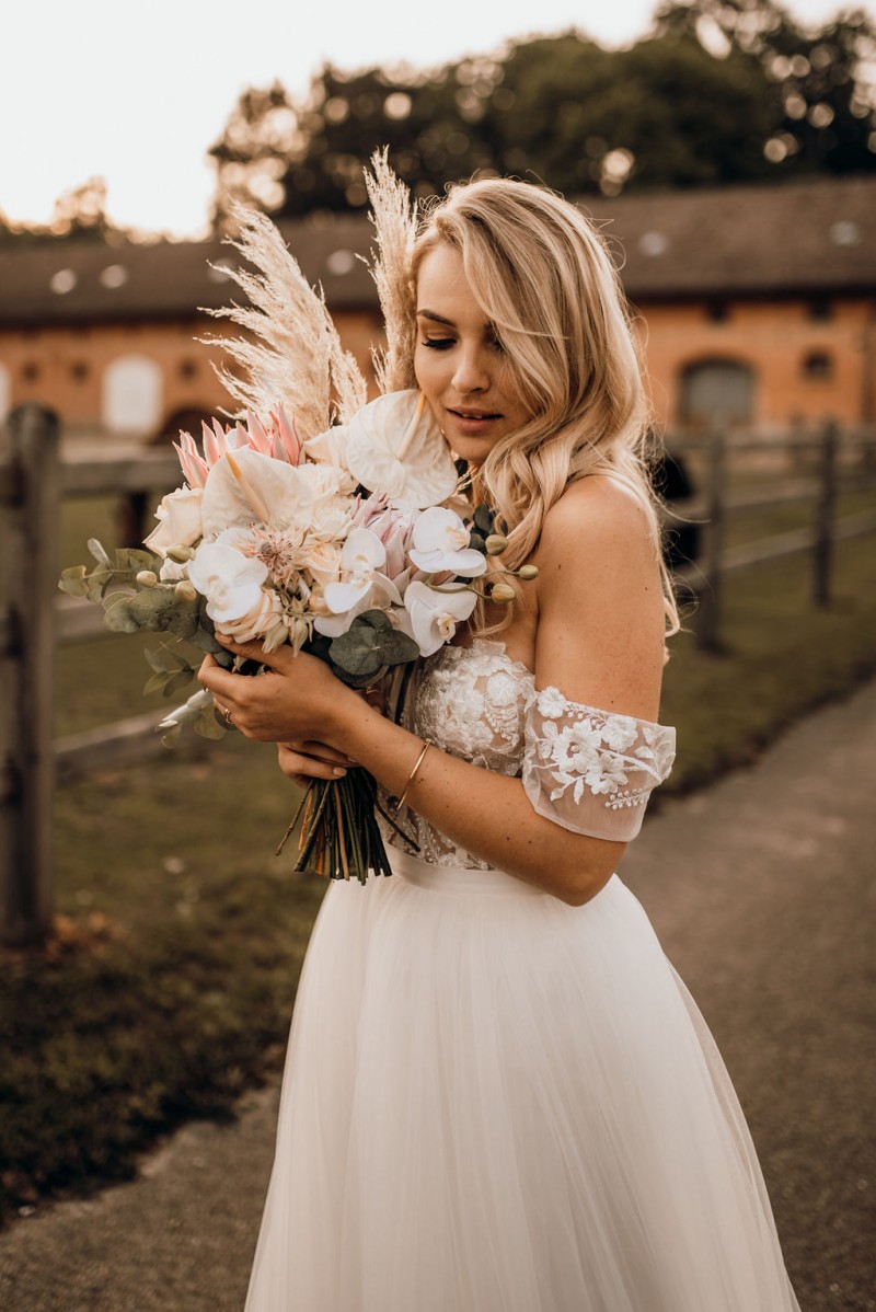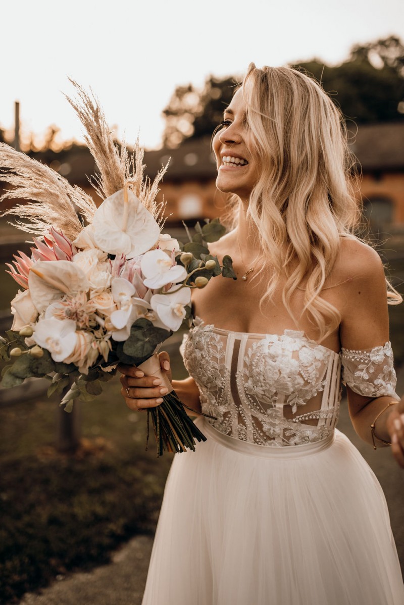 Dieser wunderschöne Brautstrauß war im vergangenen Juli Teil einer einmalig schönen Bohohochzeit in einer Festscheune. Und er findet heute, zu meinem Glück, mit diesem Artikel in die Rubrik Brautstrauß Inspirationen. Zu Recht, denkt ihr gerade sicherlich. Der wilde und dennoch nicht zu opulente Brautstrauß dieser wundervollen Bohobraut ist bestückt mit weißen Orchideen, mehreren Königsproteas namens „Cynaroides“ in apricot-creme, weißen Anthurien und cremefarbenen Rosen. Eine romantische und stilvolle Kombination, die nicht zu aufdringlich ist und der hübschen Braut genug Raum zum Strahlen lässt. Ungebleichtes Pampasgras ragt wild aus diesem Blumenbouquet hinaus, das mit frischem Eukalyptus einen herrlichen Rahmen bekommt. Ein weiterer Hingucker dieses grandiosen Brautstraußes sind die kleinen aber sehr feinen Serruria Florida im Farbton Blushing Bride. Dieses Proteagewächs ist zierlich, macht aber sehr viel her. Und wie genial diese florale Kombination wirkt und wie wunderschön die Braut damit für ihre Bohohochzeit geschmückt wurde, das könnt ihr unbestritten in den tollen Hochzeitsbildern sehen. Und die zauberhaften Brautjungfern samt eigener Brautjungfernsträußen können sich auch mehr als nur sehen lassen! Was für eine tolle Bridalcrew!
