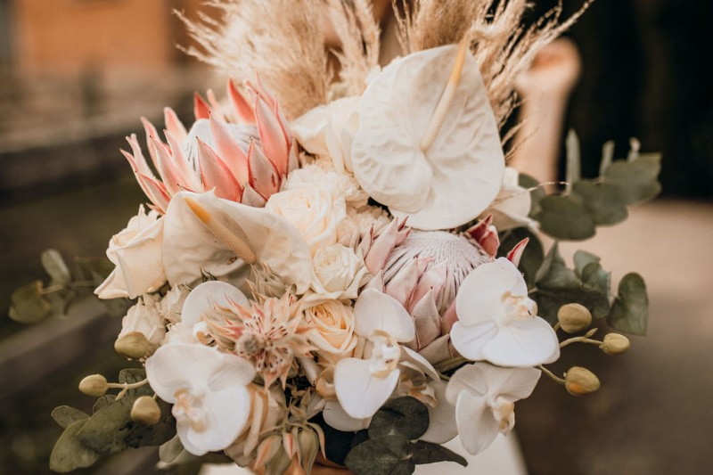 Magical Boho – Brautstrauß Inspiration mit weißen Orchideen, Anthurien und Königsprotea