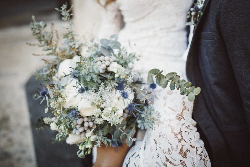 Im schönen Valencia fand dieses tolle Brautpaarshooting statt, aus dem nun diese Brautstrauß Inspiration voller Wintervibes entspringt. Wild und dennoch harmonisch schmückt dieser Brautstrauß die hübsche Braut. Eukalyptus und der beerenartige Kaffeebusch bilden den schönen Greenery Stil, der durch große weiße Ranunkeln namens Cloni Cover, edle blaue Disteln, Sterndolden in grün-silber sowie Lisianthus in Rosita Weiß zum absoluten Hingucker wird. Durch die silbernen Akzente erfährt der Brautstrauß etwas Kühles, das durch die weißen und blauen Farbtupfen schon die Lust auf den Frühling erweckt. Eine wirklich harmonische und dennoch auffällige Kombination.