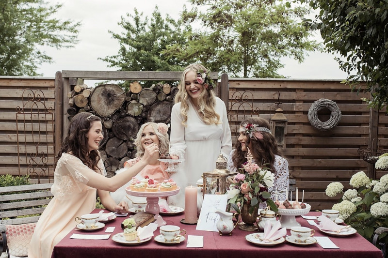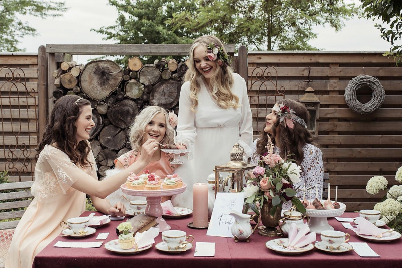Protzen statt kleckern! Das gilt garantiert für diese Bridalshower Inspiration! Hier erwarten euch gleich mehrere Settings und Stylings! Der Grund dafür ist ganz einfach: Dieses Thema hält unbegrenzte Möglichkeiten bereit! Aber zum Anfang. Einfach einen wunderschönen Tag unter Mädels verbringen, nur die Braut und ihre Mädchen. In eine entspannte und märchenhafte Atmosphäre eintauchen. Ob locker in Jeans, in zarten Kleidchen ODER in Mode eines geliebten Jahrzehnts – eine einmalige Situation, die man nutzen sollte! Vielleicht seid ihr Fans von Gatsby oder Grease? Oder habt Lust das Dirndl nochmal aus dem Schrank zu holen? Darf es ein Bohofest sein? Vielleicht ein Flowercrown- und Bridalbouquetworkshop? Hier könnt ihr euch so richtig austoben! Bei diesem Styled Shoot steht alles im Zeichen Vintage! Dazu gibt es leckere Sweets und Tee. Dank der lieben Isabel von Modewerkstatt Isabel Felicia könnt ihr euch in diesem Artikel inspirieren lassen! Fotografisch festgehalten wurde dieser Ladies Tea von Augenblick Photografie, Mima Photography, Witalij Deifel & Stefan Heyder. Verliebt dekoriert und mit Blumen verziert, wurde von heartbeat PROJECTS. Das gleiche gilt für die tollen Brautsträuße und den blumigen Haarschmuck. Die hübsche Papeterie kreierten Papierformat & Papierhimmel und für die stunning Sweets sorgte Zuckerkrönchen. Kommen wir zu den zauberhaften Ladies, die diesen Tag sicher mehr als nur genossen haben! Die Outfits kreierte Modewerkstatt Isabel Felicia, das Hair & Makeup zauberten Wenke Dittrich makeup and hair, Isabell Zacharias, Olga Deifel& Katrix Lestrange und die Accessoires sind von Mialine. Ich freu mich riesig, euch diese Varianten einer Tea Party zeigen zu dürfen! Habt ganz viel Freude damit!