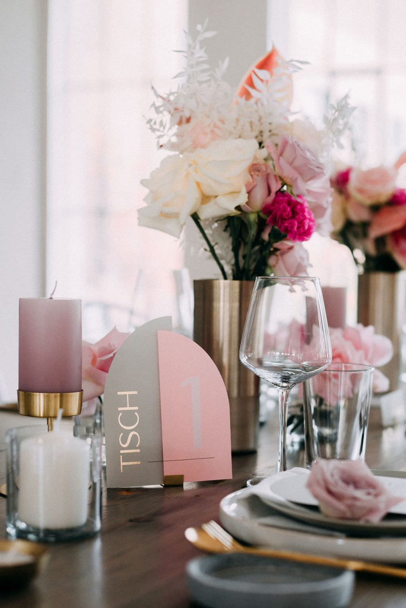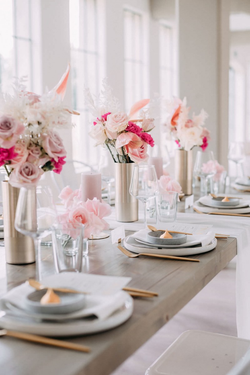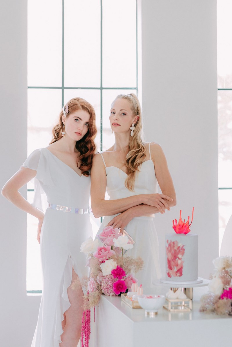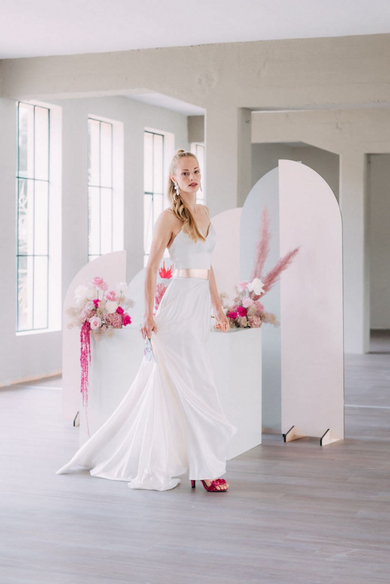 Candy Colors – wer liebt sie nicht! Gerade im Sommer wollen wir Farbe! In dieser tollen Inspiration für moderne Hochzeiten finden sich sowohl feine Pastellnuancen, als auch kräftige Farbakzente. Neben Dekoration und Floristik in den schönsten Candy Farben in Pink, Blush und Rosa, gibt es natürlich auch echte Sweets zu bestaunen. Doch fangen wir von Vorn an. Fotografiert wurde diese elegante als auch moderne Hochzeitsinspiration von Hochzeitsfotografin Julie Schönewolf. Sie hat die wunderschöne Szenerie im Kloster Altzella fotografisch für uns festgehalten, die von Hochzeitsplanerin Raissa von marrylight wedding & event für uns organisiert wurde. Das Konzept, die Dekoration und die Floristik kreierte Bash Design Concepts. Bekannt für zeitlose sowie stilvolle Designs, setzen sie hier auf kühle Details aus Beton, Akzente in warmem Gold und natürlich die spritzigen Candy Colors. Die harmonische Kombination aus Grau und Rosa wird durch leichtes Weiß ergänzt und durch knalliges Pink zum absoluten Hingucker! Elegant durch edle Rosen und aufgelockert durch gebleichten Ruscus, pinke Edelnelken, Amaranthus und Anthurien, pulsiert dieses elegante und klare Setting. Perfekt auf das klare Konzept abgestimmt, wurde auch die moderne Hochzeitspapeterie von Liebe-ist-Heiraten. Besonders die transparenten Details und die Kombination aus schwarzer und weißer Schrift komplementieren die Grau- und Rosatöne durch ihr minimalistisches Design. Der Sweet Table mit auffälliger Hochzeitstorte, feinen Törtchen, Macarons und Baiser, von MY Cakes & Sweets, steht dem Candy Crush Konzept in nichts nach. Ein weiteres Highlight dieser Hochzeitsinspiration sind die Bräute! Ihr habt richtig gehört, hier erwarten euch gleich zwei tolle Brautlooks, die elegant und modern begeistern. Junika Wedding Concept Store kleidete die hübschen Bräute Lisa & Theresa für diese Inspiration in zwei zauberhafte Brautkleider und kreierte zudem das elegante Hair & Makeup. Euch erwarten herrlich fließende Stoffe, tiefe Rückenausschnitte, feine Perlendetails sowie besondere Accessoires. Der auffällige Schmuck und die coolen Gürtel der beiden sind von Mia&Martha & Stefanscaro, deren Produkte ihr ebenfalls bei Junika Wedding Concept Store finden könnt. Die variablen Brautschuhe, die mit austauschbare Absätzen geliefert werden, sind von Mime et moi. Und jetzt darf ich euch ganz viel Freude mit dieser tollen Hochzeitsinspiration wünschen! Genießt die grandiosen Candy Vibes!