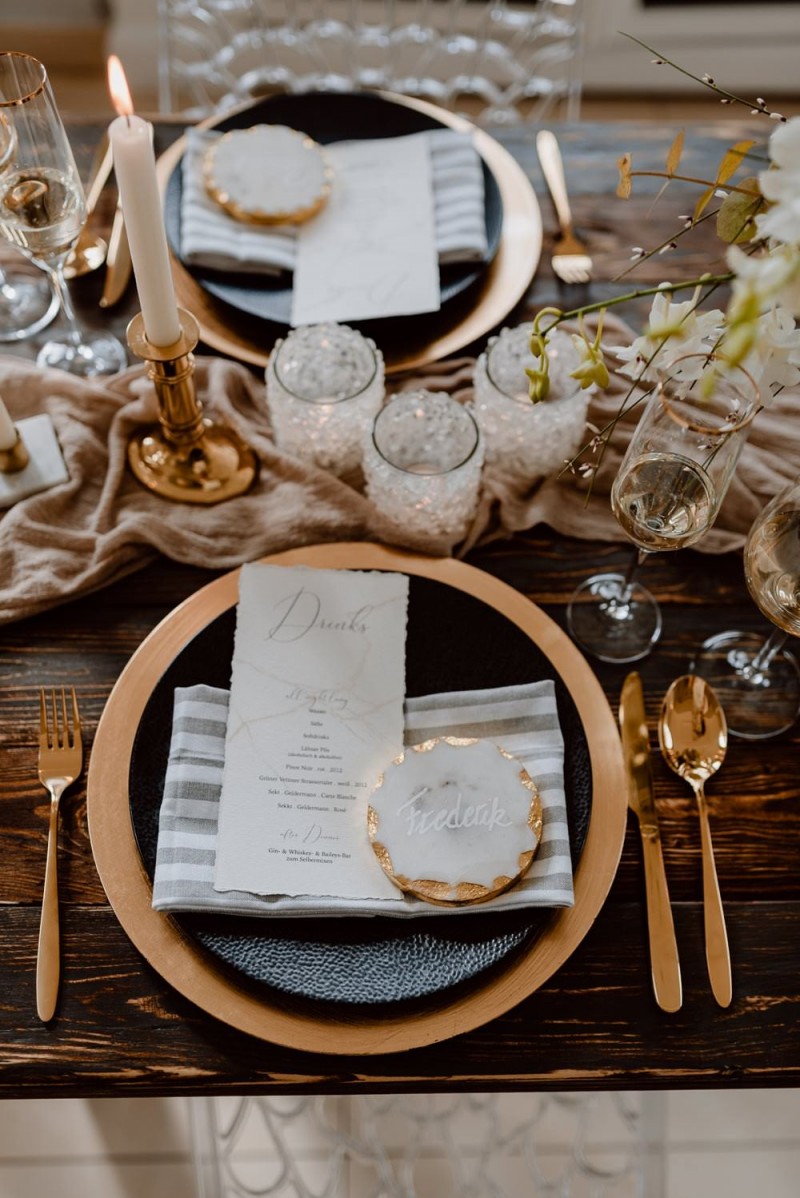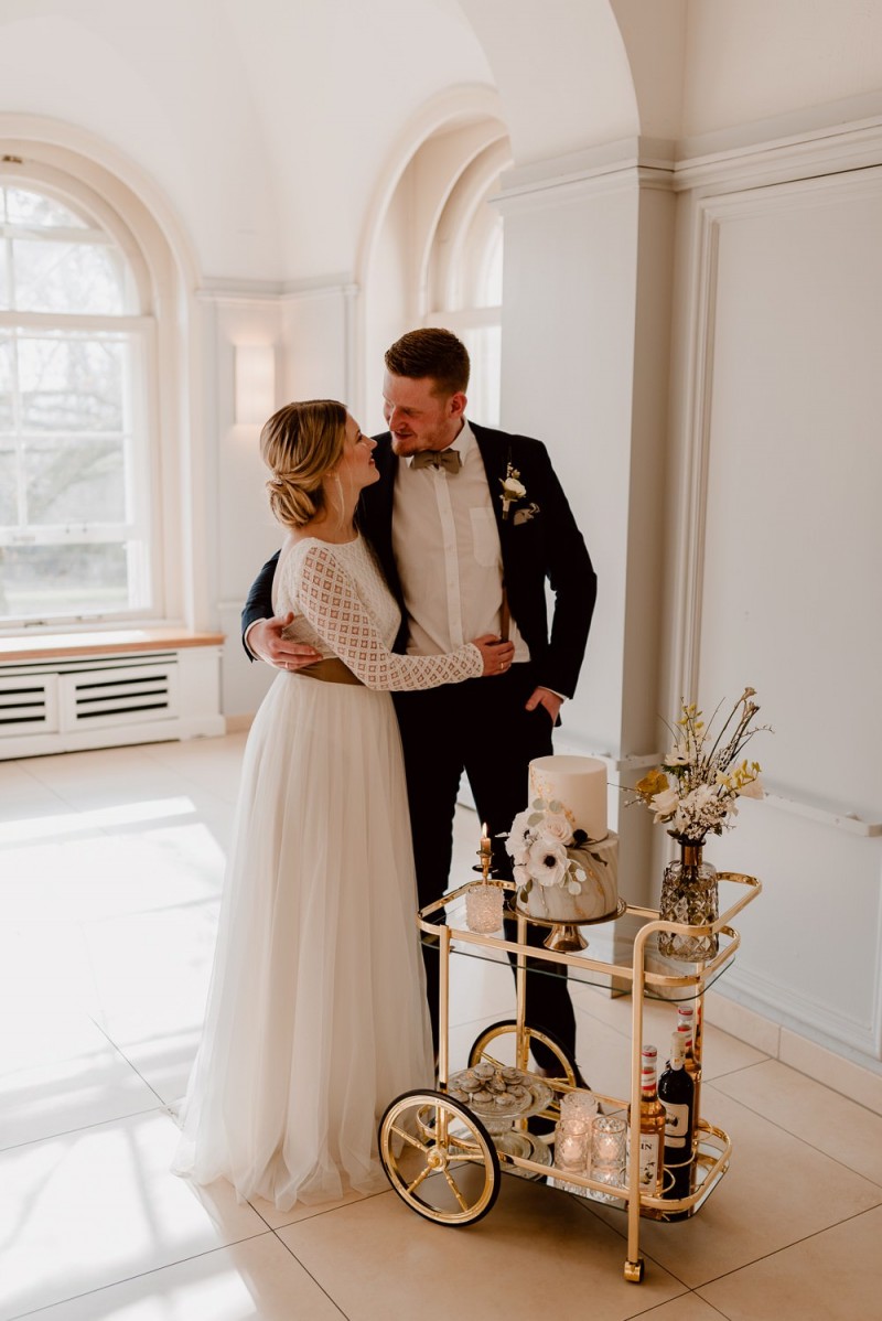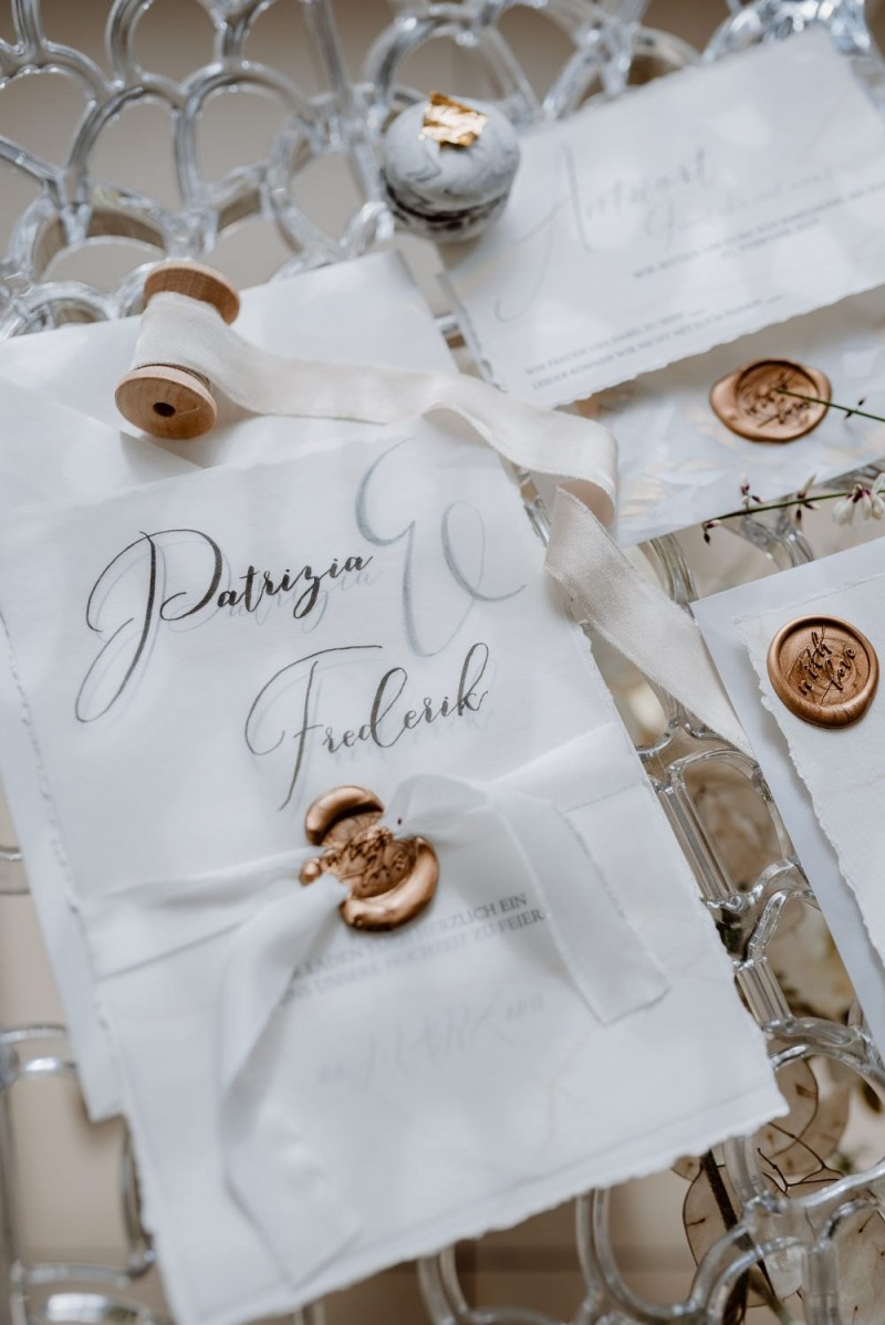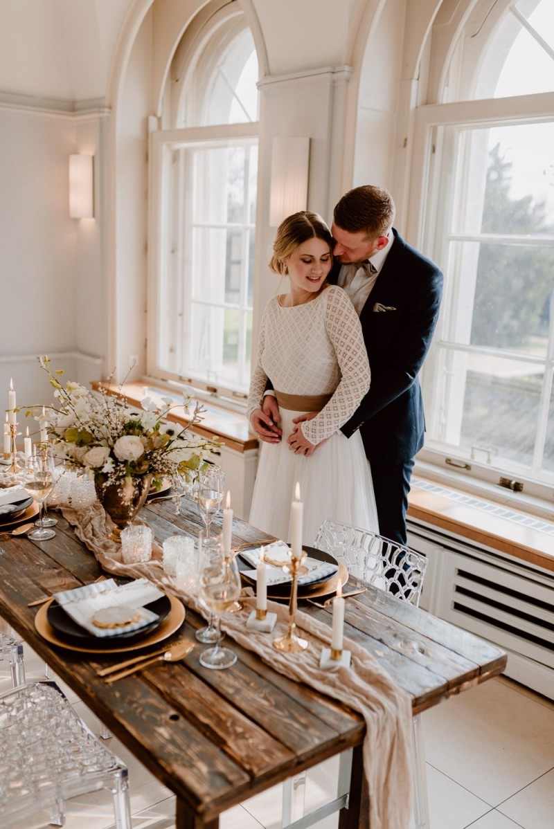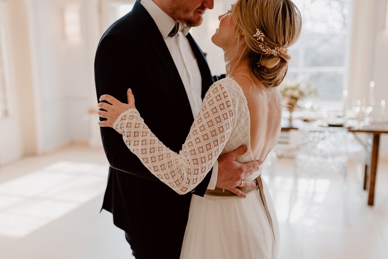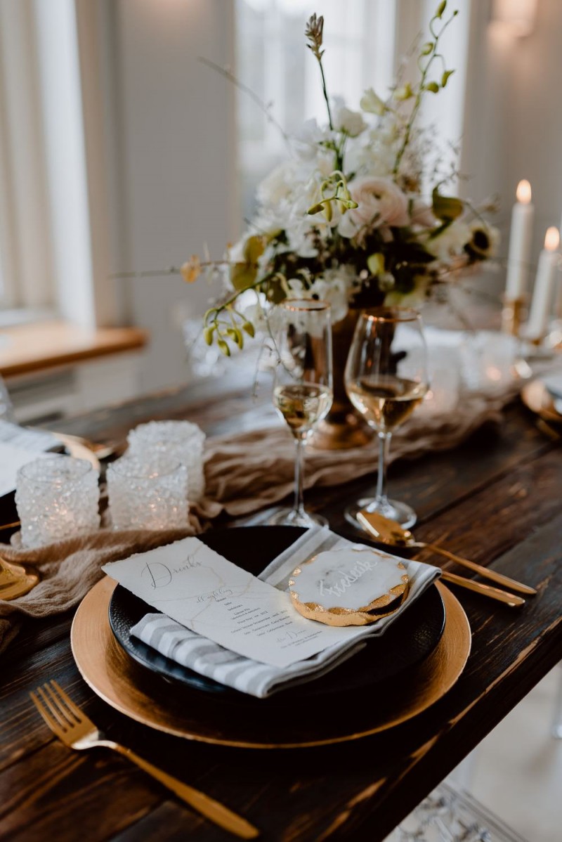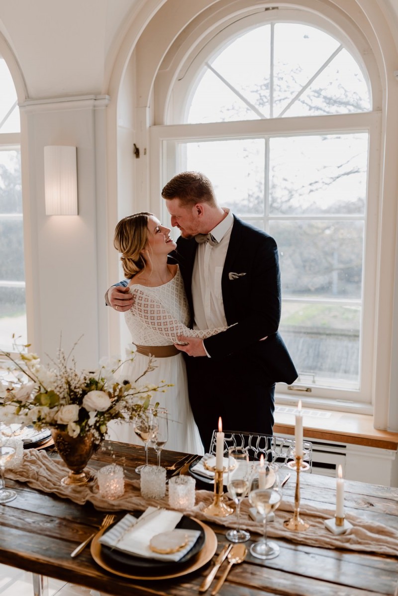 In dieser Inspiration einer Hochzeit ganz im Motto Gold meets Marble, warten ein zuckersüßes Brautpaar und ganz viele feine Details auf euch! Romantisch wird es ebenfalls, nicht zuletzt, weil diese Hochzeitsinspiration im hübschen Schloss Styrum entstanden ist. Vor allem aber dominieren die klassischen und festlichen Vibes. Hochzeitsfotografin Nicole Otto Photographie hat diese Inspiration für uns fotografiert, bei der sie auch die zarte Hochzeitspapeterie entworfen hat. Schon hier trifft Klassik auf Romantik durch die Verwendung von weißem Papier mit gerissenen Kanten, schwarzer geschwungener Schrift, goldenen Siegeln und zarte Seidenbändern von Oh so preppy. Perfekt dazu wählte Anna von Miet me at the wedding die Dekoration. Fließende Stoffe, goldene Details, die auf zarte Blumen und schwarze Akzente treffen. Die Floristik übernahm Runo Blumen und setzte mit weißen Details und einem Hauch Farbe auf die klassische Schönheit mit einem wilden Touch. Während die große dunkle Tafel klassisch wirkt, sind die durchsichtigen Stühle ein toller und moderner Hingucker, den der Möbelverleih Sitzplätzchen hier für uns durch die gesamte Möbelwahl inszeniert. Natürlich ist auch das Brautpaar ein absoluter Hingucker. Auch hier dominieren klassische Züge. Das Brautkleid ist ein Zweiteiler von Noni Mode, dessen Oberteil durch einen hochgeschlossenen Schnitt und lange Ärmel begeistert. Dazu kombiniert, ein zarter und fließender Tüllrock, der den klassischen Look um eine Portion Romantik erweitert. Dank des farblich abgesetzten Gürtels und einem kuscheligen Pullover passt die Braut perfekt in die festliche Szenerie und setzt weiche Akzente an der Seite ihres Bräutigams im schwarzen Anzug mit Fliege. Auch das Brautstyling wurde eher klassisch gehalten und von Hair & Makeup Artist Lisa Knape kreiert. Perfekt ergänzt um die kleinen Ohrstecker und das zarte Headpiece von La Chia Headpieces. Natürlich wurde an diesem Tag auch an das leibliche Wohl gedacht. Die wunderschöne Hochzeitstorte teils in weißem Fondant, teils in Marmoroptik und mit zarten Blüten aus Fondant verziert, kreierte The Baker’s Wife. So wie auch die besonderen Macarons im Marmorlook mit feinem Blattgold. Klassisch muss eben nicht starr sein. Im Gegenteil! Durch die Wahl moderner Akzente und Materialen entsteht Leichtigkeit, die den klassischen Look neu interpretiert. Ganz viel Freude euch mit dieser feinen Inspiration in Gold und Marble!