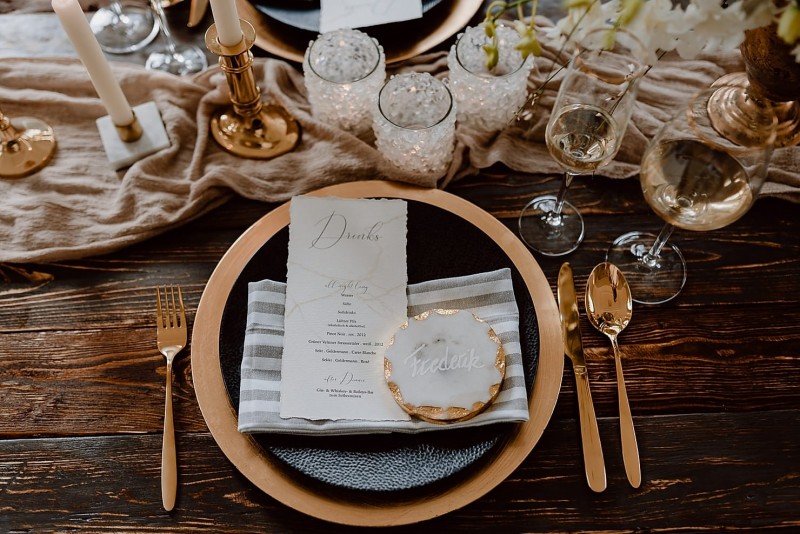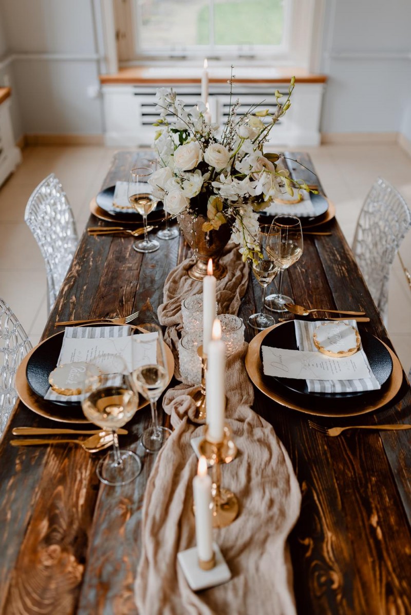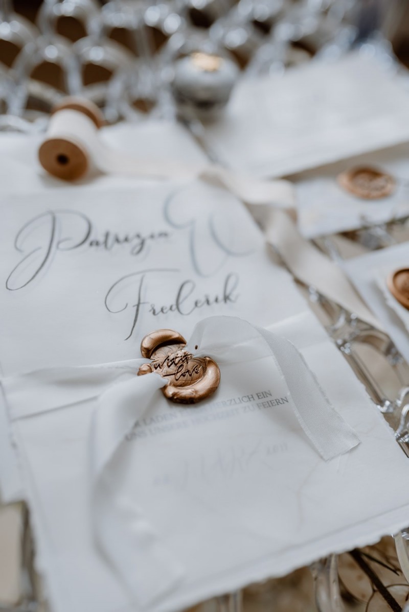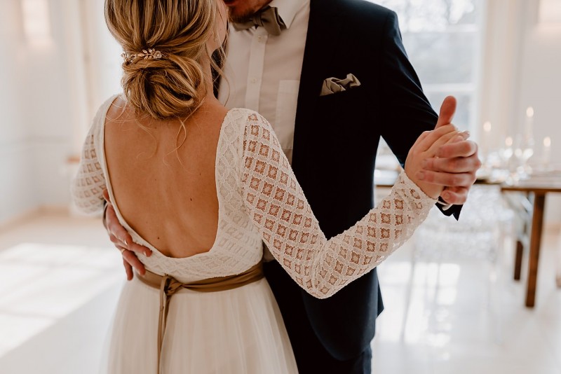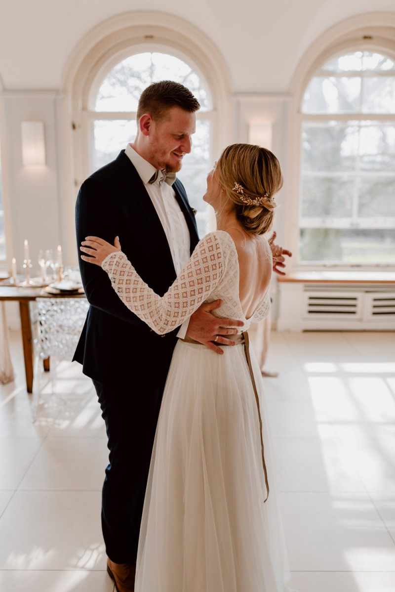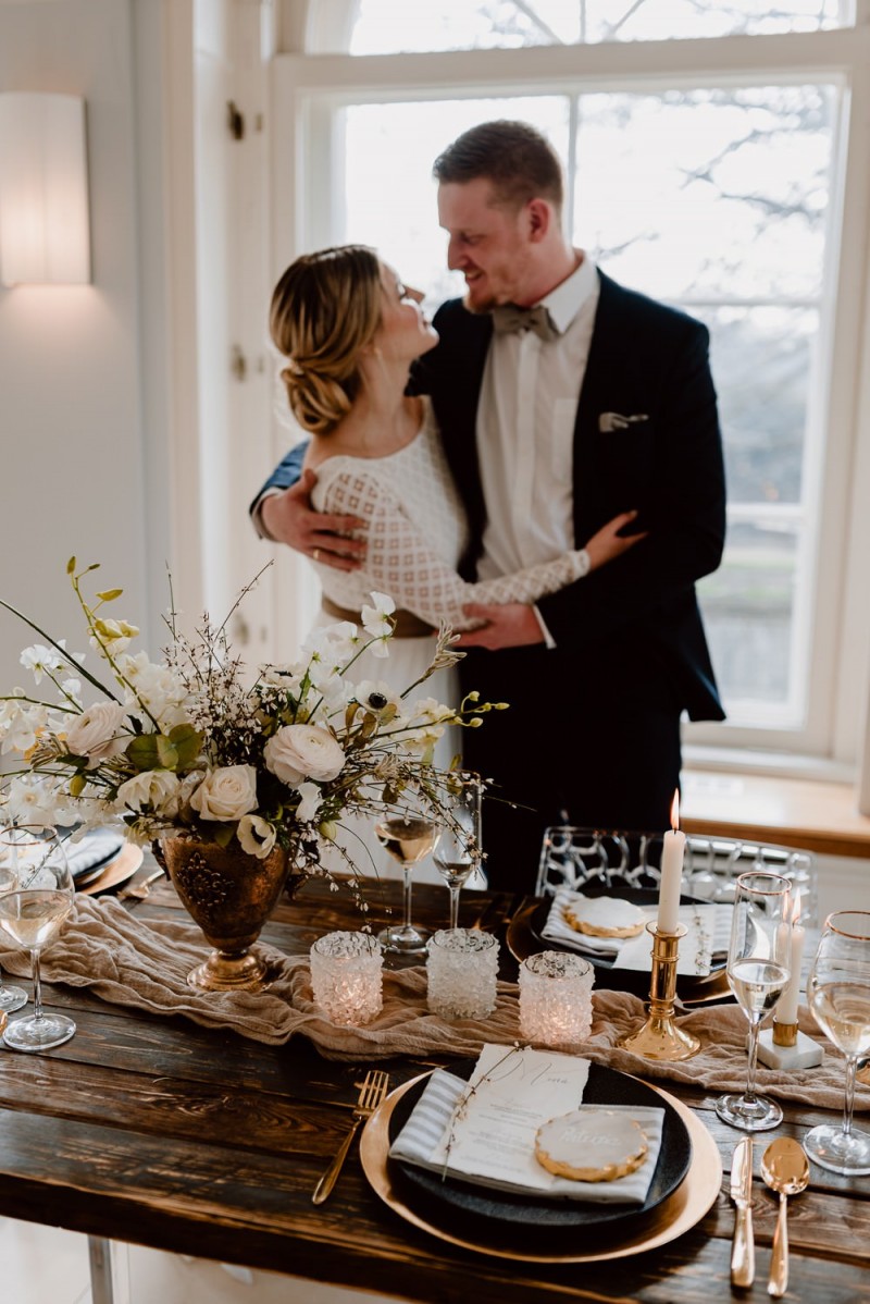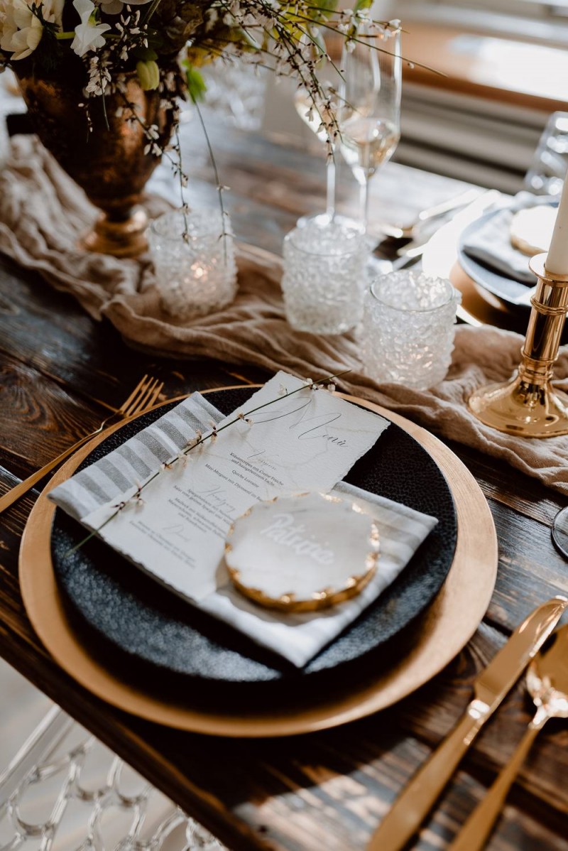 In dieser Inspiration einer Hochzeit ganz im Motto Gold meets Marble, warten ein zuckersüßes Brautpaar und ganz viele feine Details auf euch! Romantisch wird es ebenfalls, nicht zuletzt, weil diese Hochzeitsinspiration im hübschen Schloss Styrum entstanden ist. Vor allem aber dominieren die klassischen und festlichen Vibes. Hochzeitsfotografin Nicole Otto Photographie hat diese Inspiration für uns fotografiert, bei der sie auch die zarte Hochzeitspapeterie entworfen hat. Schon hier trifft Klassik auf Romantik durch die Verwendung von weißem Papier mit gerissenen Kanten, schwarzer geschwungener Schrift, goldenen Siegeln und zarte Seidenbändern von Oh so preppy. Perfekt dazu wählte Anna von Miet me at the wedding die Dekoration. Fließende Stoffe, goldene Details, die auf zarte Blumen und schwarze Akzente treffen. Die Floristik übernahm Runo Blumen und setzte mit weißen Details und einem Hauch Farbe auf die klassische Schönheit mit einem wilden Touch. Während die große dunkle Tafel klassisch wirkt, sind die durchsichtigen Stühle ein toller und moderner Hingucker, den der Möbelverleih Sitzplätzchen hier für uns durch die gesamte Möbelwahl inszeniert. Natürlich ist auch das Brautpaar ein absoluter Hingucker. Auch hier dominieren klassische Züge. Das Brautkleid ist ein Zweiteiler von Noni Mode, dessen Oberteil durch einen hochgeschlossenen Schnitt und lange Ärmel begeistert. Dazu kombiniert, ein zarter und fließender Tüllrock, der den klassischen Look um eine Portion Romantik erweitert. Dank des farblich abgesetzten Gürtels und einem kuscheligen Pullover passt die Braut perfekt in die festliche Szenerie und setzt weiche Akzente an der Seite ihres Bräutigams im schwarzen Anzug mit Fliege. Auch das Brautstyling wurde eher klassisch gehalten und von Hair & Makeup Artist Lisa Knape kreiert. Perfekt ergänzt um die kleinen Ohrstecker und das zarte Headpiece von La Chia Headpieces. Natürlich wurde an diesem Tag auch an das leibliche Wohl gedacht. Die wunderschöne Hochzeitstorte teils in weißem Fondant, teils in Marmoroptik und mit zarten Blüten aus Fondant verziert, kreierte The Baker’s Wife. So wie auch die besonderen Macarons im Marmorlook mit feinem Blattgold. Klassisch muss eben nicht starr sein. Im Gegenteil! Durch die Wahl moderner Akzente und Materialen entsteht Leichtigkeit, die den klassischen Look neu interpretiert. Ganz viel Freude euch mit dieser feinen Inspiration in Gold und Marble!