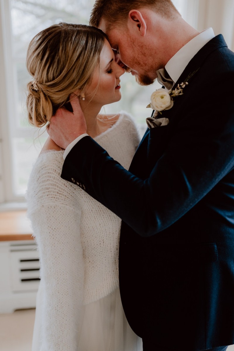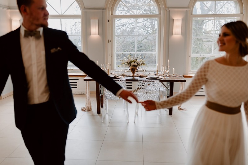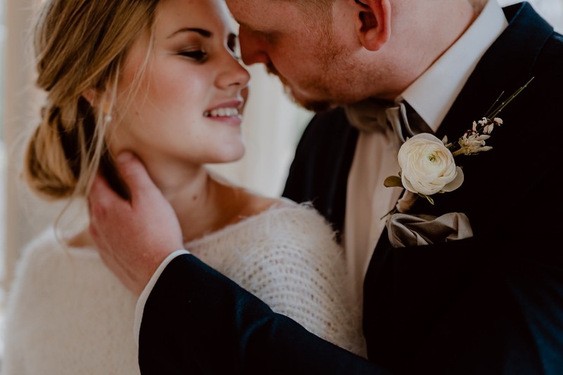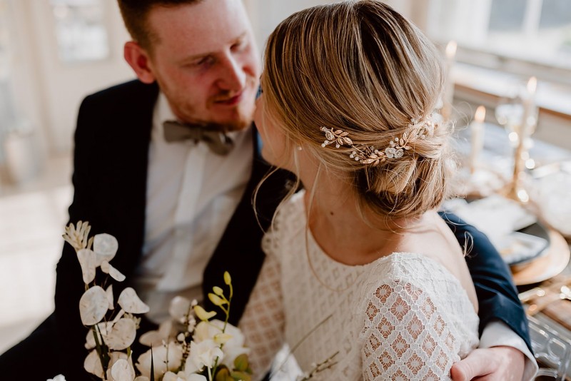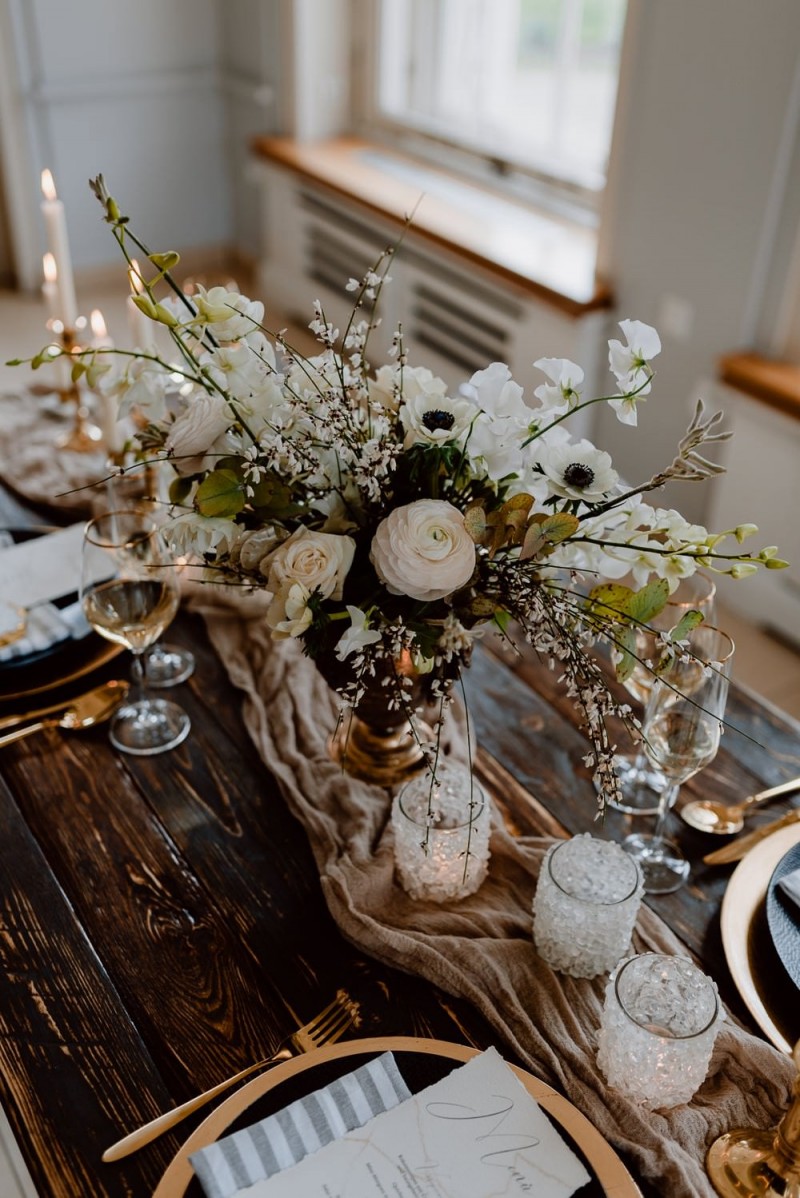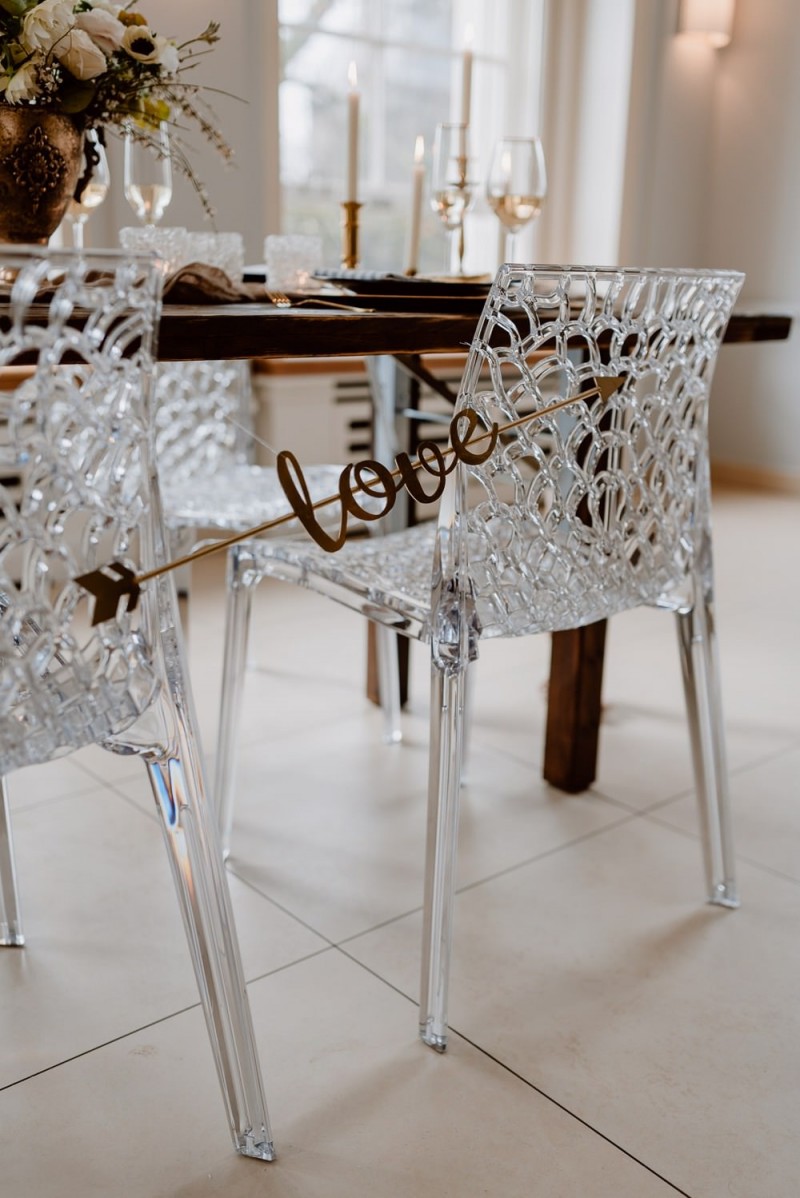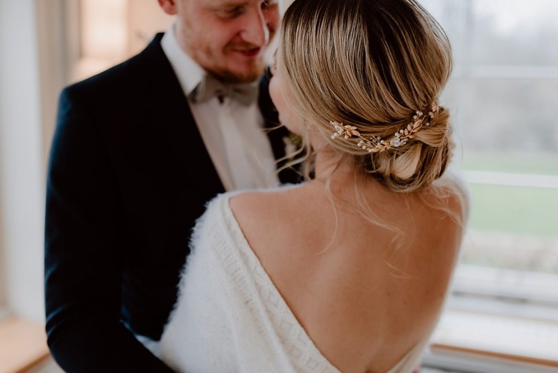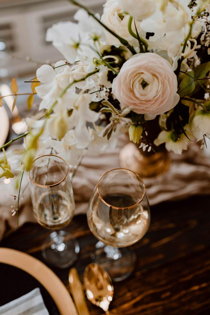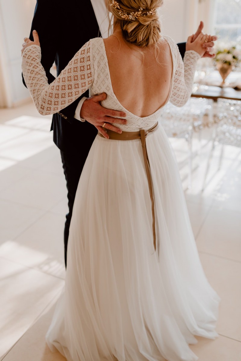 In dieser Inspiration einer Hochzeit ganz im Motto Gold meets Marble, warten ein zuckersüßes Brautpaar und ganz viele feine Details auf euch! Romantisch wird es ebenfalls, nicht zuletzt, weil diese Hochzeitsinspiration im hübschen Schloss Styrum entstanden ist. Vor allem aber dominieren die klassischen und festlichen Vibes. Hochzeitsfotografin Nicole Otto Photographie hat diese Inspiration für uns fotografiert, bei der sie auch die zarte Hochzeitspapeterie entworfen hat. Schon hier trifft Klassik auf Romantik durch die Verwendung von weißem Papier mit gerissenen Kanten, schwarzer geschwungener Schrift, goldenen Siegeln und zarte Seidenbändern von Oh so preppy. Perfekt dazu wählte Anna von Miet me at the wedding die Dekoration. Fließende Stoffe, goldene Details, die auf zarte Blumen und schwarze Akzente treffen. Die Floristik übernahm Runo Blumen und setzte mit weißen Details und einem Hauch Farbe auf die klassische Schönheit mit einem wilden Touch. Während die große dunkle Tafel klassisch wirkt, sind die durchsichtigen Stühle ein toller und moderner Hingucker, den der Möbelverleih Sitzplätzchen hier für uns durch die gesamte Möbelwahl inszeniert. Natürlich ist auch das Brautpaar ein absoluter Hingucker. Auch hier dominieren klassische Züge. Das Brautkleid ist ein Zweiteiler von Noni Mode, dessen Oberteil durch einen hochgeschlossenen Schnitt und lange Ärmel begeistert. Dazu kombiniert, ein zarter und fließender Tüllrock, der den klassischen Look um eine Portion Romantik erweitert. Dank des farblich abgesetzten Gürtels und einem kuscheligen Pullover passt die Braut perfekt in die festliche Szenerie und setzt weiche Akzente an der Seite ihres Bräutigams im schwarzen Anzug mit Fliege. Auch das Brautstyling wurde eher klassisch gehalten und von Hair & Makeup Artist Lisa Knape kreiert. Perfekt ergänzt um die kleinen Ohrstecker und das zarte Headpiece von La Chia Headpieces. Natürlich wurde an diesem Tag auch an das leibliche Wohl gedacht. Die wunderschöne Hochzeitstorte teils in weißem Fondant, teils in Marmoroptik und mit zarten Blüten aus Fondant verziert, kreierte The Baker’s Wife. So wie auch die besonderen Macarons im Marmorlook mit feinem Blattgold. Klassisch muss eben nicht starr sein. Im Gegenteil! Durch die Wahl moderner Akzente und Materialen entsteht Leichtigkeit, die den klassischen Look neu interpretiert. Ganz viel Freude euch mit dieser feinen Inspiration in Gold und Marble!