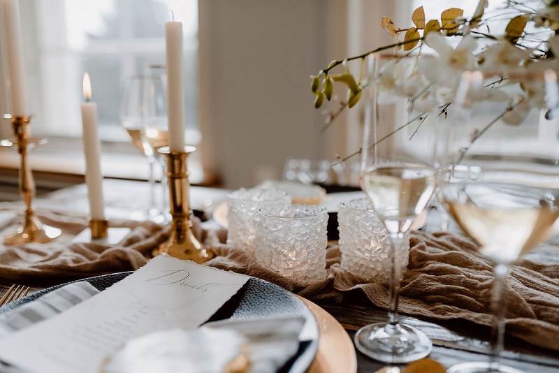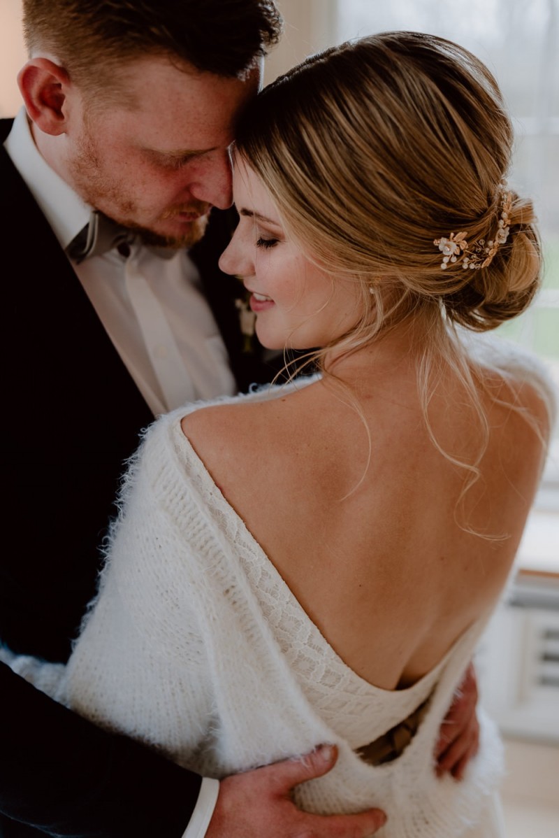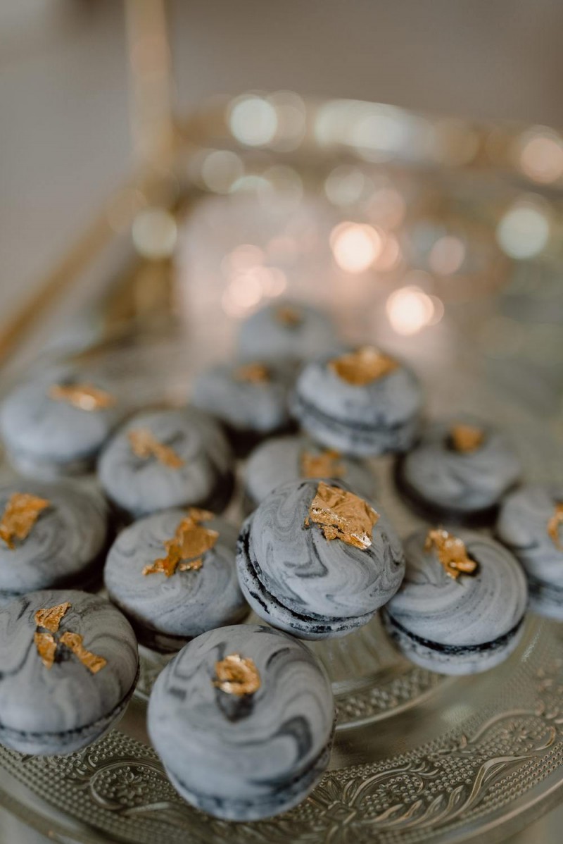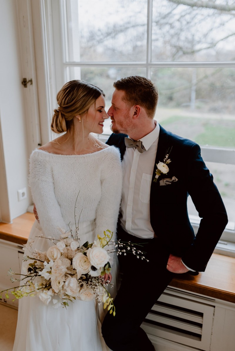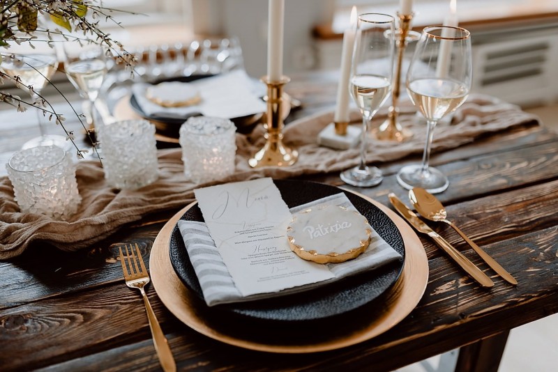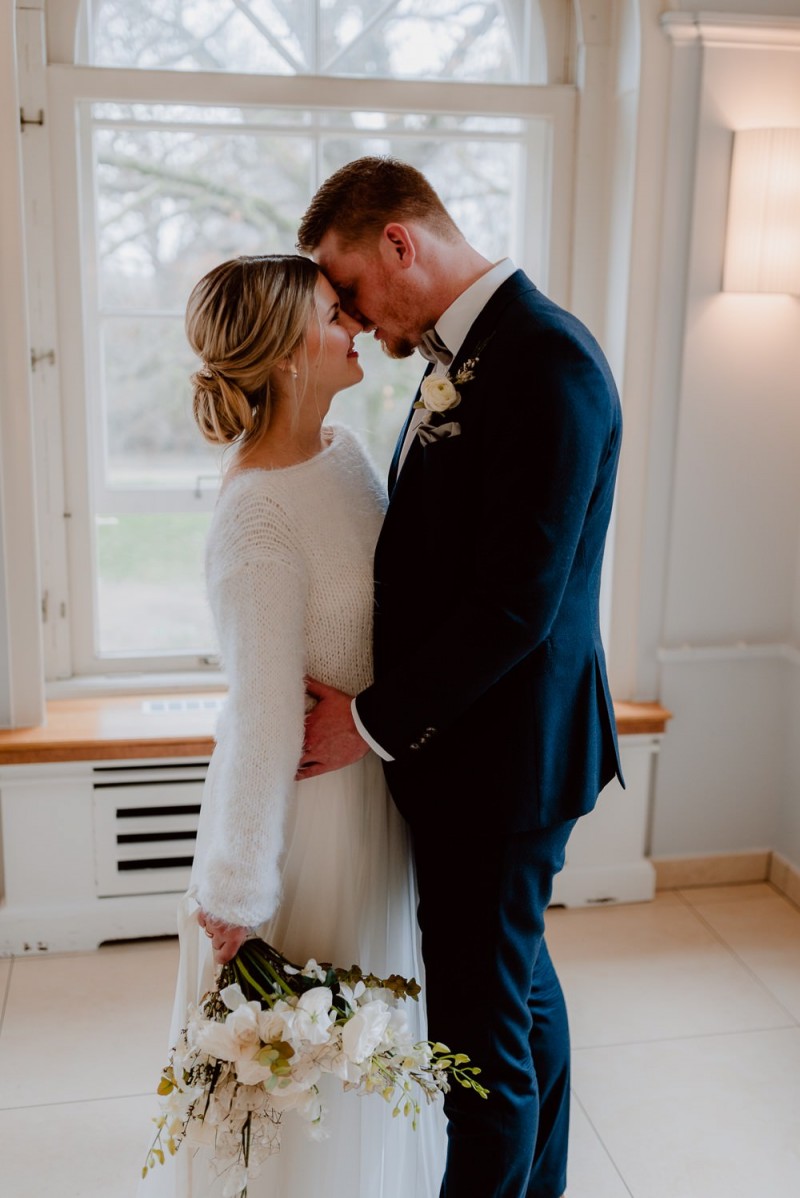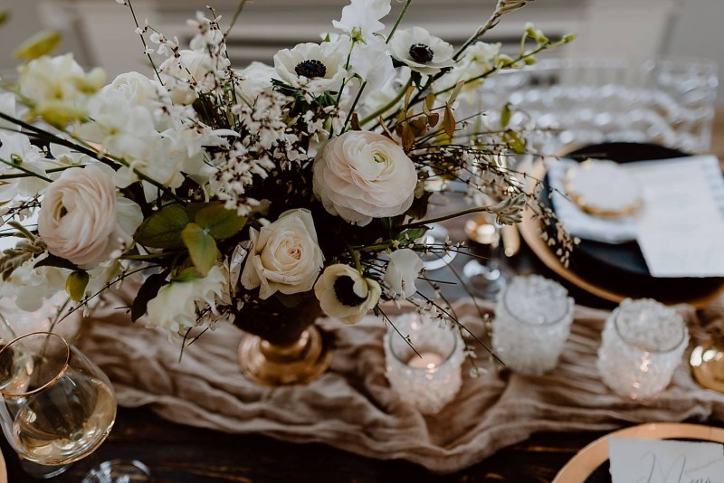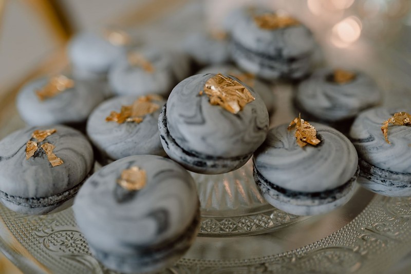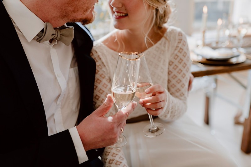 In dieser Inspiration einer Hochzeit ganz im Motto Gold meets Marble, warten ein zuckersüßes Brautpaar und ganz viele feine Details auf euch! Romantisch wird es ebenfalls, nicht zuletzt, weil diese Hochzeitsinspiration im hübschen Schloss Styrum entstanden ist. Vor allem aber dominieren die klassischen und festlichen Vibes. Hochzeitsfotografin Nicole Otto Photographie hat diese Inspiration für uns fotografiert, bei der sie auch die zarte Hochzeitspapeterie entworfen hat. Schon hier trifft Klassik auf Romantik durch die Verwendung von weißem Papier mit gerissenen Kanten, schwarzer geschwungener Schrift, goldenen Siegeln und zarte Seidenbändern von Oh so preppy. Perfekt dazu wählte Anna von Miet me at the wedding die Dekoration. Fließende Stoffe, goldene Details, die auf zarte Blumen und schwarze Akzente treffen. Die Floristik übernahm Runo Blumen und setzte mit weißen Details und einem Hauch Farbe auf die klassische Schönheit mit einem wilden Touch. Während die große dunkle Tafel klassisch wirkt, sind die durchsichtigen Stühle ein toller und moderner Hingucker, den der Möbelverleih Sitzplätzchen hier für uns durch die gesamte Möbelwahl inszeniert. Natürlich ist auch das Brautpaar ein absoluter Hingucker. Auch hier dominieren klassische Züge. Das Brautkleid ist ein Zweiteiler von Noni Mode, dessen Oberteil durch einen hochgeschlossenen Schnitt und lange Ärmel begeistert. Dazu kombiniert, ein zarter und fließender Tüllrock, der den klassischen Look um eine Portion Romantik erweitert. Dank des farblich abgesetzten Gürtels und einem kuscheligen Pullover passt die Braut perfekt in die festliche Szenerie und setzt weiche Akzente an der Seite ihres Bräutigams im schwarzen Anzug mit Fliege. Auch das Brautstyling wurde eher klassisch gehalten und von Hair & Makeup Artist Lisa Knape kreiert. Perfekt ergänzt um die kleinen Ohrstecker und das zarte Headpiece von La Chia Headpieces. Natürlich wurde an diesem Tag auch an das leibliche Wohl gedacht. Die wunderschöne Hochzeitstorte teils in weißem Fondant, teils in Marmoroptik und mit zarten Blüten aus Fondant verziert, kreierte The Baker’s Wife. So wie auch die besonderen Macarons im Marmorlook mit feinem Blattgold. Klassisch muss eben nicht starr sein. Im Gegenteil! Durch die Wahl moderner Akzente und Materialen entsteht Leichtigkeit, die den klassischen Look neu interpretiert. Ganz viel Freude euch mit dieser feinen Inspiration in Gold und Marble!