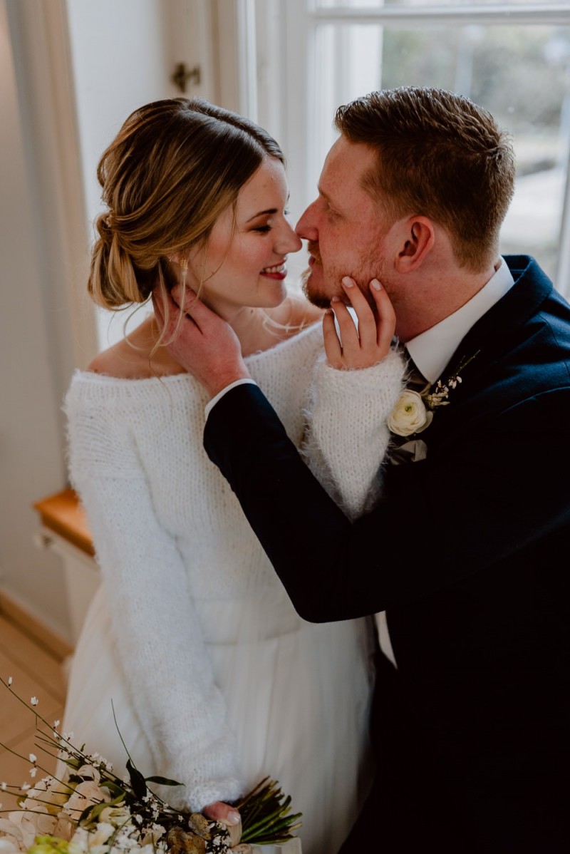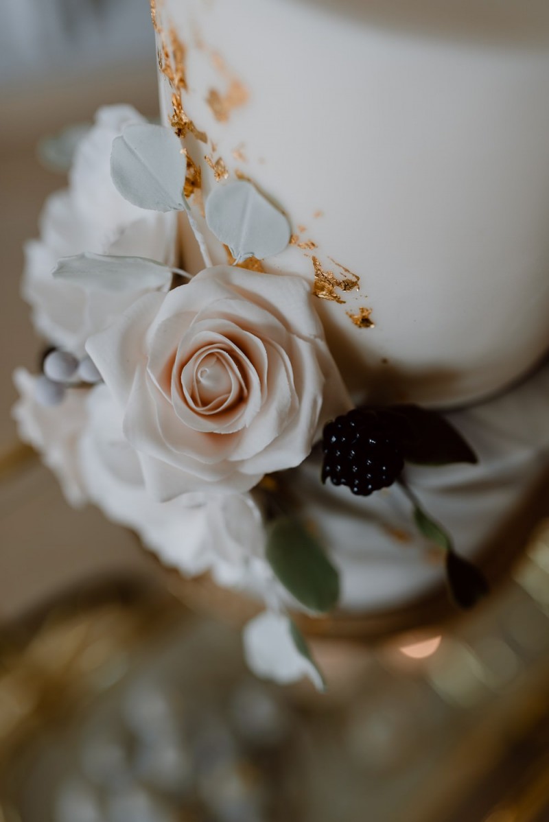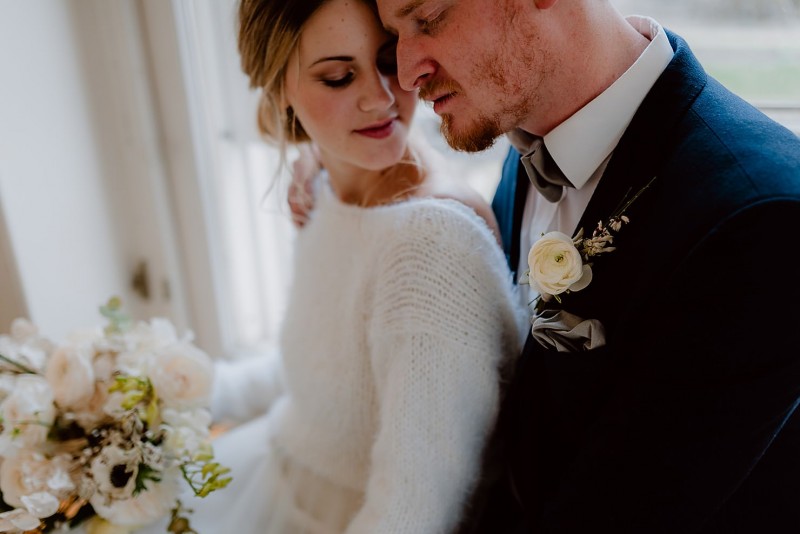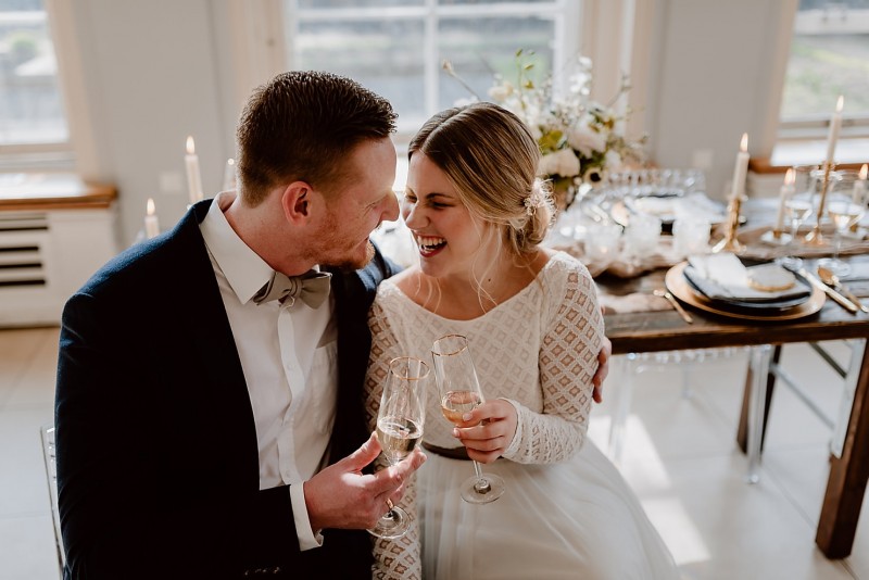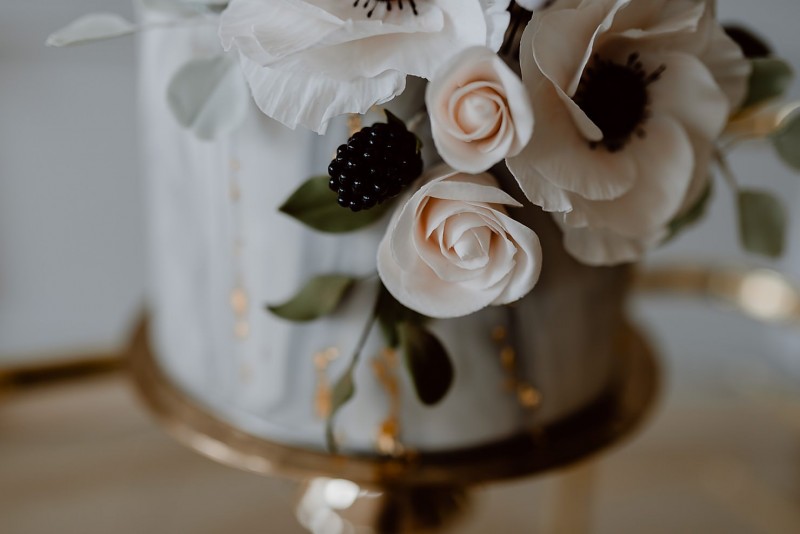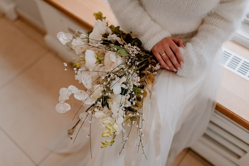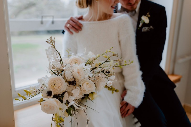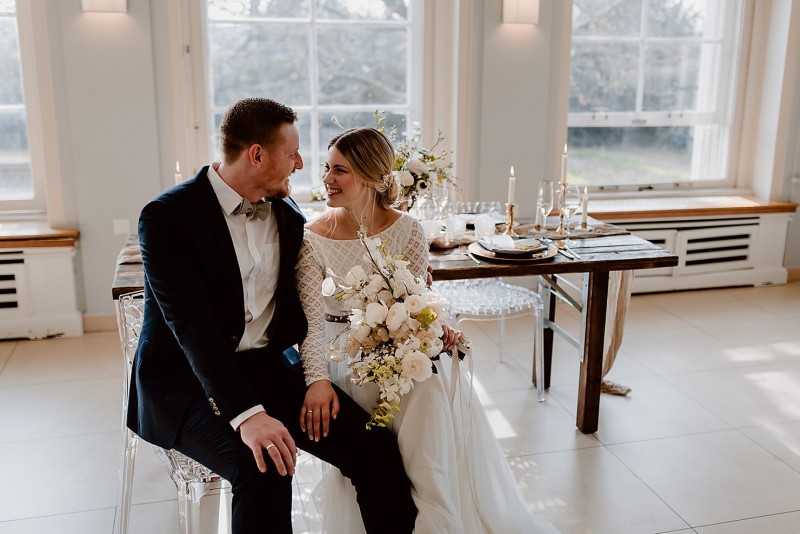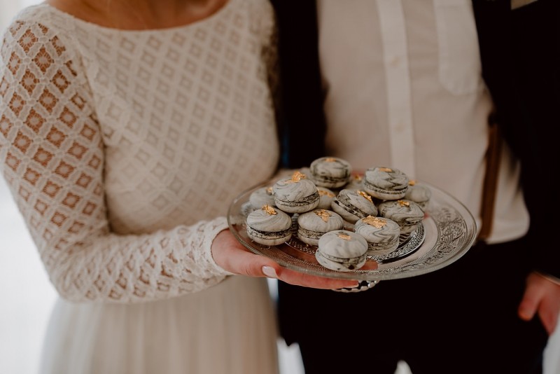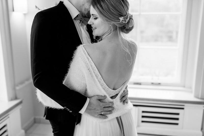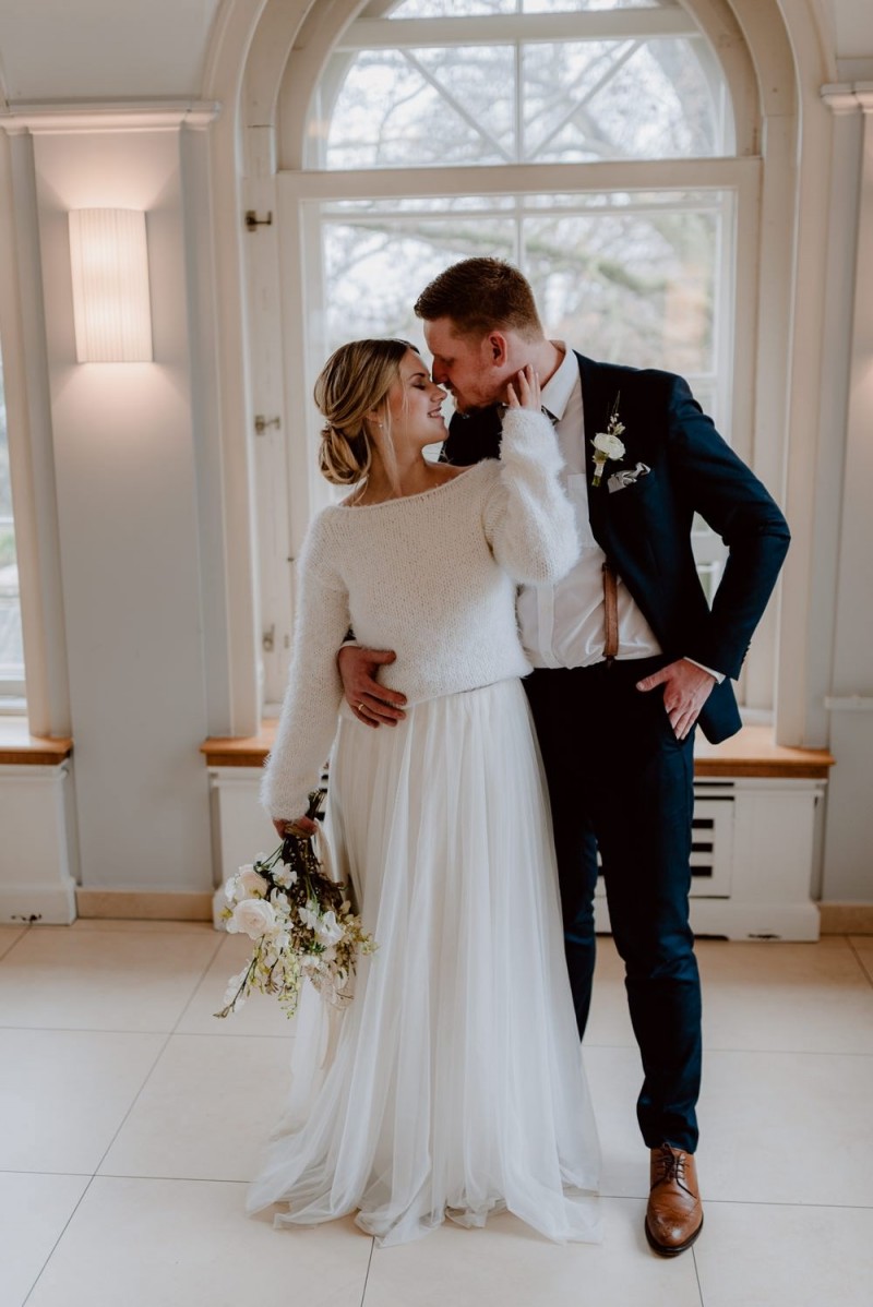 In dieser Inspiration einer Hochzeit ganz im Motto Gold meets Marble, warten ein zuckersüßes Brautpaar und ganz viele feine Details auf euch! Romantisch wird es ebenfalls, nicht zuletzt, weil diese Hochzeitsinspiration im hübschen Schloss Styrum entstanden ist. Vor allem aber dominieren die klassischen und festlichen Vibes. Hochzeitsfotografin Nicole Otto Photographie hat diese Inspiration für uns fotografiert, bei der sie auch die zarte Hochzeitspapeterie entworfen hat. Schon hier trifft Klassik auf Romantik durch die Verwendung von weißem Papier mit gerissenen Kanten, schwarzer geschwungener Schrift, goldenen Siegeln und zarte Seidenbändern von Oh so preppy. Perfekt dazu wählte Anna von Miet me at the wedding die Dekoration. Fließende Stoffe, goldene Details, die auf zarte Blumen und schwarze Akzente treffen. Die Floristik übernahm Runo Blumen und setzte mit weißen Details und einem Hauch Farbe auf die klassische Schönheit mit einem wilden Touch. Während die große dunkle Tafel klassisch wirkt, sind die durchsichtigen Stühle ein toller und moderner Hingucker, den der Möbelverleih Sitzplätzchen hier für uns durch die gesamte Möbelwahl inszeniert. Natürlich ist auch das Brautpaar ein absoluter Hingucker. Auch hier dominieren klassische Züge. Das Brautkleid ist ein Zweiteiler von Noni Mode, dessen Oberteil durch einen hochgeschlossenen Schnitt und lange Ärmel begeistert. Dazu kombiniert, ein zarter und fließender Tüllrock, der den klassischen Look um eine Portion Romantik erweitert. Dank des farblich abgesetzten Gürtels und einem kuscheligen Pullover passt die Braut perfekt in die festliche Szenerie und setzt weiche Akzente an der Seite ihres Bräutigams im schwarzen Anzug mit Fliege. Auch das Brautstyling wurde eher klassisch gehalten und von Hair & Makeup Artist Lisa Knape kreiert. Perfekt ergänzt um die kleinen Ohrstecker und das zarte Headpiece von La Chia Headpieces. Natürlich wurde an diesem Tag auch an das leibliche Wohl gedacht. Die wunderschöne Hochzeitstorte teils in weißem Fondant, teils in Marmoroptik und mit zarten Blüten aus Fondant verziert, kreierte The Baker’s Wife. So wie auch die besonderen Macarons im Marmorlook mit feinem Blattgold. Klassisch muss eben nicht starr sein. Im Gegenteil! Durch die Wahl moderner Akzente und Materialen entsteht Leichtigkeit, die den klassischen Look neu interpretiert. Ganz viel Freude euch mit dieser feinen Inspiration in Gold und Marble!