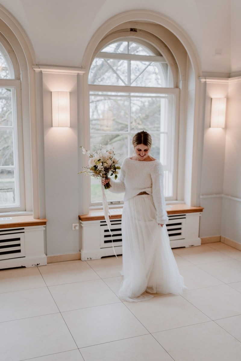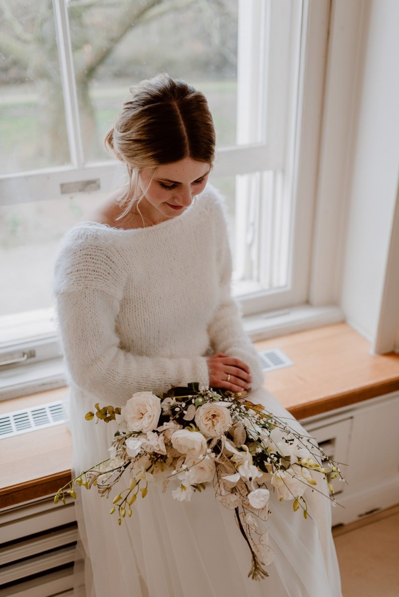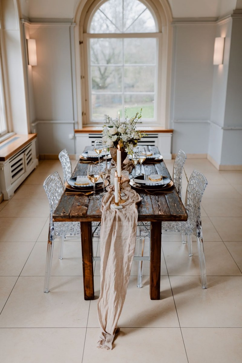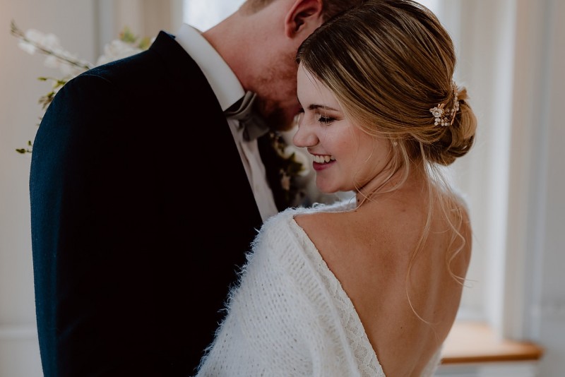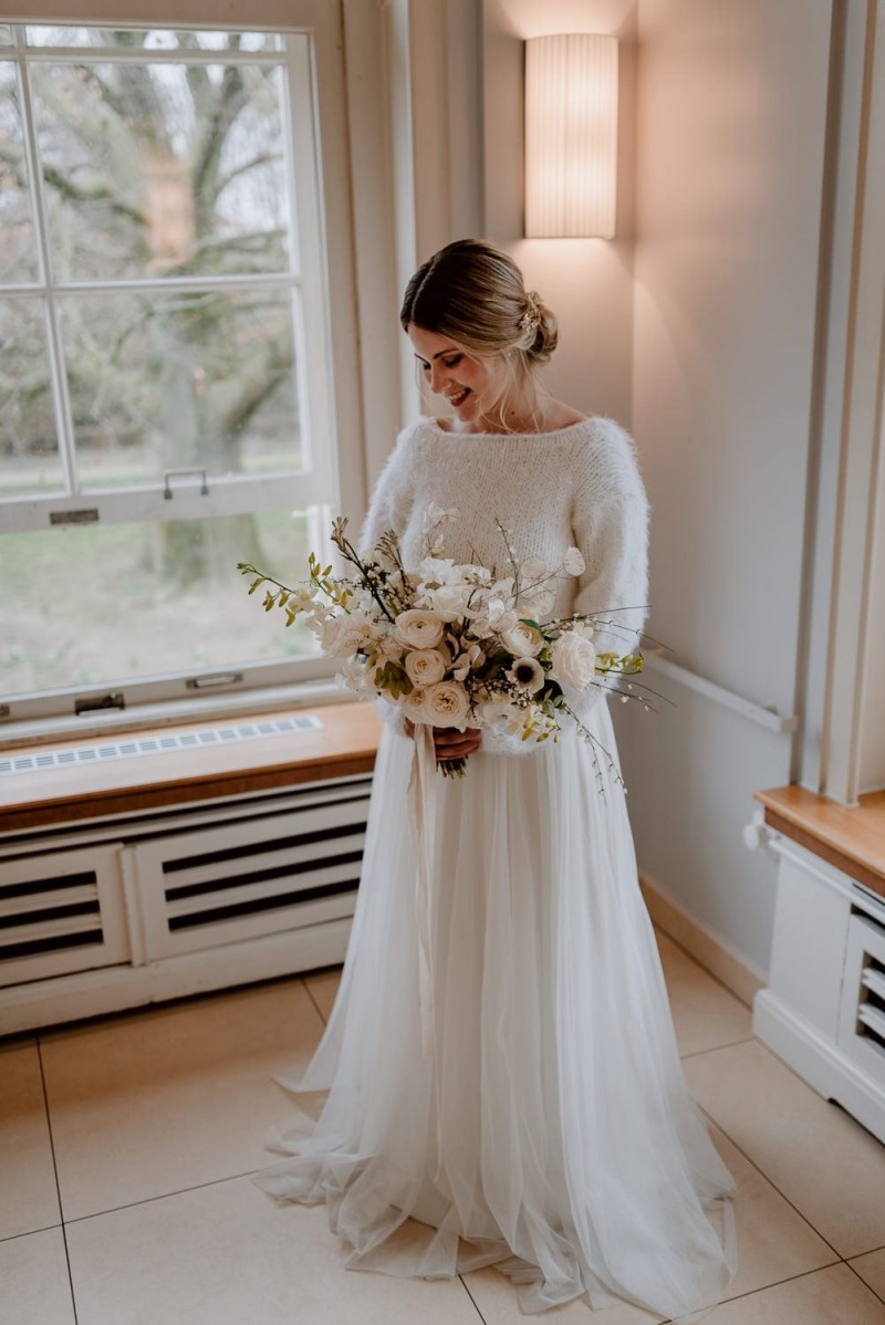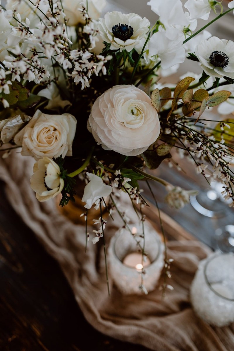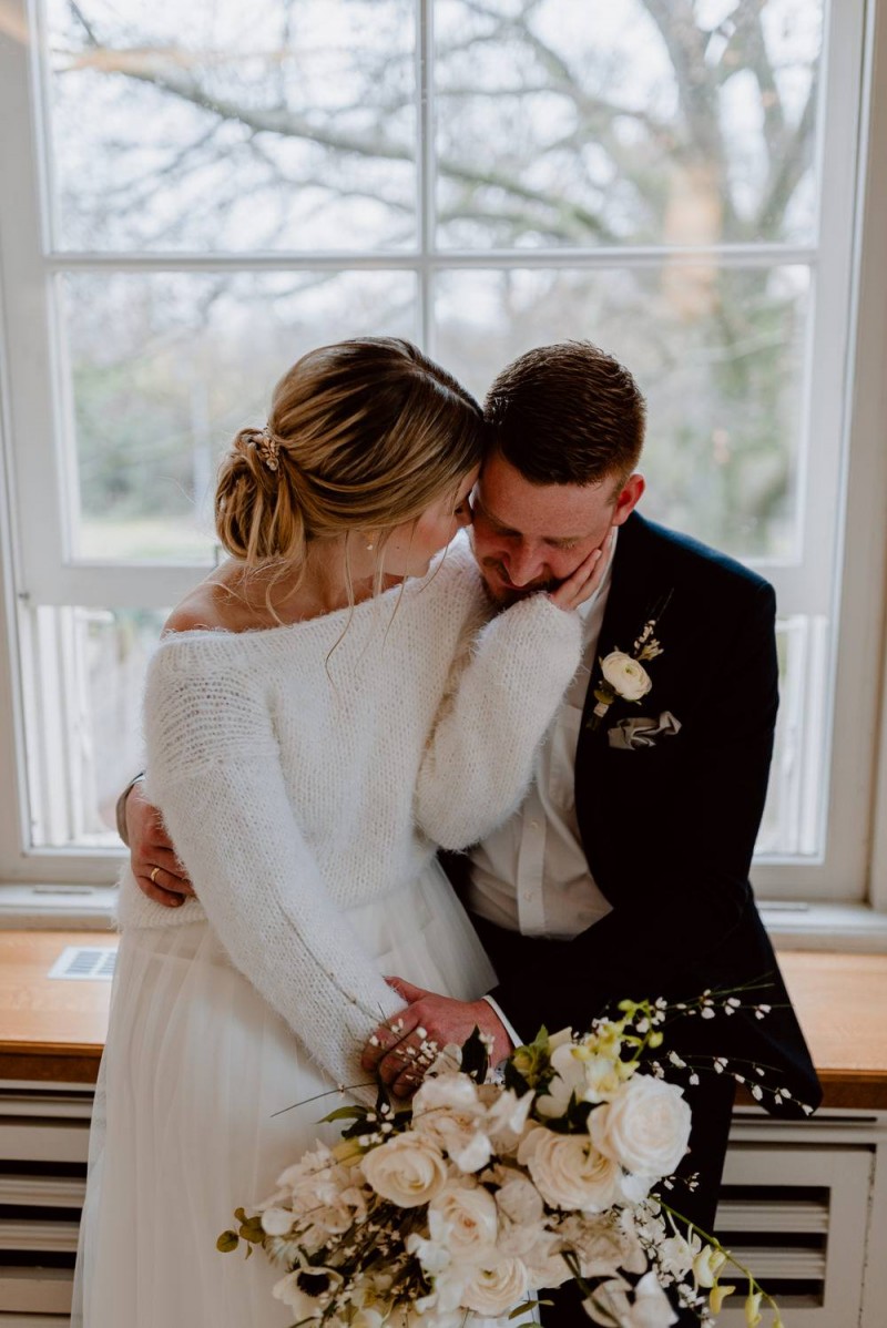In dieser Inspiration einer Hochzeit ganz im Motto Gold meets Marble, warten ein zuckersüßes Brautpaar und ganz viele feine Details auf euch! Romantisch wird es ebenfalls, nicht zuletzt, weil diese Hochzeitsinspiration im hübschen Schloss Styrum entstanden ist. Vor allem aber dominieren die klassischen und festlichen Vibes. Hochzeitsfotografin Nicole Otto Photographie hat diese Inspiration für uns fotografiert, bei der sie auch die zarte Hochzeitspapeterie entworfen hat. Schon hier trifft Klassik auf Romantik durch die Verwendung von weißem Papier mit gerissenen Kanten, schwarzer geschwungener Schrift, goldenen Siegeln und zarte Seidenbändern von Oh so preppy. Perfekt dazu wählte Anna von Miet me at the wedding die Dekoration. Fließende Stoffe, goldene Details, die auf zarte Blumen und schwarze Akzente treffen. Die Floristik übernahm Runo Blumen und setzte mit weißen Details und einem Hauch Farbe auf die klassische Schönheit mit einem wilden Touch. Während die große dunkle Tafel klassisch wirkt, sind die durchsichtigen Stühle ein toller und moderner Hingucker, den der Möbelverleih Sitzplätzchen hier für uns durch die gesamte Möbelwahl inszeniert. Natürlich ist auch das Brautpaar ein absoluter Hingucker. Auch hier dominieren klassische Züge. Das Brautkleid ist ein Zweiteiler von Noni Mode, dessen Oberteil durch einen hochgeschlossenen Schnitt und lange Ärmel begeistert. Dazu kombiniert, ein zarter und fließender Tüllrock, der den klassischen Look um eine Portion Romantik erweitert. Dank des farblich abgesetzten Gürtels und einem kuscheligen Pullover passt die Braut perfekt in die festliche Szenerie und setzt weiche Akzente an der Seite ihres Bräutigams im schwarzen Anzug mit Fliege. Auch das Brautstyling wurde eher klassisch gehalten und von Hair & Makeup Artist Lisa Knape kreiert. Perfekt ergänzt um die kleinen Ohrstecker und das zarte Headpiece von La Chia Headpieces. Natürlich wurde an diesem Tag auch an das leibliche Wohl gedacht. Die wunderschöne Hochzeitstorte teils in weißem Fondant, teils in Marmoroptik und mit zarten Blüten aus Fondant verziert, kreierte The Baker’s Wife. So wie auch die besonderen Macarons im Marmorlook mit feinem Blattgold. Klassisch muss eben nicht starr sein. Im Gegenteil! Durch die Wahl moderner Akzente und Materialen entsteht Leichtigkeit, die den klassischen Look neu interpretiert. Ganz viel Freude euch mit dieser feinen Inspiration in Gold und Marble!