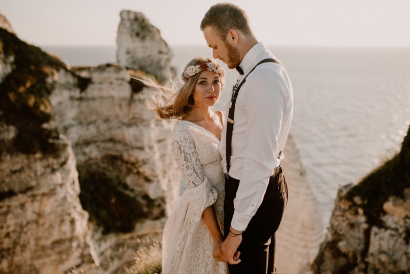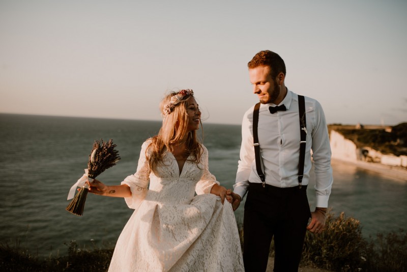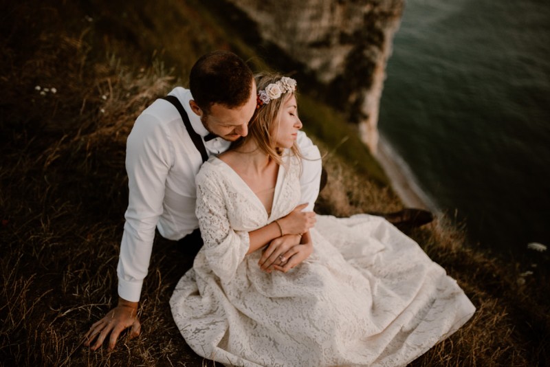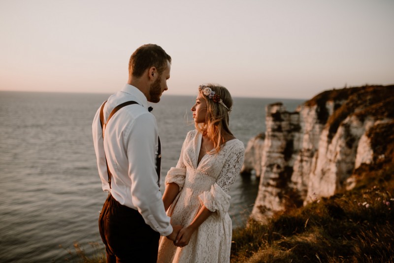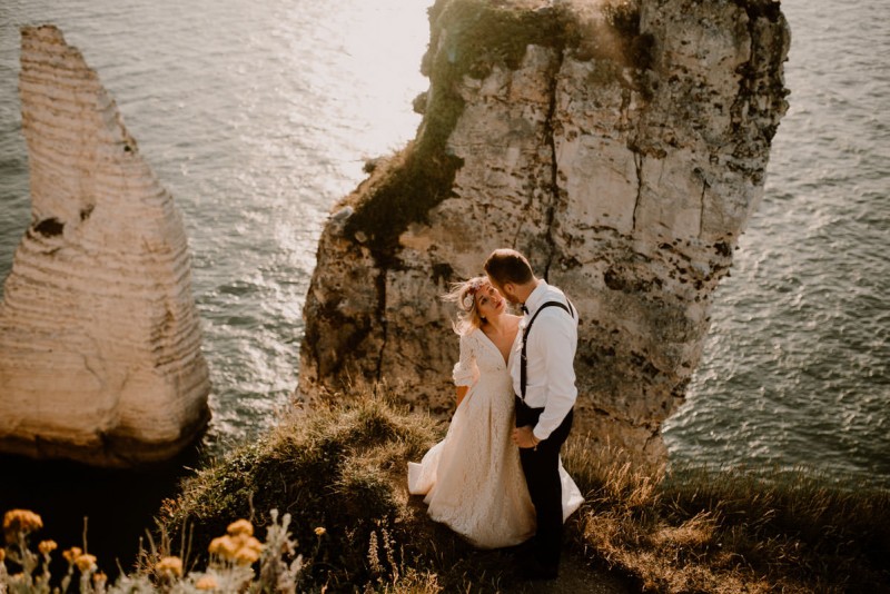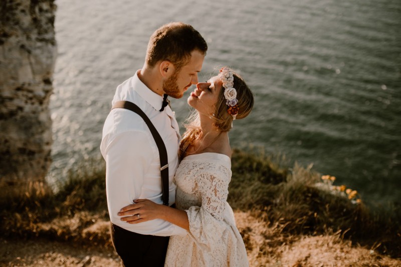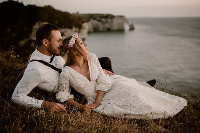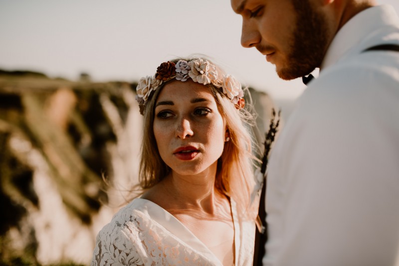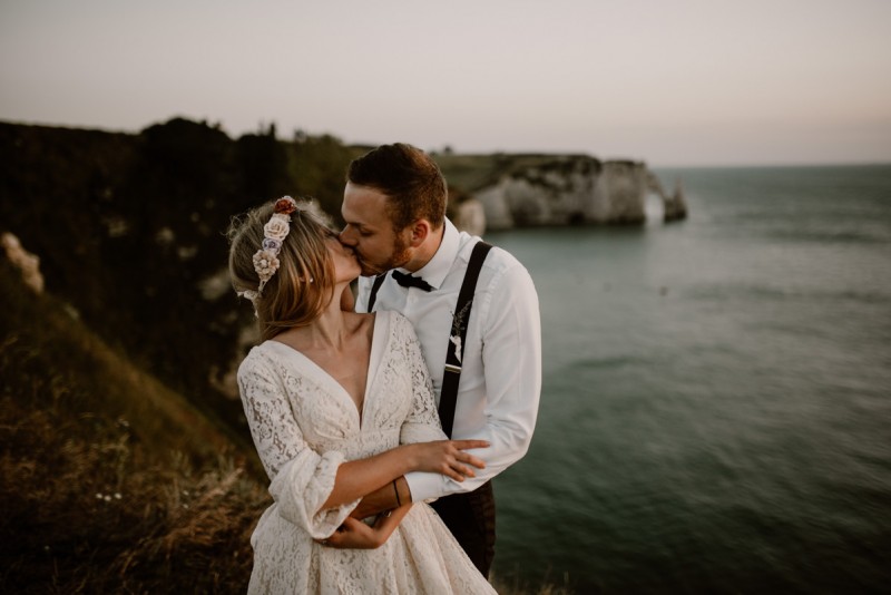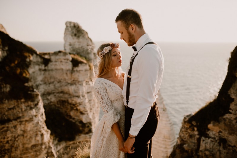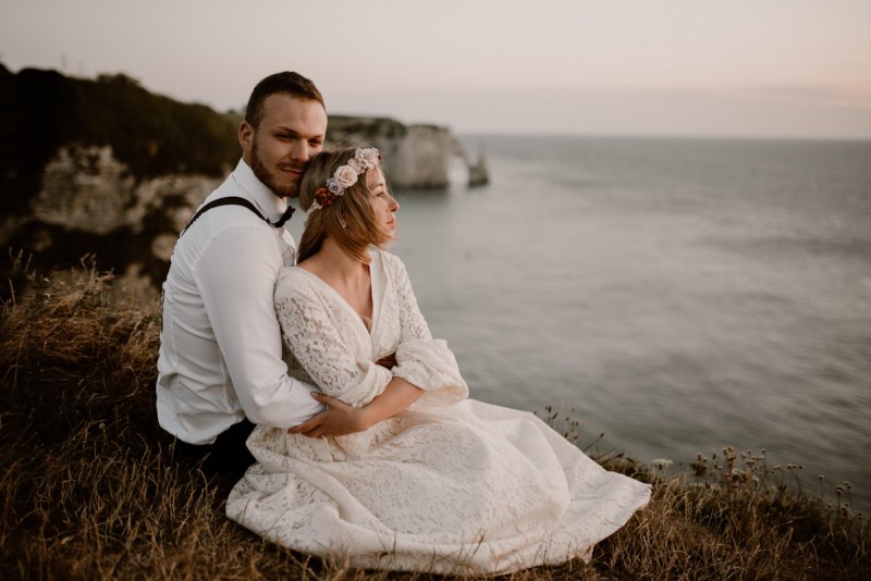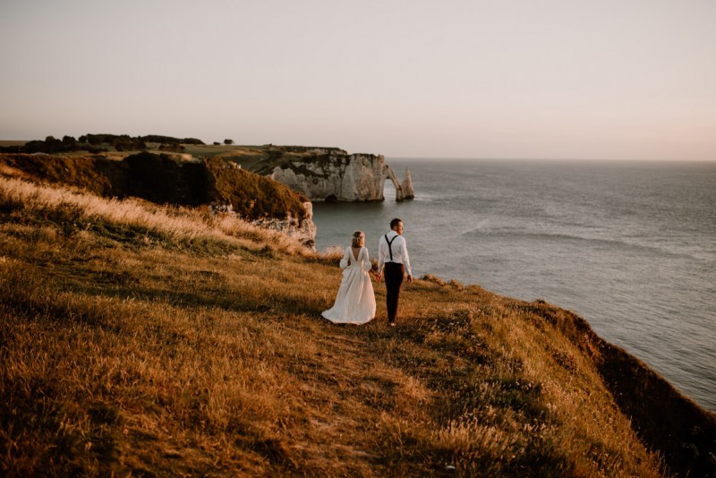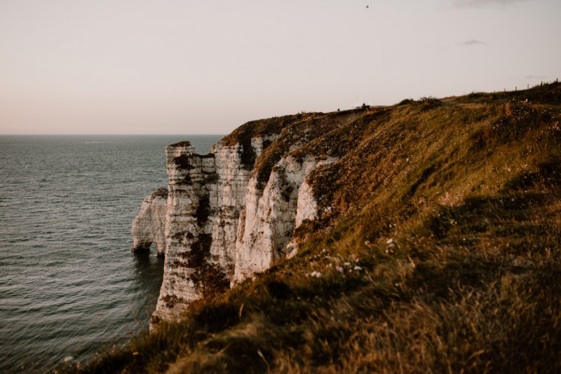 An einem sonnigen Julinachmittag ging es für Hochzeitsfotografin Anne Letournel Photography und das Brautpaar Ksenia & Damien ins schöne Etretat der Normandie. Hier, umgeben vom Geruch des Salzwassers und mit Blick auf die steilen Felsklippen und ihre außergewöhnlichen Felsformationen, fand ihr romantisches After Wedding Shooting statt. Nur einen Tag zuvor feierten sie ihre französisch-russische Hochzeit. Um möglichst viele wunderschöne Erinnerungen an ihre Hochzeit und diesen besonderen Ort zu schaffen, nutzten sie den sonnigen Nachmittag und schritten gemeinsam durch wilde Felder hindurch zur Steilküste. Beide trugen natürlich ihr Hochzeitsoutfit vom vorherigen Tag. Ksenia trug ihr in Russland gekauftes Brautkleid von Salon Love Forever, das alles vereinte, was sie selbst ausmacht. Simple, elegant und modern. Dazu trug sie ihre feine Flowercrown und ihren, von der La Boutique De Fleurs kreierten, Brautstrauß, der ausschließlich aus Lavendel und einigen wenigen Ehrenpreis bestand. Damien, in seinem lockeren Outfit samt Hosenträgern und Fliege von Maison Artling, führte sie unglaublich romantisch durch diese einmalige Kulisse. Da mich die Magie der beiden an diesem Ort völlig berauscht hat, dürft ihr euch auf sehr viele Bilder freuen. Lasst euch verzaubern vom Knistern der beiden frisch Verheirateten, vom französischen Wind, der zart durch das Haar der Braut weht, und vom einmaligen Ausblick!