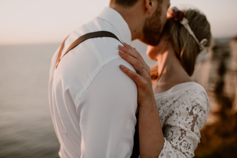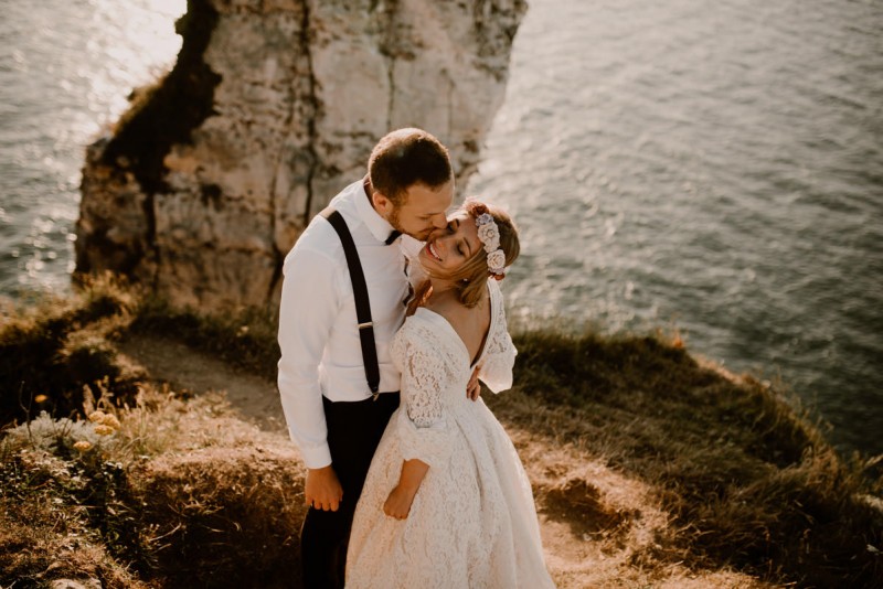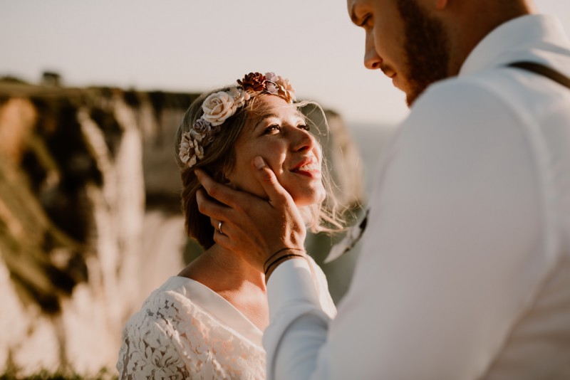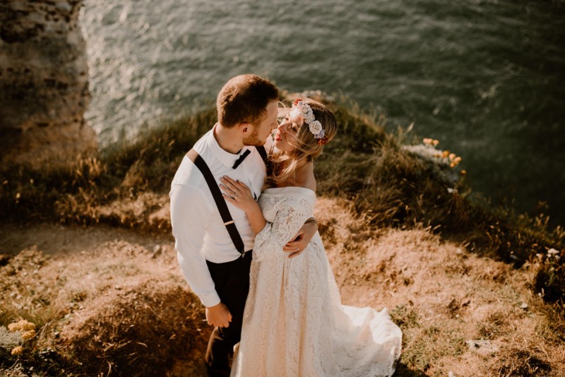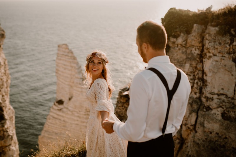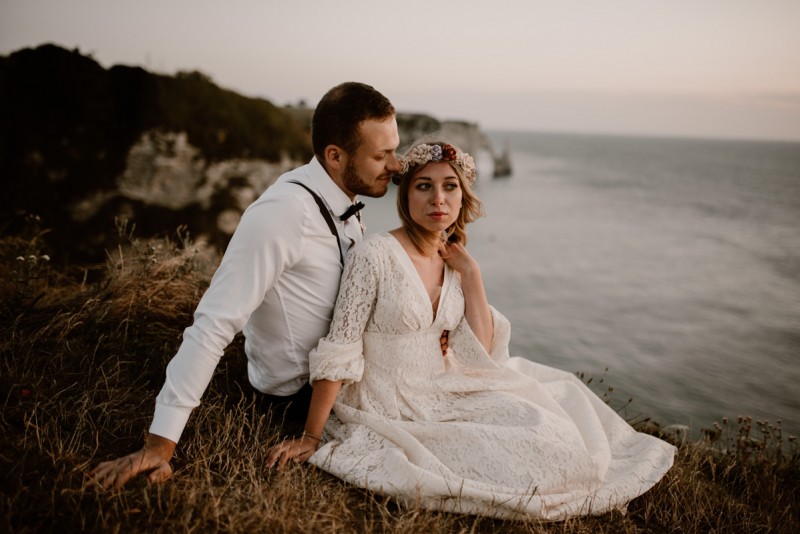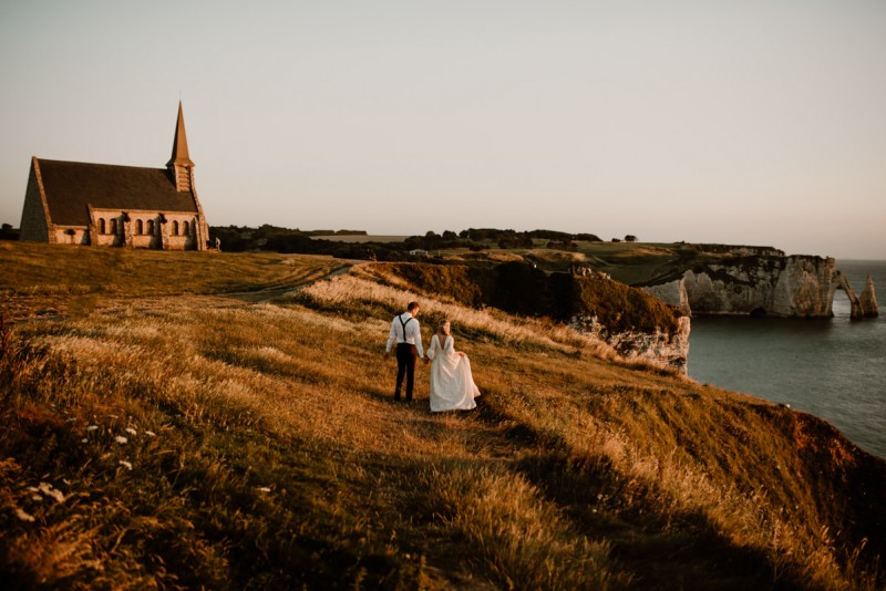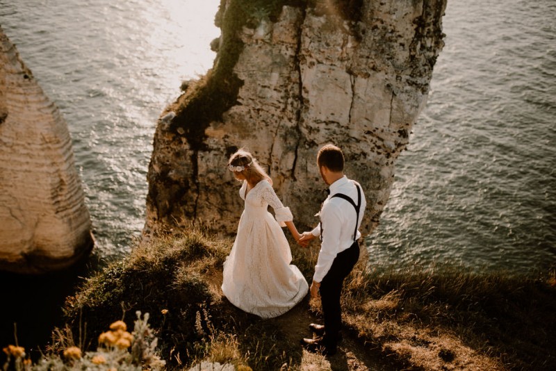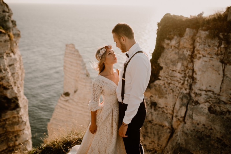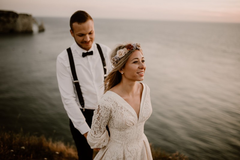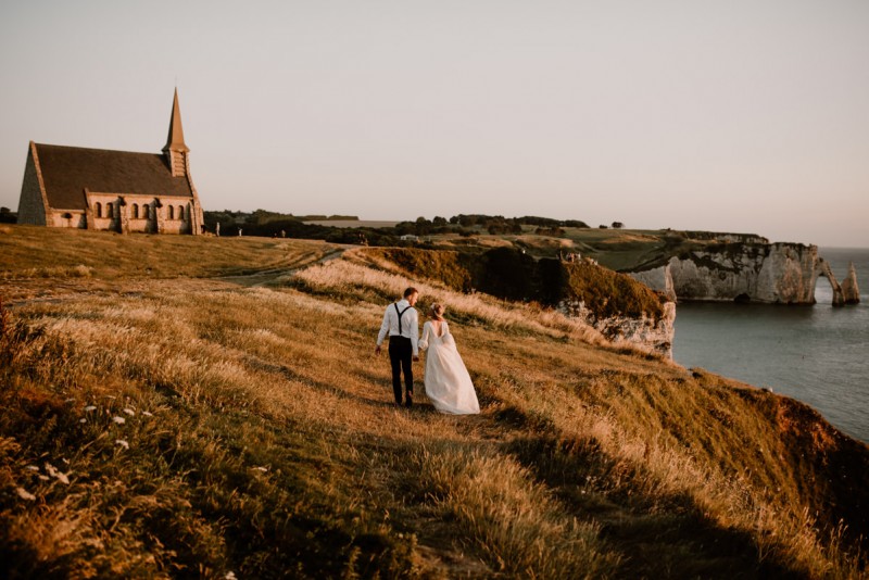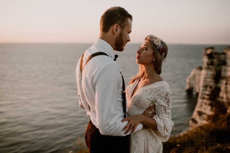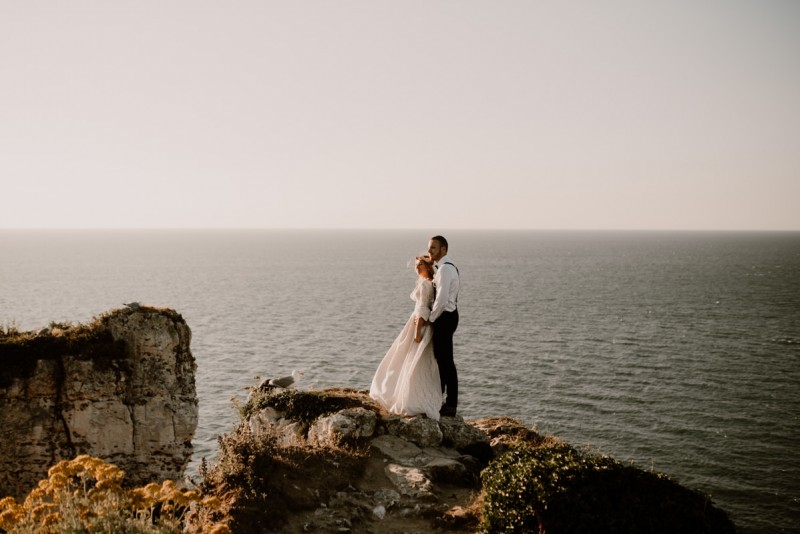 An einem sonnigen Julinachmittag ging es für Hochzeitsfotografin Anne Letournel Photography und das Brautpaar Ksenia & Damien ins schöne Etretat der Normandie. Hier, umgeben vom Geruch des Salzwassers und mit Blick auf die steilen Felsklippen und ihre außergewöhnlichen Felsformationen, fand ihr romantisches After Wedding Shooting statt. Nur einen Tag zuvor feierten sie ihre französisch-russische Hochzeit. Um möglichst viele wunderschöne Erinnerungen an ihre Hochzeit und diesen besonderen Ort zu schaffen, nutzten sie den sonnigen Nachmittag und schritten gemeinsam durch wilde Felder hindurch zur Steilküste. Beide trugen natürlich ihr Hochzeitsoutfit vom vorherigen Tag. Ksenia trug ihr in Russland gekauftes Brautkleid von Salon Love Forever, das alles vereinte, was sie selbst ausmacht. Simple, elegant und modern. Dazu trug sie ihre feine Flowercrown und ihren, von der La Boutique De Fleurs kreierten, Brautstrauß, der ausschließlich aus Lavendel und einigen wenigen Ehrenpreis bestand. Damien, in seinem lockeren Outfit samt Hosenträgern und Fliege von Maison Artling, führte sie unglaublich romantisch durch diese einmalige Kulisse. Da mich die Magie der beiden an diesem Ort völlig berauscht hat, dürft ihr euch auf sehr viele Bilder freuen. Lasst euch verzaubern vom Knistern der beiden frisch Verheirateten, vom französischen Wind, der zart durch das Haar der Braut weht, und vom einmaligen Ausblick!