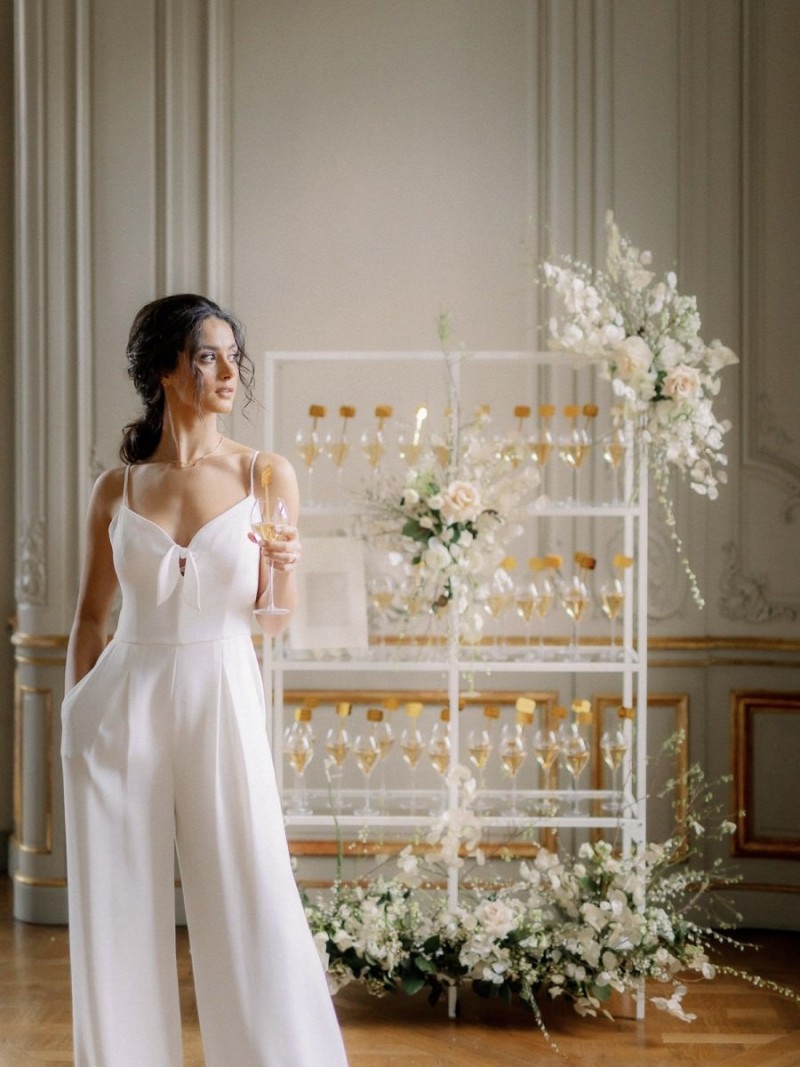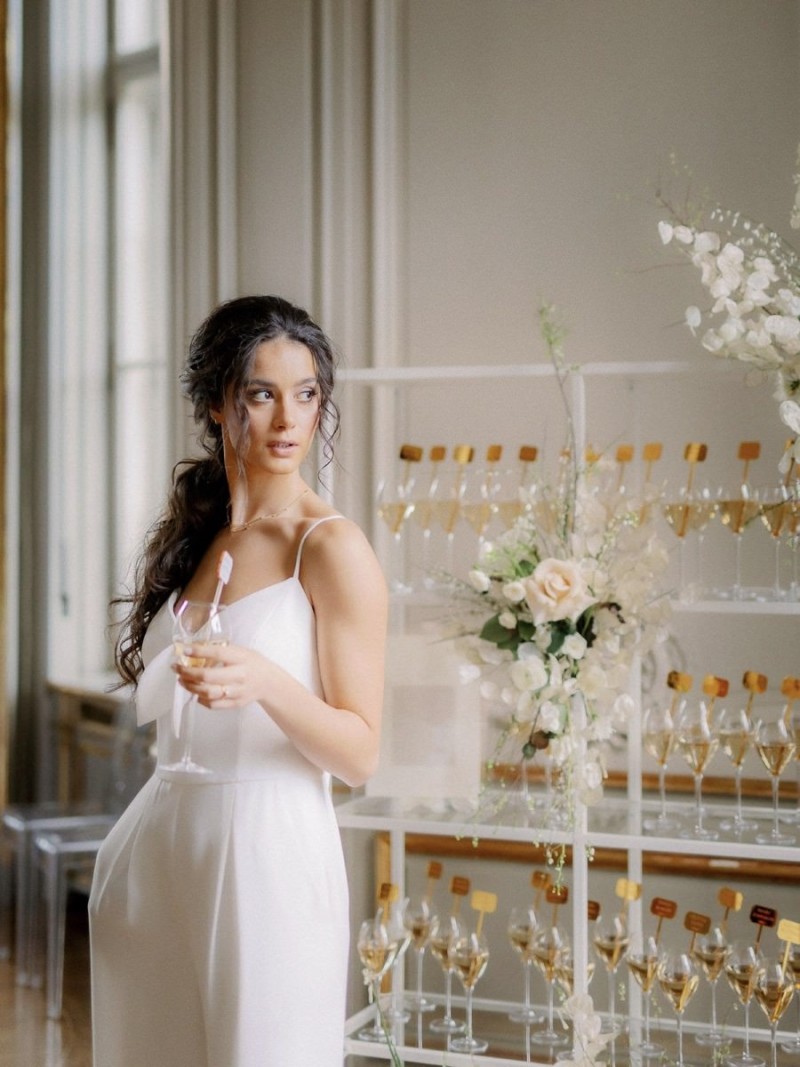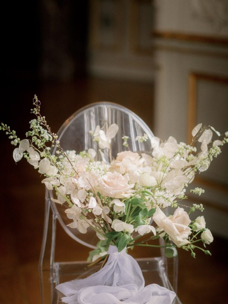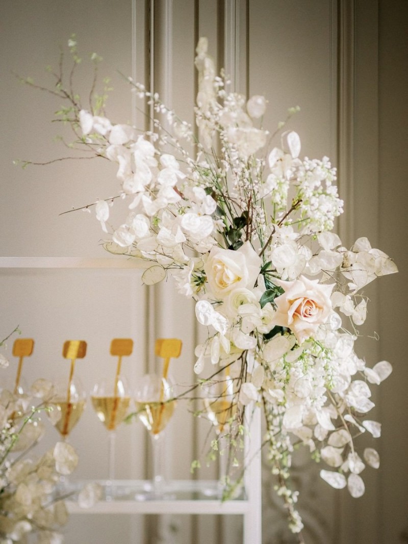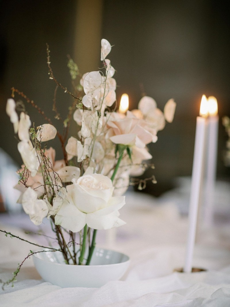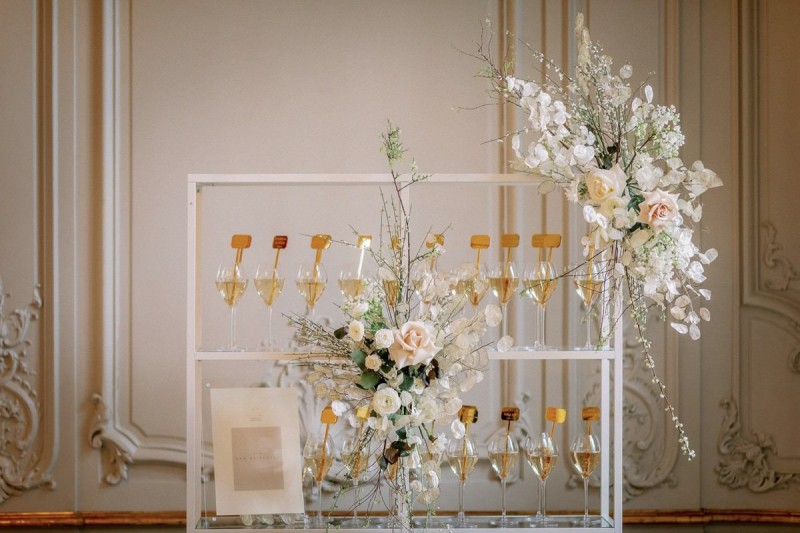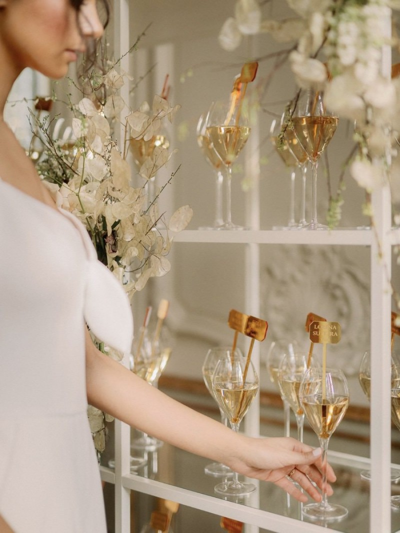 In den hohen Räumen des Schlosses, umgeben von opulenten Wandvertäfelungen, strahlenden Kronleuchtern, alten Kaminen und Gemälden, sowie goldenen Wandverzierungen und Spiegeln, kreierte das Berliner Hochzeitsteam, ein sehr natürliches und organisches Setting, das trotz der Kontraste unglaublich viel Ruhe ausstrahlt. Der ehrwürdigen Location den gebührenden Raum zu geben und zugleich so viel Schönheit in den Fokus zusetzen, macht dieses Konzept aus. Runo Blumen kreierte die Floristik im Ikebana Stil in den zarten Farben Weiß und Nude, die sowohl auf dem Dinner Table und der Champagnerwall, als auch in Form von aufregenden, hohen Gestecken diese Inspiration erfüllt. Moderne Ghostchairs und eine weiße Tafel, beides vom Eventverleih Weds 4 Rent, beherbergen die unglaublich dünnen Kerzen, den feinen Mix aus frischen Rosen und zarten Trockenblumen wie Silberblättern, und die Hochzeitspapeterie von Made with Love. Sowohl auf dem schönen Geschirr und als Tischnummern auf dem Tisch, als auch in Szene gesetzt in einem wundervollen Flatlay, mit dekorativen Details von Marry & Lilo und passenden Seidenbändern von Seidenband, fallen die unglaublich klaren Linien dieser Papeterieserie auf, die die Moderne dieser Inspiration komplementiert. Elegant und zugleich modern sind auch die schönen Acrylelemente, die perfekt passend, auch für die tolle Champagnerwall und den Sitzplan genutzt wurden. Die goldenen Cocktail Picker von Lieblingsprint erfüllen hierbei nicht nur den Zweck des Sitzplans. Vielmehr runden sie dieses dekorative und zugleich prickelnde Highlight elegant ab.