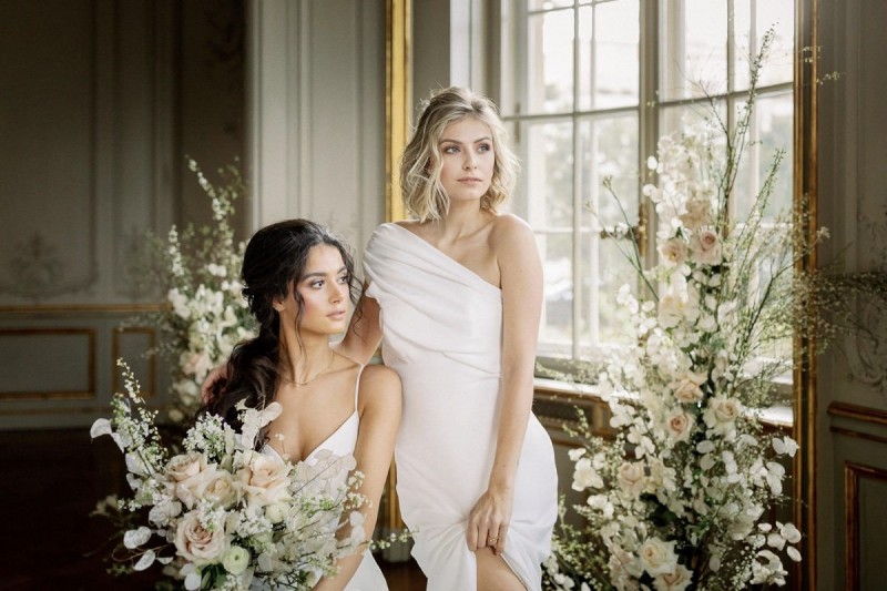 Euch erwartet ein Konzept in einer Farbpalette von Weiß und Nude, klare Linien, modernes Mobiliar, stylische Acrylelemente, ein Glanzstück einer Champagnerbar, die zugleich ein Sitzplan ist und zwei bezaubernde Bräute, die euch mehr als nur einen wundervollen Brautklook präsentieren.