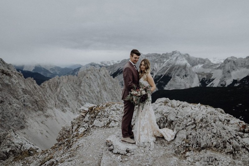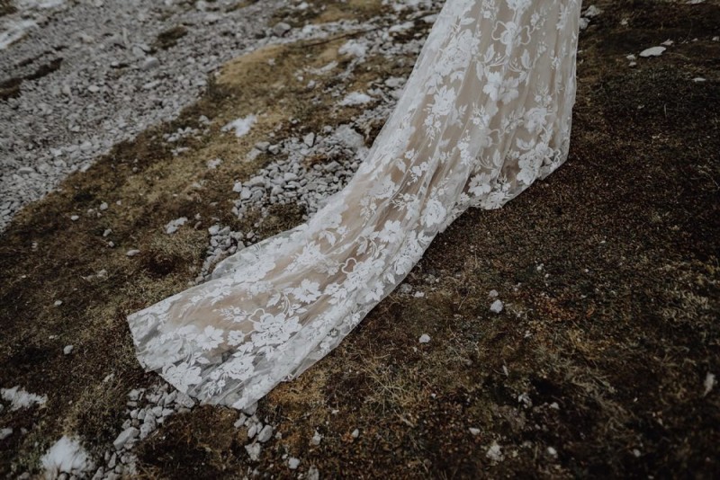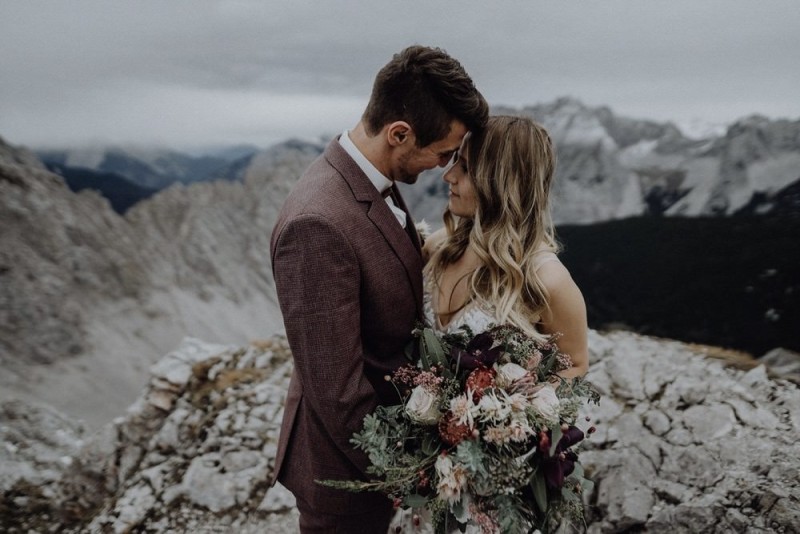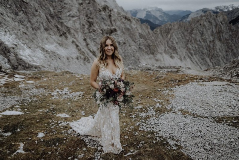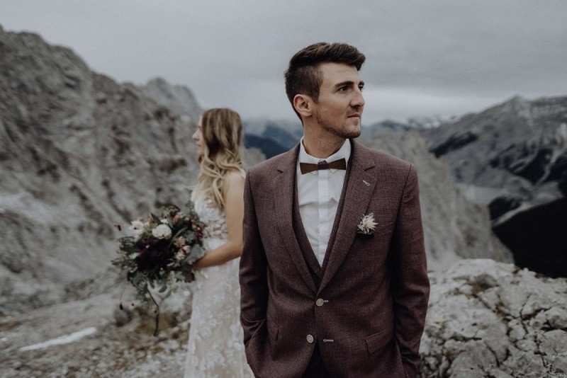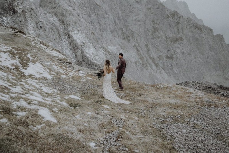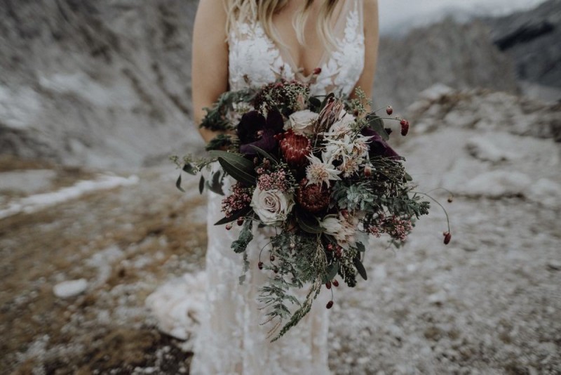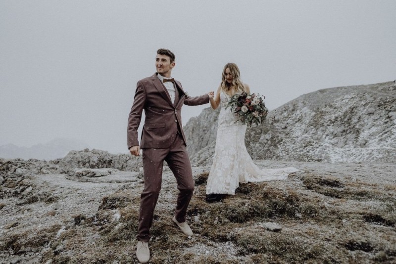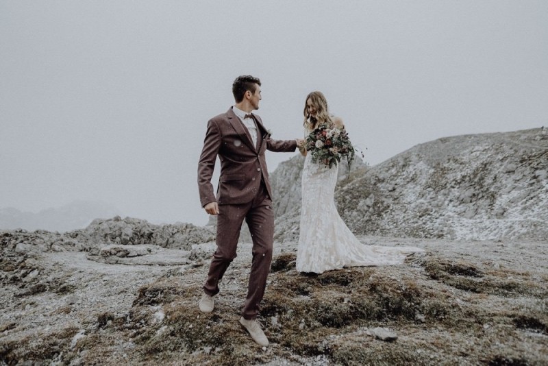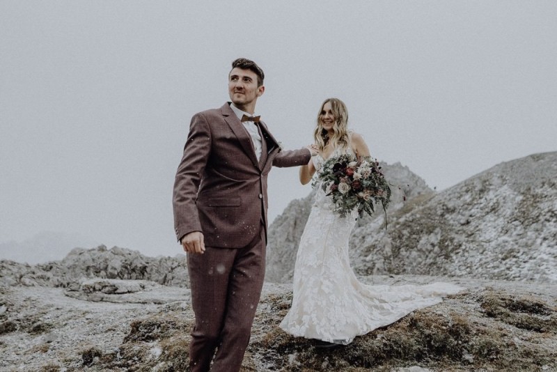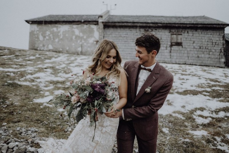 Doch kommen wir zum verliebten Brautpaar an diesem so besonderen Ort. Dank dem La Donna Hochzeitsatelier trug die hübsche Anita an diesem aufregenden Tag ein semitransparentes Brautkleid im Fit and Flare Stil, mit langer Schleppe, einem Unterstoff in Nude und grober Tattoospitze im floralen Design. Bräutigam Stefan trägt einen Anzug samt Weste aus Webstoffl, dessen warmer Burgundy-Farbton grandios mit der hölzernen Fliege und den cremefarbenen Schuhen harmoniert. Dieses grandiose Burgundy findet sich auch im opulenten Brautstrauß der Braut, den die Blumerie Christine Hannewald herrlich wild und im winterlichen Stil kreierte. Sattes Grün, dunkles Rot sowie ein wenig Rosa und Weiß umschließen die floristischen Details in farbintensivem Burgunder. Besonders in der eher kargen Berglandschaft ein Feuerwerk der Lebendigkeit. On Top fing es während des Shootings auch noch an zu schneien… was für ein Traum!