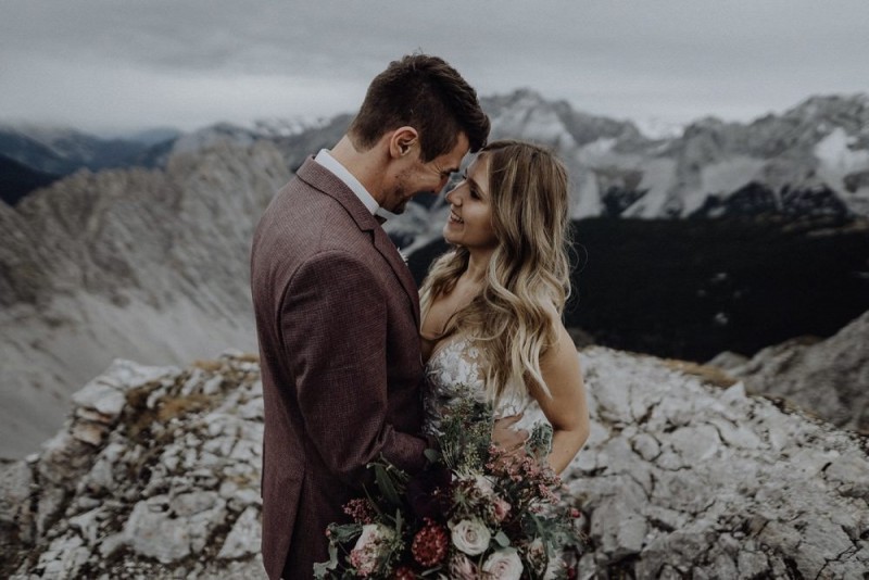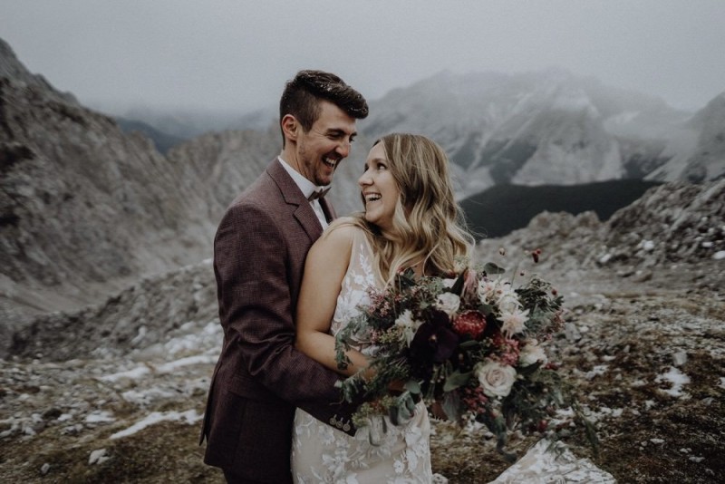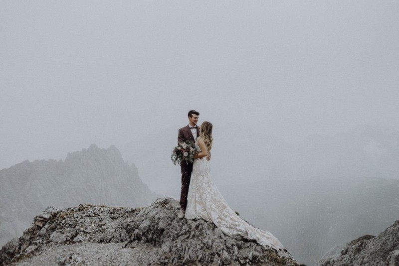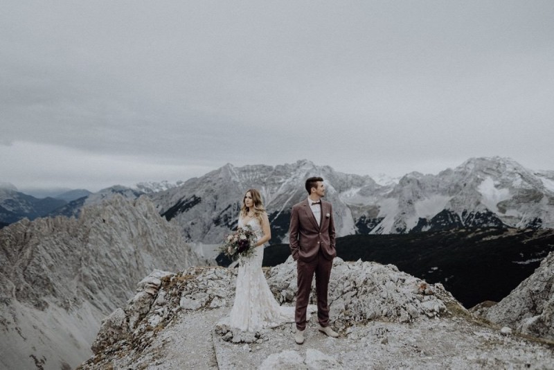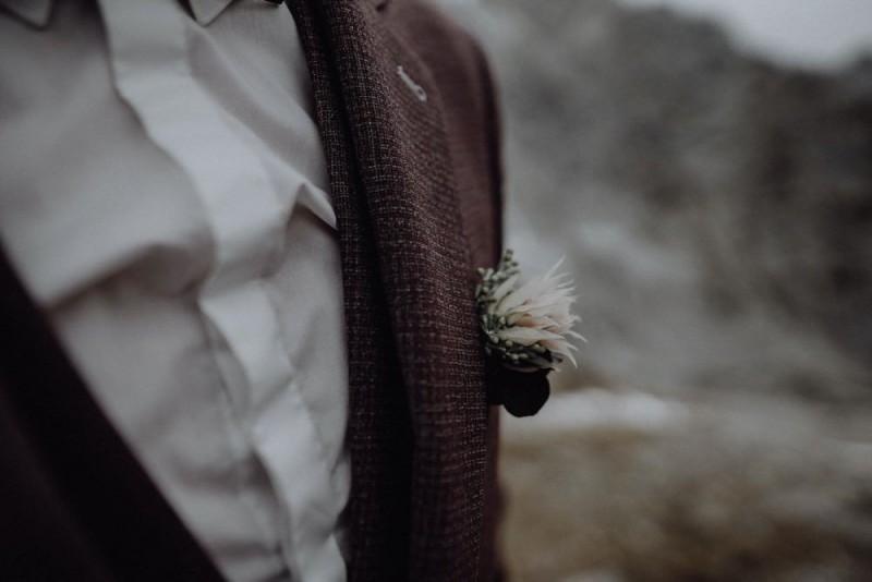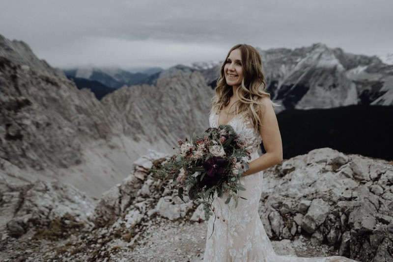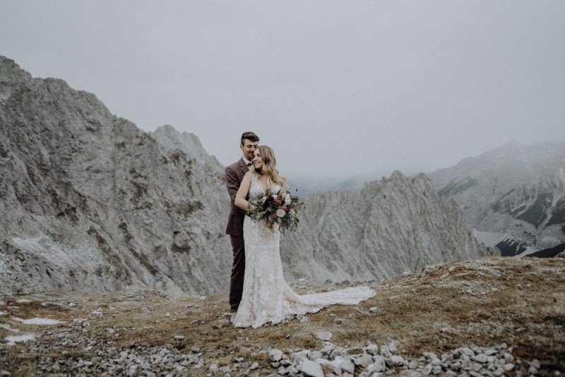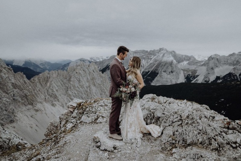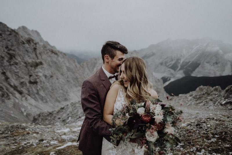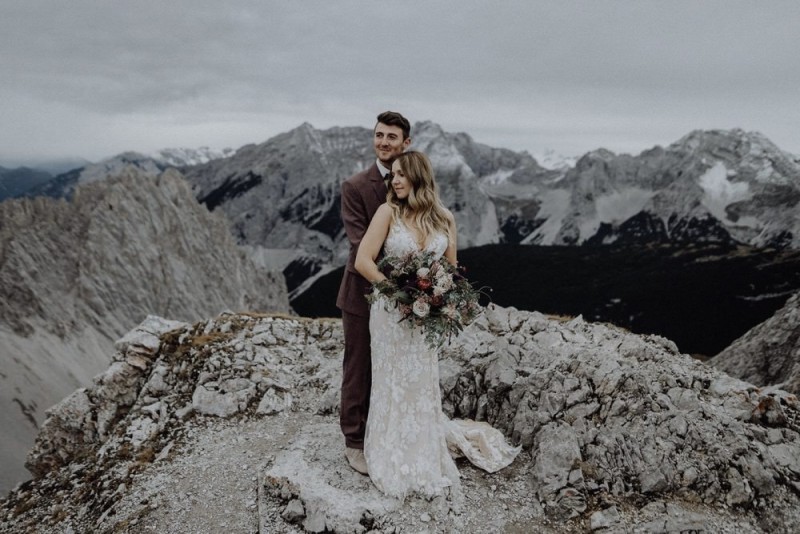 Doch kommen wir zum verliebten Brautpaar an diesem so besonderen Ort. Dank dem La Donna Hochzeitsatelier trug die hübsche Anita an diesem aufregenden Tag ein semitransparentes Brautkleid im Fit and Flare Stil, mit langer Schleppe, einem Unterstoff in Nude und grober Tattoospitze im floralen Design. Bräutigam Stefan trägt einen Anzug samt Weste aus Webstoffl, dessen warmer Burgundy-Farbton grandios mit der hölzernen Fliege und den cremefarbenen Schuhen harmoniert. Dieses grandiose Burgundy findet sich auch im opulenten Brautstrauß der Braut, den die Blumerie Christine Hannewald herrlich wild und im winterlichen Stil kreierte. Sattes Grün, dunkles Rot sowie ein wenig Rosa und Weiß umschließen die floristischen Details in farbintensivem Burgunder. Besonders in der eher kargen Berglandschaft ein Feuerwerk der Lebendigkeit. On Top fing es während des Shootings auch noch an zu schneien… was für ein Traum!