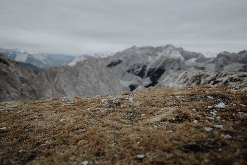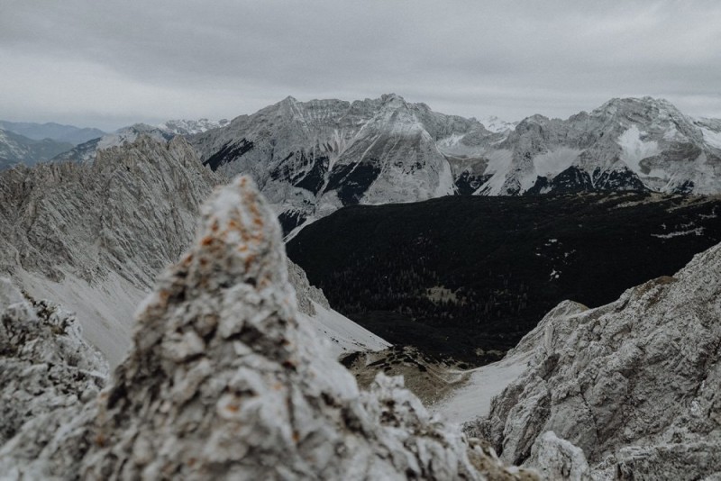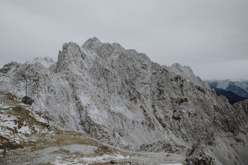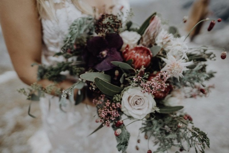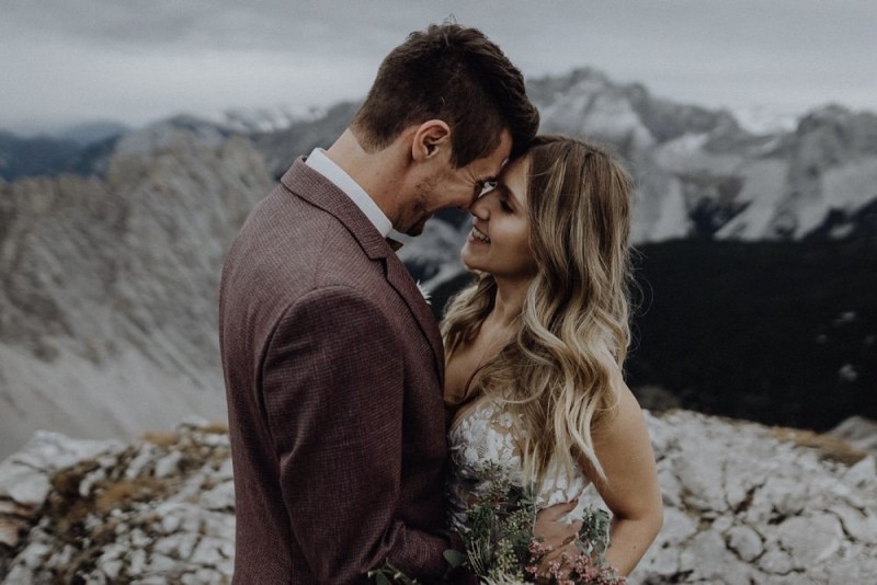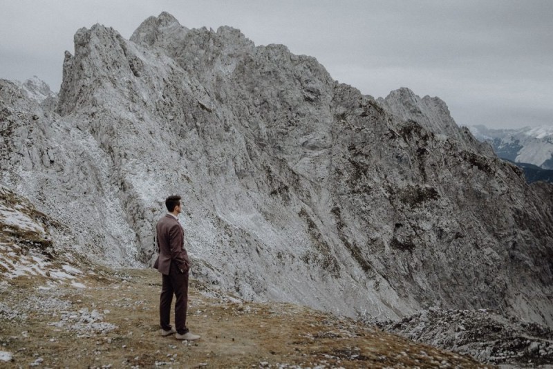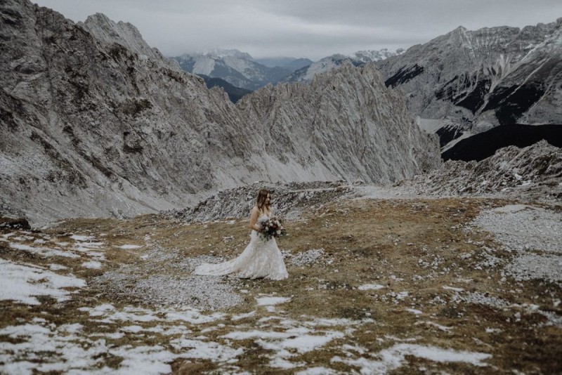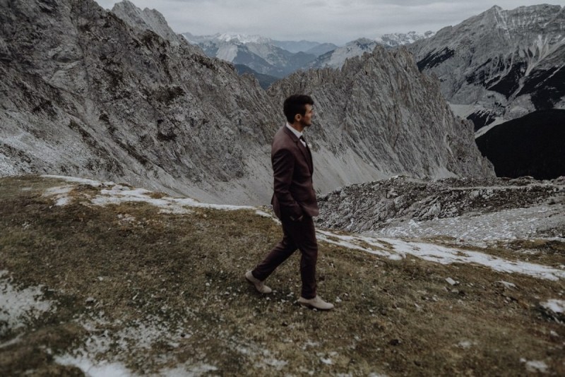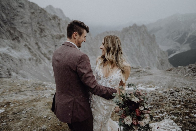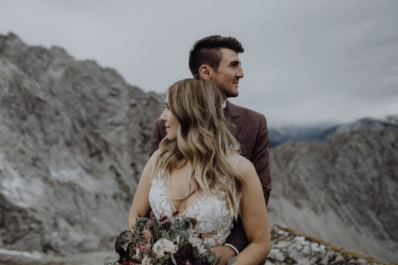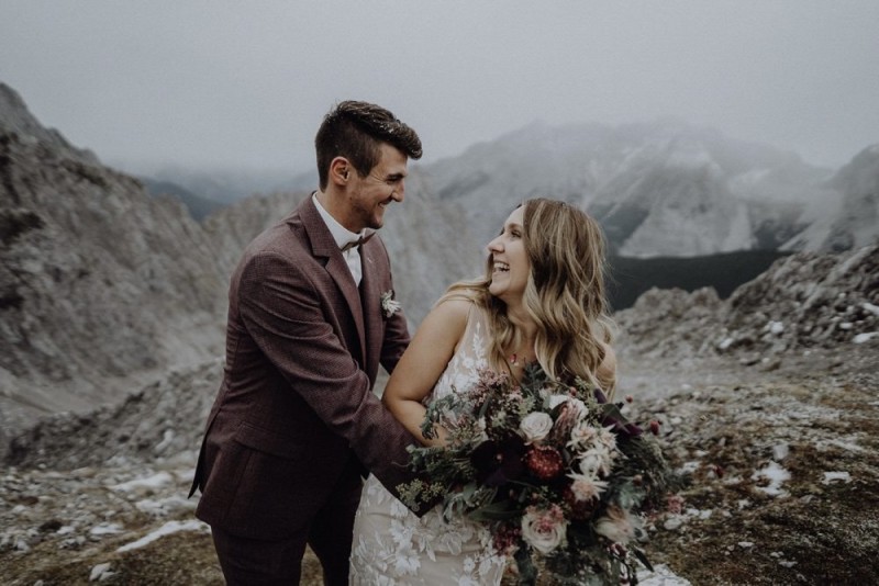 Doch kommen wir zum verliebten Brautpaar an diesem so besonderen Ort. Dank dem La Donna Hochzeitsatelier trug die hübsche Anita an diesem aufregenden Tag ein semitransparentes Brautkleid im Fit and Flare Stil, mit langer Schleppe, einem Unterstoff in Nude und grober Tattoospitze im floralen Design. Bräutigam Stefan trägt einen Anzug samt Weste aus Webstoffl, dessen warmer Burgundy-Farbton grandios mit der hölzernen Fliege und den cremefarbenen Schuhen harmoniert. Dieses grandiose Burgundy findet sich auch im opulenten Brautstrauß der Braut, den die Blumerie Christine Hannewald herrlich wild und im winterlichen Stil kreierte. Sattes Grün, dunkles Rot sowie ein wenig Rosa und Weiß umschließen die floristischen Details in farbintensivem Burgunder. Besonders in der eher kargen Berglandschaft ein Feuerwerk der Lebendigkeit. On Top fing es während des Shootings auch noch an zu schneien… was für ein Traum!