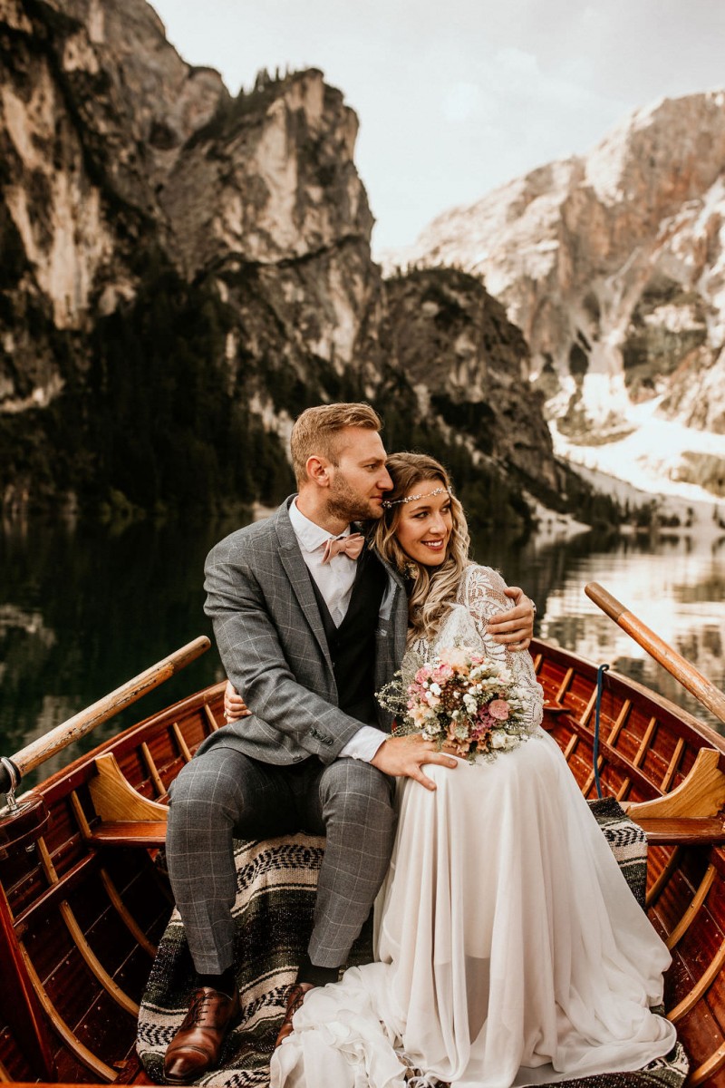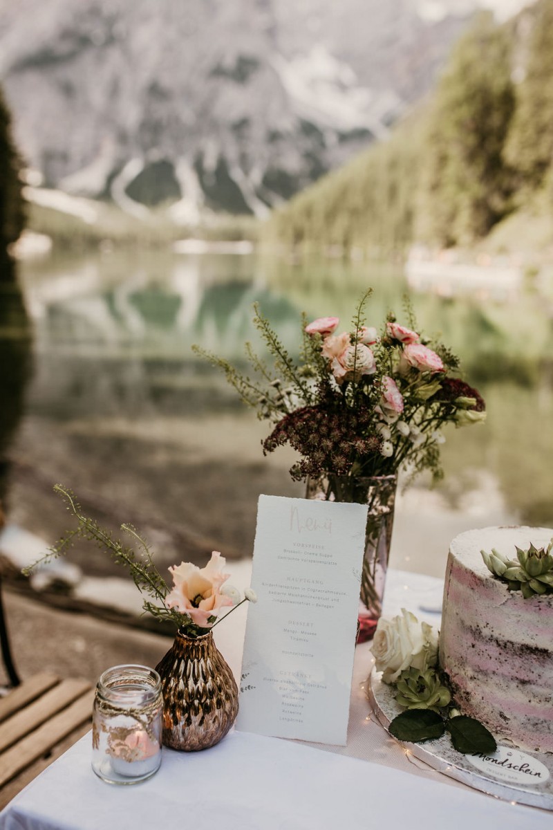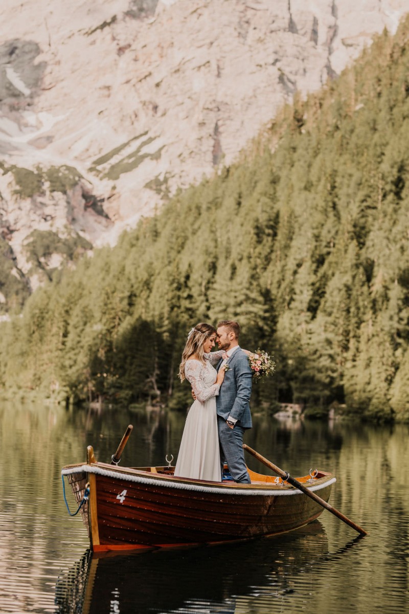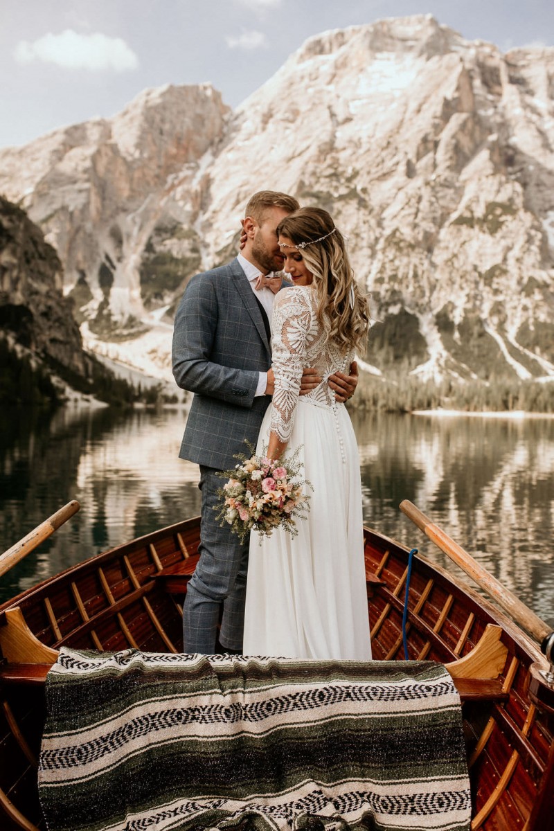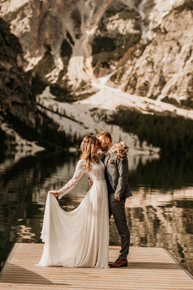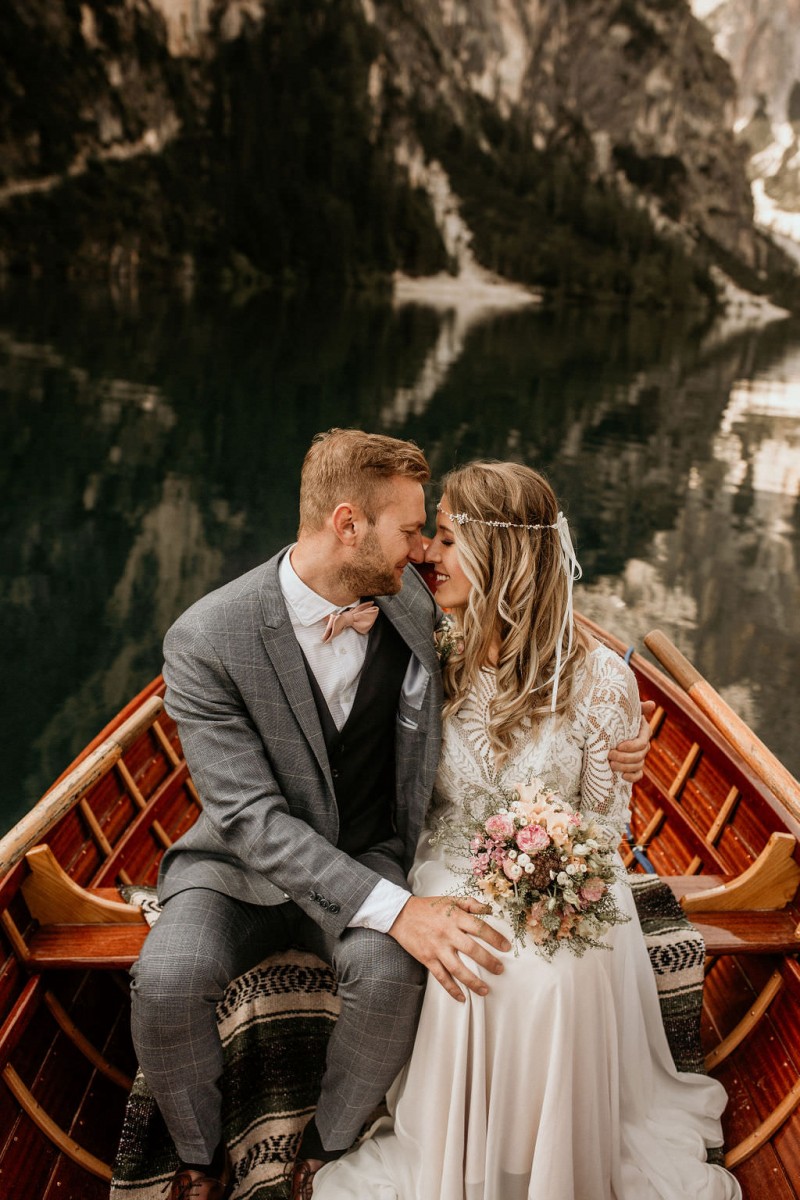 Das Titelbild verrät wohl schon, dass diese Inspiration magisch ist. Ein Styled Shoot am Pragser Wildsee im Bohostil erwartet euch in diesem Artikel. Zunächst zu diesem einmaligen Fleckchen in Italien. Eine von vielen mystischen Legenden besagt, dass diese imposanten Berge rund um den Pragser See einst von Wilden bewohnt wurden. Dort fertigten sie wunderschöne Bergkristalle. Um sich vor der Gier der Menschen zu schützen zogen sie sich zurück und öffneten die unterirdischen Quellen, um das Tal fluten. So entstand angeblich dieser glasklare See, der die Schätze dieser wilden verschlang. Ein wirklich sagenhafter Ort, an dieses Shooting stattfand. Perfekt für ein verliebtes Paar oder? Franzi und Eugen, das zuckersüße Brautpaar, standen selbst erst vor wenigen Wochen vor dem Altar. Da sie die Popularität dieser Location besorgte, fand ihre Hochzeit hier nicht statt. Grund genug, hier noch einmal ins Brautkleid und den Hochzeitsanzug zu schlüpfen! Eine weitere Besonderheit ist, dass diese Inspiration von zwei Hochzeitsfotografinnen fotografiert wurde. Laura Mack Fotografie & Lichterfunkeln Fotografiehaben dieses Styled Shoot gemeinsam geplant und fotografiert. Natürlich erwarten euch in diesem Artikel Fotos von ihnen beiden. Die Aufnahmen sind einfach magisch! Für das Brautpaar begann dieser sonnige Tag im Hotel, wo sie sich in der Früh fertig machten. Nach dem Styling von Hair and Makeup Artist Ulrike Thomaseth schlüpfte Franzi in ihr fließendes Brautkleid, mit zarten Spitzendetails, von Adriane Böhm Brautmoden. Es passt perfekt zu ihrem leichten Styling und dem leicht glitzernden Headpiece. Dazu schmückte sie ein Brautstrauß, in Rosétönen, von der Blumenwerkstatt Merching. Nach dem Getting Ready ging es für sie und ihren Eugen auf den Bootssteg, von wo aus sie eine romantische Bootsfahrt unternahmen. Nur sie beide. Sie waren ganz allein auf dem großen Pragser Wildsee und schauten sich den Sonnenaufgang an. Als wäre das nicht schon ein einmaliges Erlebnis, ging es für die beiden danach an Land, wo sie am Waldrand ein wunderschön dekoriertes Picknick, mit Blick auf den See, genossen. Die feine Hochzeitspapeterie von Schwesternwerk und die tolle Hochzeitstorte von Mondschein Dessertbar, machten dieses Picknick für die beiden ein fach perfekt. Und wir dürfen jetzt exklusiv über ihre Schultern schauen und diesen besonderen Tag miterleben. Ganz viel Freude euch mit dieser fantastischen Hochzeitsinspiration aus Italien!