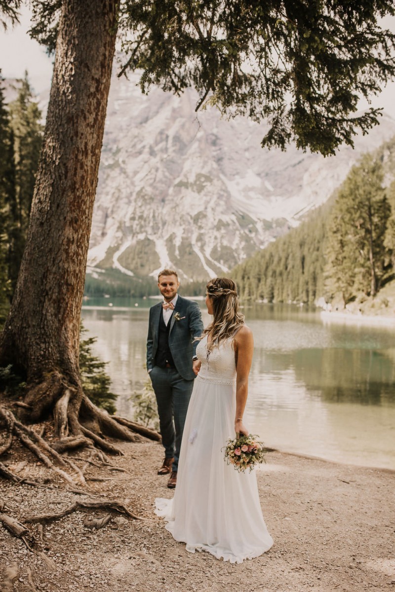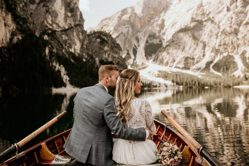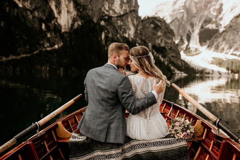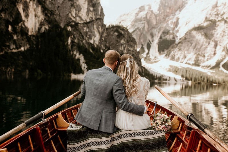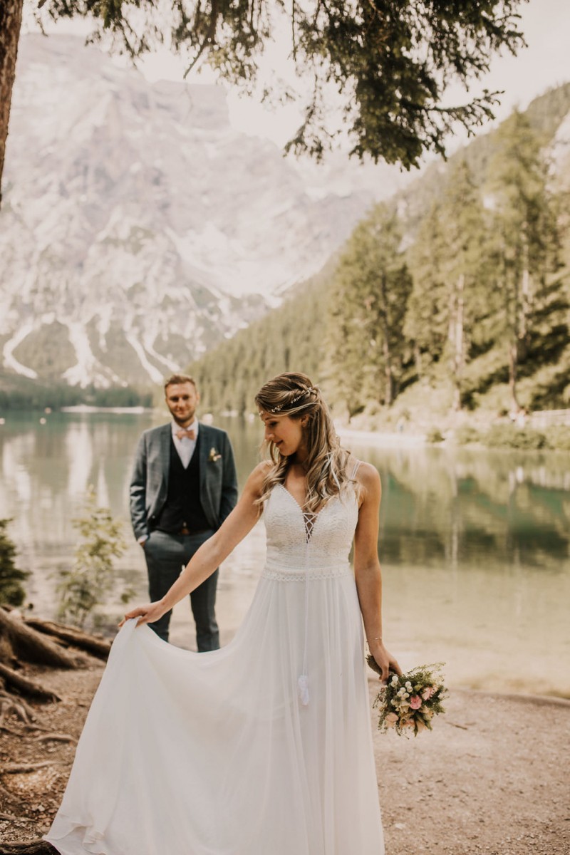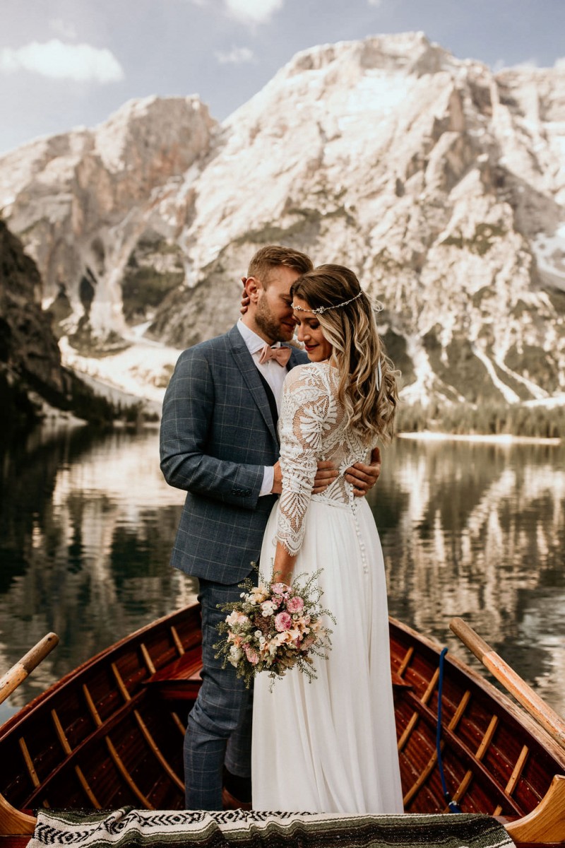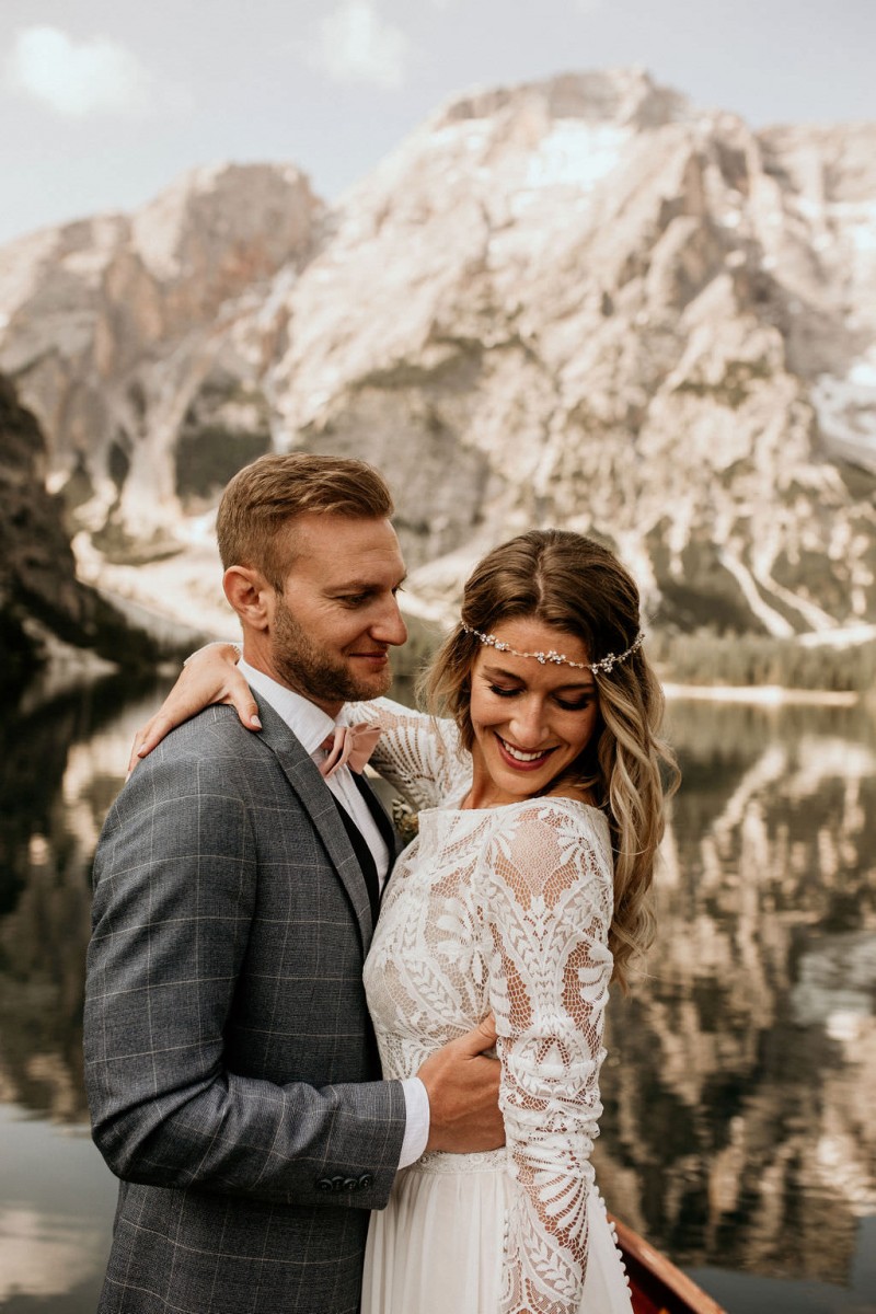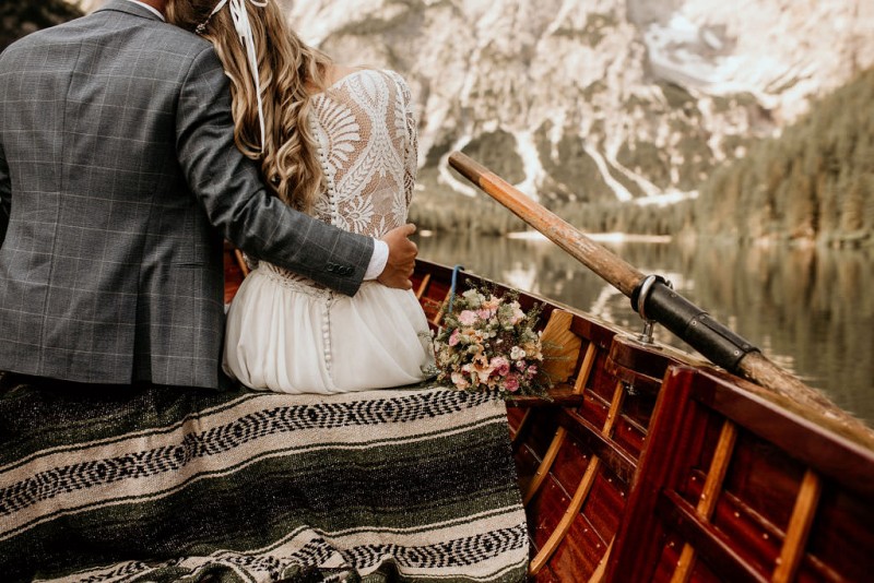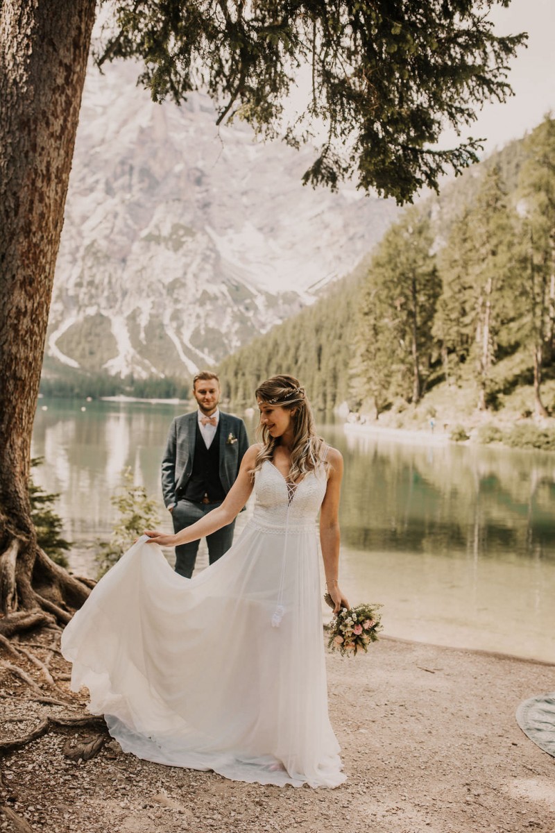 Das Titelbild verrät wohl schon, dass diese Inspiration magisch ist. Ein Styled Shoot am Pragser Wildsee im Bohostil erwartet euch in diesem Artikel. Zunächst zu diesem einmaligen Fleckchen in Italien. Eine von vielen mystischen Legenden besagt, dass diese imposanten Berge rund um den Pragser See einst von Wilden bewohnt wurden. Dort fertigten sie wunderschöne Bergkristalle. Um sich vor der Gier der Menschen zu schützen zogen sie sich zurück und öffneten die unterirdischen Quellen, um das Tal fluten. So entstand angeblich dieser glasklare See, der die Schätze dieser wilden verschlang. Ein wirklich sagenhafter Ort, an dieses Shooting stattfand. Perfekt für ein verliebtes Paar oder? Franzi und Eugen, das zuckersüße Brautpaar, standen selbst erst vor wenigen Wochen vor dem Altar. Da sie die Popularität dieser Location besorgte, fand ihre Hochzeit hier nicht statt. Grund genug, hier noch einmal ins Brautkleid und den Hochzeitsanzug zu schlüpfen! Eine weitere Besonderheit ist, dass diese Inspiration von zwei Hochzeitsfotografinnen fotografiert wurde. Laura Mack Fotografie & Lichterfunkeln Fotografiehaben dieses Styled Shoot gemeinsam geplant und fotografiert. Natürlich erwarten euch in diesem Artikel Fotos von ihnen beiden. Die Aufnahmen sind einfach magisch! Für das Brautpaar begann dieser sonnige Tag im Hotel, wo sie sich in der Früh fertig machten. Nach dem Styling von Hair and Makeup Artist Ulrike Thomaseth schlüpfte Franzi in ihr fließendes Brautkleid, mit zarten Spitzendetails, von Adriane Böhm Brautmoden. Es passt perfekt zu ihrem leichten Styling und dem leicht glitzernden Headpiece. Dazu schmückte sie ein Brautstrauß, in Rosétönen, von der Blumenwerkstatt Merching. Nach dem Getting Ready ging es für sie und ihren Eugen auf den Bootssteg, von wo aus sie eine romantische Bootsfahrt unternahmen. Nur sie beide. Sie waren ganz allein auf dem großen Pragser Wildsee und schauten sich den Sonnenaufgang an. Als wäre das nicht schon ein einmaliges Erlebnis, ging es für die beiden danach an Land, wo sie am Waldrand ein wunderschön dekoriertes Picknick, mit Blick auf den See, genossen. Die feine Hochzeitspapeterie von Schwesternwerk und die tolle Hochzeitstorte von Mondschein Dessertbar, machten dieses Picknick für die beiden ein fach perfekt. Und wir dürfen jetzt exklusiv über ihre Schultern schauen und diesen besonderen Tag miterleben. Ganz viel Freude euch mit dieser fantastischen Hochzeitsinspiration aus Italien!