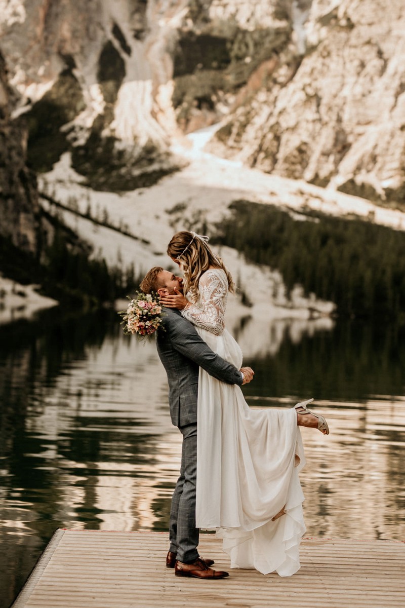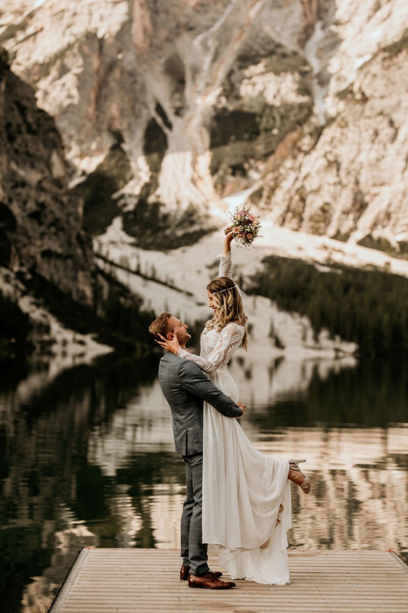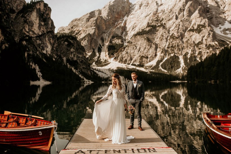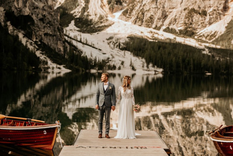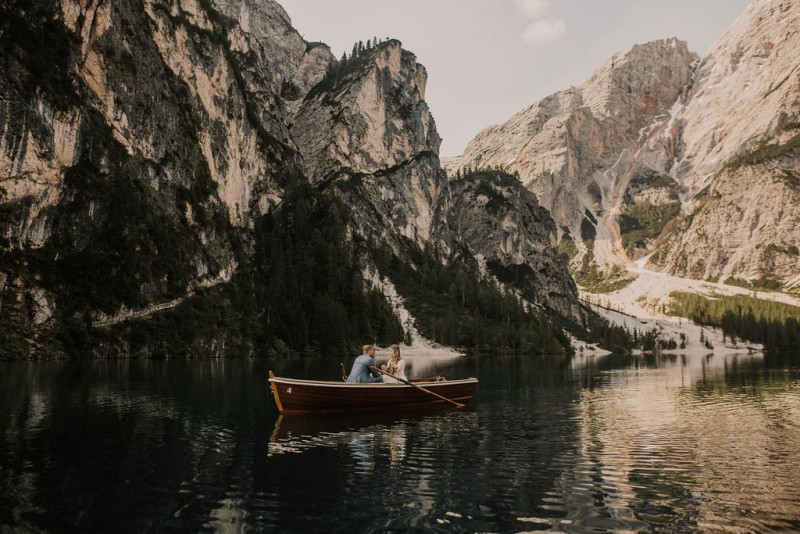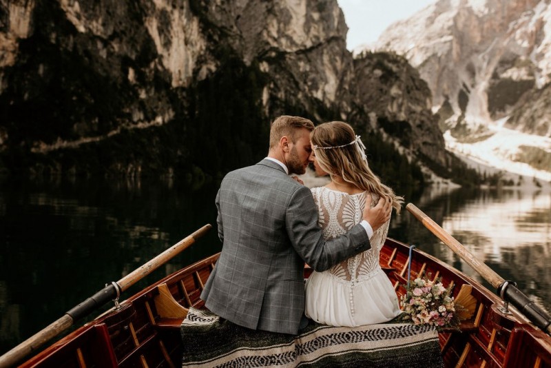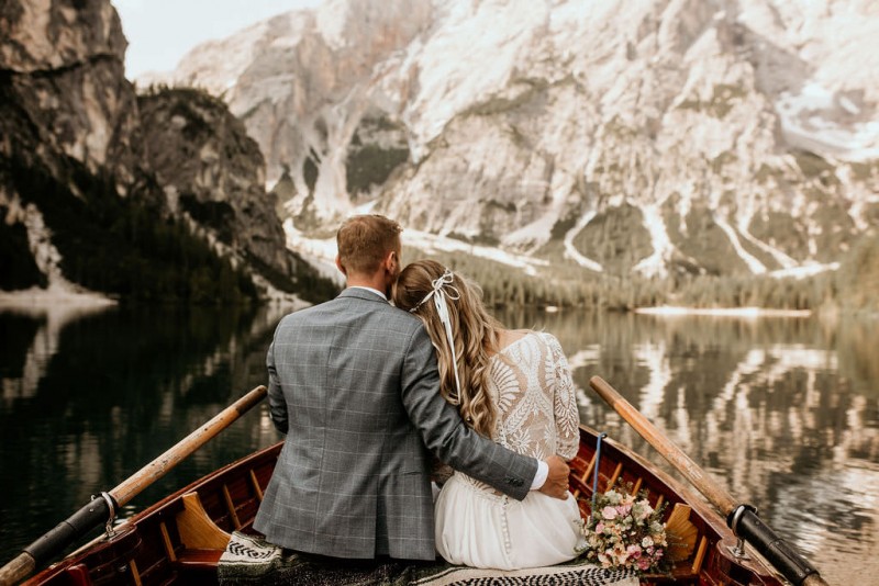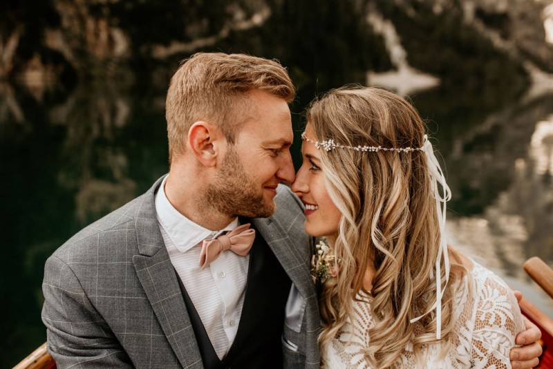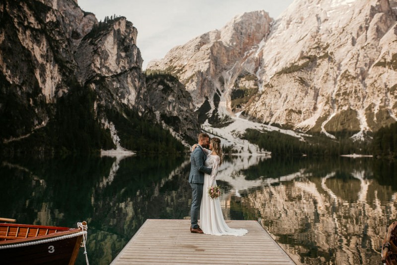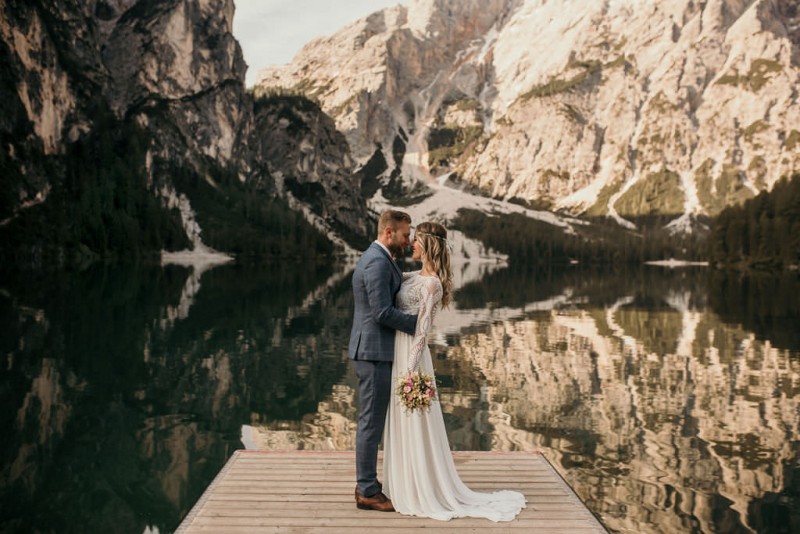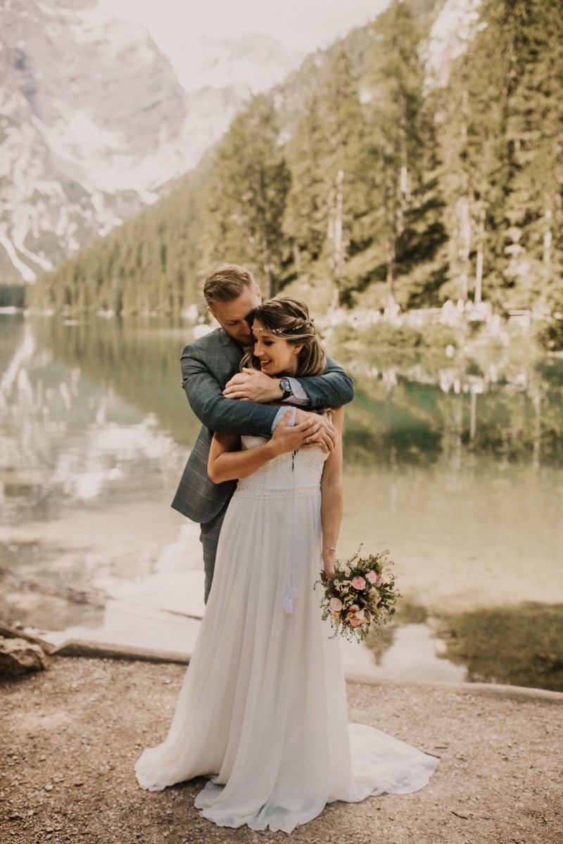 Das Titelbild verrät wohl schon, dass diese Inspiration magisch ist. Ein Styled Shoot am Pragser Wildsee im Bohostil erwartet euch in diesem Artikel. Zunächst zu diesem einmaligen Fleckchen in Italien. Eine von vielen mystischen Legenden besagt, dass diese imposanten Berge rund um den Pragser See einst von Wilden bewohnt wurden. Dort fertigten sie wunderschöne Bergkristalle. Um sich vor der Gier der Menschen zu schützen zogen sie sich zurück und öffneten die unterirdischen Quellen, um das Tal fluten. So entstand angeblich dieser glasklare See, der die Schätze dieser wilden verschlang. Ein wirklich sagenhafter Ort, an dieses Shooting stattfand. Perfekt für ein verliebtes Paar oder? Franzi und Eugen, das zuckersüße Brautpaar, standen selbst erst vor wenigen Wochen vor dem Altar. Da sie die Popularität dieser Location besorgte, fand ihre Hochzeit hier nicht statt. Grund genug, hier noch einmal ins Brautkleid und den Hochzeitsanzug zu schlüpfen! Eine weitere Besonderheit ist, dass diese Inspiration von zwei Hochzeitsfotografinnen fotografiert wurde. Laura Mack Fotografie & Lichterfunkeln Fotografiehaben dieses Styled Shoot gemeinsam geplant und fotografiert. Natürlich erwarten euch in diesem Artikel Fotos von ihnen beiden. Die Aufnahmen sind einfach magisch! Für das Brautpaar begann dieser sonnige Tag im Hotel, wo sie sich in der Früh fertig machten. Nach dem Styling von Hair and Makeup Artist Ulrike Thomaseth schlüpfte Franzi in ihr fließendes Brautkleid, mit zarten Spitzendetails, von Adriane Böhm Brautmoden. Es passt perfekt zu ihrem leichten Styling und dem leicht glitzernden Headpiece. Dazu schmückte sie ein Brautstrauß, in Rosétönen, von der Blumenwerkstatt Merching. Nach dem Getting Ready ging es für sie und ihren Eugen auf den Bootssteg, von wo aus sie eine romantische Bootsfahrt unternahmen. Nur sie beide. Sie waren ganz allein auf dem großen Pragser Wildsee und schauten sich den Sonnenaufgang an. Als wäre das nicht schon ein einmaliges Erlebnis, ging es für die beiden danach an Land, wo sie am Waldrand ein wunderschön dekoriertes Picknick, mit Blick auf den See, genossen. Die feine Hochzeitspapeterie von Schwesternwerk und die tolle Hochzeitstorte von Mondschein Dessertbar, machten dieses Picknick für die beiden ein fach perfekt. Und wir dürfen jetzt exklusiv über ihre Schultern schauen und diesen besonderen Tag miterleben. Ganz viel Freude euch mit dieser fantastischen Hochzeitsinspiration aus Italien!