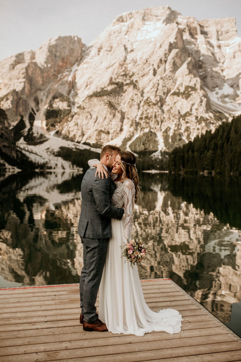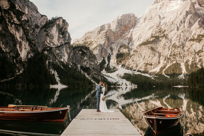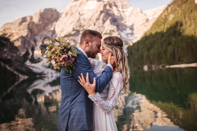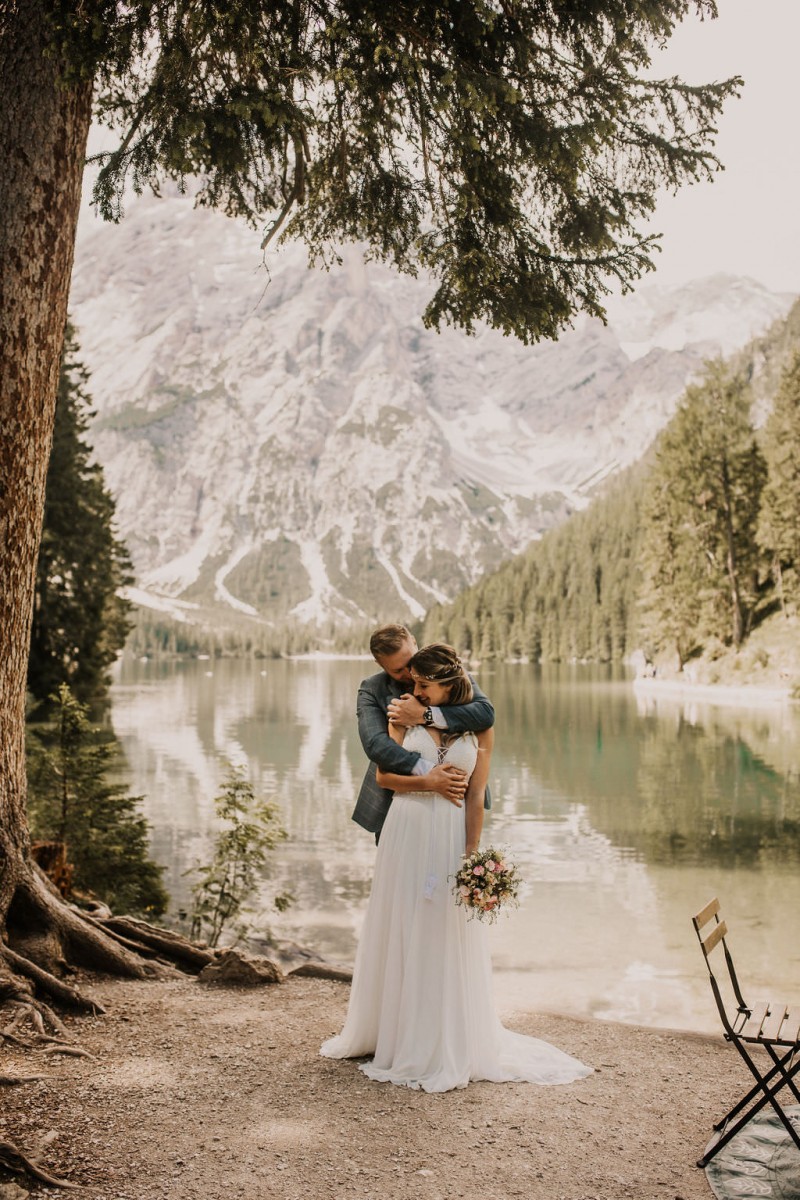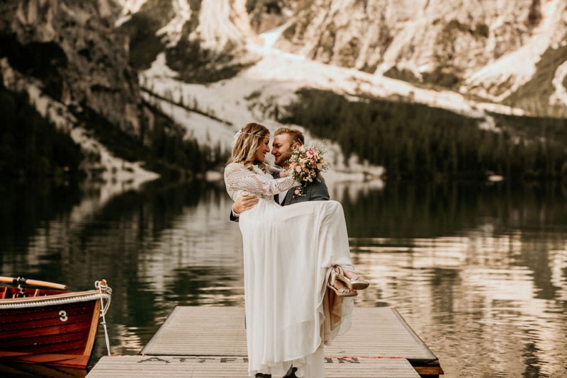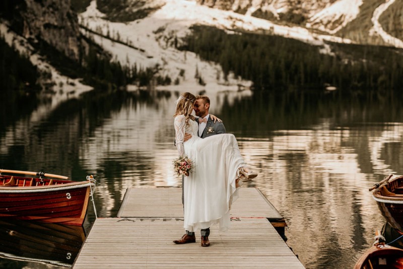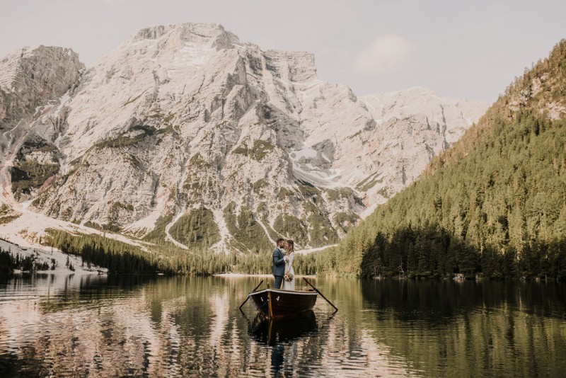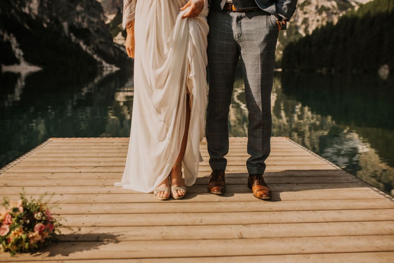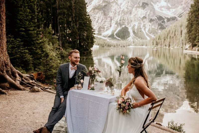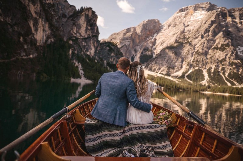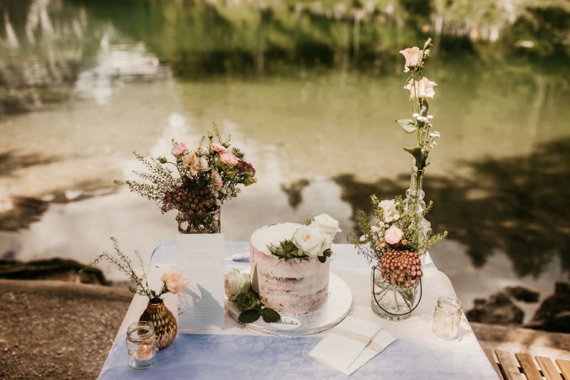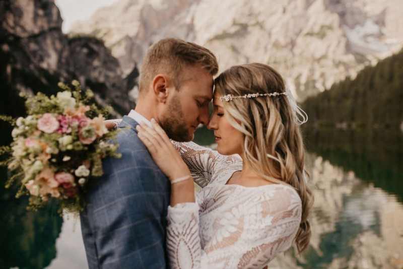 Das Titelbild verrät wohl schon, dass diese Inspiration magisch ist. Ein Styled Shoot am Pragser Wildsee im Bohostil erwartet euch in diesem Artikel. Zunächst zu diesem einmaligen Fleckchen in Italien. Eine von vielen mystischen Legenden besagt, dass diese imposanten Berge rund um den Pragser See einst von Wilden bewohnt wurden. Dort fertigten sie wunderschöne Bergkristalle. Um sich vor der Gier der Menschen zu schützen zogen sie sich zurück und öffneten die unterirdischen Quellen, um das Tal fluten. So entstand angeblich dieser glasklare See, der die Schätze dieser wilden verschlang. Ein wirklich sagenhafter Ort, an dieses Shooting stattfand. Perfekt für ein verliebtes Paar oder? Franzi und Eugen, das zuckersüße Brautpaar, standen selbst erst vor wenigen Wochen vor dem Altar. Da sie die Popularität dieser Location besorgte, fand ihre Hochzeit hier nicht statt. Grund genug, hier noch einmal ins Brautkleid und den Hochzeitsanzug zu schlüpfen! Eine weitere Besonderheit ist, dass diese Inspiration von zwei Hochzeitsfotografinnen fotografiert wurde. Laura Mack Fotografie & Lichterfunkeln Fotografiehaben dieses Styled Shoot gemeinsam geplant und fotografiert. Natürlich erwarten euch in diesem Artikel Fotos von ihnen beiden. Die Aufnahmen sind einfach magisch! Für das Brautpaar begann dieser sonnige Tag im Hotel, wo sie sich in der Früh fertig machten. Nach dem Styling von Hair and Makeup Artist Ulrike Thomaseth schlüpfte Franzi in ihr fließendes Brautkleid, mit zarten Spitzendetails, von Adriane Böhm Brautmoden. Es passt perfekt zu ihrem leichten Styling und dem leicht glitzernden Headpiece. Dazu schmückte sie ein Brautstrauß, in Rosétönen, von der Blumenwerkstatt Merching. Nach dem Getting Ready ging es für sie und ihren Eugen auf den Bootssteg, von wo aus sie eine romantische Bootsfahrt unternahmen. Nur sie beide. Sie waren ganz allein auf dem großen Pragser Wildsee und schauten sich den Sonnenaufgang an. Als wäre das nicht schon ein einmaliges Erlebnis, ging es für die beiden danach an Land, wo sie am Waldrand ein wunderschön dekoriertes Picknick, mit Blick auf den See, genossen. Die feine Hochzeitspapeterie von Schwesternwerk und die tolle Hochzeitstorte von Mondschein Dessertbar, machten dieses Picknick für die beiden ein fach perfekt. Und wir dürfen jetzt exklusiv über ihre Schultern schauen und diesen besonderen Tag miterleben. Ganz viel Freude euch mit dieser fantastischen Hochzeitsinspiration aus Italien!