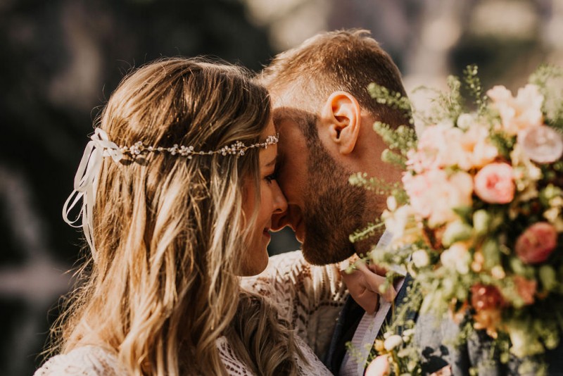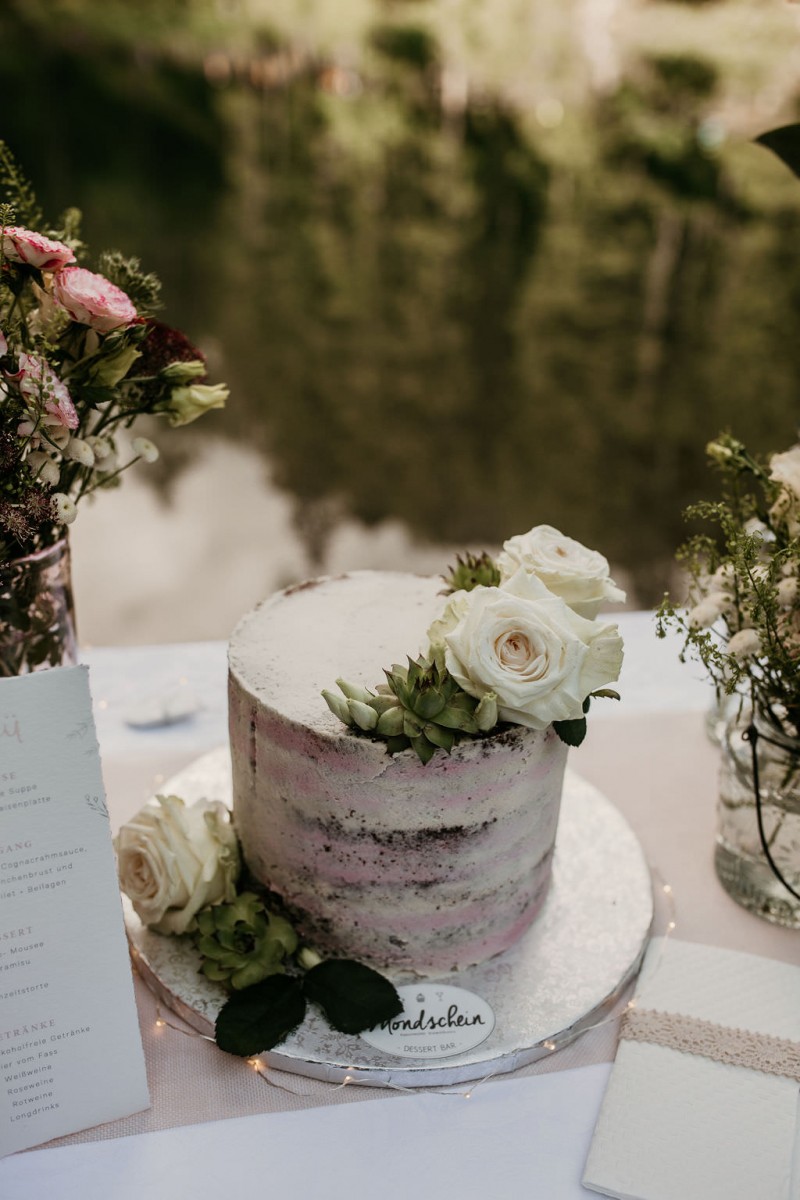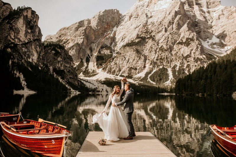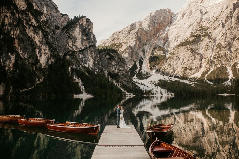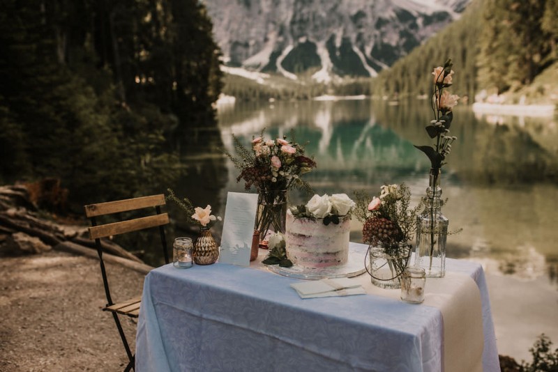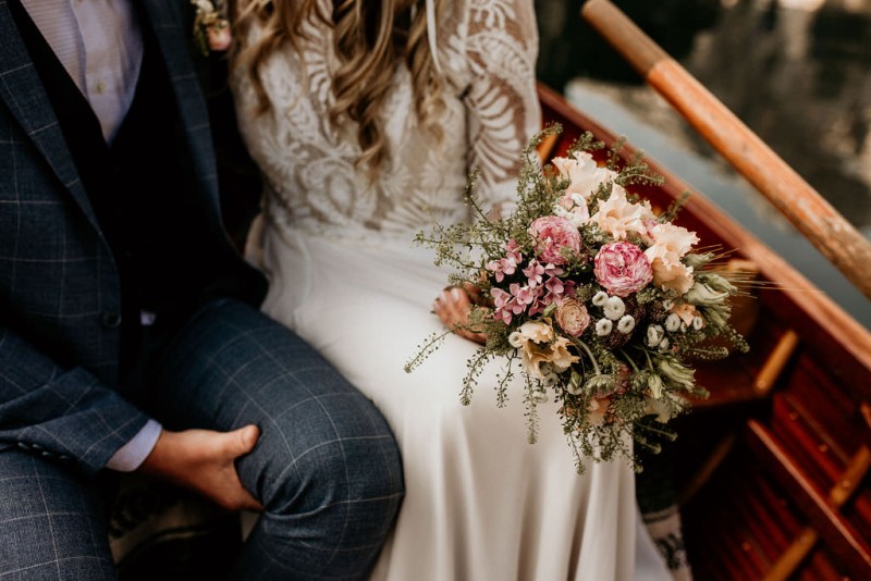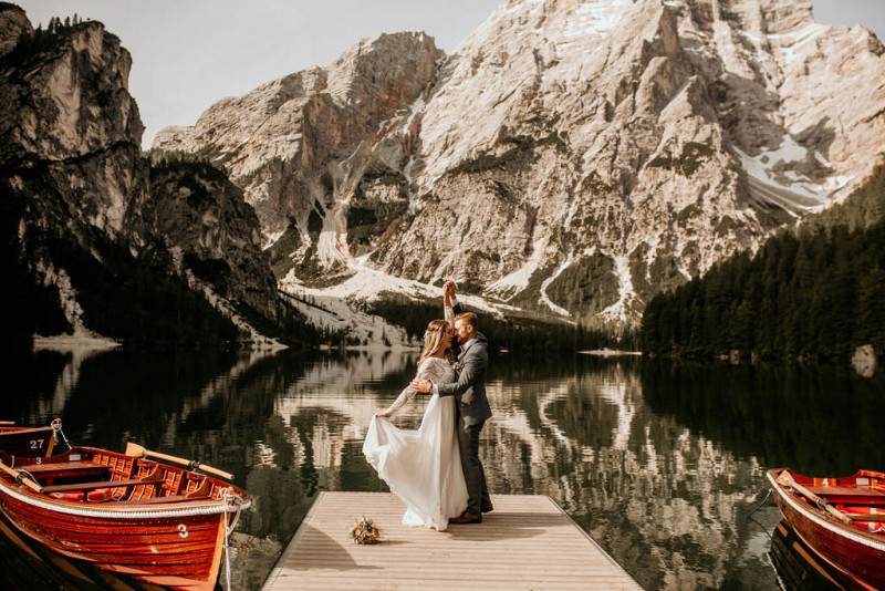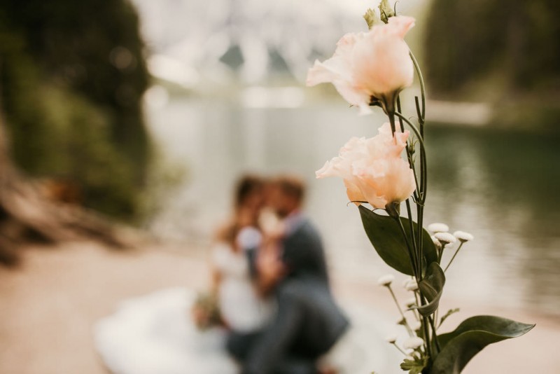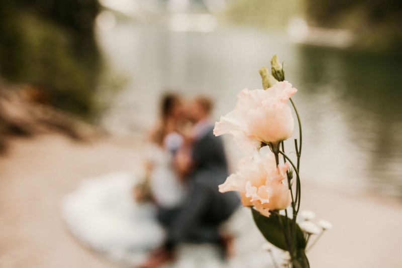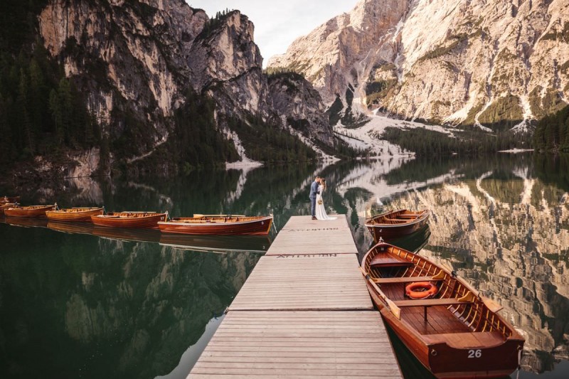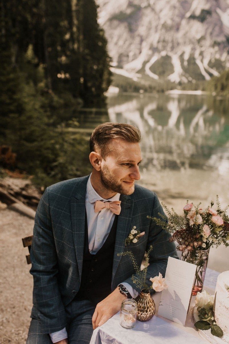 Das Titelbild verrät wohl schon, dass diese Inspiration magisch ist. Ein Styled Shoot am Pragser Wildsee im Bohostil erwartet euch in diesem Artikel. Zunächst zu diesem einmaligen Fleckchen in Italien. Eine von vielen mystischen Legenden besagt, dass diese imposanten Berge rund um den Pragser See einst von Wilden bewohnt wurden. Dort fertigten sie wunderschöne Bergkristalle. Um sich vor der Gier der Menschen zu schützen zogen sie sich zurück und öffneten die unterirdischen Quellen, um das Tal fluten. So entstand angeblich dieser glasklare See, der die Schätze dieser wilden verschlang. Ein wirklich sagenhafter Ort, an dieses Shooting stattfand. Perfekt für ein verliebtes Paar oder? Franzi und Eugen, das zuckersüße Brautpaar, standen selbst erst vor wenigen Wochen vor dem Altar. Da sie die Popularität dieser Location besorgte, fand ihre Hochzeit hier nicht statt. Grund genug, hier noch einmal ins Brautkleid und den Hochzeitsanzug zu schlüpfen! Eine weitere Besonderheit ist, dass diese Inspiration von zwei Hochzeitsfotografinnen fotografiert wurde. Laura Mack Fotografie & Lichterfunkeln Fotografiehaben dieses Styled Shoot gemeinsam geplant und fotografiert. Natürlich erwarten euch in diesem Artikel Fotos von ihnen beiden. Die Aufnahmen sind einfach magisch! Für das Brautpaar begann dieser sonnige Tag im Hotel, wo sie sich in der Früh fertig machten. Nach dem Styling von Hair and Makeup Artist Ulrike Thomaseth schlüpfte Franzi in ihr fließendes Brautkleid, mit zarten Spitzendetails, von Adriane Böhm Brautmoden. Es passt perfekt zu ihrem leichten Styling und dem leicht glitzernden Headpiece. Dazu schmückte sie ein Brautstrauß, in Rosétönen, von der Blumenwerkstatt Merching. Nach dem Getting Ready ging es für sie und ihren Eugen auf den Bootssteg, von wo aus sie eine romantische Bootsfahrt unternahmen. Nur sie beide. Sie waren ganz allein auf dem großen Pragser Wildsee und schauten sich den Sonnenaufgang an. Als wäre das nicht schon ein einmaliges Erlebnis, ging es für die beiden danach an Land, wo sie am Waldrand ein wunderschön dekoriertes Picknick, mit Blick auf den See, genossen. Die feine Hochzeitspapeterie von Schwesternwerk und die tolle Hochzeitstorte von Mondschein Dessertbar, machten dieses Picknick für die beiden ein fach perfekt. Und wir dürfen jetzt exklusiv über ihre Schultern schauen und diesen besonderen Tag miterleben. Ganz viel Freude euch mit dieser fantastischen Hochzeitsinspiration aus Italien!