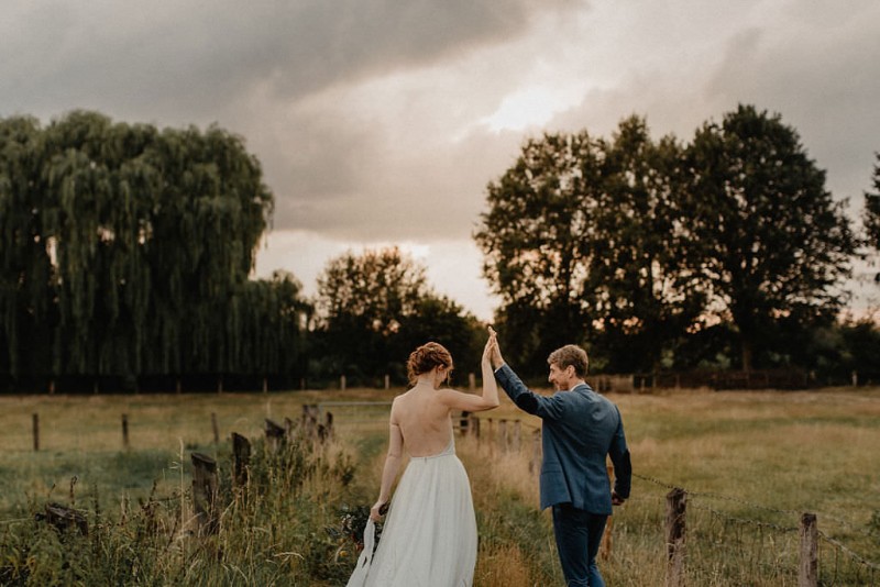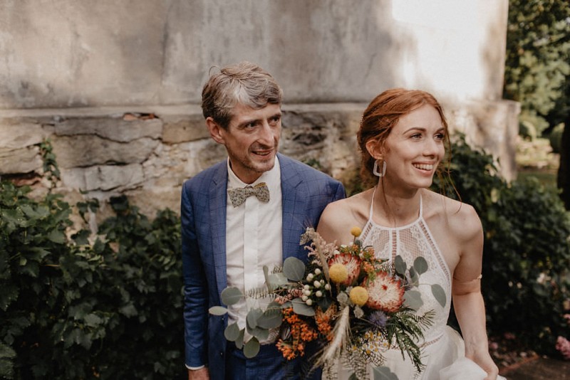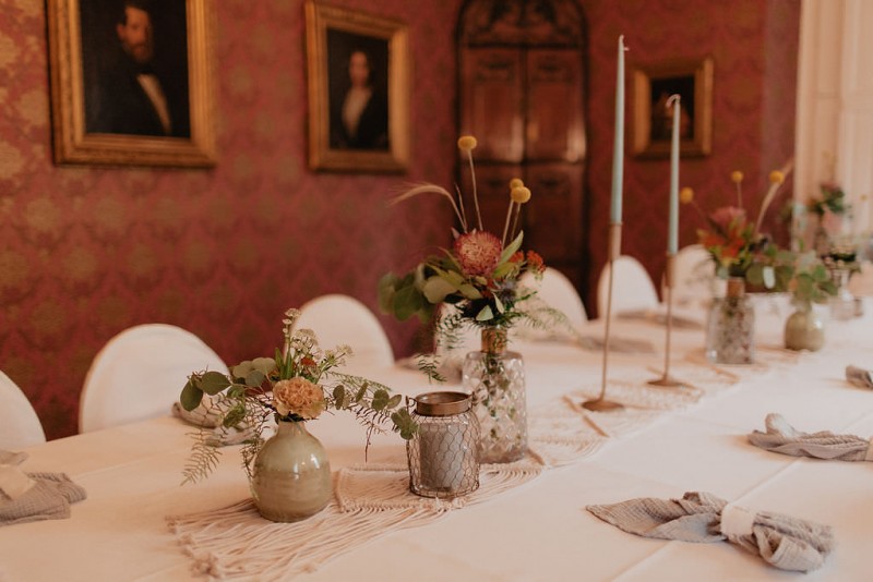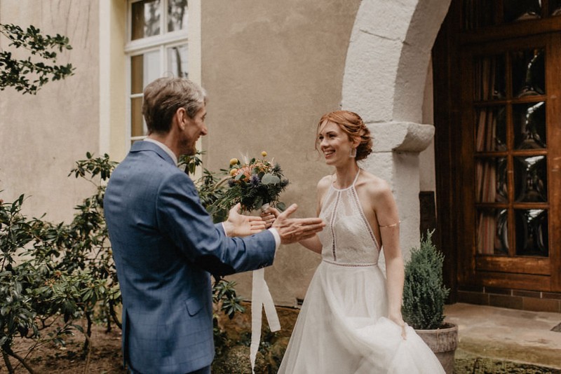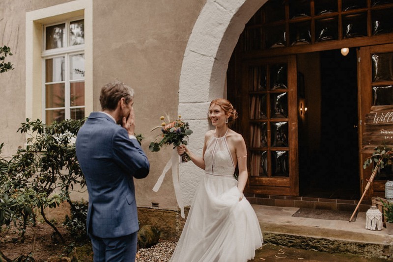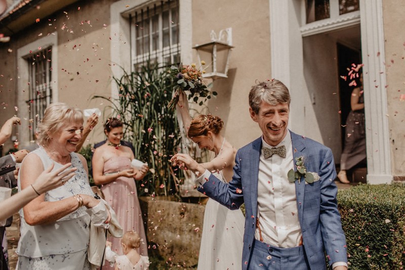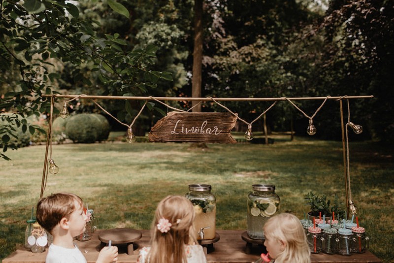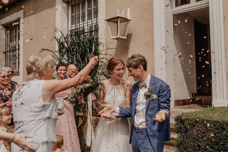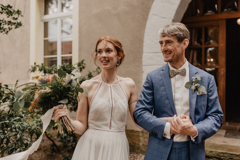 Am 20. Juli diesen Jahres feierten Dominique und Sven ihre zauberhafte standesamtliche Hochzeit in der Nähe der Grenze zu den Niederlanden. Eine bohoinspirierte Sommerhochzeit mit einer zauberhaften Hochzeitsfeier im Garten und einer emotionalen standesamtlichen Trauung erwarten euch. Begleitet wurde das Brautpaar von Hochzeitsfotografin Leonie Rosendahl, die diesen besonderen Tag fotografisch so schön festgehalten hat. Die Braut selbst hat ihn geplant und die Dekoration und die Floristik im Bohostil gezaubert. Und so begann er, bei strahlendem Sonnenschein, mit dem Getting Ready der Braut. Gestylt wurde Dominique von Lisa Knape, die ihr einen lockeren Updo und ein natürliches Makeup kreierte. In einem zarten Brautkleid mit tiefem Rückenausschnitt und mit ihrem feinen Brautstrauß samt beschriftetem Seidenband, machte sie sich auf zu ihrem Bräutigam. Dieser wartete bereits auf sie in einem Outfit von monsieur agnes und einer Fliege von Der Feine Herr, vor der Tür des Gebäudes. Hier fand der emotionale First Look der beiden statt. Von dort aus ging es gemeinsam mit den Kindern zum Standesamt, wo die beiden sich, umgeben von ihren Liebsten, ihr Ja-Wort gaben. Musikalisch begleitet wurde dieser besondere Moment von she said yes music, die auch auf der anschließenden Gartenfeier für Stimmung sorgten. Und diese ist wirklich ein Traum! Eine lange, wunderschön dekorierte, Tafel erwartete die Gäste, sowie eine zauberhafte Limobar. Zudem gab es einige tolle Spiele, die sowohl bei den Kindern als auch bei den Erwachsenen für Spaß sorgten. Auch die Hochzeitstorte wurde von der Braut kreiert. Sie sammelte diese essbaren Blüten über ein Jahr hinweg und trocknete sie. So entstand diese wunderschöne Hochzeitstorte. Mit dem Anschnitt der Hochzeitstorte endete leider das schöne Wetter. Regen zog auf und die Hochzeitsgesellschaft zog ins Innere des Gebäudes, wo ebenfalls ein wunderschön dekorierter Raum auf sie wartete. Der Wolkenbruch konnte der Stimmung keinen Abbruch tun und so ging die Hochzeitsfeier drinnen weiter. Da es zum Abend hin aufhörte zu regnen, erwartet euch, neben all diesen feinen Details auch ein romantisches Brautpaarshooting. Ganz viel Freude euch mit all diesen einmaligen Eindrücken und Inspirationen!