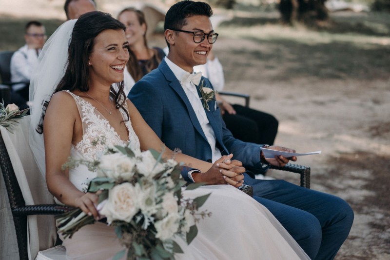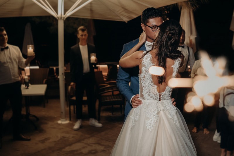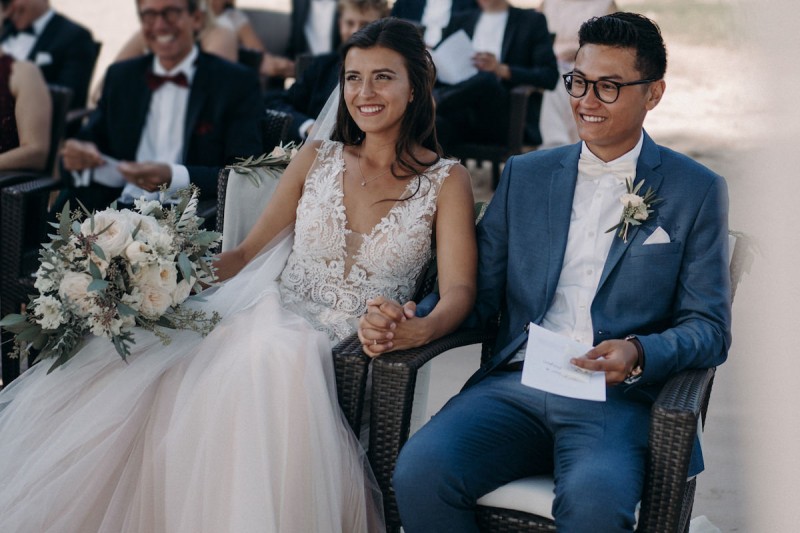 Im schönen Alcanada auf der Baleareninsel Mallorca, fand diese bohoinspirierte Hochzeit mit freier Trauung direkt am Wasser statt. Geplant war zunächst, die Hochzeit mit 120 Gästen in diesem Jahr zu feiern. Doch plötzlich merkte das Brautpaar, dass es etwas kleines, feines und familiäres werden sollte. Nicht irgendwo, sondern auf Mallorca. Aus 2020 wurde dann das Jahr 2019 und aus 120 Gästen wurden 30. Und so fand ihre traumhaft schöne Mallorca Hochzeit am 1. Oktober 2019 im intimen Kreis statt. Fotografiert und videografiert wurde die Hochzeit der beiden vom Hochzeitsfotografenpaar Alina & Patrick Photography. Sie waren vom Beginn der Hochzeitsplanung an der Seite des Brautpaares und freuten sich sehr, als aus der Hochzeit plötzlich eine sonnige Destination Wedding wurde. Und ja, auch das wunderschöne und romantische Hochzeitsvideo der beiden findet ihr in diesem Artikel! Emotionen pur! Schon die Trauung der beiden, direkt am Wasser mit weitem Blick auf das Meer, war sehr persönlich. Getraut wurden sie, unter einem geschmückten Traubogen aus Holz, von ihrem Jugendpastor. Die Livemusik während der Trauung kam von ihren Liebsten höchstselbst. Bei der Planung und Dekoration stand den beiden eine liebe Freundin beiseite. So gibt es einiges an zauberhafter Floristik und Dekoration zu entdecken, sowohl bei der Trauzeremonie, als auch der Hochzeitsfeier im Restaurante La Terraza Alcanda. Zudem könnt ihr wirklich bezaubernde Bilder des Brautpaarshootings entdecken. Einmal, im Hochzeitsoutfit: Salomé in einem roséfarbenen Brautkleid, mit groben Spitzendetails, vom Nastasja Gebert Bridal Showroom und in Brautschuhen von Paul Green. Dominique in einem tollen blauen Anzug von Strellson mit weißem Hemd und weißer Fliege. Und einmal in einem etwas leichteren Outfit: Er ohne sein Sacko und sie in einem nudefarbenen Kleidchen, für die grandiosen Bilder im Wasser. Vom Sonnenuntergang geküsst und von Wellen umgeben, sind extrem grandiose (und auch sehr heiße!) Bilder der beiden entstanden. Doch überzeugt euch einfach selbst von dieser tollen Mallorca Hochzeit und den WOW-Bildern der beiden! Ganz viel Freude euch damit!