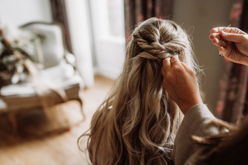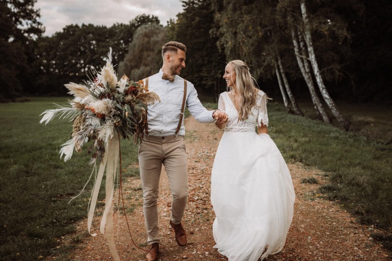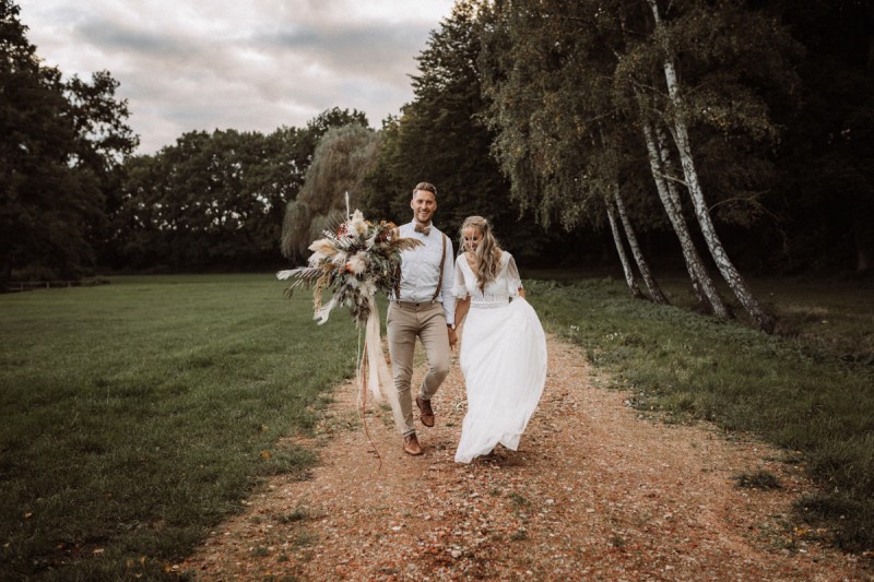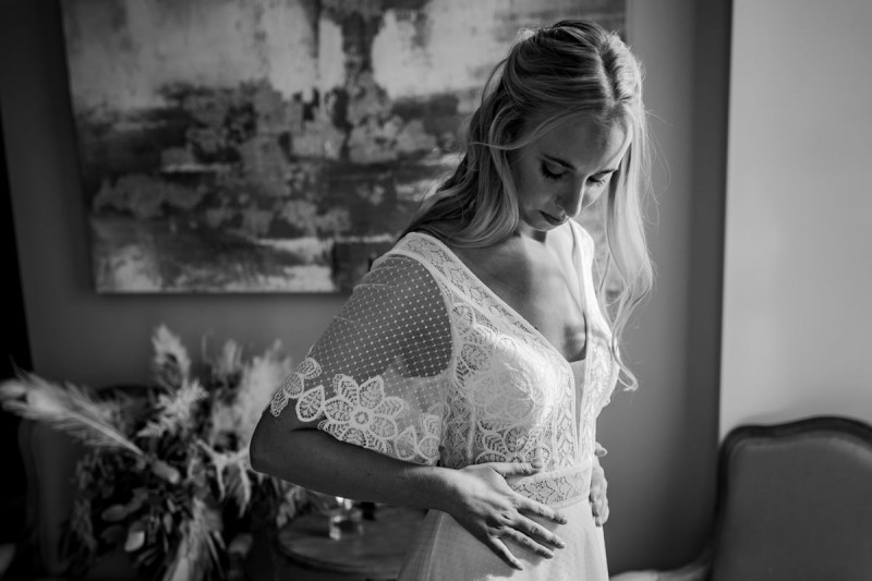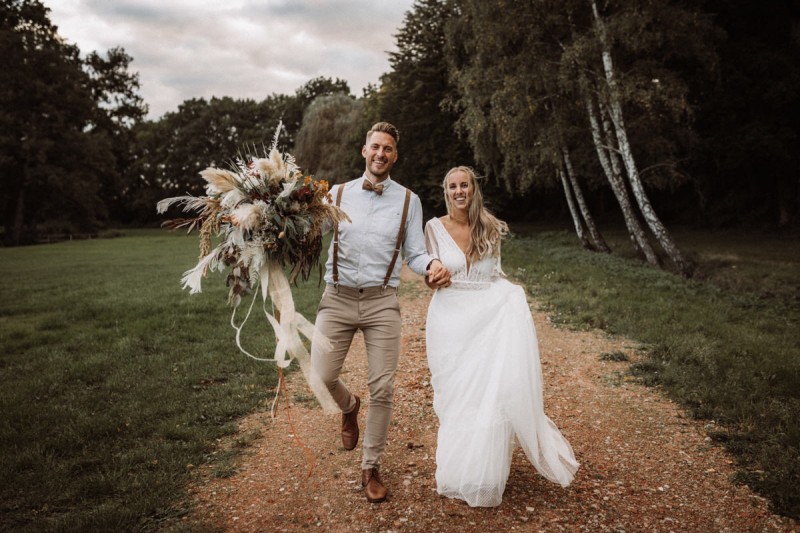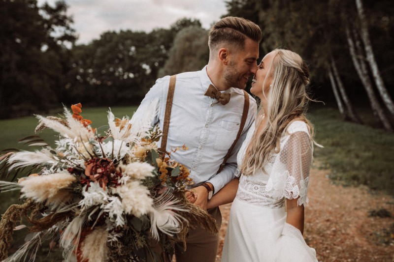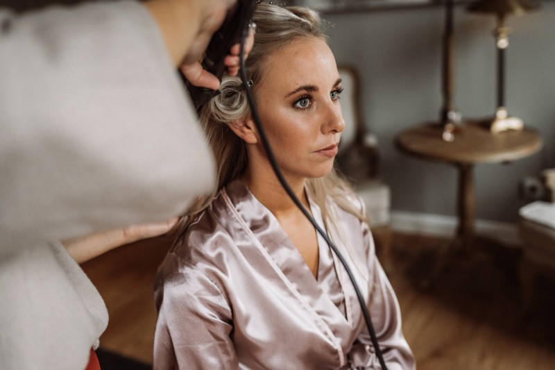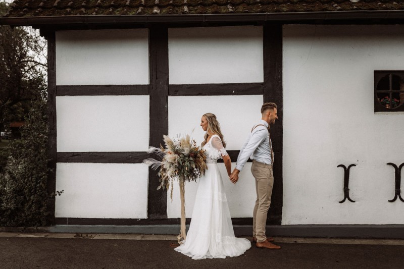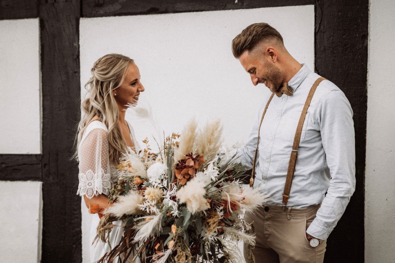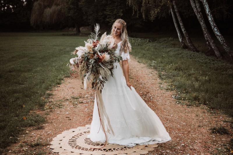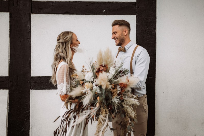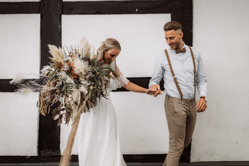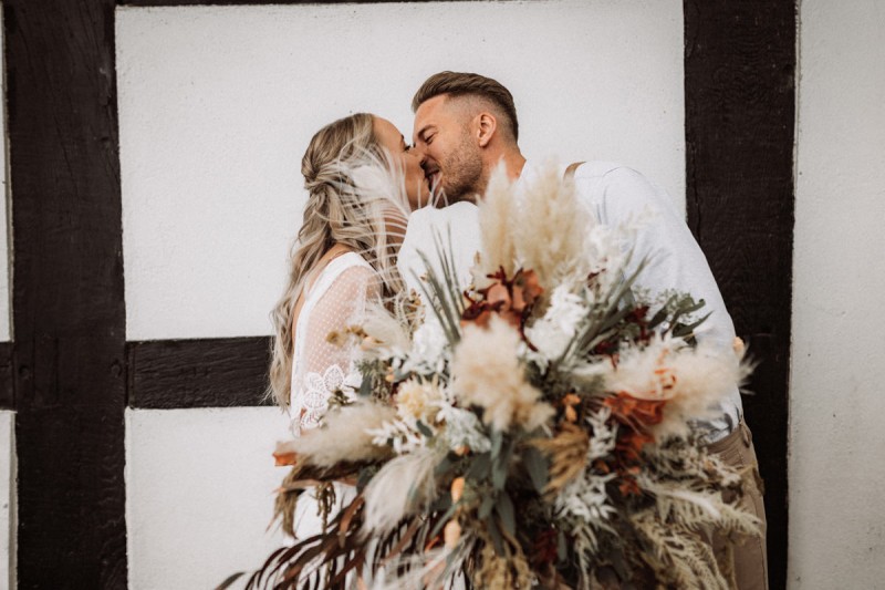 Begonnen hat dieser romantische Tag in einem der Hotelzimmer des Guts mit dem Getting Ready, wo die hübsche Braut Vivian von Sinem Boydak gestylt wurde. Ein zartes und sehr natürliches Makeup in Naturtönen und locker fallendes, leicht zurückgestecktes Haar mit kleinen Flechtsträhnen, gaben ihr ein schlichtes aber absolut perfektes Hochzeitsstyling. In diesem schönen Wohlfühlmakeup stieg sie in ein langes Bohobrautkleid von Anne Liebe Brautatelier, dessen zartes Oberteil, ellenbogenlange Ärmel sowie Punkt- und Spitzendetails einfach zum Dahinschmelzen sind. Ihr großer, ausladender und wilder Brautstrauß aus Trockenblumen, gezaubert von Blumen Schouten, rundet ihren Boholook einfach perfekt ab!