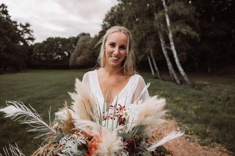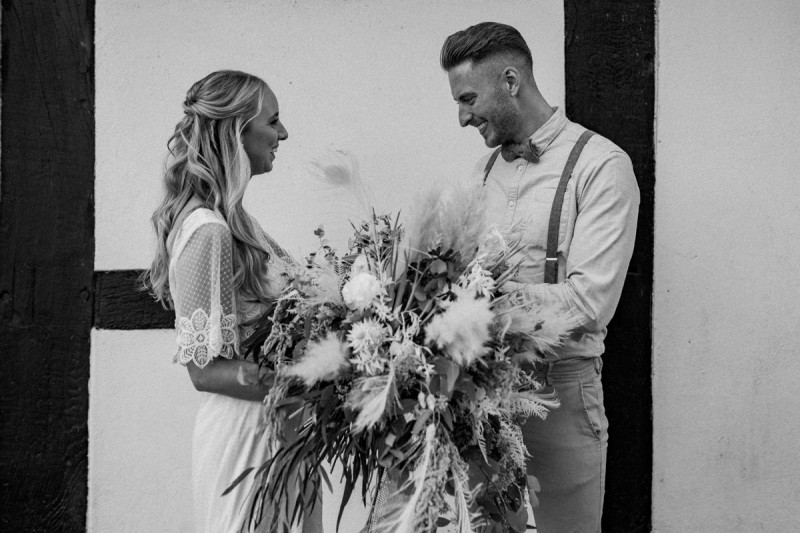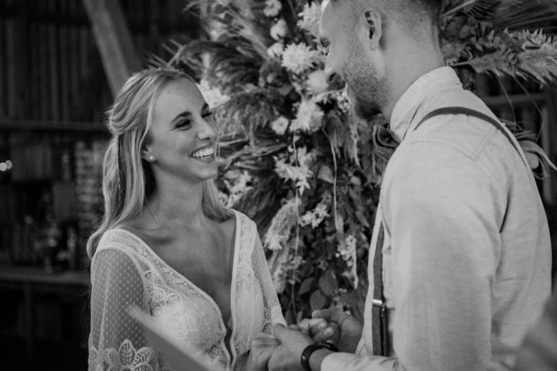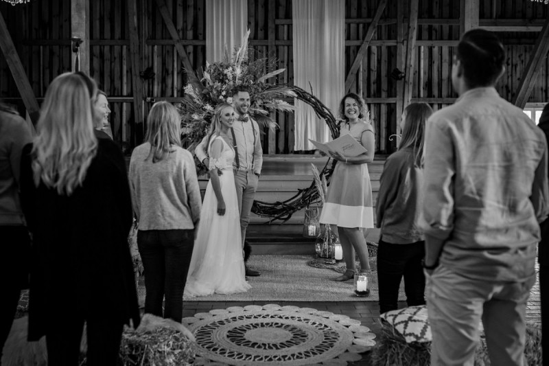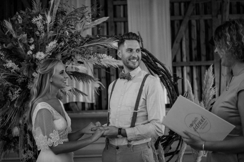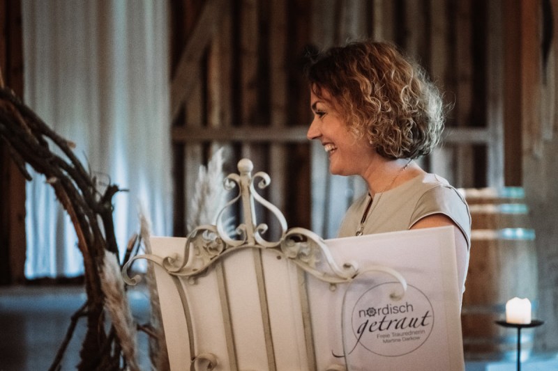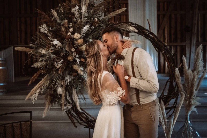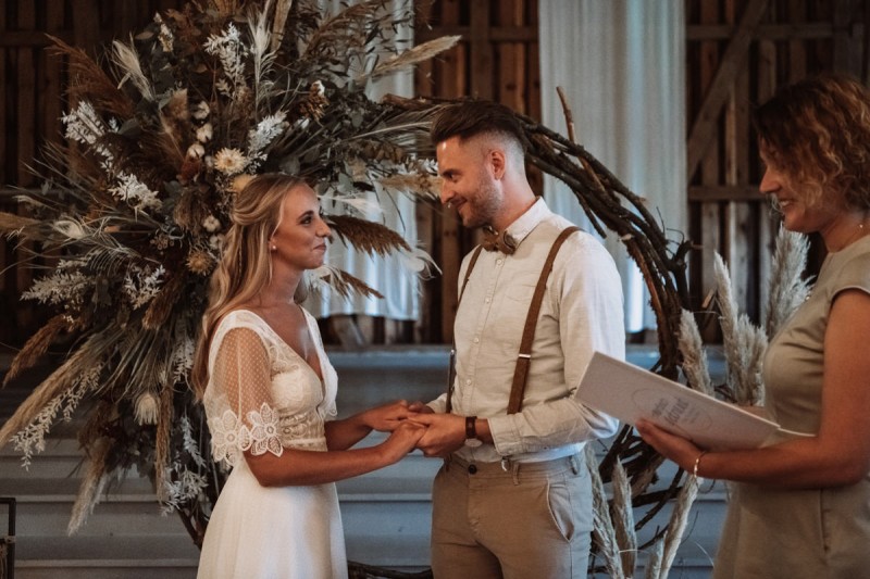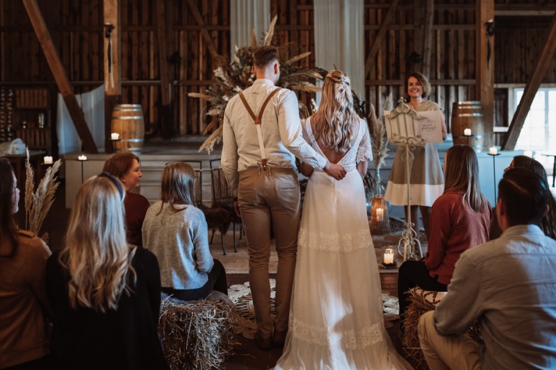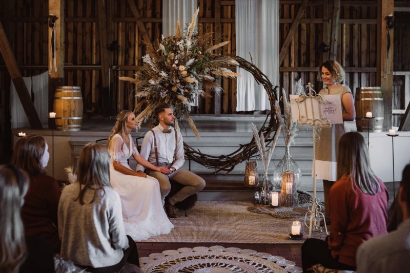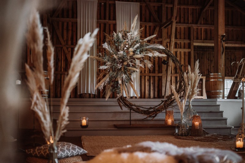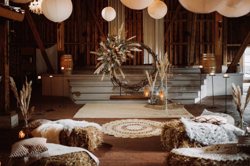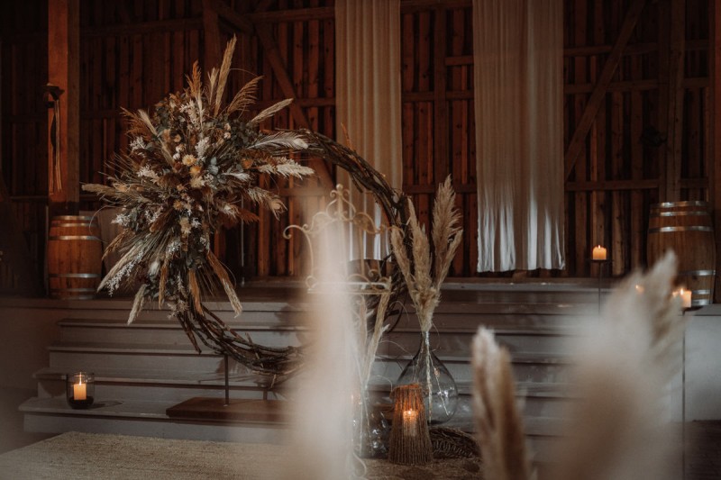 Doch kommen wir zur großen Feier in der schönen Scheune des Guts und dem Highlight des Tages, der freien Trauung! Große weiße Lampenschirme und unzählige Lichterketten hingen an diesem Tag von der hohen Decke hinab und leuchteten dem Brautpaar den Weg zum Traubogen. Aus vielen Ästen kreiert, wartete der runde Traubogen vor den steinernen Treppen. Blumen Schouten hat ein wildes und unglaublich opulentes Blumenbouquet aus Trockenblumen kreiert, das den Traubogen schmückte. Vor ihm standen Strohballen mit Kissen und Decken bestückt, von wo aus die Gäste die romantische freie Trauung der beiden, mit Traurednerin Martina Darkow von nordisch getraut, verfolgen konnten.
