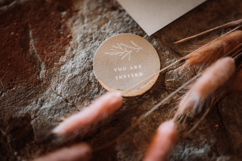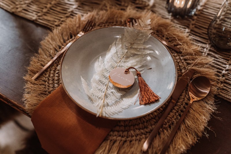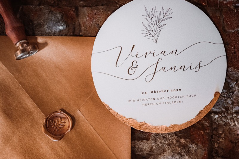 Die Hochzeitspapeterie von Sorokoh, die dieses emotionale Hochzeitsfest ankündigte, lehnt an dieses romantische Setting perfekt an. Zu dem kreisrunden Traubogen kreierten Sorokoh, ebenfalls runde Save the Date Karten und Hochzeitseinladungen mit Elementen aus edlem Blattkupfer, mit kupferfarbenem Siegel, ganz dünnem Lettering und Zeichnungen von Olivenzweigen. Die Kombination des naturfarbenen Papiers und der Formen, vom Umschlag bis hin zu den Namenskärtchen, ist unglaublich gelungen. Beim hängenden Sitzplan, mit kupfernen Ringen und liebevoll kreierten Makrameefedern von Sandra, kommt das runde Design mit dem schönen Blattkupfer besonders gut zur Geltung.