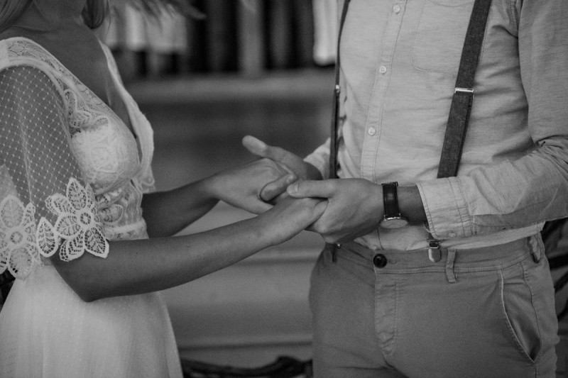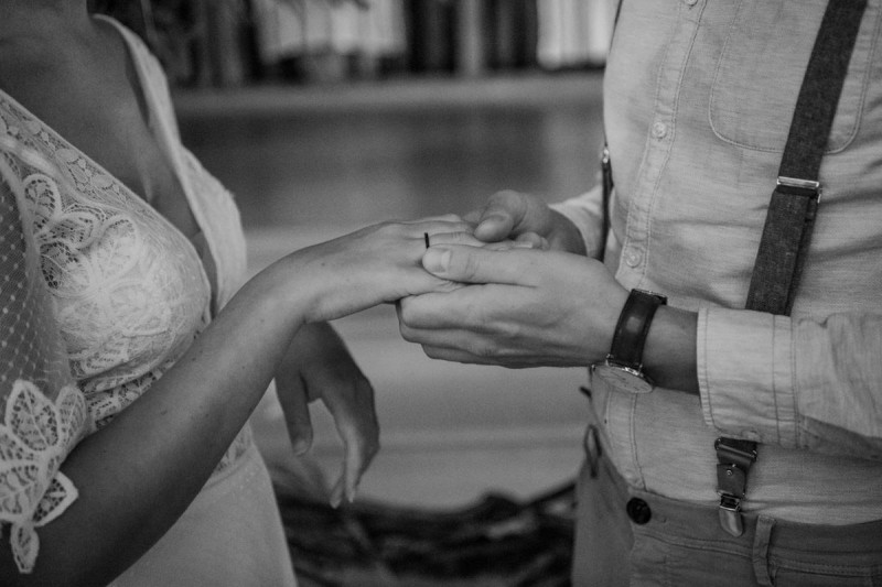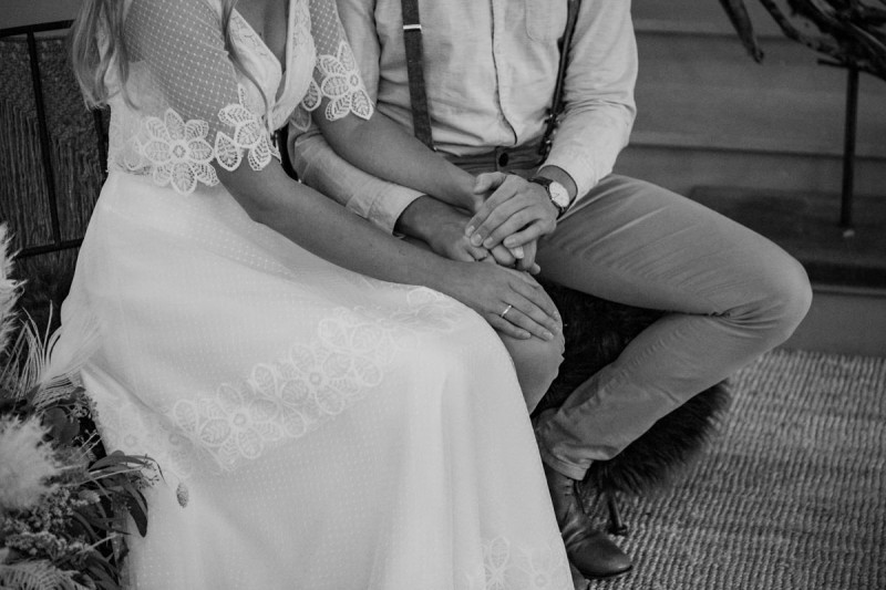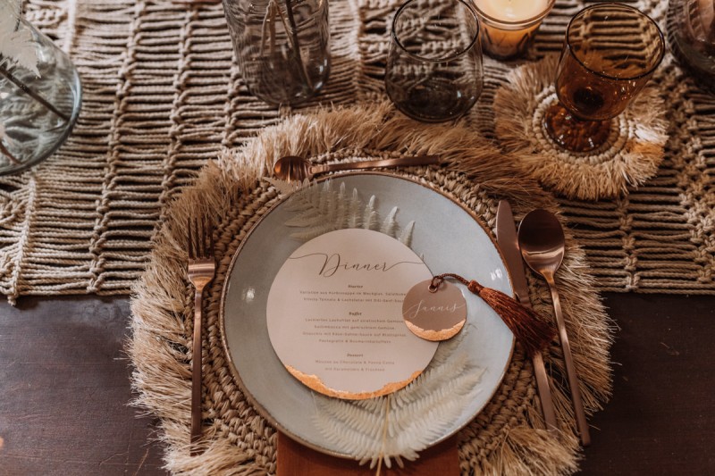 Dass wir den beiden bei diesem sehr besonderen Moment über die Schulter schauen durften, haben wir Hochzeitsfotografin Sandra Schöbel zu verdanken! Sie hat nicht nur die tollen Bilder dieser ausladenden Inspiration gemacht, sondern auch die Organisation auf die Beine gestellt. Und noch ein, oder sagen wir besser viele Highlights dürfen wir dank ihr in dieser Hochzeitsinspiration bestaunen: Die liebevoll kreierte Makramee-Dekoration, von Makrameefedern, über den Tischläufer, den Stuhlbehang bis hin zu den herrlich fransigen Telleruntersetzern, stammt alles aus ihrer „Feder“.