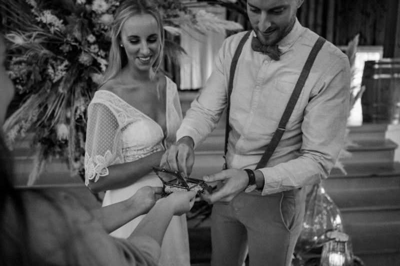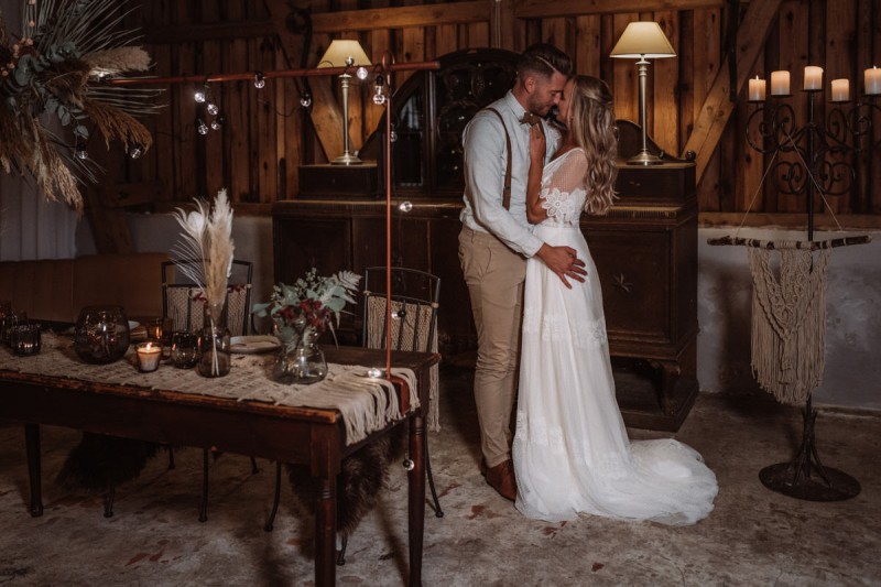 Nach dem emotionalen Ja-Wort, vielen Freudentränen und herzhaften Lachern, sowie dem Ringtausch mit den Eheringen von Citlali Design, ging es für Vivian & Jannis zunächst hinaus in die Natur für die wunderschönen Aufnahmen ihres Brautpaarshootings. In der Scheune wartete derweil die Hochzeitsfeier auf die beiden. Kerzen soweit das Auge reicht, viele und aufwendige Makramee-Designs kombiniert zu kupferfarbenen Stoffen und ein Brauttisch, dessen Licht- und Blumeninstallation euch umhauen dürfte. Kuschelig rustikal und zugleich leicht und natürlich, erstrahlt die Scheune des Gut Altona. Und ihr seid jetzt ganz herzlich eingeladen, diese wundervolle Inspiration einer rustikalen Bohohochzeit in vollen Zügen zu genießen!