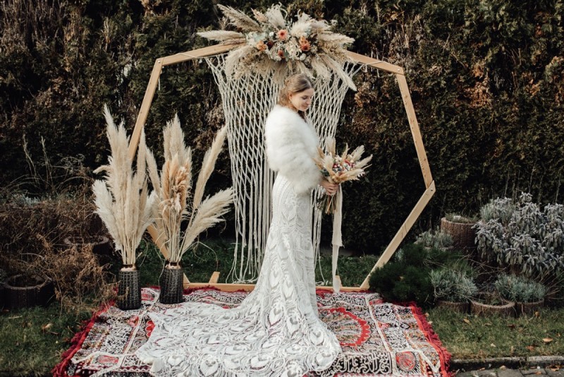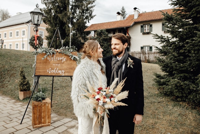 Heute dürfen wir Anna-Maria & Stefano bei ihrer winterlichen Bohohochzeit im schönen Salzburg über die Schulter schauen. Am 3. Januar diesen Jahres feierten sie ihre standesamtliche Trauung, mit ihren 20 Liebsten, voller wunderbarer Bohovibes. Fotografiert wurde ihr großer Tag von Hochzeitsfotografin Barbara Pölzgutter. Die gesamte Dekoration & Floristik übernahm und kreierte die liebe Julia von Deko-Denk, die den beiden einen winterlichen Bohotraum zauberte. Ihr Hochzeitstag begann in der Stille Nacht Kapelle, in der sie ihr Glück unterschrieben. Anna-Maria trug dabei ein wunderschöne Brautkleid von Rue de Seine, das sie bei feinstens fand. Warmgehalten wurde sie an diesem kalten Januartag von einer Felljacke ihrer Mutter aus den 70er Jahren, die ihrem Brautlook einen besonders wilden Touch verlieh. Ebenfalls wunderschön wild: Ihr winterlicher Boho-Brautstrauß. Pampasgras, natürlich und gebleicht, Ruscus, Dahlien, Eukalyptus, Phalaris, sowie Rosen finden sich darin. Perfekt passend zu dem wunderschönen Traubogen, der als besondere Fotokulisse für diesen Tag genutzt wurde. Ein großes Makramee, Teppiche und noch mehr Pampasgras warteten, samt großer Flowercloud am Traubigen selbst, auf die beiden nach der Trauung. Von der kleinen Kapelle ging es für das Brautpaar und ihre Gäste in das Hotel Restaurant Der Jägerwirt. Dort feierten sie die Nacht hindurch. Eine wunderschöne Winterhochzeit, die den standesamtlichen Gang mit einer kleinen Gesellschaft gebührend feiert. Und wir dürfen jetzt all diese wunderschönen Details genießen. Ganz viel Freude euch mit dieser zauberhaften Januarhochzeit!