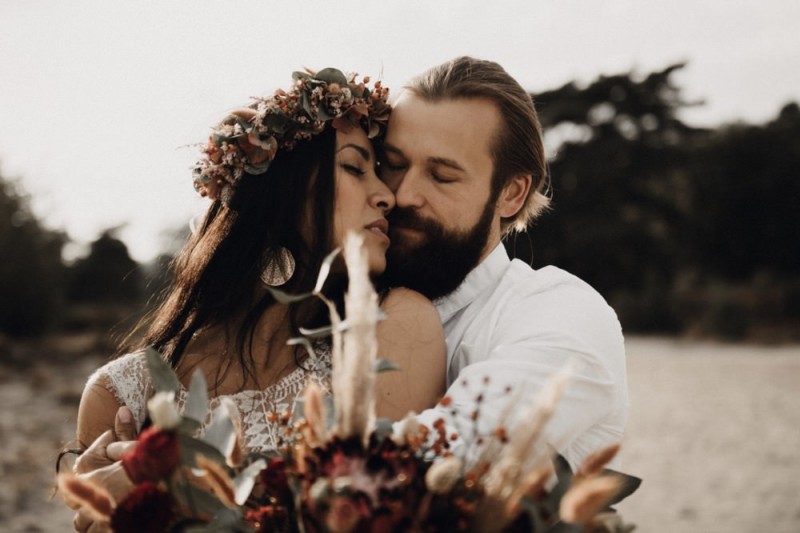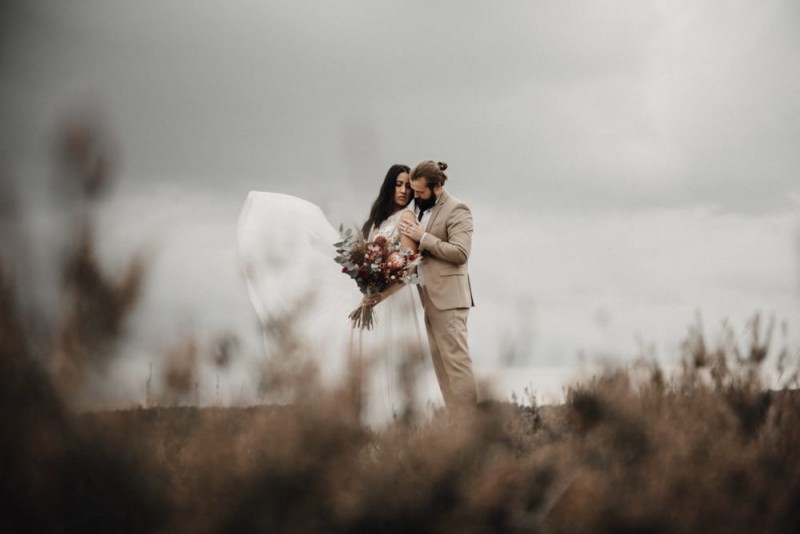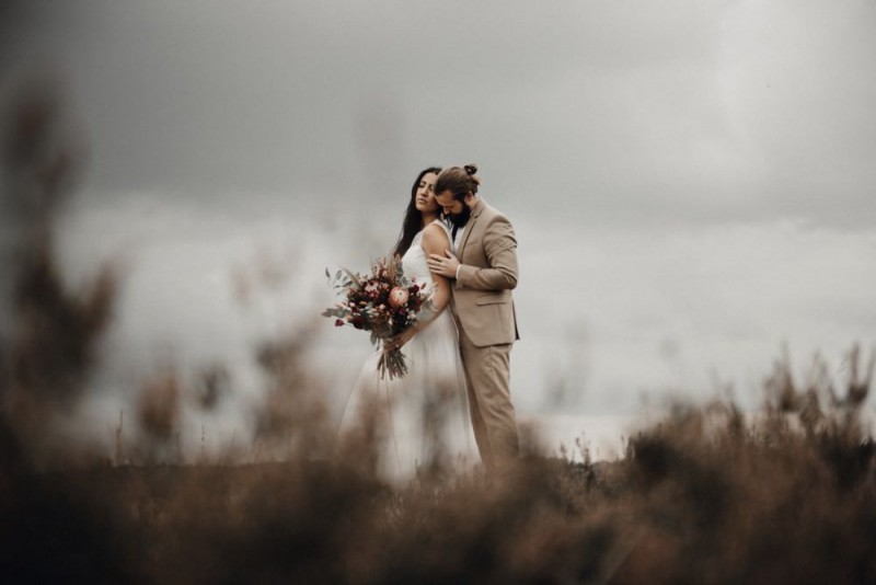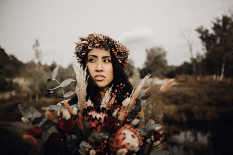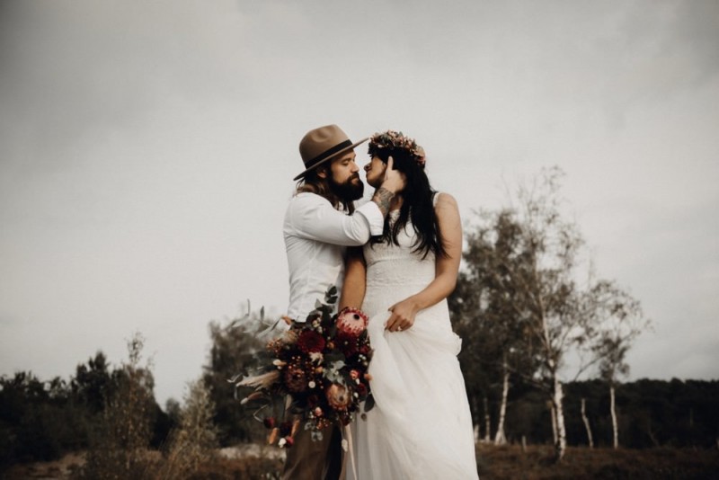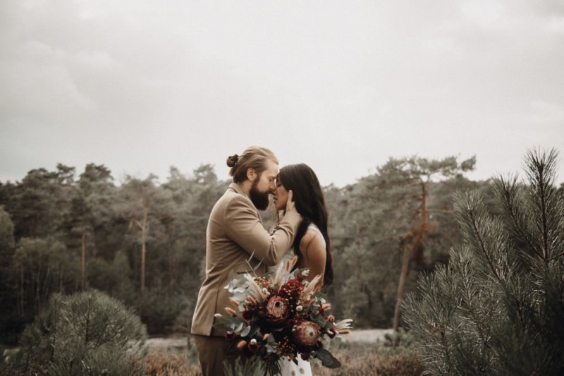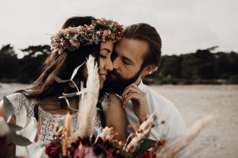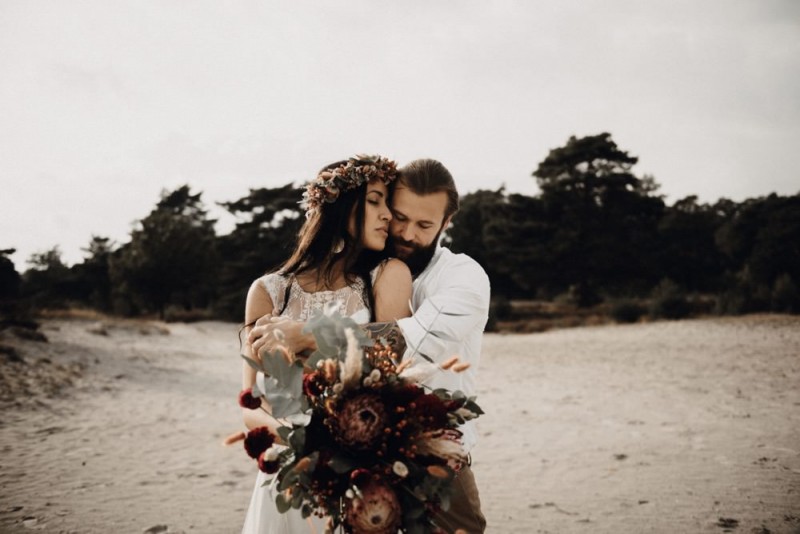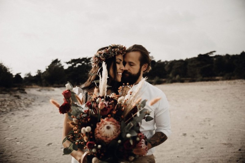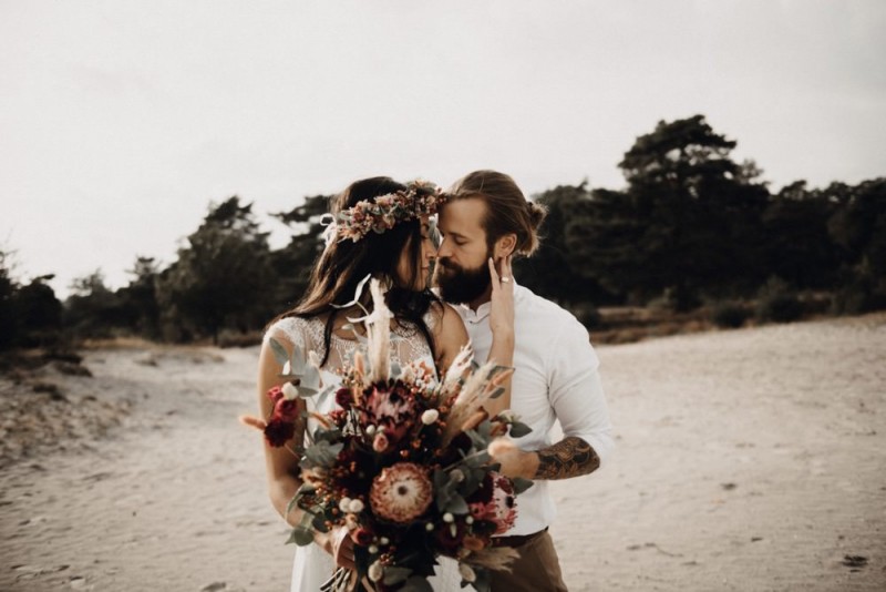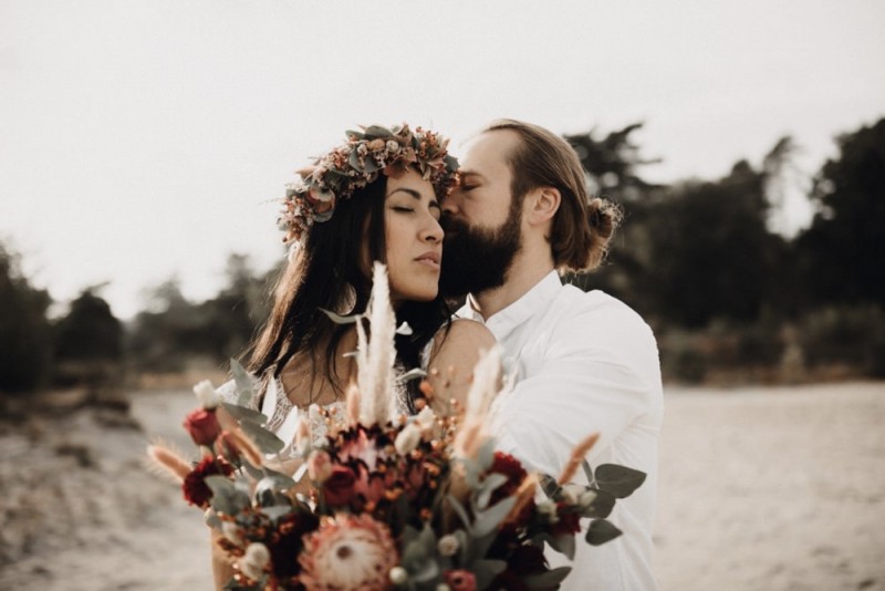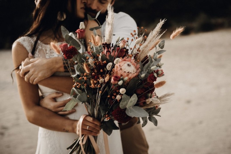Bei diesem schönen Couple Shooting, fotografiert von Hochzeitsfotograf Jan Bölts, dürfen wir dem süßen Paar Annahid & Thorsten zu einem abgelegenen Fleckchen in der Natur folgen. Passend zum leichten Bohobrautkleid vom Brautatelier Elena Victoria und zum exotischen Typ der bezaubernden Braut, kreierte Lena Grüner vom Blütenwerk by Lena Grüner einen wilden, exotischen Brautstrauß in dunklem Rot, leichten Orangetönen und grünen Akzenten, sowie eine passende Flowercrown. Im opulenten Brautstrauß finden sich feurige Proteen, die von Pampasgras, gefärbtem Lagurus und hellem Phalaris, sowie dunkelrotem Lisianthius umgeben sind. Frischer Eukalyptus, dunkelrote Dahlien und kleine Hagebutten umspielen die großen exotischen Proteen. Für die Flowercrown wurden zusätzlich Hortensienblüten verwendet. Ob für eine Herbst- oder Winterhochzeit, diese farbintensive und exotisch angehauchte Floristik – gespickt mit einigen Trockenblumen – bringt garantiert jede Braut zum Strahlen!