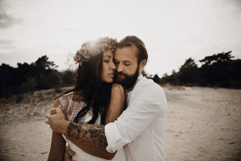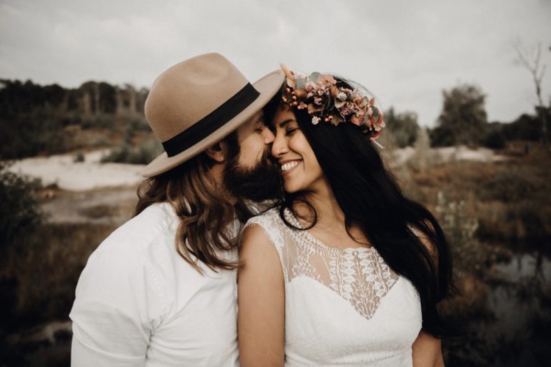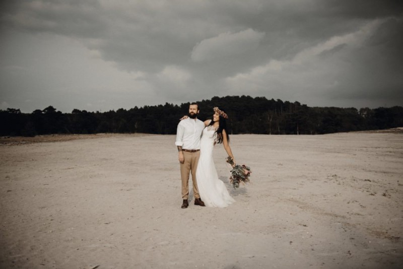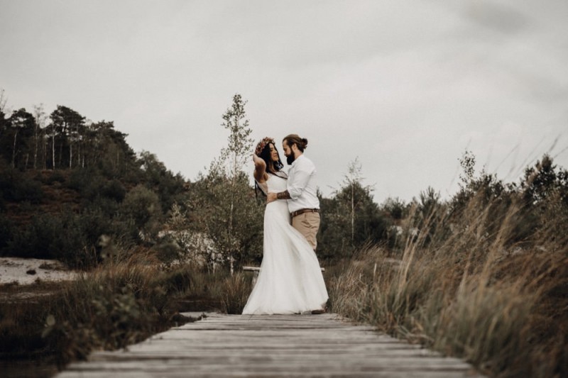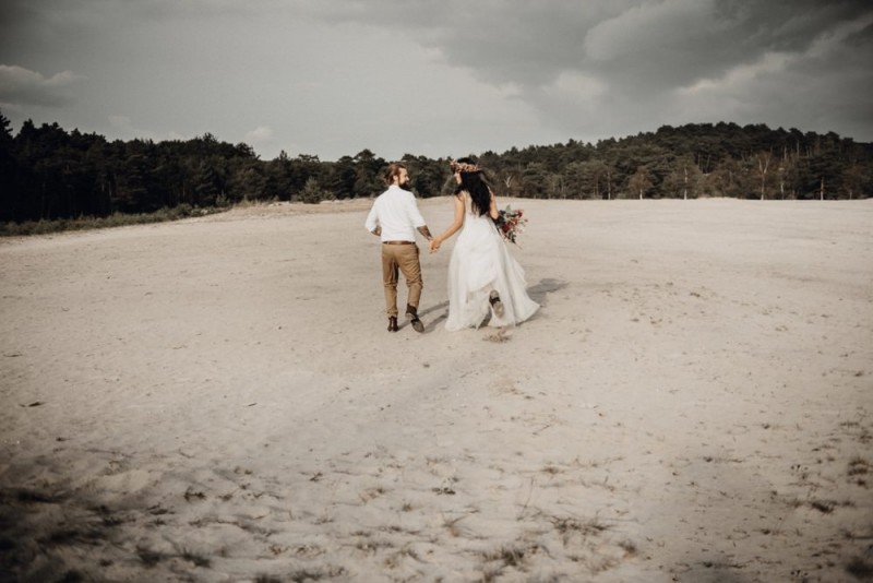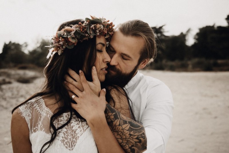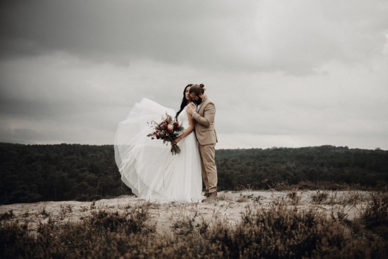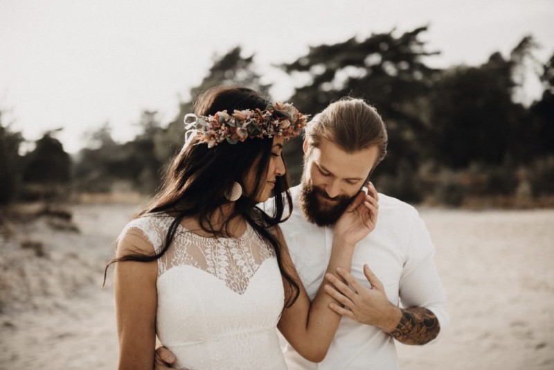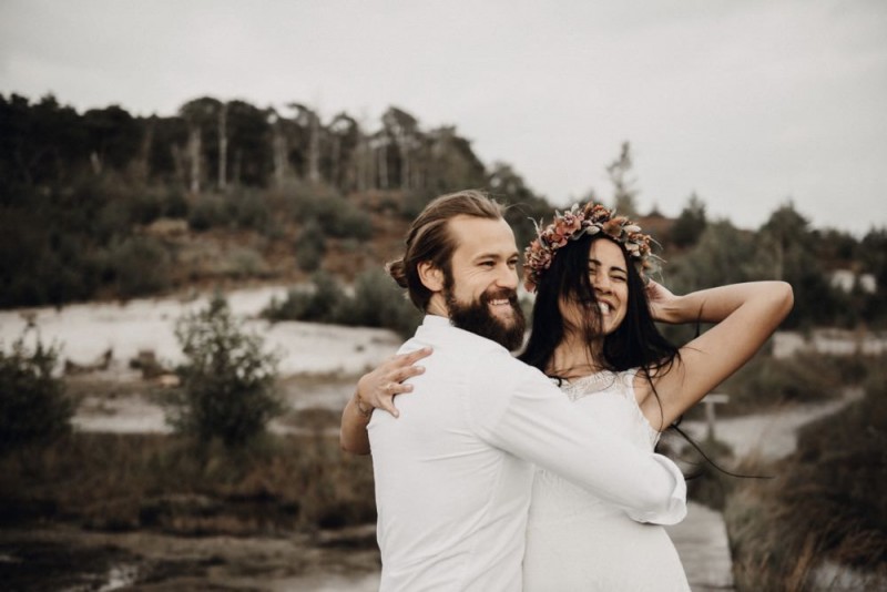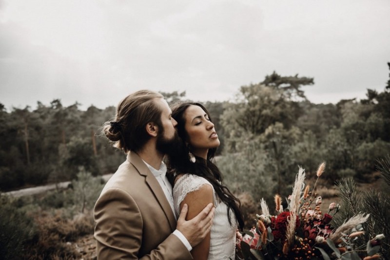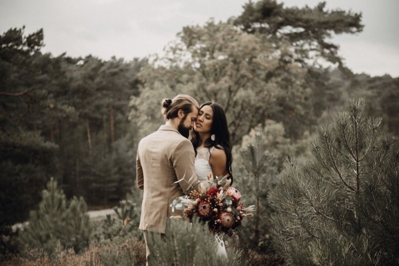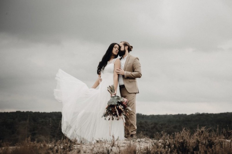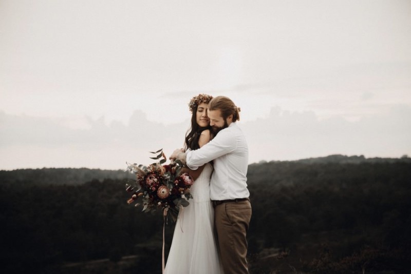 Bei diesem schönen Couple Shooting, fotografiert von Hochzeitsfotograf Jan Bölts, dürfen wir dem süßen Paar Annahid & Thorsten zu einem abgelegenen Fleckchen in der Natur folgen. Passend zum leichten Bohobrautkleid vom Brautatelier Elena Victoria und zum exotischen Typ der bezaubernden Braut, kreierte Lena Grüner vom Blütenwerk by Lena Grüner einen wilden, exotischen Brautstrauß in dunklem Rot, leichten Orangetönen und grünen Akzenten, sowie eine passende Flowercrown. Im opulenten Brautstrauß finden sich feurige Proteen, die von Pampasgras, gefärbtem Lagurus und hellem Phalaris, sowie dunkelrotem Lisianthius umgeben sind. Frischer Eukalyptus, dunkelrote Dahlien und kleine Hagebutten umspielen die großen exotischen Proteen. Für die Flowercrown wurden zusätzlich Hortensienblüten verwendet. Ob für eine Herbst- oder Winterhochzeit, diese farbintensive und exotisch angehauchte Floristik – gespickt mit einigen Trockenblumen – bringt garantiert jede Braut zum Strahlen!