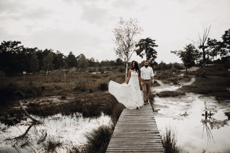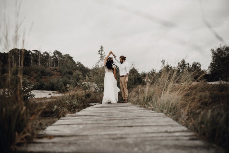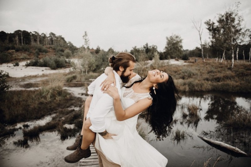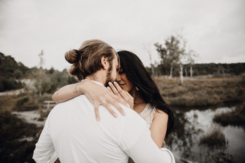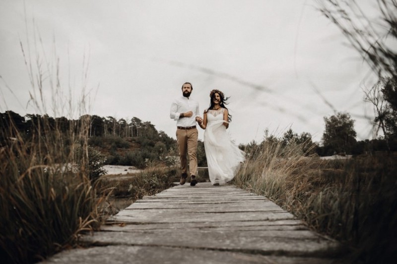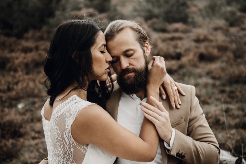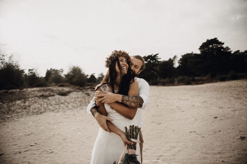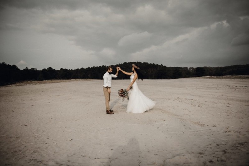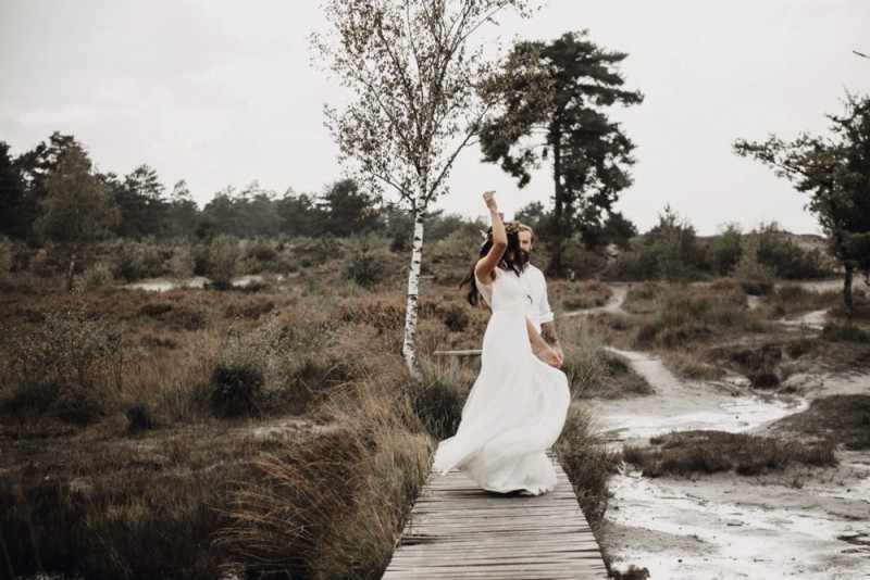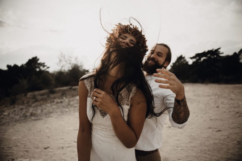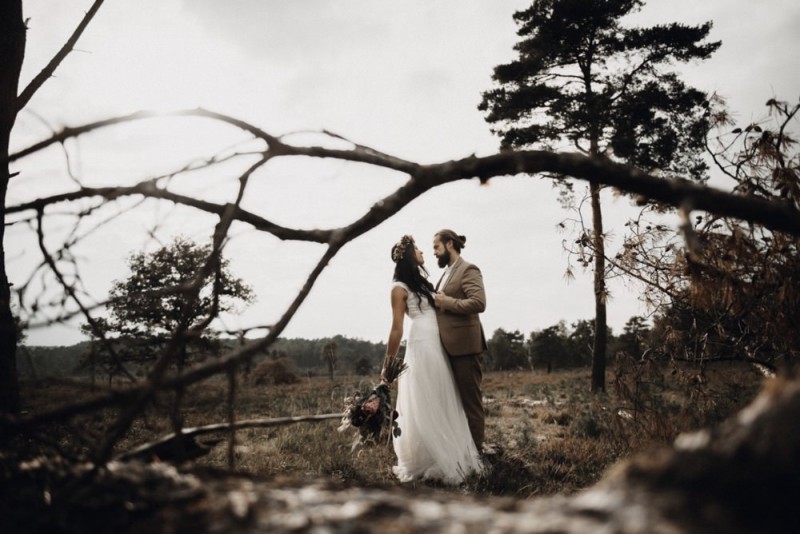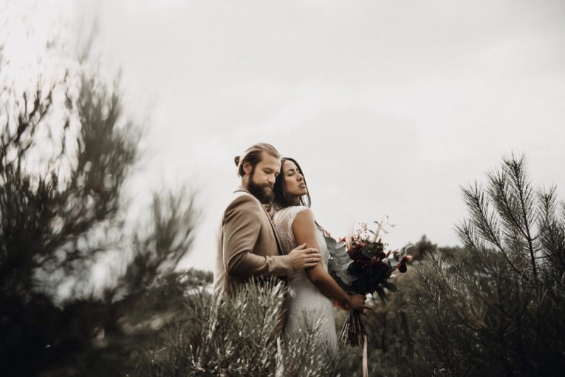 Bei diesem schönen Couple Shooting, fotografiert von Hochzeitsfotograf Jan Bölts, dürfen wir dem süßen Paar Annahid & Thorsten zu einem abgelegenen Fleckchen in der Natur folgen. Passend zum leichten Bohobrautkleid vom Brautatelier Elena Victoria und zum exotischen Typ der bezaubernden Braut, kreierte Lena Grüner vom Blütenwerk by Lena Grüner einen wilden, exotischen Brautstrauß in dunklem Rot, leichten Orangetönen und grünen Akzenten, sowie eine passende Flowercrown. Im opulenten Brautstrauß finden sich feurige Proteen, die von Pampasgras, gefärbtem Lagurus und hellem Phalaris, sowie dunkelrotem Lisianthius umgeben sind. Frischer Eukalyptus, dunkelrote Dahlien und kleine Hagebutten umspielen die großen exotischen Proteen. Für die Flowercrown wurden zusätzlich Hortensienblüten verwendet. Ob für eine Herbst- oder Winterhochzeit, diese farbintensive und exotisch angehauchte Floristik – gespickt mit einigen Trockenblumen – bringt garantiert jede Braut zum Strahlen!