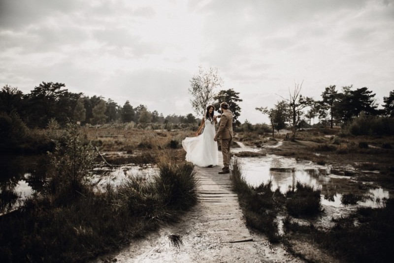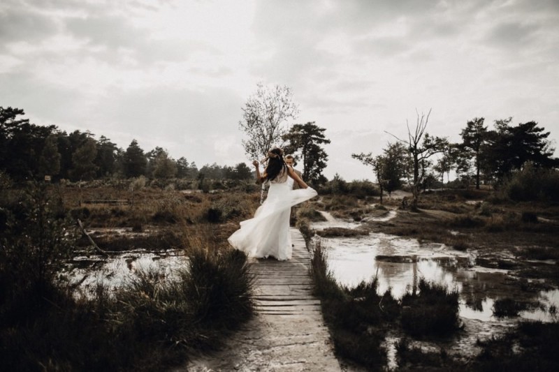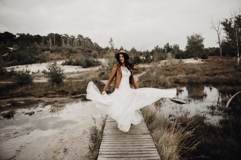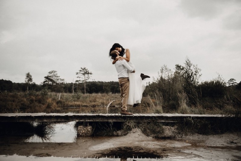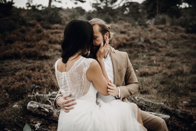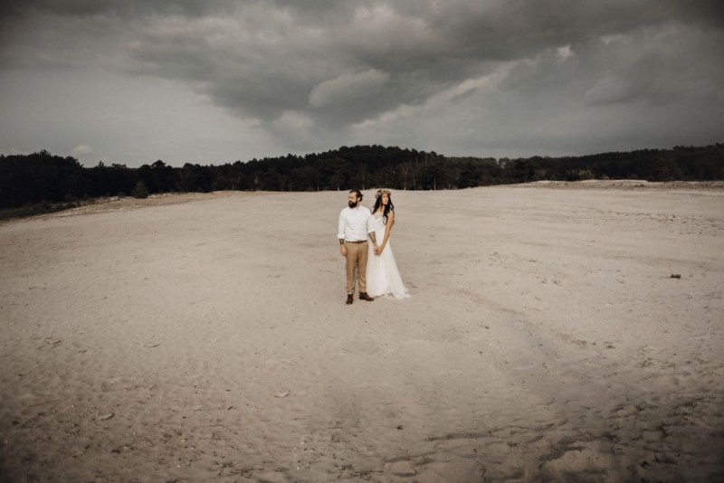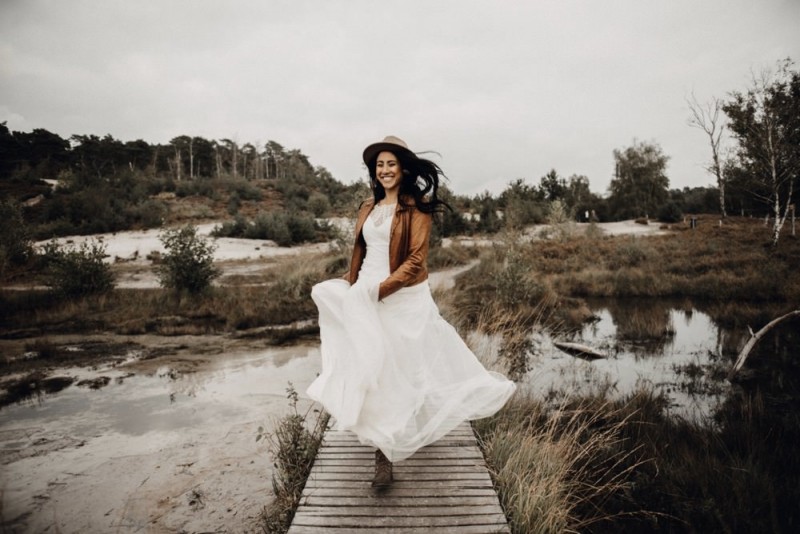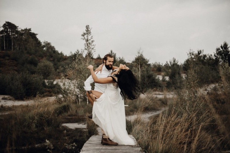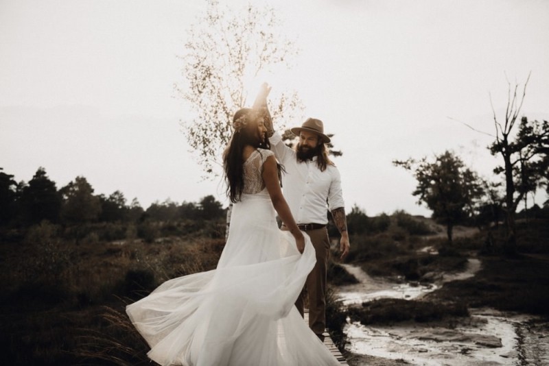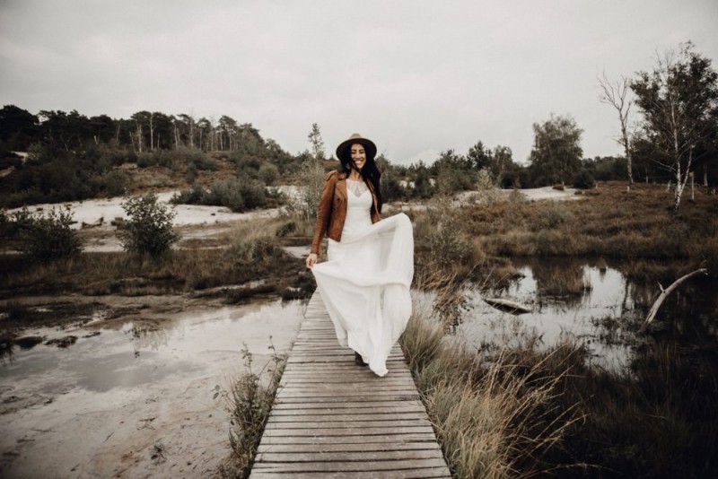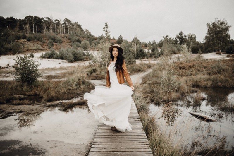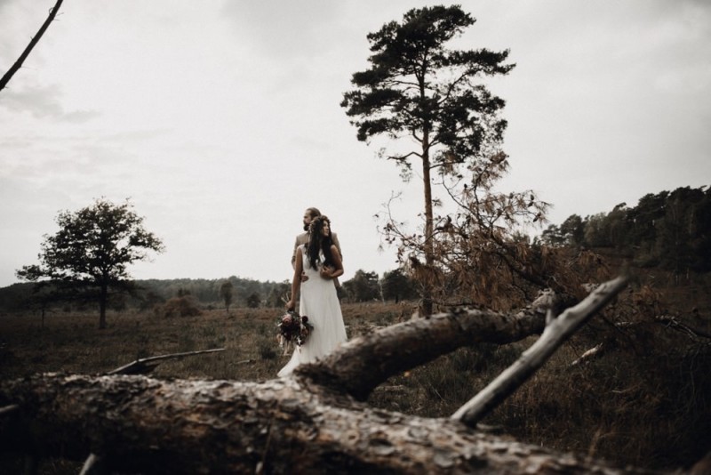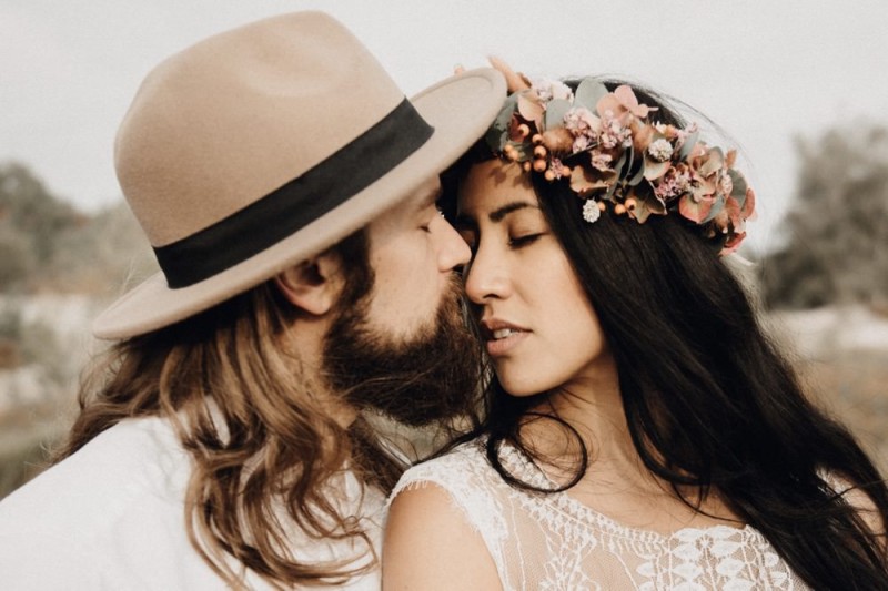 Bei diesem schönen Couple Shooting, fotografiert von Hochzeitsfotograf Jan Bölts, dürfen wir dem süßen Paar Annahid & Thorsten zu einem abgelegenen Fleckchen in der Natur folgen. Passend zum leichten Bohobrautkleid vom Brautatelier Elena Victoria und zum exotischen Typ der bezaubernden Braut, kreierte Lena Grüner vom Blütenwerk by Lena Grüner einen wilden, exotischen Brautstrauß in dunklem Rot, leichten Orangetönen und grünen Akzenten, sowie eine passende Flowercrown. Im opulenten Brautstrauß finden sich feurige Proteen, die von Pampasgras, gefärbtem Lagurus und hellem Phalaris, sowie dunkelrotem Lisianthius umgeben sind. Frischer Eukalyptus, dunkelrote Dahlien und kleine Hagebutten umspielen die großen exotischen Proteen. Für die Flowercrown wurden zusätzlich Hortensienblüten verwendet. Ob für eine Herbst- oder Winterhochzeit, diese farbintensive und exotisch angehauchte Floristik – gespickt mit einigen Trockenblumen – bringt garantiert jede Braut zum Strahlen!