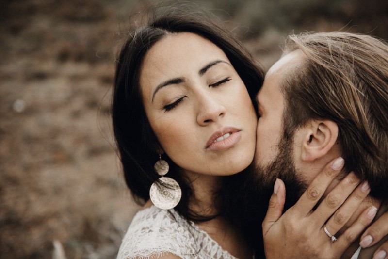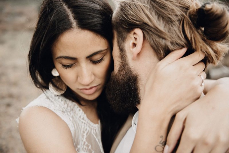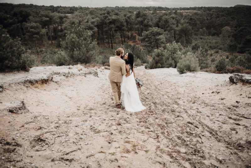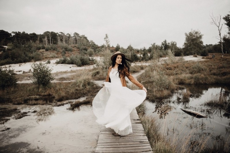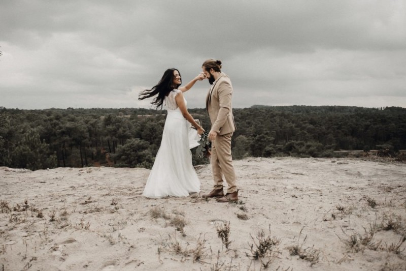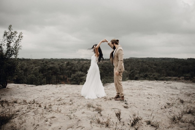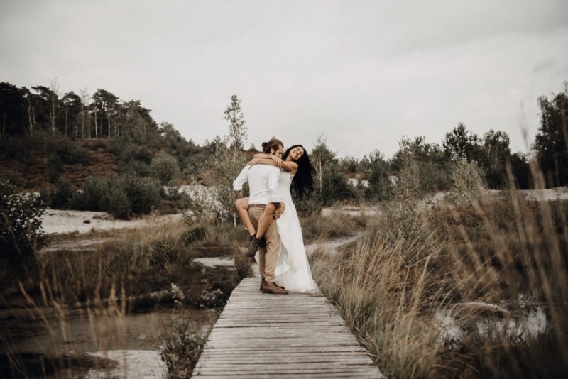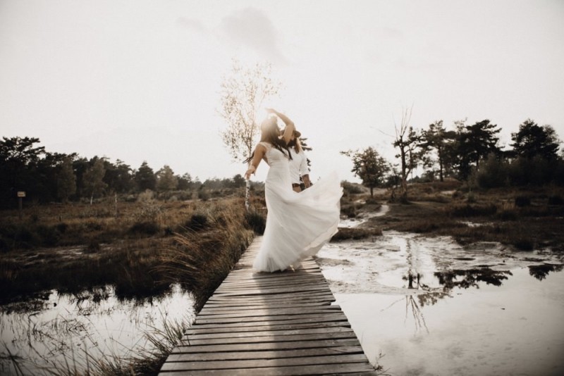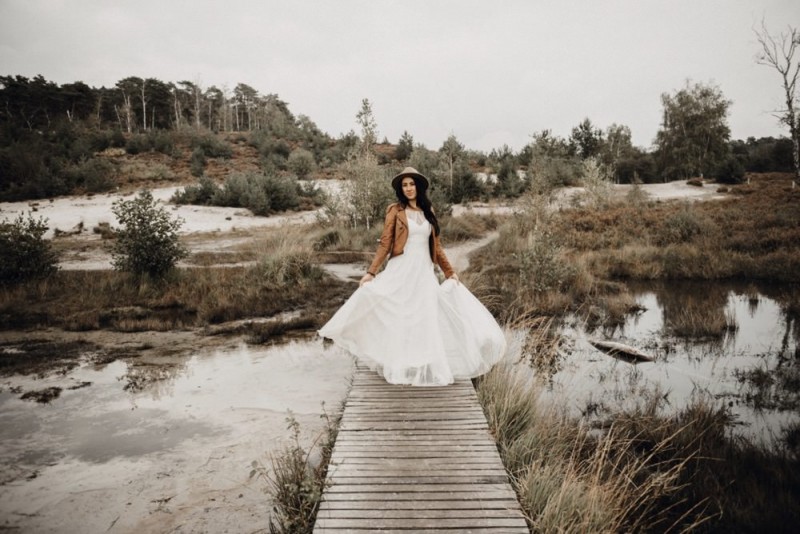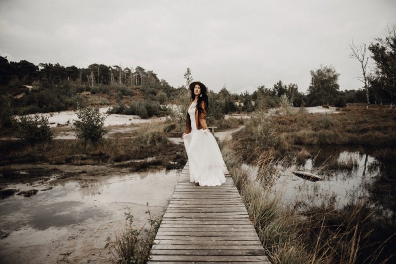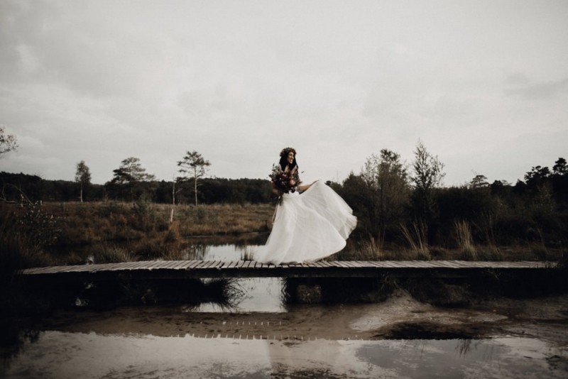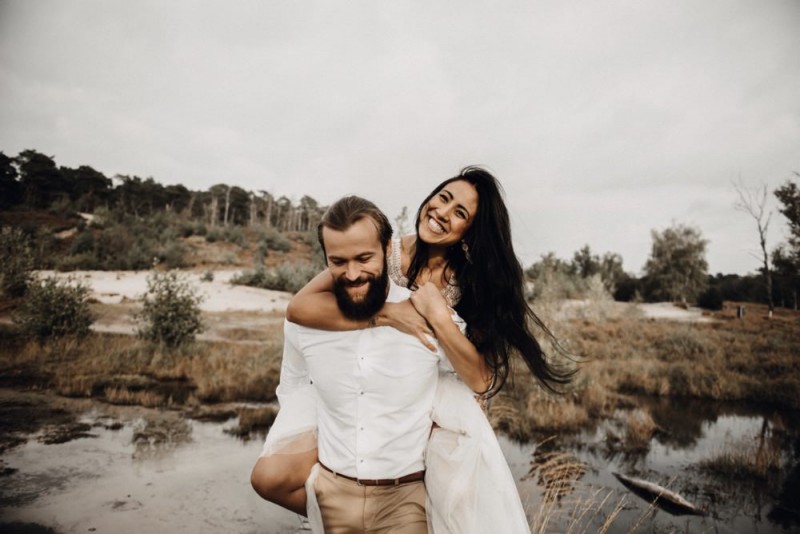 Bei diesem schönen Couple Shooting, fotografiert von Hochzeitsfotograf Jan Bölts, dürfen wir dem süßen Paar Annahid & Thorsten zu einem abgelegenen Fleckchen in der Natur folgen. Passend zum leichten Bohobrautkleid vom Brautatelier Elena Victoria und zum exotischen Typ der bezaubernden Braut, kreierte Lena Grüner vom Blütenwerk by Lena Grüner einen wilden, exotischen Brautstrauß in dunklem Rot, leichten Orangetönen und grünen Akzenten, sowie eine passende Flowercrown. Im opulenten Brautstrauß finden sich feurige Proteen, die von Pampasgras, gefärbtem Lagurus und hellem Phalaris, sowie dunkelrotem Lisianthius umgeben sind. Frischer Eukalyptus, dunkelrote Dahlien und kleine Hagebutten umspielen die großen exotischen Proteen. Für die Flowercrown wurden zusätzlich Hortensienblüten verwendet. Ob für eine Herbst- oder Winterhochzeit, diese farbintensive und exotisch angehauchte Floristik – gespickt mit einigen Trockenblumen – bringt garantiert jede Braut zum Strahlen!