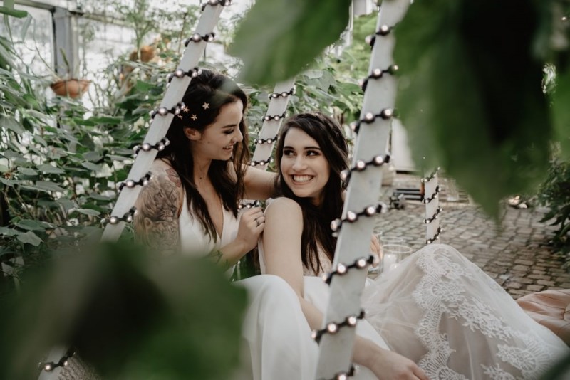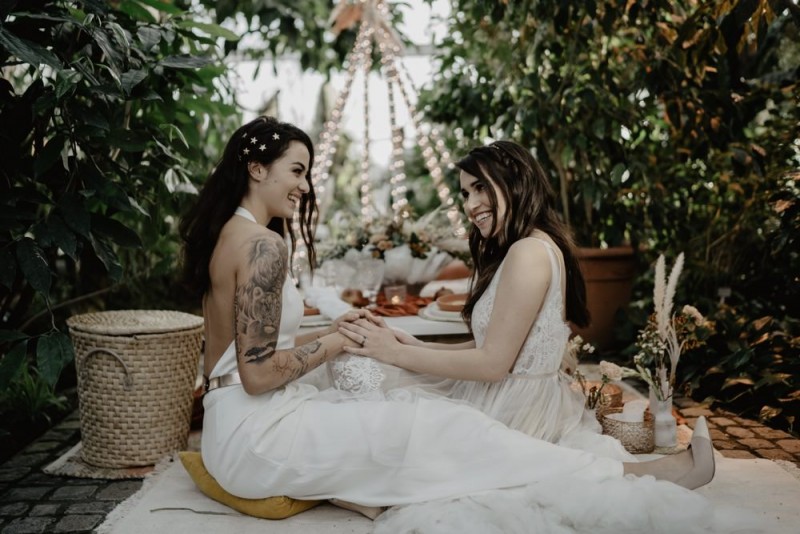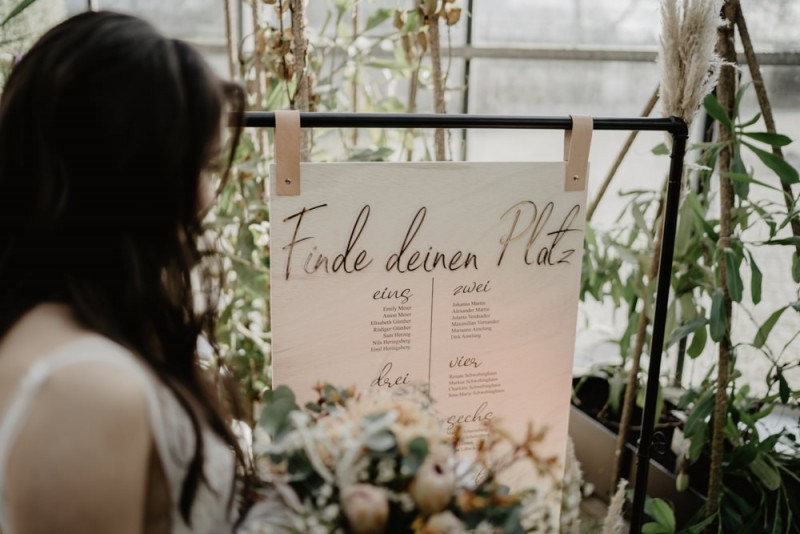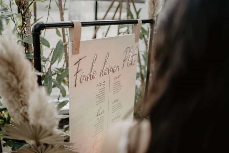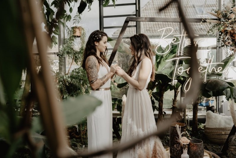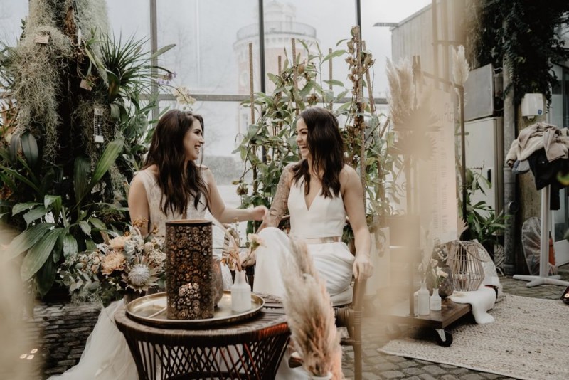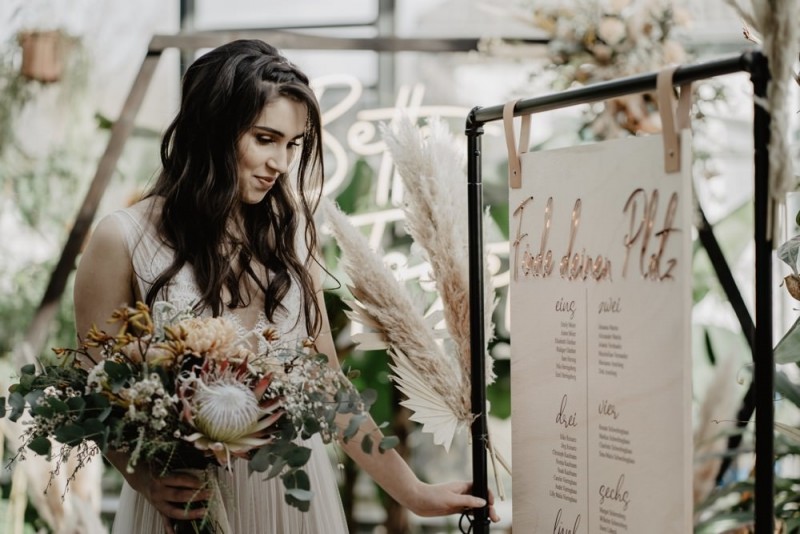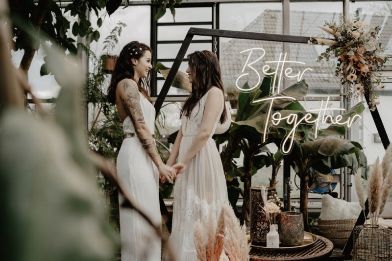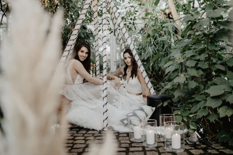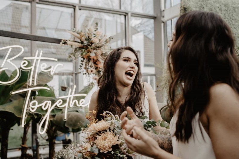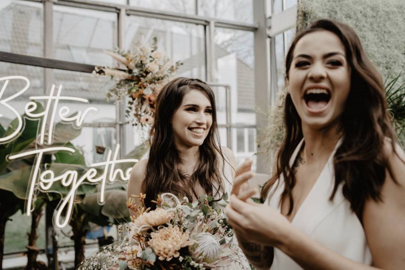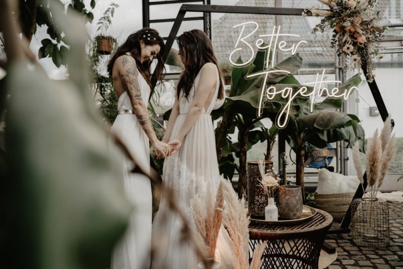 Zwei Stile, die wohl kaum wegzudenken sind: Bohoverliebte Indian Summer Hochzeiten und botanische Hochzeiten im Gewächshaus. Zwei Stile, die in dieser tollen Hochzeitsinspriation aufeinander treffen und einfach grandios umgesetzt und vereint wurden. „Fields of Gold“ – Feine Orangetöne, zierliches Nude und edles Gold finden zusammen und zaubern einen magischen Hauch des trendigen Indian Summer Stils, der von den gewohnt schönen Vibes eines wilden Gewächshauses umgeben wird. Wildes grün, tropische Akzente und Details in Navy Blue sorgen für Kontraste und inszenieren doch eine harmonische und sehr inspirierende Kombination. Willkommen in diesem botanischen Indian Summer Traum, in dem zwei sehr hübsche Bräute ihre Liebe zelebrieren! Fotografiert wurde diese kontrastreiche Inspiration vom Hochzeitsfotografen-Team von True Weddings. Hier im schönen Gewächshaus der Elisenhöhe, wurde von Sister’s Decodreams & Lieblingsprint, auf und mit dem Mobiliar vom Platzwerk Verleih, eine Szenerie dekoriert, die wie bereits erwähnt, in Orange-, Nude- und Goldtönen, begeistert. Es erwarten euch eine wunderschöne Lounge mit kuscheligen Kissen und Kerzenschein, ein mega Sitzplan und ein, vom Eventtechniker Eventiks, erleuchteter Traubogen in der Form eines Tipis. Die wilde Hochzeitsfloristik im tollen Bohostil, die hier in dieser Szenerie sogar noch einen tropischen Akzent setzt, wurde kreiert von der Ideenschmiede. Die Inszenierung dieser, wie auch die feine Abstimmung der warmen Farbtöne, ist an Liebe zum Detail kaum zu übertreffen! Und hier, in diesem wundervollen Ambiente, feierten die beiden Bräute Sophie & Laura, ihre Liebe. Zwei Frauen, so kontrastreich wie die gesamte Inspiration. Sinnlich und rockig zugleich, treffen diese beiden heißen Vamps, in zwei wunderschönen Brautoutfits von Jenari Bridal Concept Store und einem wilden sowie gefühlsbetonten Hair & Makeup von Eliza Nova, aufeinander. Neben einem zauberhaften, leicht transparenten Brautkleid mit fließendem Rock und tollen Spitzendetails, könnt ihr auch einen sehr coolen aber vor allem edlen Brautanzug entdecken. Gerade die etwas kleinere standesamtlichen Trauung kann man damit sehr toll feiern und sorgt damit garantiert für einen Hingucker! Hier ist es eine intime und kleine Feier zu Zweit, bei der die beiden mit Ringen, vom Juwelier Haarhaus, ihre Liebe feiern. Und mit einem Stück der tollen Hochzeitstorte von Tortenatelier Radevormwald, stoßen sie darauf danach quasi feierlich an. Und genau hier, seid ihr alle herzlich eingeladen, die Freude der beiden mitzuerleben und all die schönen Details in euch aufzusaugen! Ganz viel Freude euch mit dieser kleinen aber unglaublich feinen Hochzeitsinspiration im botanischen Indian Summer Boho Look!