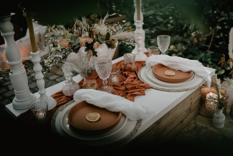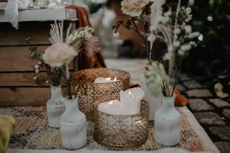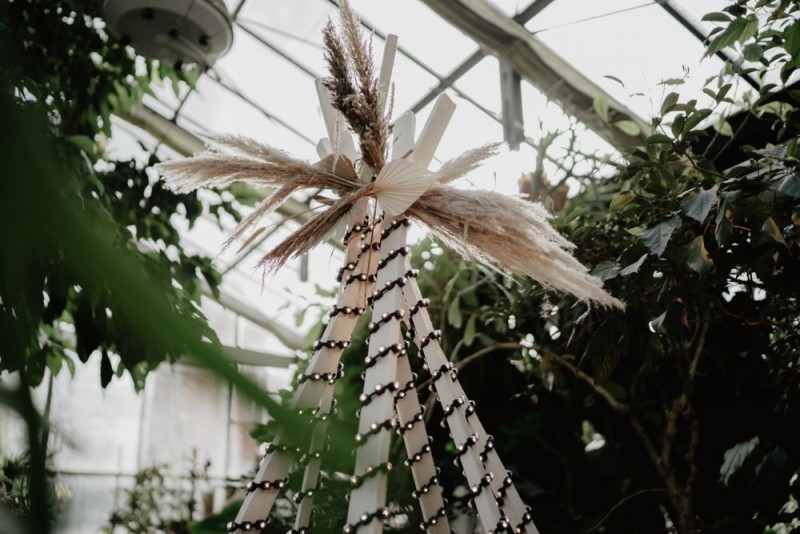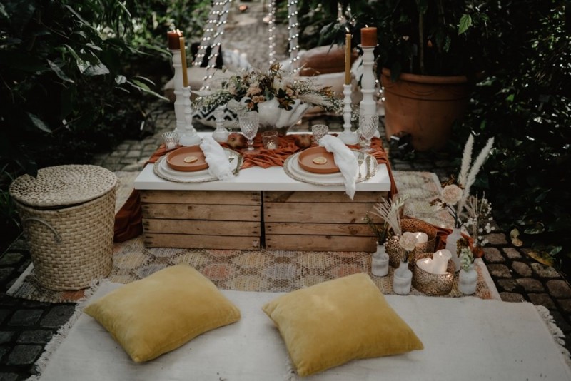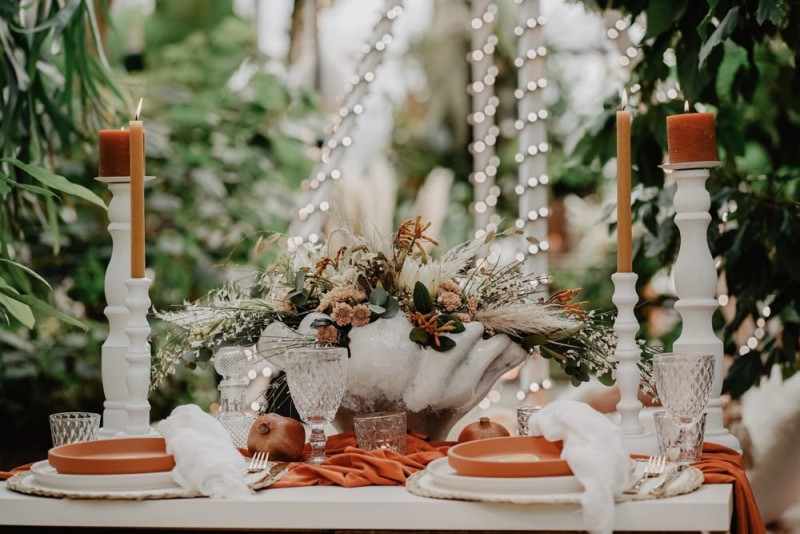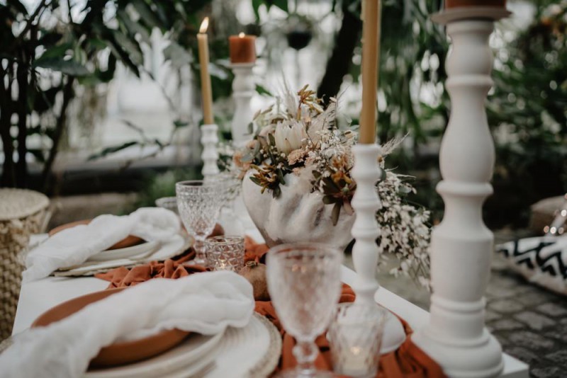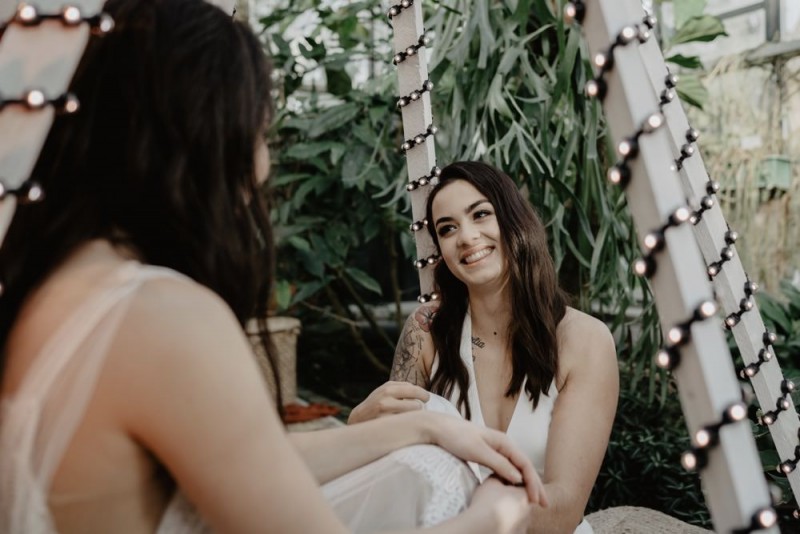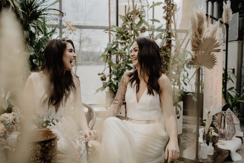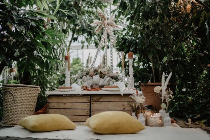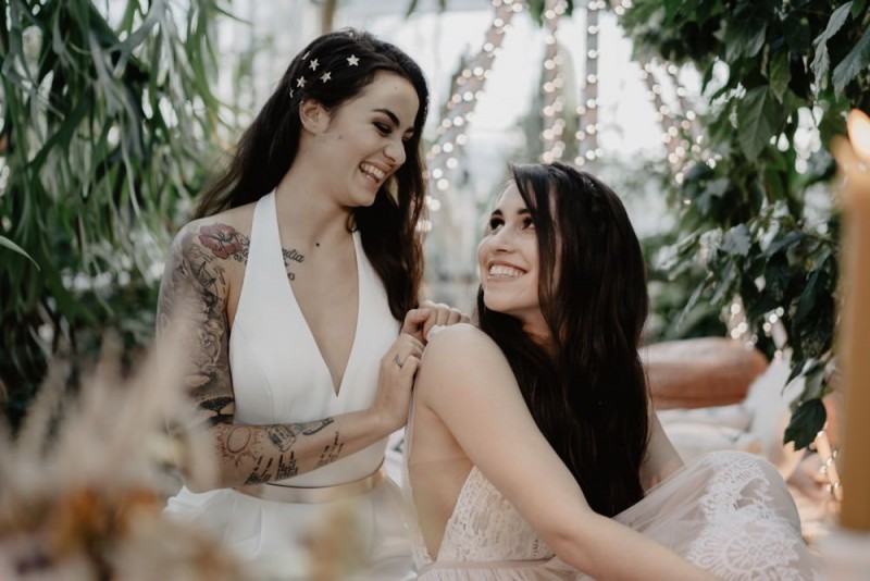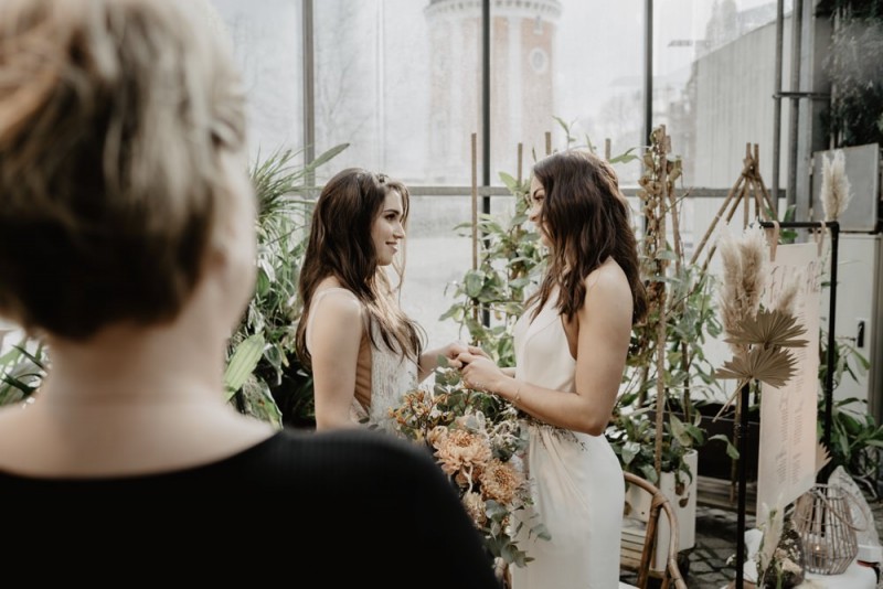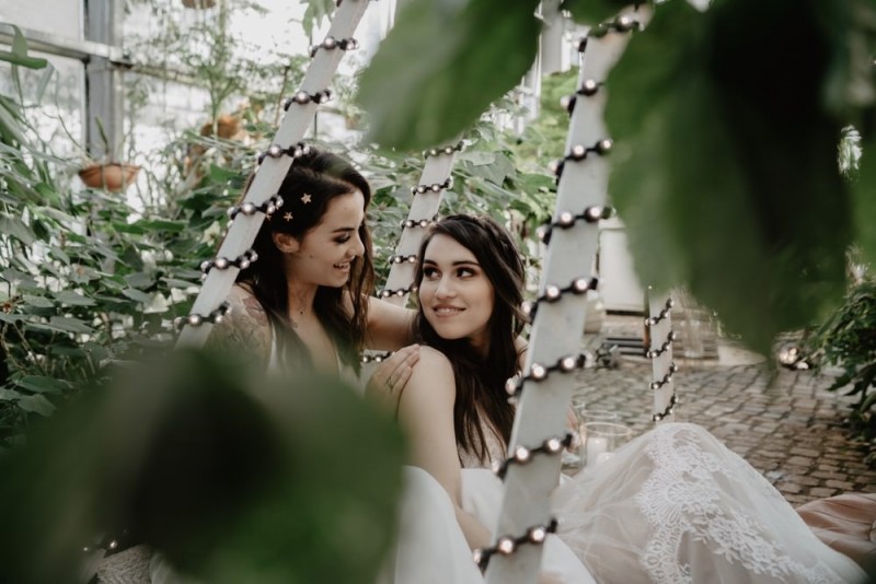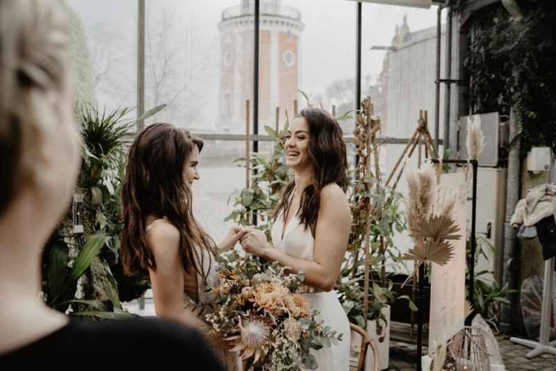 Zwei Stile, die wohl kaum wegzudenken sind: Bohoverliebte Indian Summer Hochzeiten und botanische Hochzeiten im Gewächshaus. Zwei Stile, die in dieser tollen Hochzeitsinspriation aufeinander treffen und einfach grandios umgesetzt und vereint wurden. „Fields of Gold“ – Feine Orangetöne, zierliches Nude und edles Gold finden zusammen und zaubern einen magischen Hauch des trendigen Indian Summer Stils, der von den gewohnt schönen Vibes eines wilden Gewächshauses umgeben wird. Wildes grün, tropische Akzente und Details in Navy Blue sorgen für Kontraste und inszenieren doch eine harmonische und sehr inspirierende Kombination. Willkommen in diesem botanischen Indian Summer Traum, in dem zwei sehr hübsche Bräute ihre Liebe zelebrieren! Fotografiert wurde diese kontrastreiche Inspiration vom Hochzeitsfotografen-Team von True Weddings. Hier im schönen Gewächshaus der Elisenhöhe, wurde von Sister’s Decodreams & Lieblingsprint, auf und mit dem Mobiliar vom Platzwerk Verleih, eine Szenerie dekoriert, die wie bereits erwähnt, in Orange-, Nude- und Goldtönen, begeistert. Es erwarten euch eine wunderschöne Lounge mit kuscheligen Kissen und Kerzenschein, ein mega Sitzplan und ein, vom Eventtechniker Eventiks, erleuchteter Traubogen in der Form eines Tipis. Die wilde Hochzeitsfloristik im tollen Bohostil, die hier in dieser Szenerie sogar noch einen tropischen Akzent setzt, wurde kreiert von der Ideenschmiede. Die Inszenierung dieser, wie auch die feine Abstimmung der warmen Farbtöne, ist an Liebe zum Detail kaum zu übertreffen! Und hier, in diesem wundervollen Ambiente, feierten die beiden Bräute Sophie & Laura, ihre Liebe. Zwei Frauen, so kontrastreich wie die gesamte Inspiration. Sinnlich und rockig zugleich, treffen diese beiden heißen Vamps, in zwei wunderschönen Brautoutfits von Jenari Bridal Concept Store und einem wilden sowie gefühlsbetonten Hair & Makeup von Eliza Nova, aufeinander. Neben einem zauberhaften, leicht transparenten Brautkleid mit fließendem Rock und tollen Spitzendetails, könnt ihr auch einen sehr coolen aber vor allem edlen Brautanzug entdecken. Gerade die etwas kleinere standesamtlichen Trauung kann man damit sehr toll feiern und sorgt damit garantiert für einen Hingucker! Hier ist es eine intime und kleine Feier zu Zweit, bei der die beiden mit Ringen, vom Juwelier Haarhaus, ihre Liebe feiern. Und mit einem Stück der tollen Hochzeitstorte von Tortenatelier Radevormwald, stoßen sie darauf danach quasi feierlich an. Und genau hier, seid ihr alle herzlich eingeladen, die Freude der beiden mitzuerleben und all die schönen Details in euch aufzusaugen! Ganz viel Freude euch mit dieser kleinen aber unglaublich feinen Hochzeitsinspiration im botanischen Indian Summer Boho Look!