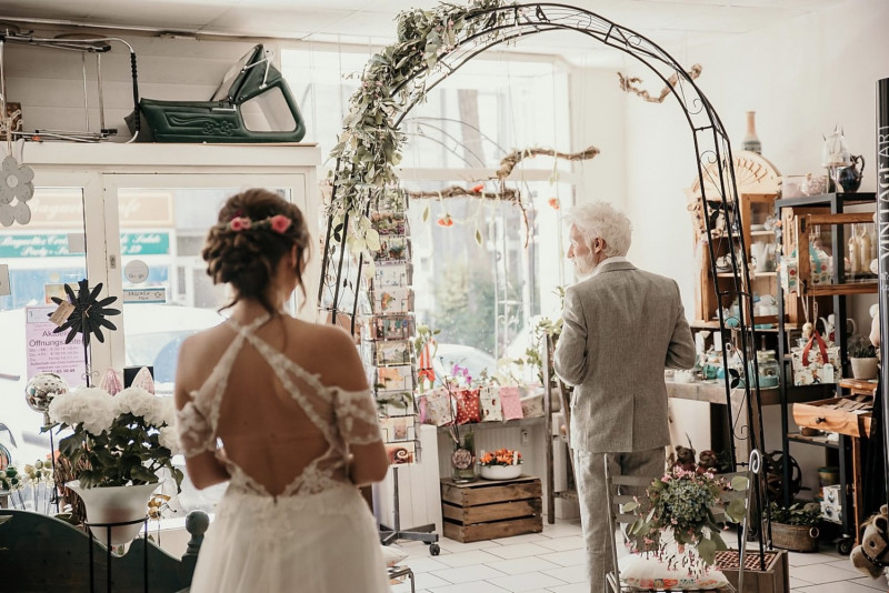 Diese Hochzeitsinspiration gehört sicher zu den außergewöhnlichsten auf diesem Hochzeitsblog. Maya & Maschall (alias Vanessa & Danny) gaben sich hier das Ja-Wort ganz allein in trauter Zweisamkeit. An ihrer Seite das Trauninchen um ihnen eine wundervolle Freie Trauung zu halten. So weit so gut. Das Ungewöhnliche ist die Hochzeitslocation! Mitten in Düsseldorf bei Tiwis Blütenzauber, einem Blumengeschäft, fand dieser besondere Tag statt. Auch das Getting Ready fehlt nicht! Ich war sofort begeistert! Ich liebe Blumen und finde diese Idee einmalig! Fotografiert hat dieses Styled Shoot eines Elopements Before and After Wedding. Das Hair & Makeup zauberte Sinem Kaya hair & makeup artist, das wunderschöne Brautkleid (man beachte den Rücken!) ist von Maleika Brautboutique und der Anzug des Bräutigams ist von Brautmode Horn. Zur Dekoration & Floristik von Tiwis Blütenzauber, gesellt sich die Papeterie von Christallblau und die Wahnsinns Torte von Mango Bakes Cakes. Die Eheringe in der hübschen Ringbox sind von Kempkens Juweliere.