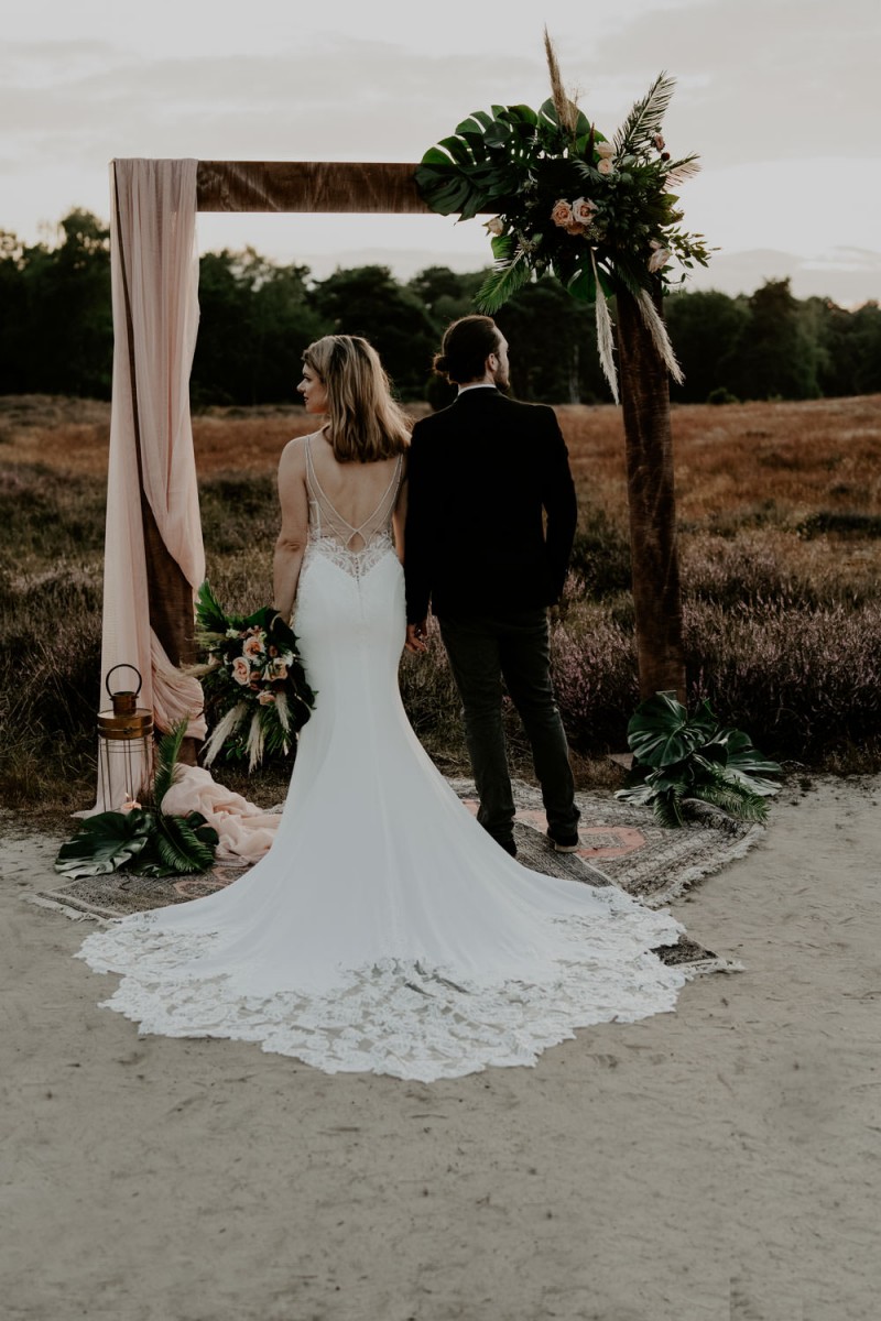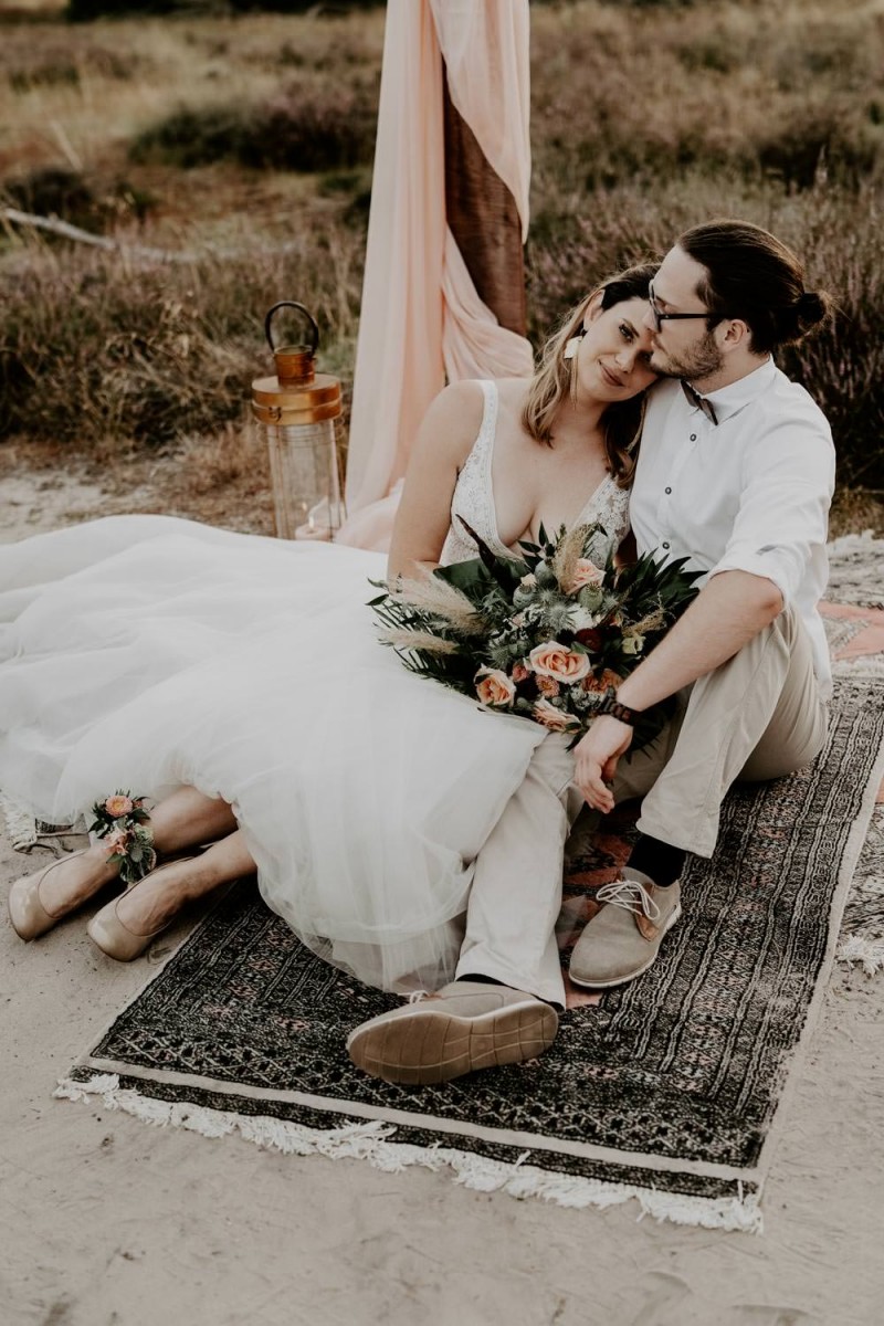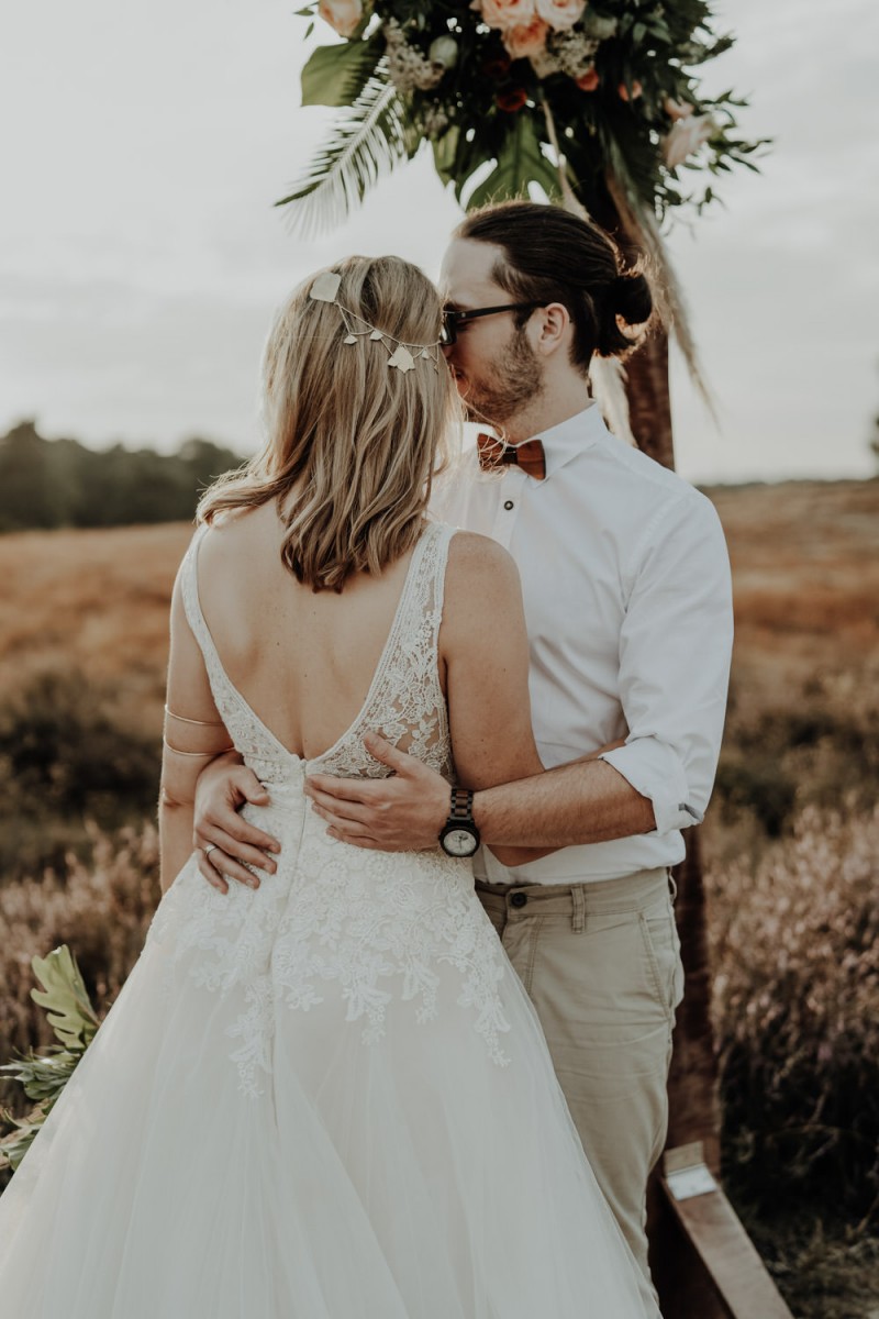 Bei diesem wunderschönen Couple Shooting mit Bohovibes steht alles im Zeichen ‘free Spirit’. Das verlobte Paar, Alina & Timm, genießen dieses tolle Shooting in vollen Zügen und wir dürfen ihnen dabei über die Schulter schauen. So frei wie jeder seine Liebe und seine Beziehung nach seinen eigenen Vorstellungen und Wünschen führen sollte, so frei ist auch der Spirit dieses Shootings. Die Bohemian Vibes könnten nicht besser passen. Fotografiert hat diese feine Hochzeitsinspiration für uns, die Hochzeitsfotografin Tessa Engelbrecht Fotografie. Für die wundervolle Floristik und Dekoration sorgte heartbeat PROJECTS und farblich abestimmte Hochzeitspapeterie kreierte bonnieliebtclyde. Durch diese traumhafte Szenerie küsst und tanzt sich unser Paar bis zum Sonnenuntergang vor einem wunderschönen Traubogen. Alina trägt hier gleich zwei wunderschöne Brautkleider von Brautatelier Tina-Marie. Ihr Hair & Makeup zauberte Ivonne Frerix. Dieser entspannt glamourösen Look wird durch die Accessoires von i-Tüpfelchen Brautaccessoiresperfekt ergänzt. Eine verliebte Inspiration für Bohobräute und wilde Bohoherzen! Ganz viel Freude euch damit!