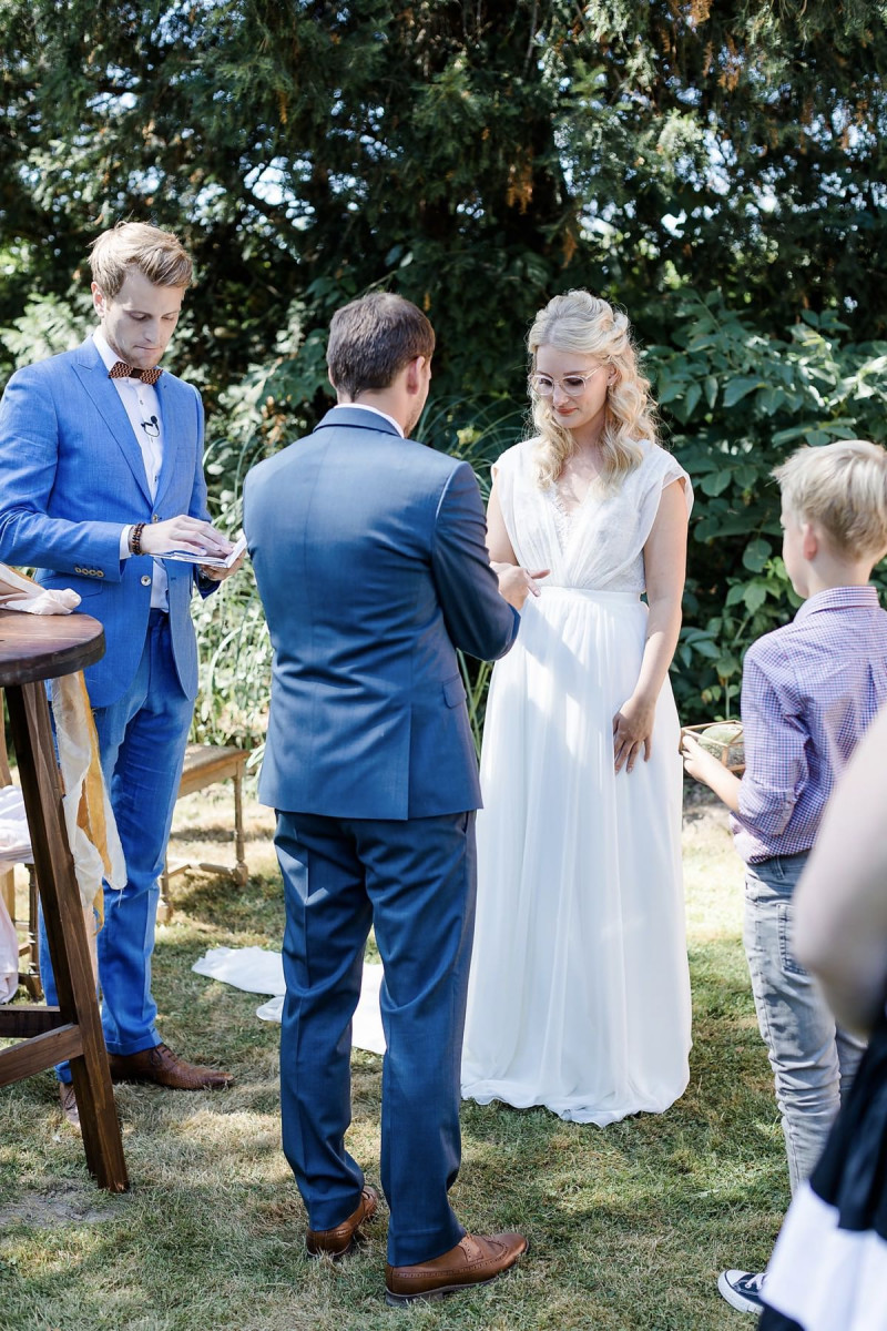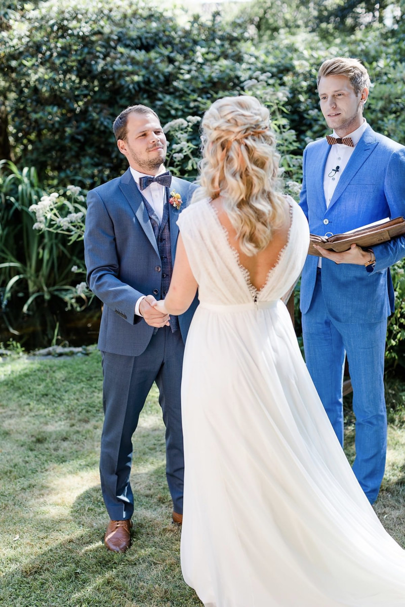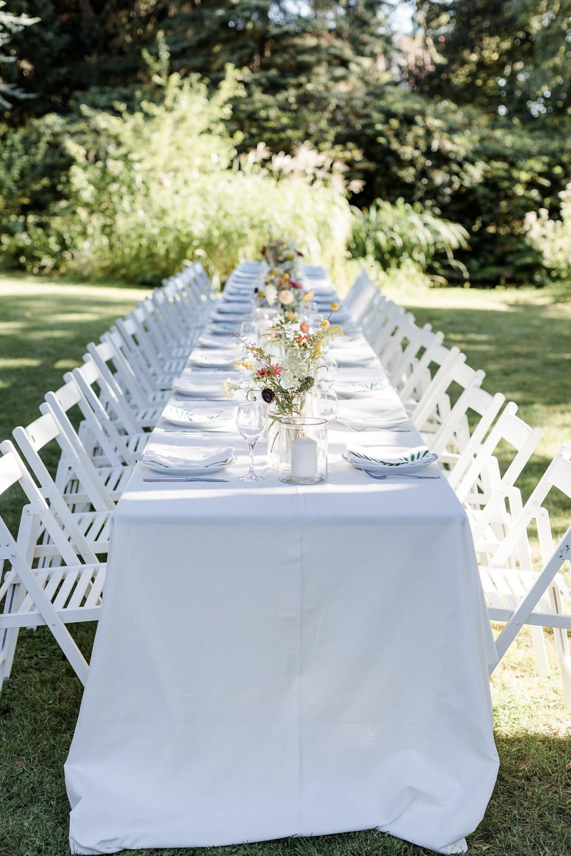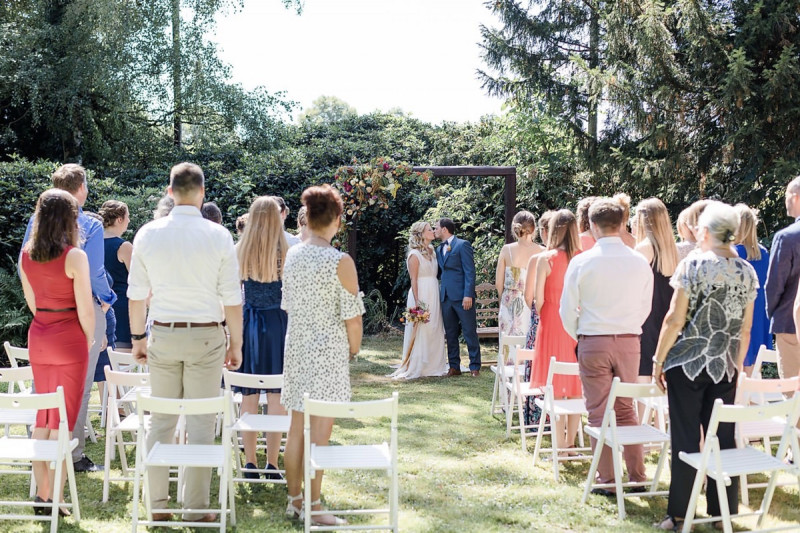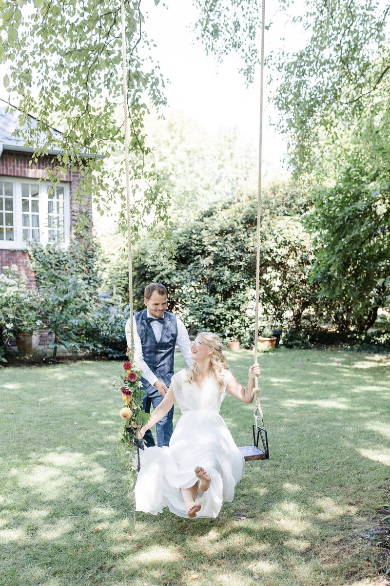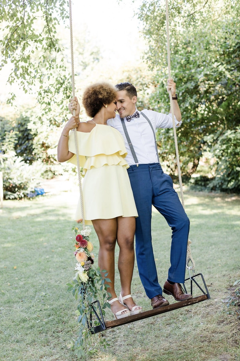Aber nochmal von Anfang an. Nach dem getrennten Getting Ready trafen sich Adele & Joshua beim First Look nur zu zweit. Adele verzauberte ihren Bräutigam in einem Brautkleid von Brautraum und mit einem sommerlich zarten Hair & Makeup von Denise Langner. Joshua wartete ungeduldig aber stilsicher in einem Anzug von Maßschneiderei Wertmerauf seine Adele. Nach diesem besonderen Moment, der nur den beiden gehörte, ging es für sie zu einem kleinen Brautpaarshooting. Nun waren sie bereit für ihre freie Trauung. Gemeinsam liefen sie, begleitet vom Gesangsduo Soulmates, zwischen ihren Gästen hindurch nach vorn. Die freie Trauung wurde von Trauredner Julian Hügelmeyer gehalten, die durch das Ja-Wort und den Ringtausch, mit Ringen von Marrying, gekrönt wurde.Gemeinsam mit all ihren Gästen ging es für die Frischvermählten zur großen Gartenparty. Dort wartete eine lange Tafel, eine romantische Schaukel, eine umwerfende Hochzeitstorte von TortenMacher, eine Kaffeebar von Caffe Piccolo, eine Cocktailbar von Flaschenkind und eine Sektbar mit Fürst von Metternich. Und es geht weiter! Das Cateringvon Roll to Cook sorgte sicher für begeisterte Hochzeitsgäste, die dank der coolen Gartenspiele von Oui Chérie sicher nicht merkten, wenn sich das Brautpaar davonstahlen. Ich glaube, mehr Inspiration geht nicht! Ich wünsche euch ganz viel Freude mit diesem einmaligen Styled Shoot einer Gartenhochzeit!