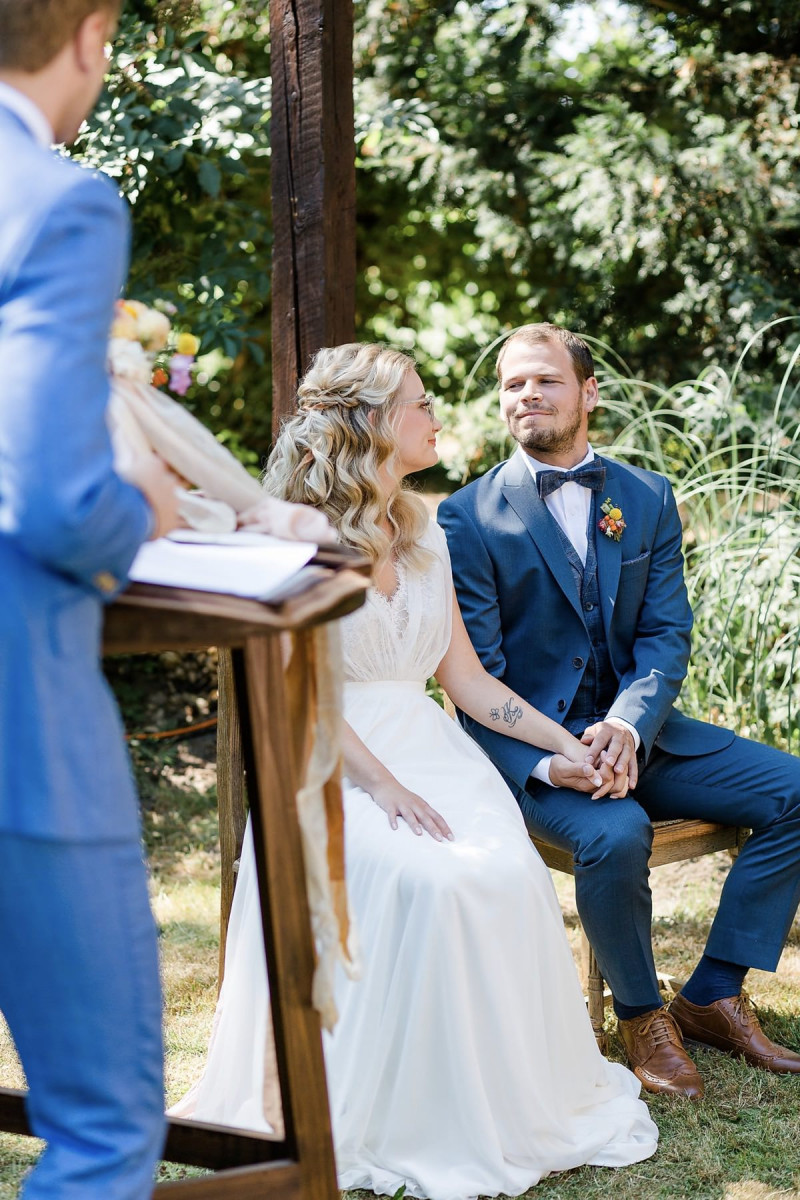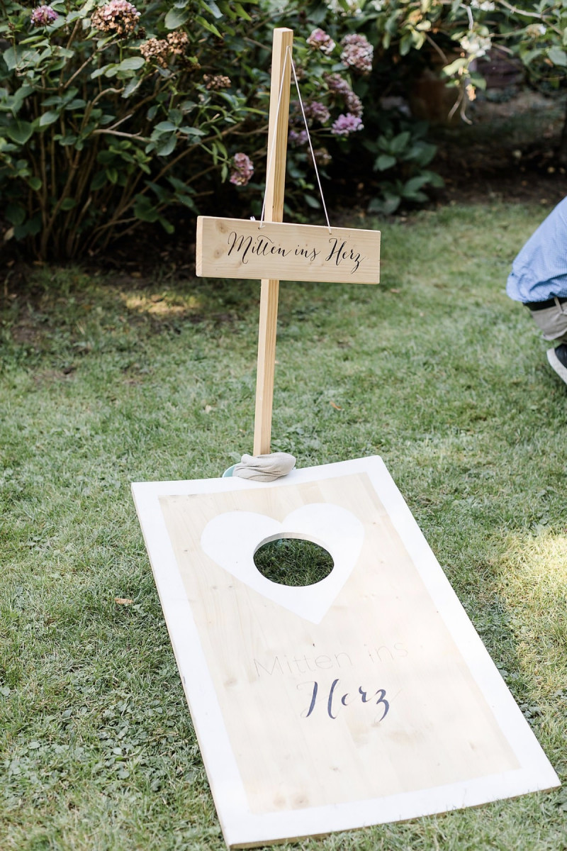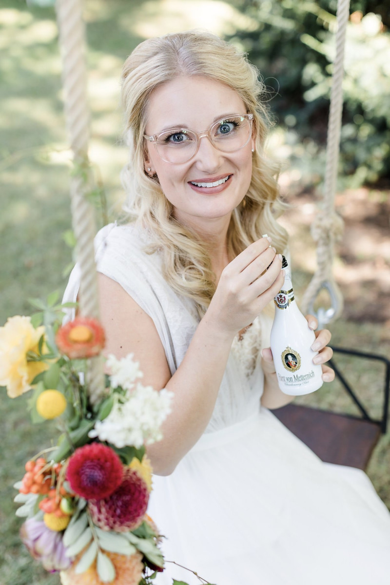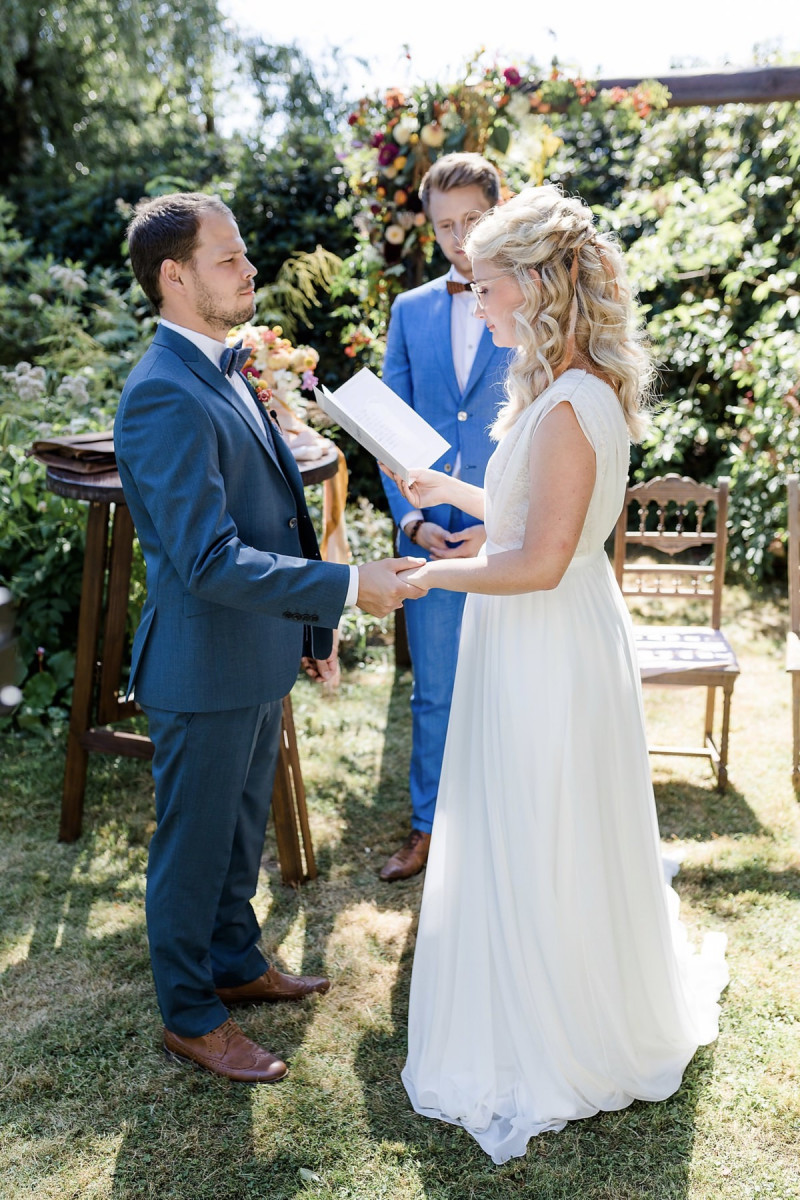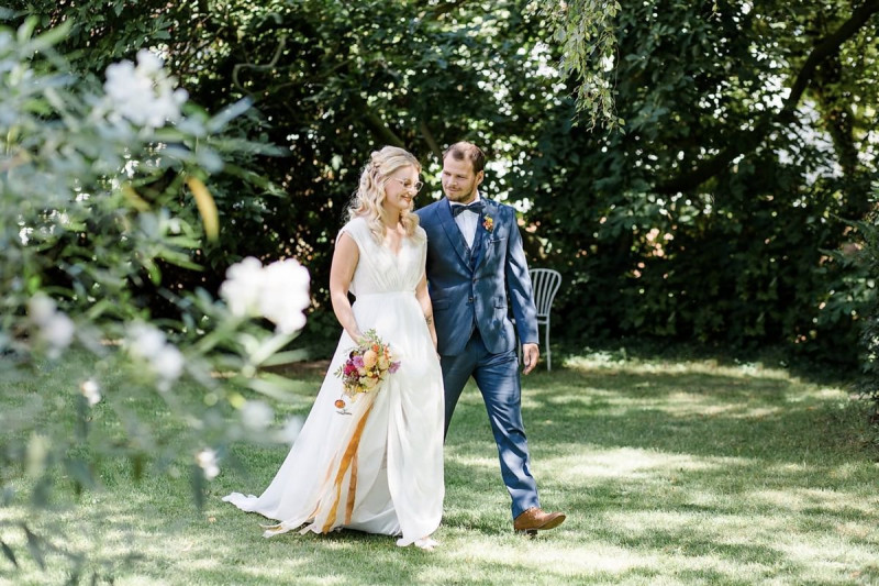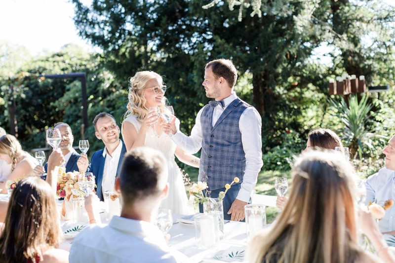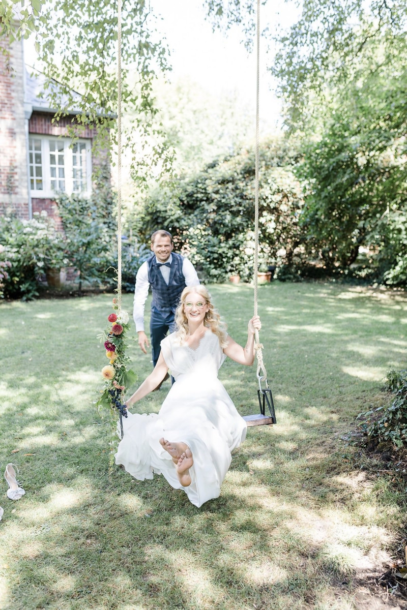 Aber nochmal von Anfang an. Nach dem getrennten Getting Ready trafen sich Adele & Joshua beim First Look nur zu zweit. Adele verzauberte ihren Bräutigam in einem Brautkleid von Brautraum und mit einem sommerlich zarten Hair & Makeup von Denise Langner. Joshua wartete ungeduldig aber stilsicher in einem Anzug von Maßschneiderei Wertmerauf seine Adele. Nach diesem besonderen Moment, der nur den beiden gehörte, ging es für sie zu einem kleinen Brautpaarshooting. Nun waren sie bereit für ihre freie Trauung. Gemeinsam liefen sie, begleitet vom Gesangsduo Soulmates, zwischen ihren Gästen hindurch nach vorn. Die freie Trauung wurde von Trauredner Julian Hügelmeyer gehalten, die durch das Ja-Wort und den Ringtausch, mit Ringen von Marrying, gekrönt wurde.Gemeinsam mit all ihren Gästen ging es für die Frischvermählten zur großen Gartenparty. Dort wartete eine lange Tafel, eine romantische Schaukel, eine umwerfende Hochzeitstorte von TortenMacher, eine Kaffeebar von Caffe Piccolo, eine Cocktailbar von Flaschenkind und eine Sektbar mit Fürst von Metternich. Und es geht weiter! Das Cateringvon Roll to Cook sorgte sicher für begeisterte Hochzeitsgäste, die dank der coolen Gartenspiele von Oui Chérie sicher nicht merkten, wenn sich das Brautpaar davonstahlen. Ich glaube, mehr Inspiration geht nicht! Ich wünsche euch ganz viel Freude mit diesem einmaligen Styled Shoot einer Gartenhochzeit!