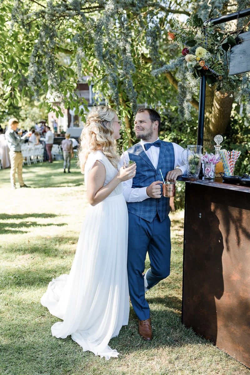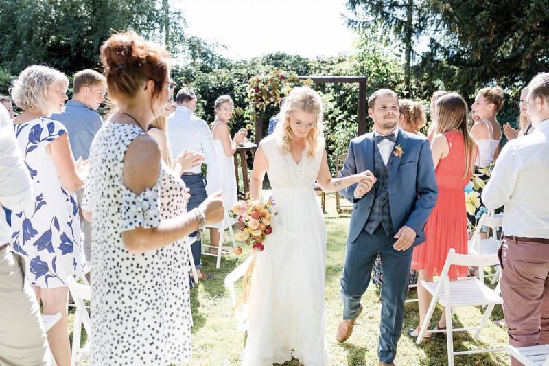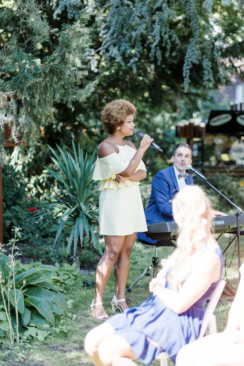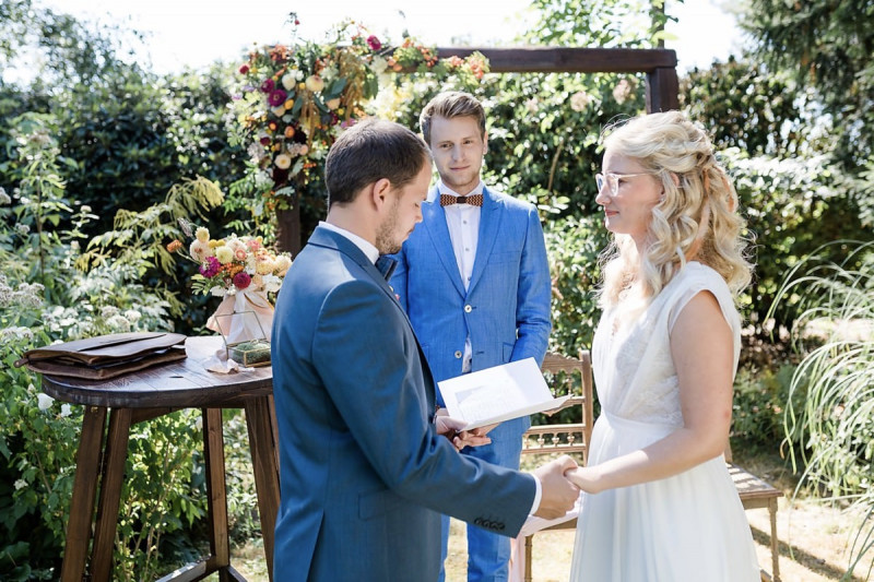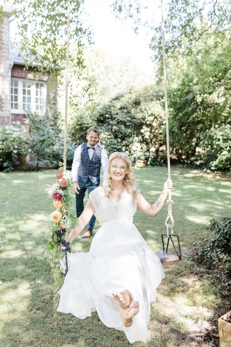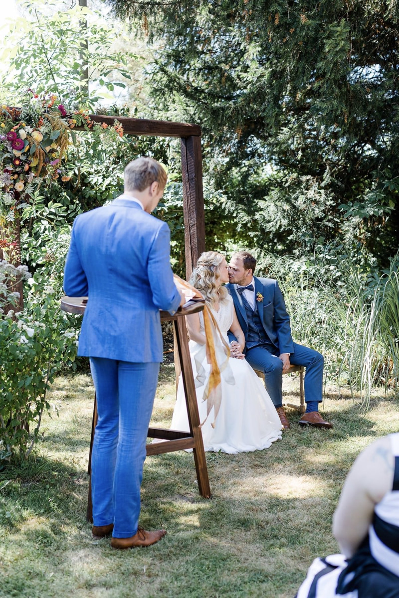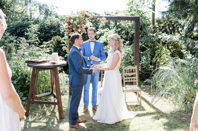 Aber nochmal von Anfang an. Nach dem getrennten Getting Ready trafen sich Adele & Joshua beim First Look nur zu zweit. Adele verzauberte ihren Bräutigam in einem Brautkleid von Brautraum und mit einem sommerlich zarten Hair & Makeup von Denise Langner. Joshua wartete ungeduldig aber stilsicher in einem Anzug von Maßschneiderei Wertmerauf seine Adele. Nach diesem besonderen Moment, der nur den beiden gehörte, ging es für sie zu einem kleinen Brautpaarshooting. Nun waren sie bereit für ihre freie Trauung. Gemeinsam liefen sie, begleitet vom Gesangsduo Soulmates, zwischen ihren Gästen hindurch nach vorn. Die freie Trauung wurde von Trauredner Julian Hügelmeyer gehalten, die durch das Ja-Wort und den Ringtausch, mit Ringen von Marrying, gekrönt wurde.Gemeinsam mit all ihren Gästen ging es für die Frischvermählten zur großen Gartenparty. Dort wartete eine lange Tafel, eine romantische Schaukel, eine umwerfende Hochzeitstorte von TortenMacher, eine Kaffeebar von Caffe Piccolo, eine Cocktailbar von Flaschenkind und eine Sektbar mit Fürst von Metternich. Und es geht weiter! Das Cateringvon Roll to Cook sorgte sicher für begeisterte Hochzeitsgäste, die dank der coolen Gartenspiele von Oui Chérie sicher nicht merkten, wenn sich das Brautpaar davonstahlen. Ich glaube, mehr Inspiration geht nicht! Ich wünsche euch ganz viel Freude mit diesem einmaligen Styled Shoot einer Gartenhochzeit!
