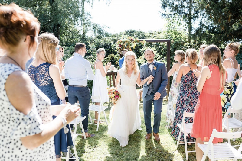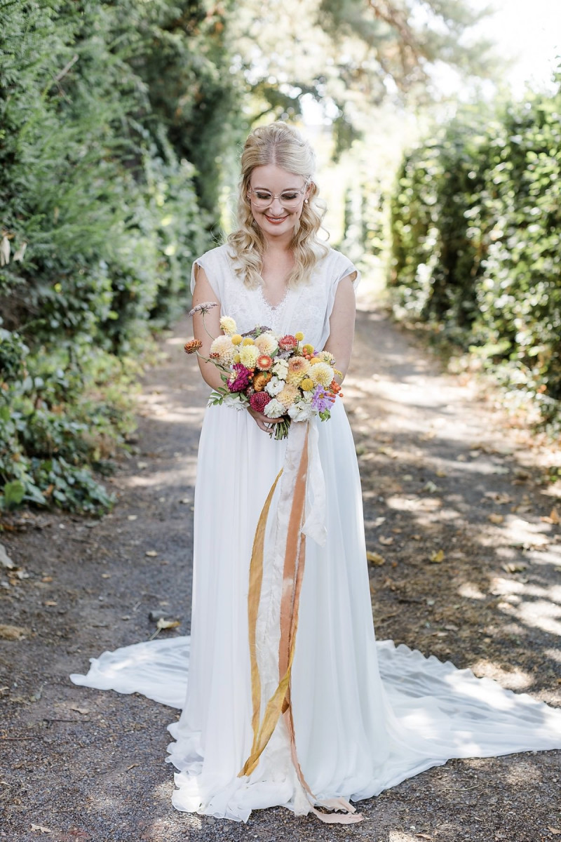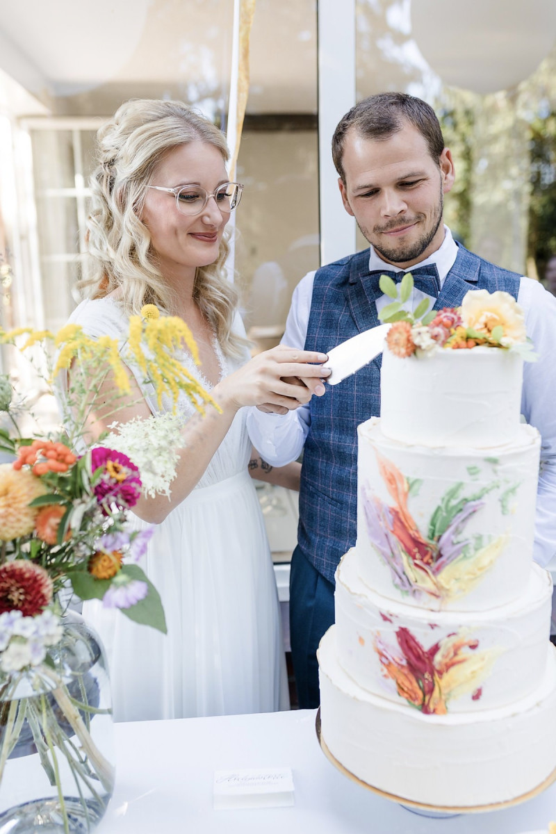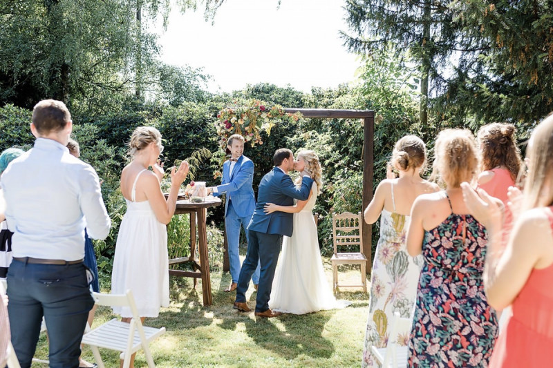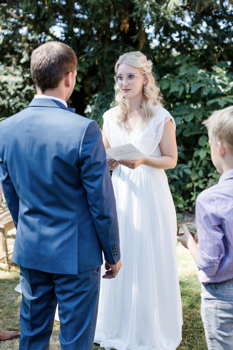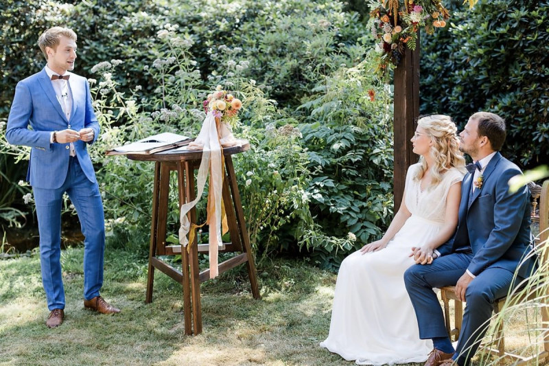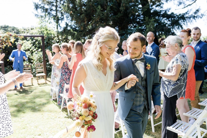 Aber nochmal von Anfang an. Nach dem getrennten Getting Ready trafen sich Adele & Joshua beim First Look nur zu zweit. Adele verzauberte ihren Bräutigam in einem Brautkleid von Brautraum und mit einem sommerlich zarten Hair & Makeup von Denise Langner. Joshua wartete ungeduldig aber stilsicher in einem Anzug von Maßschneiderei Wertmerauf seine Adele. Nach diesem besonderen Moment, der nur den beiden gehörte, ging es für sie zu einem kleinen Brautpaarshooting. Nun waren sie bereit für ihre freie Trauung. Gemeinsam liefen sie, begleitet vom Gesangsduo Soulmates, zwischen ihren Gästen hindurch nach vorn. Die freie Trauung wurde von Trauredner Julian Hügelmeyer gehalten, die durch das Ja-Wort und den Ringtausch, mit Ringen von Marrying, gekrönt wurde.Gemeinsam mit all ihren Gästen ging es für die Frischvermählten zur großen Gartenparty. Dort wartete eine lange Tafel, eine romantische Schaukel, eine umwerfende Hochzeitstorte von TortenMacher, eine Kaffeebar von Caffe Piccolo, eine Cocktailbar von Flaschenkind und eine Sektbar mit Fürst von Metternich. Und es geht weiter! Das Cateringvon Roll to Cook sorgte sicher für begeisterte Hochzeitsgäste, die dank der coolen Gartenspiele von Oui Chérie sicher nicht merkten, wenn sich das Brautpaar davonstahlen. Ich glaube, mehr Inspiration geht nicht! Ich wünsche euch ganz viel Freude mit diesem einmaligen Styled Shoot einer Gartenhochzeit!