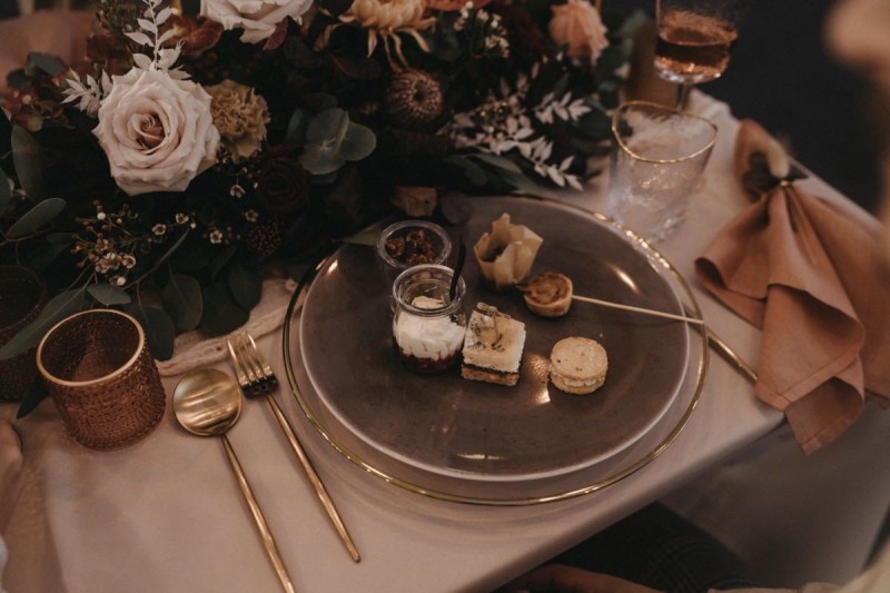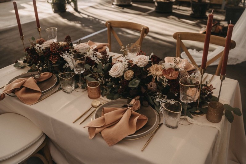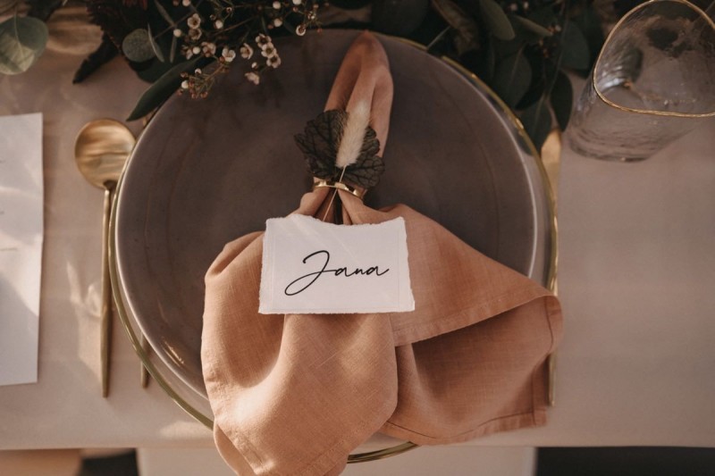 Fotografiert wurde diese schöne Inspiration von Hochzeitsfotografin Julie Troxler. Sie hat zudem das Konzept entwickelt und erfreut uns mit zarter Hochzeitspapeterie in Naturfarben. Geplant wurde dieser besondere Tag von Hochzeitsplanerin Steffi Baintner von Stefeliz Wedding & Event, der dem süßen Brautpaar Jana & Simon noch ewig in Erinnerung bleiben wird. Daniela Clemente von Flowerlove zauberte den beiden eine wunderschöne Traulocation mit Wimpelketten, einem romantischen Traubogen und einem Dinner Setting bei Kerzenschein. Die gesamte Dekoration hielt sie dabei in natürlichen Farben wie Braun, Kupferrot, Beige, Creme und Weiß, die durch feine Akzente in Gold und Grau ergänzt wurden. Bei der Floristik dieses schönen Hochzeitskonzepts kreierte sie wilde Bouquets mit eleganten Rosen, Nelken, Beeren und exotischen Orchideen sowie natürliche und gebleichte Trockenblumen, die sie passend zur Location mit reichlich Grün vereinte. Dass man für die Hochzeit nicht alles kaufen muss, zeigt die tolle Zusammenarbeit mit dem Dekorationsverleih Wedding & Event, die sie bei der Dekoration unterstützen.