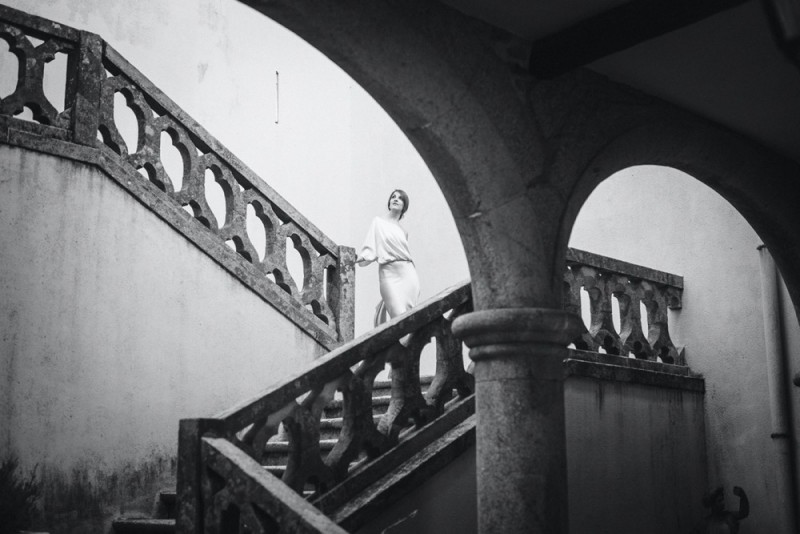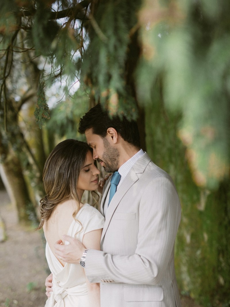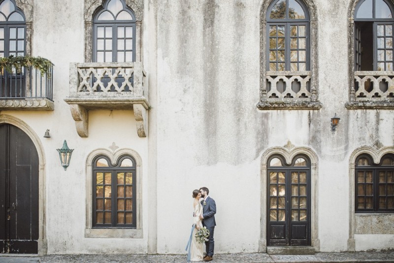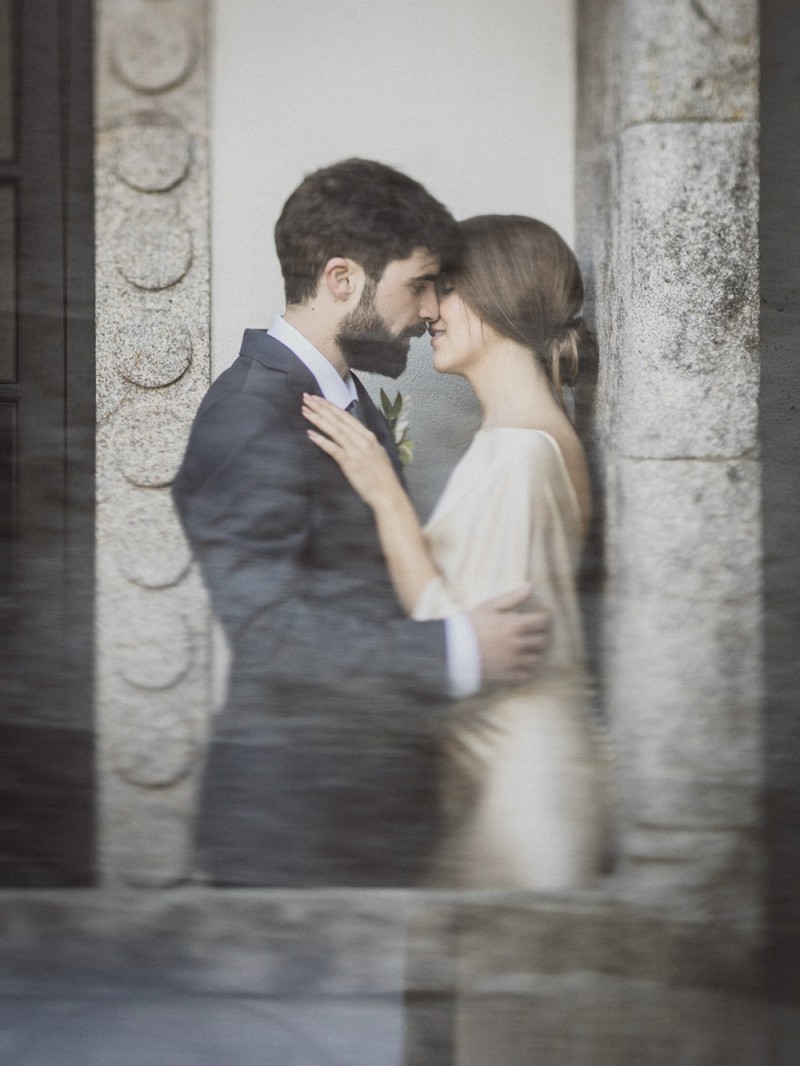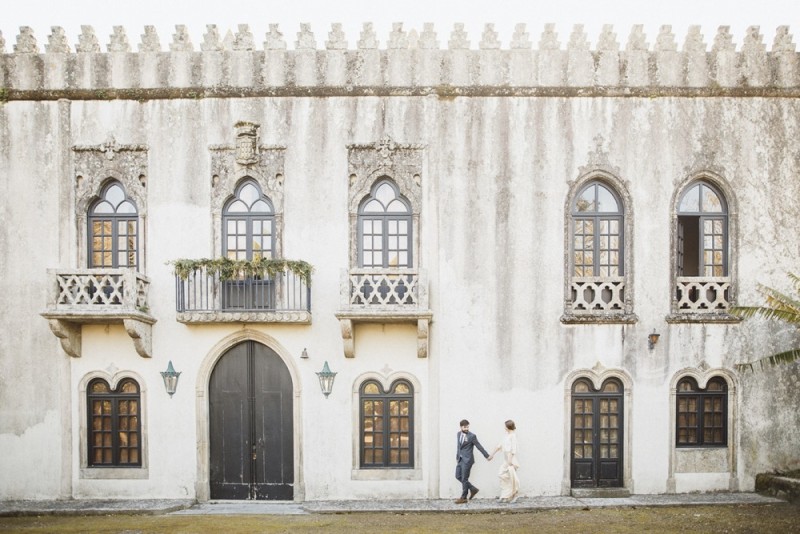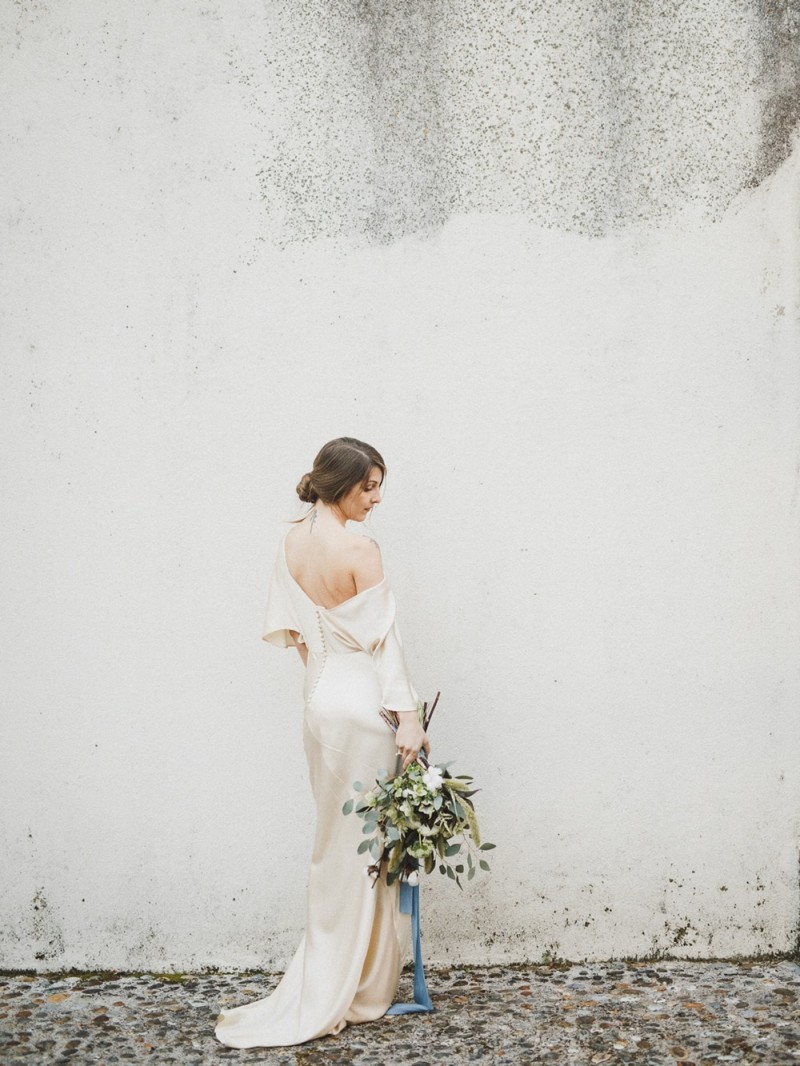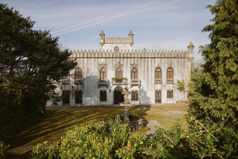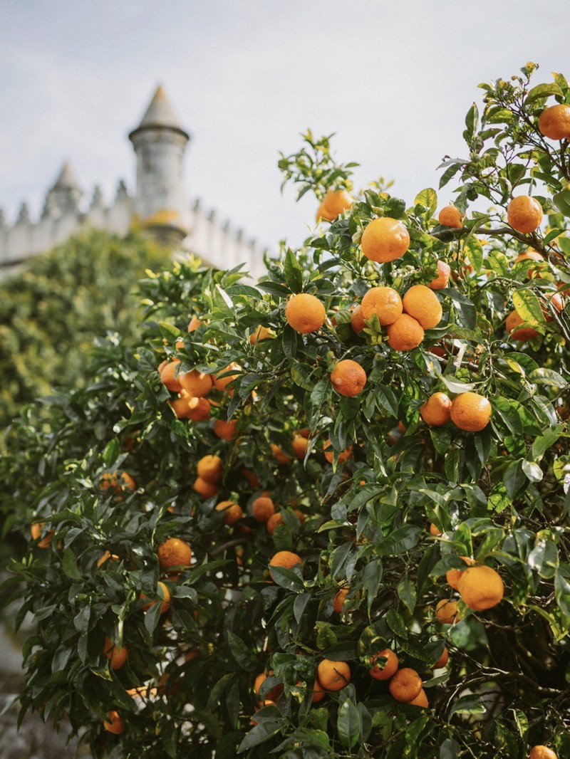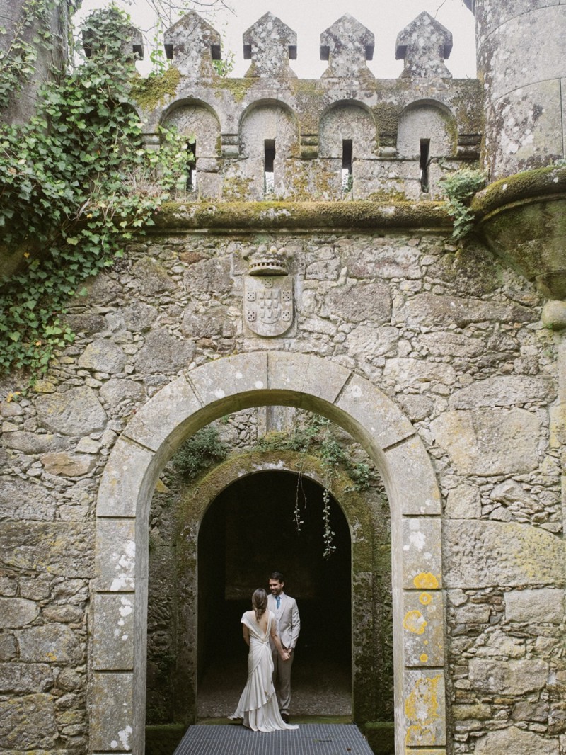 Eine kleine traditionell gepflasterte portugiesische Straße. Entlang hoher Steinmauern und Olivenhainen, führt uns der Weg zum Castelo de Portuzelo an kleinen Kapellen einer jeden Kreuzung vorbei. Schon aus der Ferne kann man den Wachturm des Schlosses erkennen. Der Manuelinische Stil, ein Mix aus Gothik und Renaissance, mit Elementen aus dem 12. bis 19. Jahrhundert, lässt erahnen, wie geschichtsträchtig dieser Ort ist. Diesen besonderen Stil der Location herauszukitzeln und den rustikalen Glamour in Szene zu setzen, das ist dem Hochzeitsplaner-Team der Cracha Wedding Agency, in dieser Hochzeitsinspiration im Norden Portugals, perfekt gelungen. Fotografiert wurde diese Hochzeitsinspiration vom Hochzeitsfotografenpaar Vivid Symphony. Sie haben das hübsche Brautpaar durch die hellen Hallen des Schlosses, entlang des verwachsenen Mauerwerks, einem Springbrunnen aus dem 16. Jahrhundert, und in den opulenten Garten, begleitet. Hier, umgeben von Zypressen, Palmen, Feigen, Zitronen, Orangen und Oliven, feierten sie eine intime glamourös-rustikale Landhochzeit, zu der wir uns nun träumen dürfen. Die Cracha Wedding Agency setze passend auf edles dunkles Holz und kombinierte es zu glänzendem Gold. Das feine Kristallgeschirr und das gravierte Besteck in Gold greift dabei den königlichen Charm auf, den auch das Schloss versprüht. Die zarte Hochzeitspapeterie, in gebrochenem Weiß, mit goldener Schrift und gerissenen Kanten vereint diesen mit zarter Romantik. Eukalyptus, Rosen in Gelb und zartem Lila, sowie weiße Astilben, gebleichter Ruscus und weiße Ranunkeln führen diesen Stil sowohl im Tischbouquet, als auch im Brautstrauß fort. Zuletzt sogar als Tortendekoration auf der wunderschönen goldenen Hochzeitstorte von Bakewell. Doch bevor das Brautpaar von dieser Torte kostete und an diesem gedeckten Tisch Platz nahm, genoss es die intimen Stunden in den verwinkelten Gängen und versteckten Gärten des Schlosses. Jedoch nur bis die Braut in ihr elegantes und zeitloses Brautkleid von Cortana via granvia3 schlüpfte, um ihrem Bräutigam, beim herabgehen der steinernen Stufen, den Atem zu rauben. Ihre Brautschuhe von Crème Caviar Shoes trugen sie dabei sicher hinab, während ihr Gesicht unter dem tollem Brautschleier verhüllt war. Ihr Hair & Makeup für diesen zeitlos schönen Brautlook kreierte Matilde Ribau. Ob in den lichtdurchfluteten Schlosshallen, dem weitläufigen Garten oder in einer der verwachsenen Hofecken – wer bleiben mag ist herzlich dazu eingeladen! Genießt es!